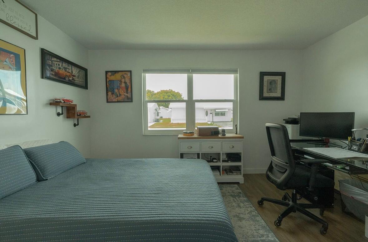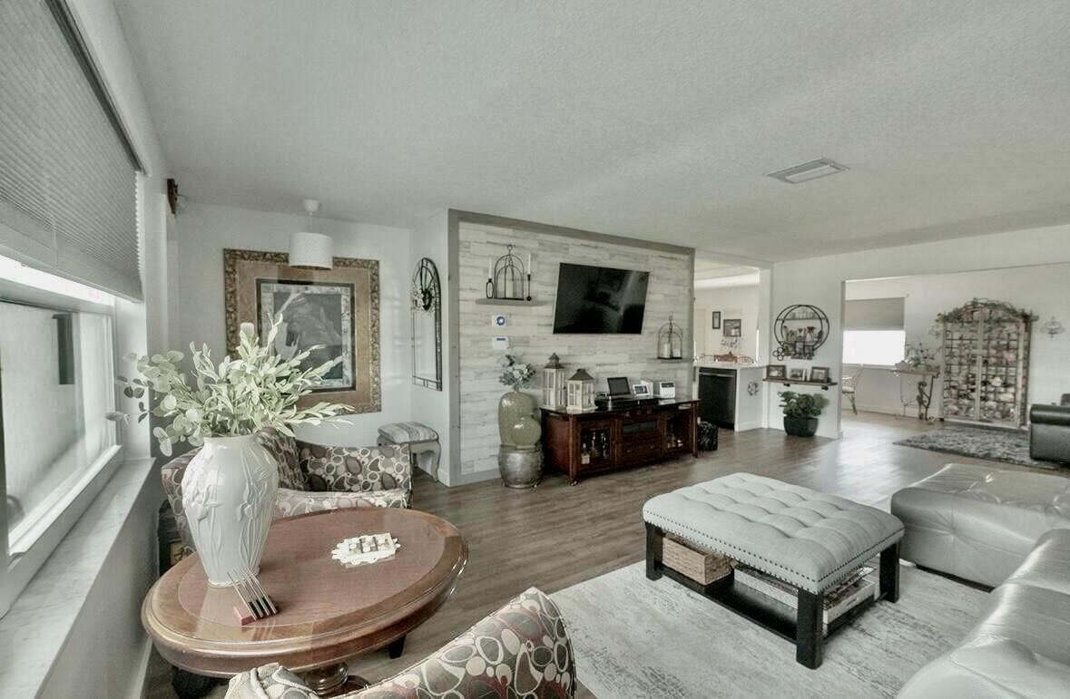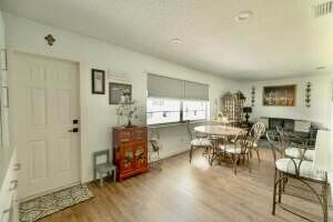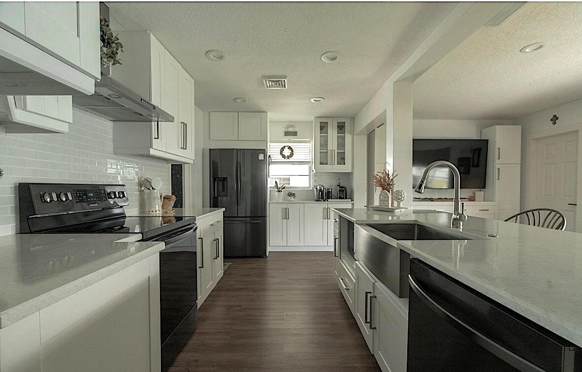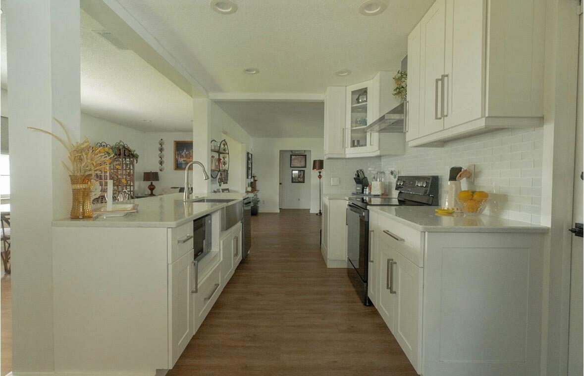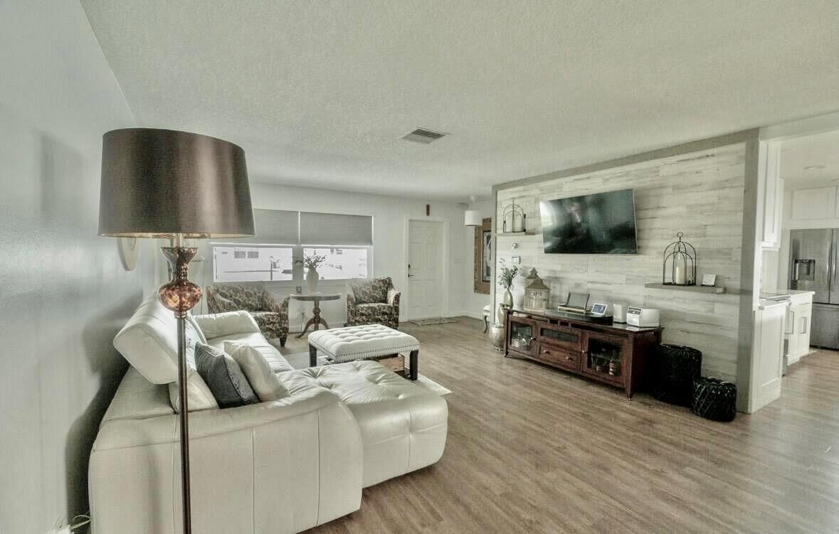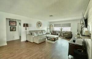 Move right in to this Stunning Renovation of the popular Edgewood model. New metal roof 2022/ new fascia boards/ rain gutters, new impact exterior and garage doors/ windows/ . New extended 2 car driveway with concrete walk around to rear patio. Designer LVP floors throughout. State of the art Kitchen with white shaker cabinets/ quartz countertops. All stainless appliances/hood . Gorgeous all new bathroom/ new vanities/ quartz counter tops/High-end porcelain tiles/ glass enclosures. 2023 York 3ton A/C /atticblown insulation. Timed lawn lighting. Ring security.Palm beach Leisureville is an active 55+ community. 18-hole par 3 golf course, 3 clubhouses 3 pools, saunas, and exercise centre. Located within min to beaches, I95, shops and restaurants. Don’t miss this chance to make it yours.