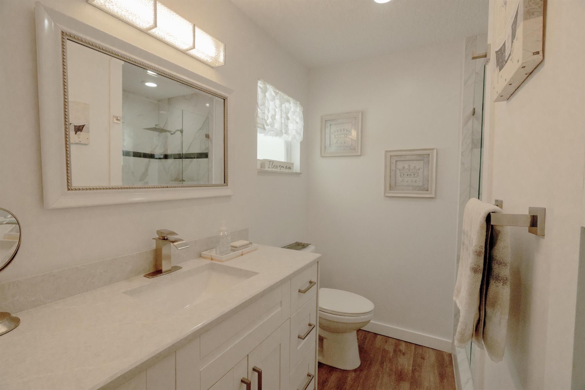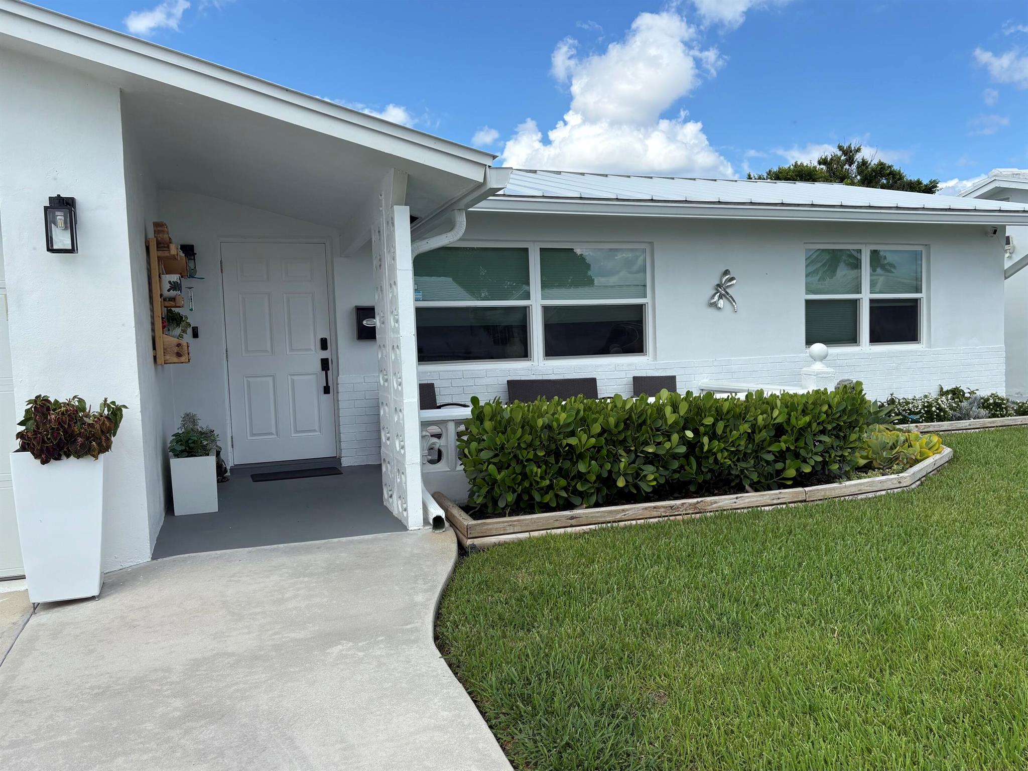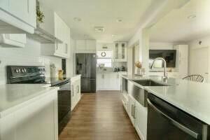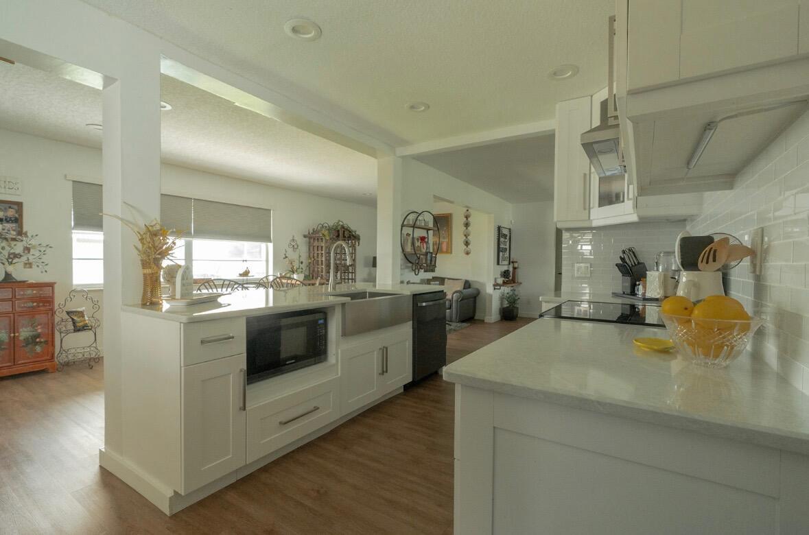 Move right in to this Stunning Renovation of the popular Edgewood model. New metal roof 2022/ new fascia boards/ rain gutters, new impact exterior and garage doors/ windows/ . New extended 2 car driveway with concrete walk around to rear patio. Designer LVP floors throughout. State of the art Kitchen with white shaker cabinets/ quartz countertops. All stainless appliances/hood . Gorgeous all new bathroom/ new vanities/ quartz counter tops/High-end porcelain tiles/ glass enclosures. 2023 York 3ton A/C /atticblown insulation. Timed lawn lighting. Ring security.Palm beach Leisureville is an active 55+ community. 18-hole par 3 golf course, 3 clubhouses 3 pools, saunas, and exercise centre. Located within min to beaches, I95, shops and restaurants. Don’t miss this chance to make it yours.