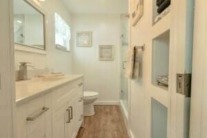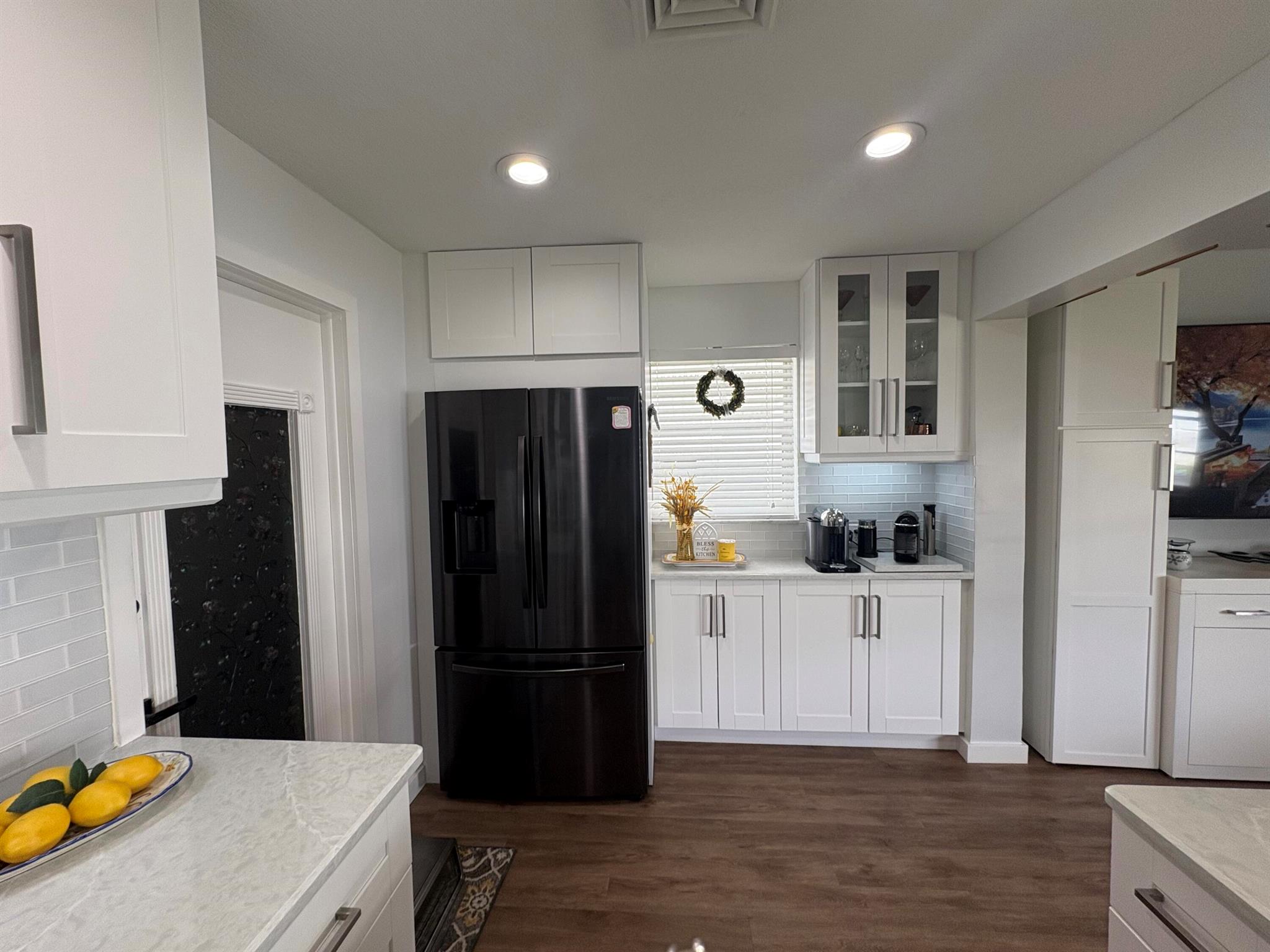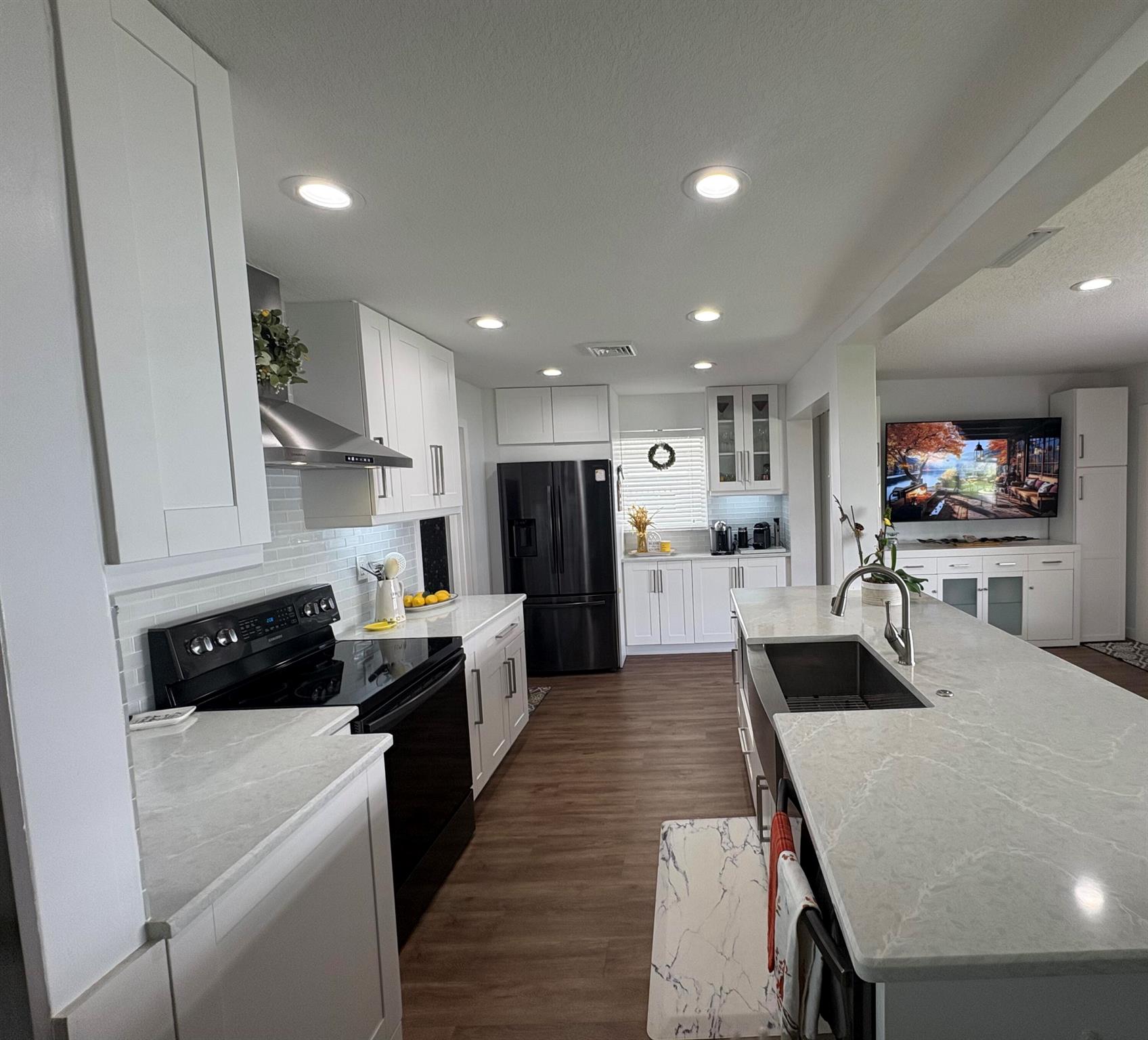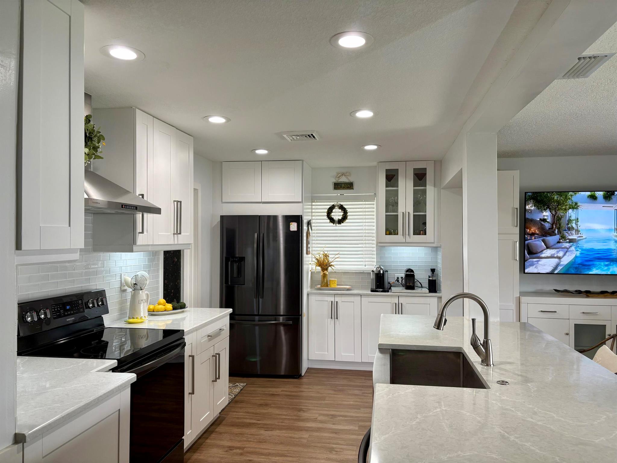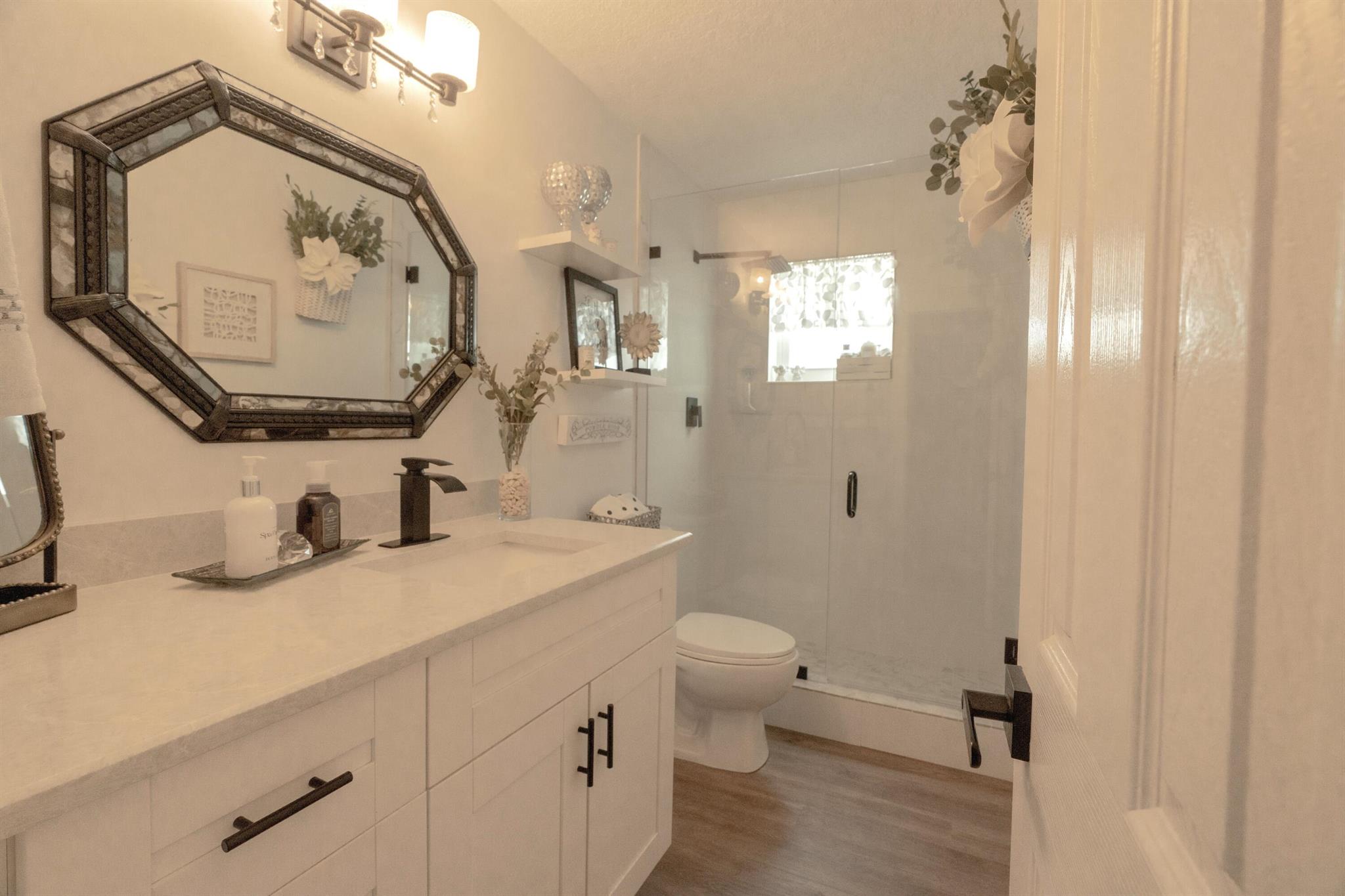 Move right in to this Stunning Renovation of the popular Edgewood model. New metal roof 2022/ new fascia boards/ rain gutters, new impact exterior and garage doors/ windows/ . New extended 2 car driveway with concrete walk around to rear patio. Designer LVP floors throughout. State of the art Kitchen with white shaker cabinets/ quartz countertops. All stainless appliances/hood . Gorgeous all new bathroom/ new vanities/ quartz counter tops/High-end porcelain tiles/ glass enclosures. 2023 York 3ton A/C /atticblown insulation. Timed lawn lighting. Ring security.Palm beach Leisureville is an active 55+ community. 18-hole par 3 golf course, 3 clubhouses 3 pools, saunas, and exercise centre. Located within min to beaches, I95, shops and restaurants. Don’t miss this chance to make it yours.