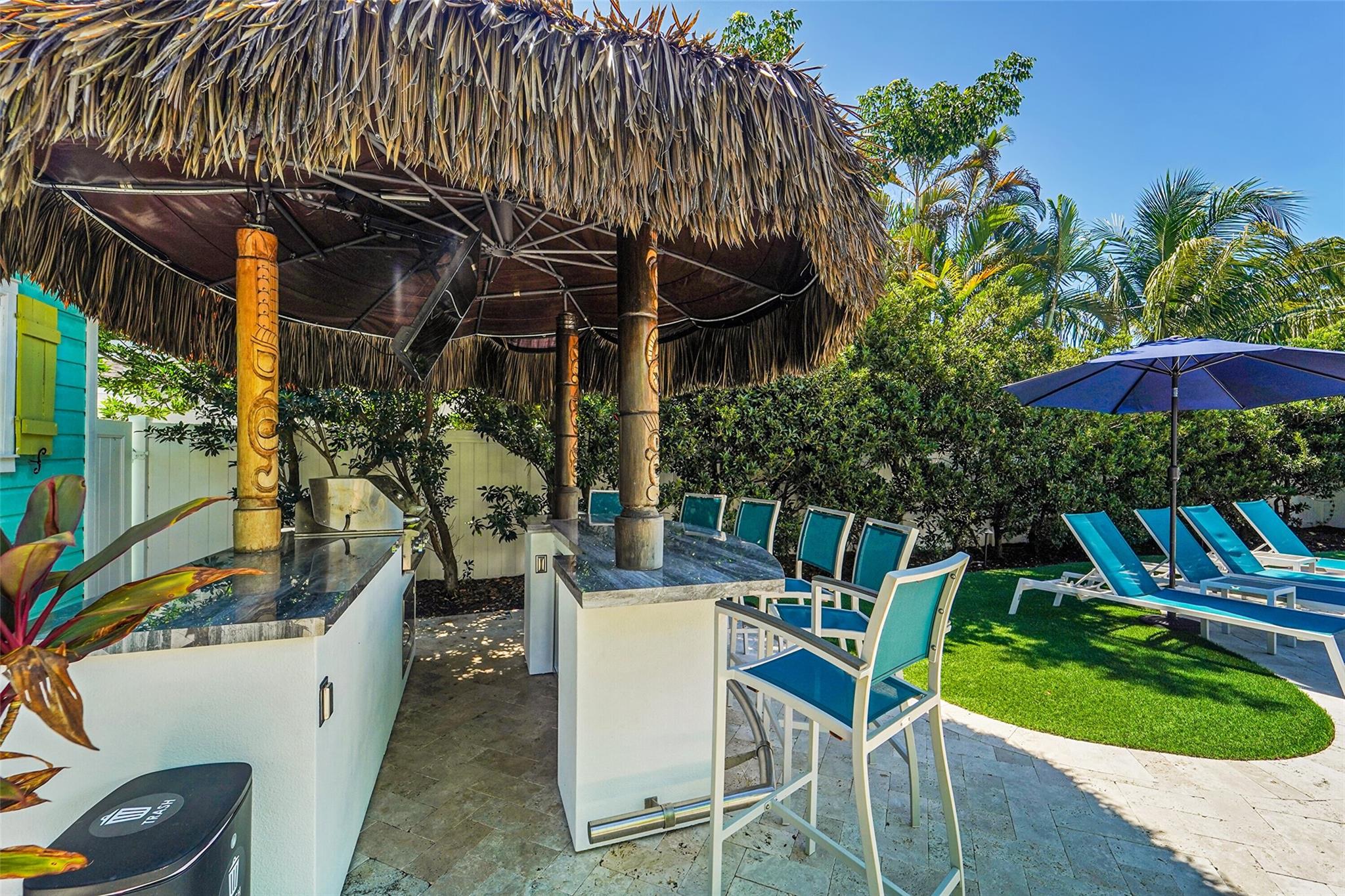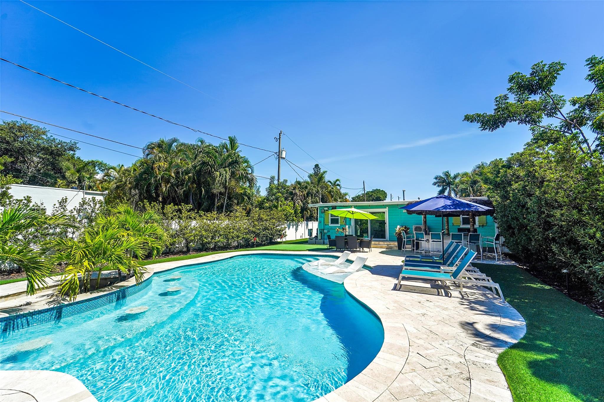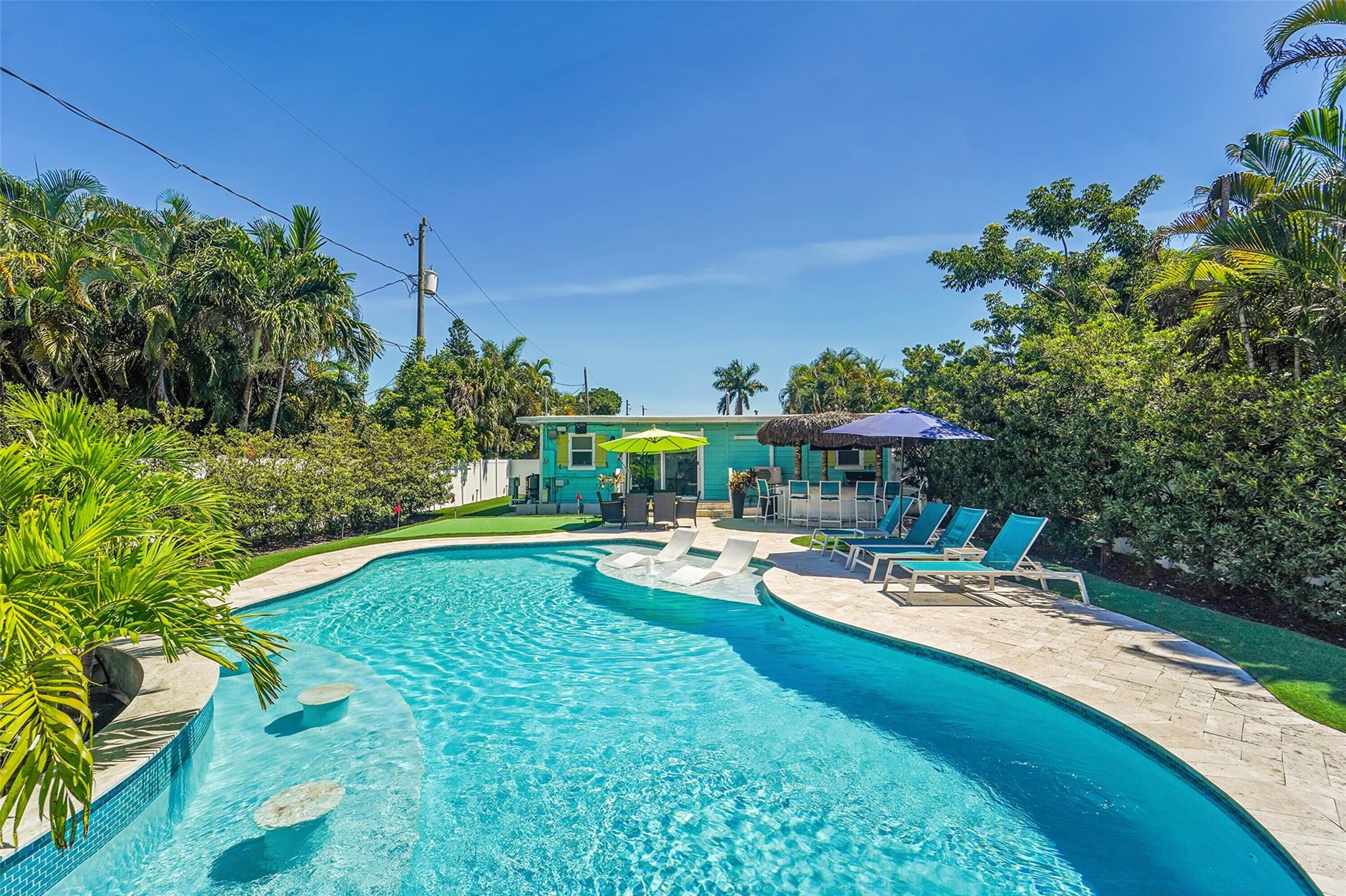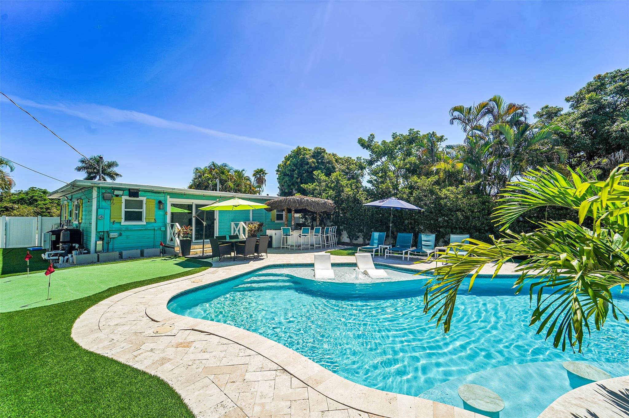 Charming, Key West style home with a large private oasis, a putting green, and a heated saltwater pool with sun shelf, and a swim-up bar for entertaining.
