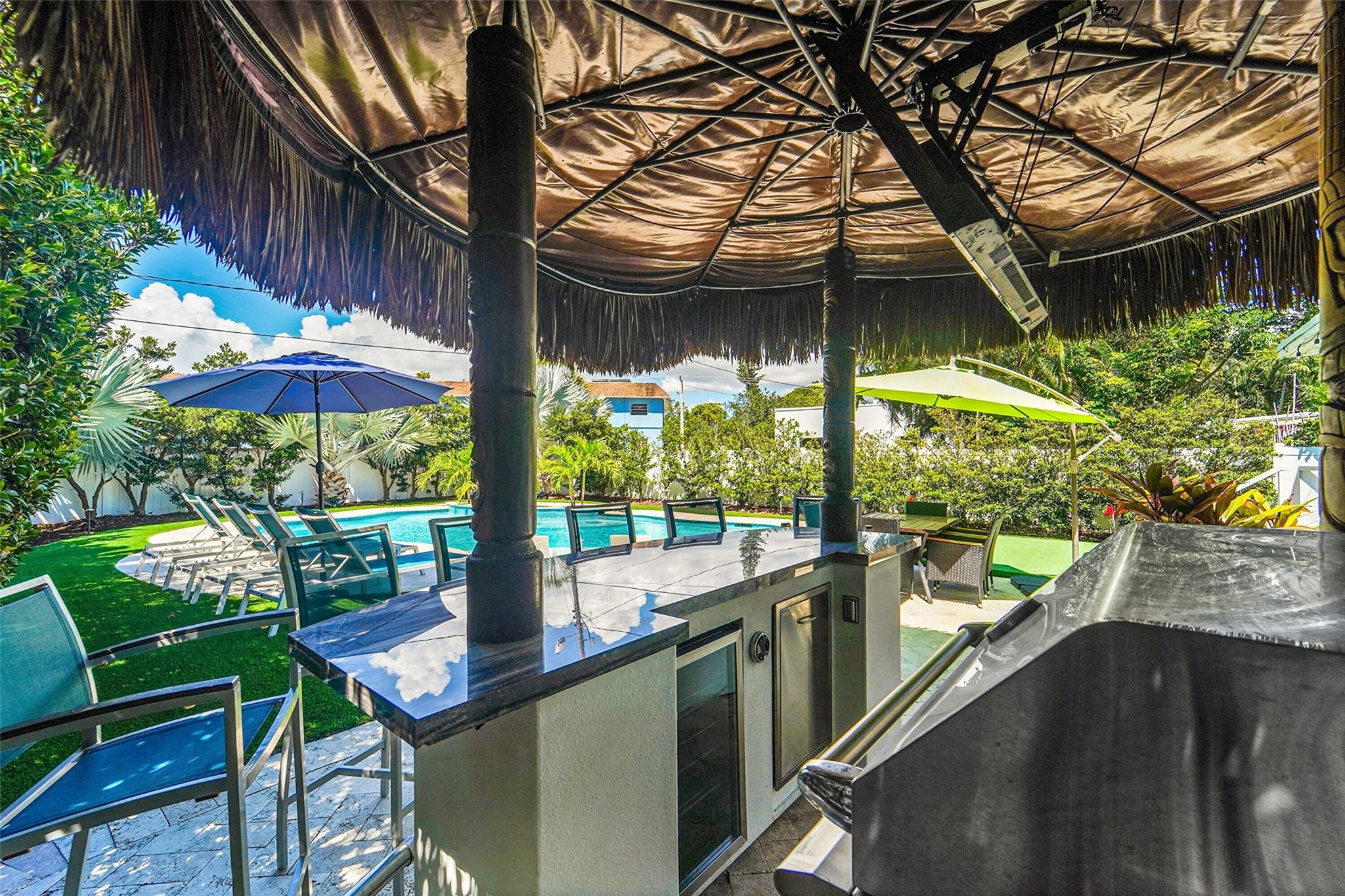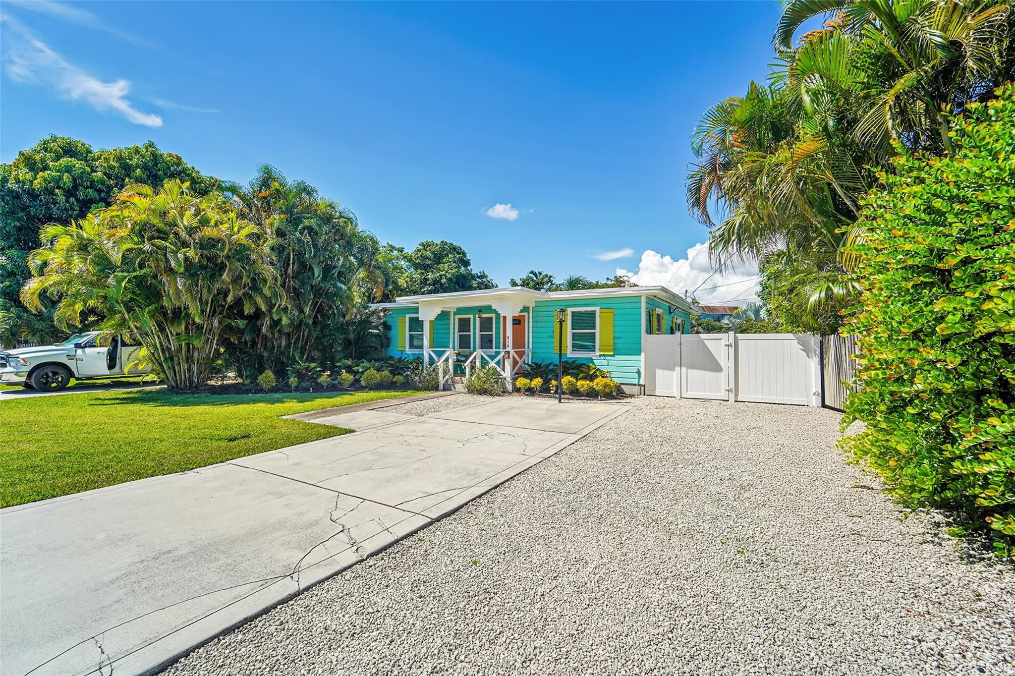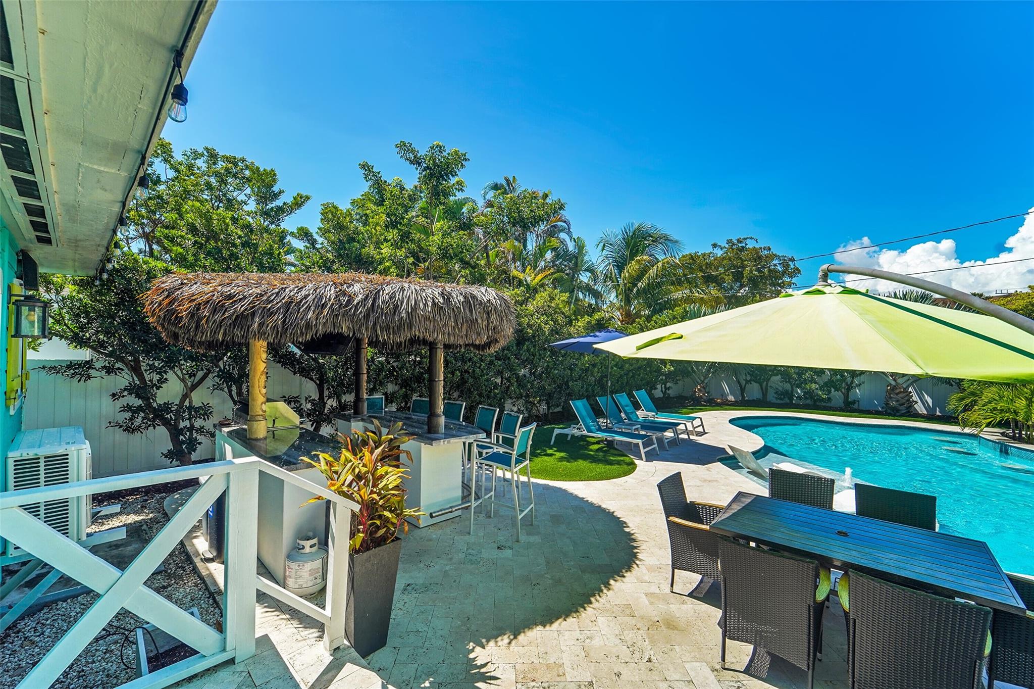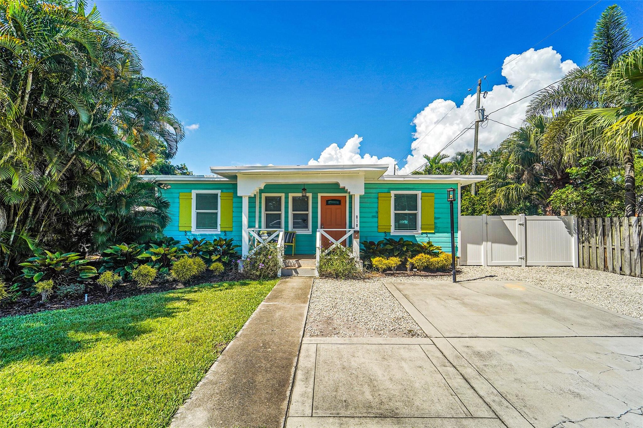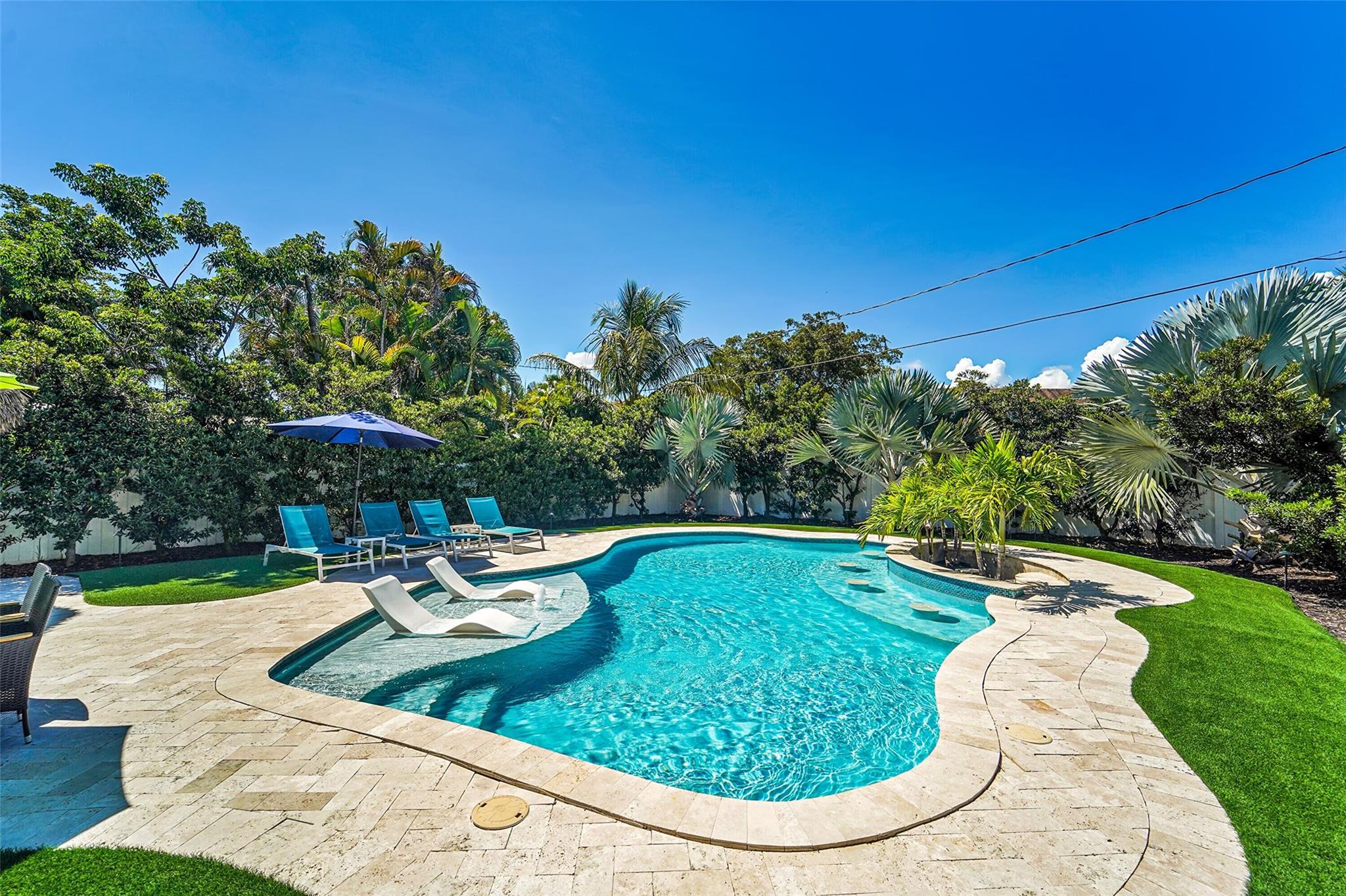 Charming, Key West style home with a large private oasis, a putting green, and a heated saltwater pool with sun shelf, and a swim-up bar for entertaining.