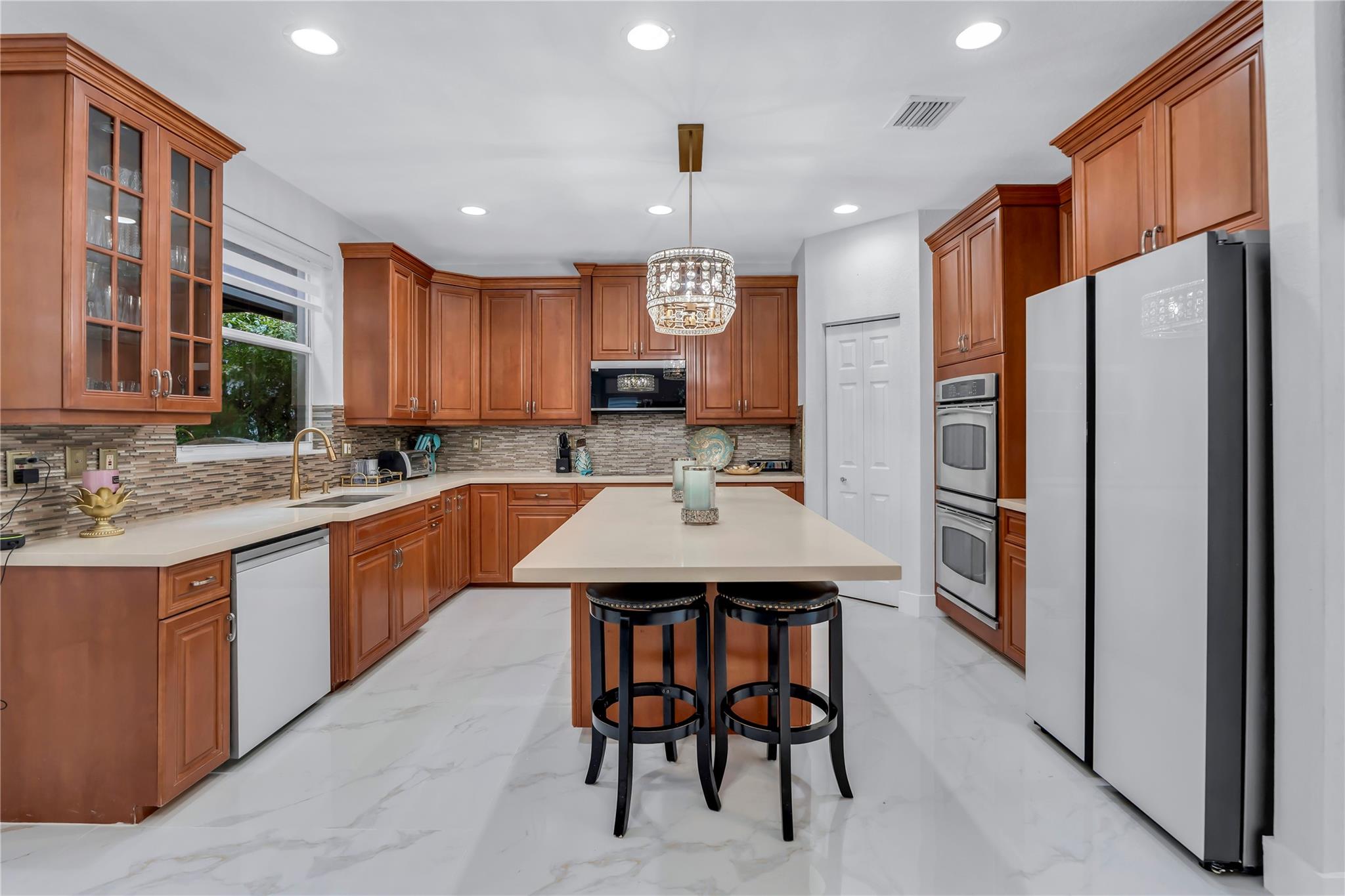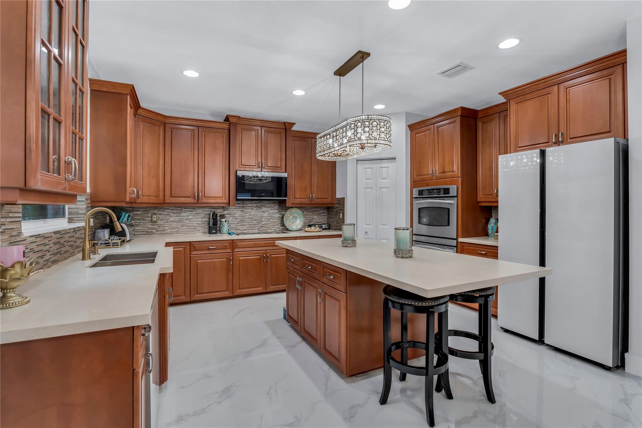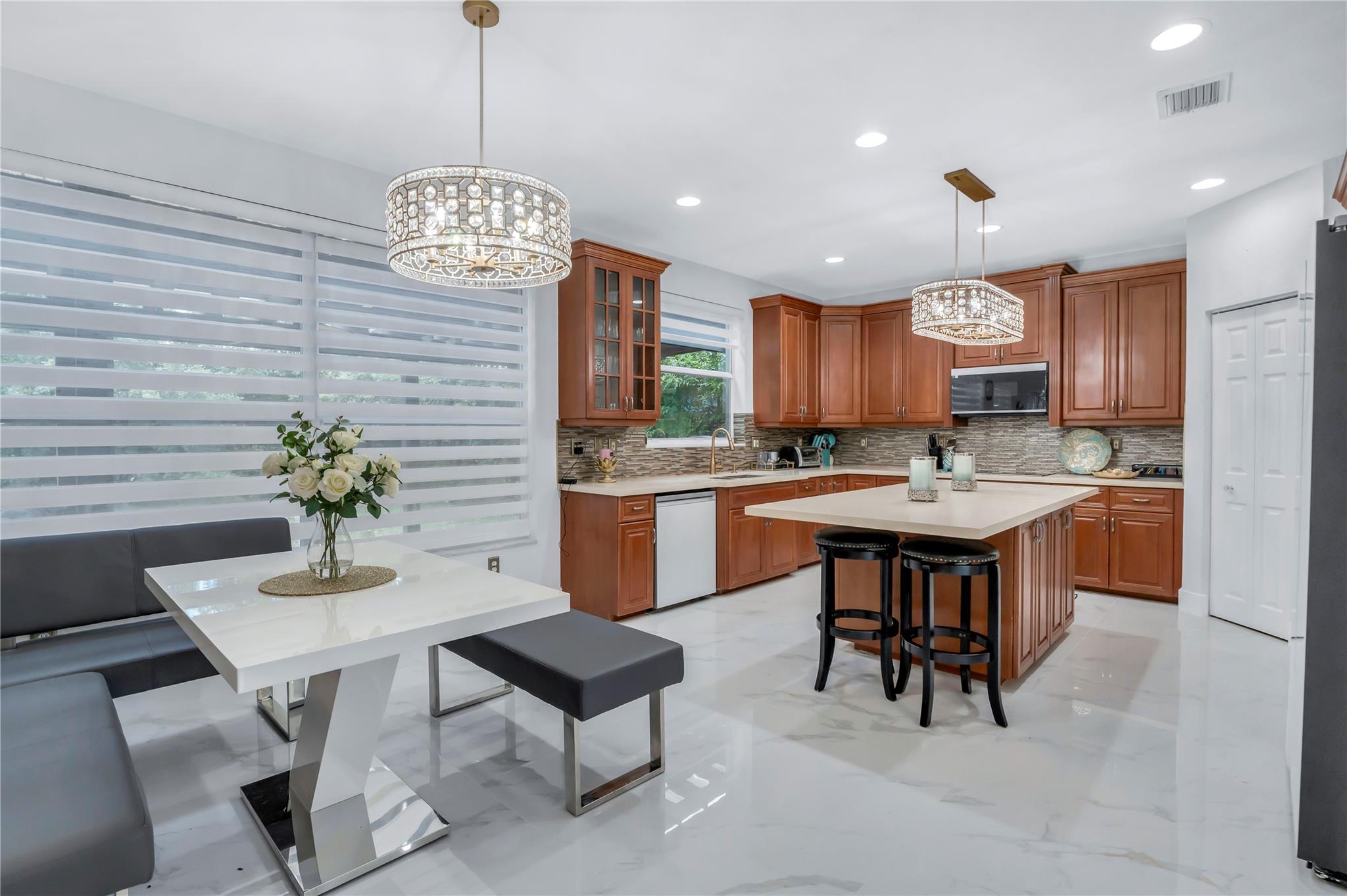 Experience luxury living in this beautifully updated 6-bedroom, 4-bathroom home in the prestigious, resort-style community of Sunset Lakes. This spacious residence features soaring ceilings, an oversized quartz island, and brand-new refrigerator, dishwasher, and microwave. Enjoy renovated bathrooms, 48×48 porcelain tile flooring downstairs, new plumbing & a new water heater. A full bedroom and bathroom on the first floor are perfect for guests or multigenerational living. Step outside to your private backyard oasis with a pool, pergola, and fully equipped outdoor kitchen. The community offers 24/7 guard-gated security & resort-style amenities, including a clubhouse, gym, pool, and tennis, basketball, and volleyball courts. The chandelier in the dining area is not included in the sale.