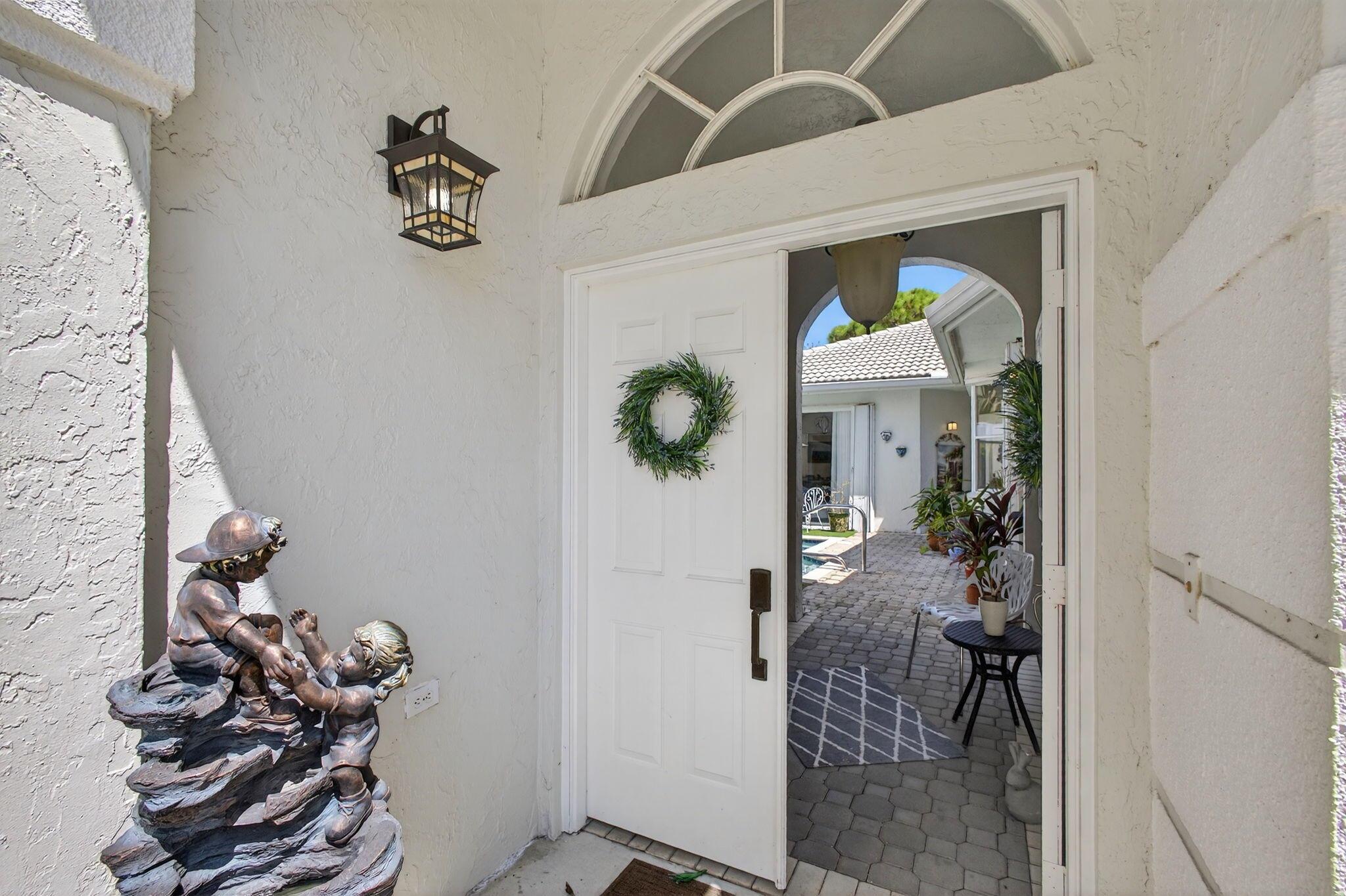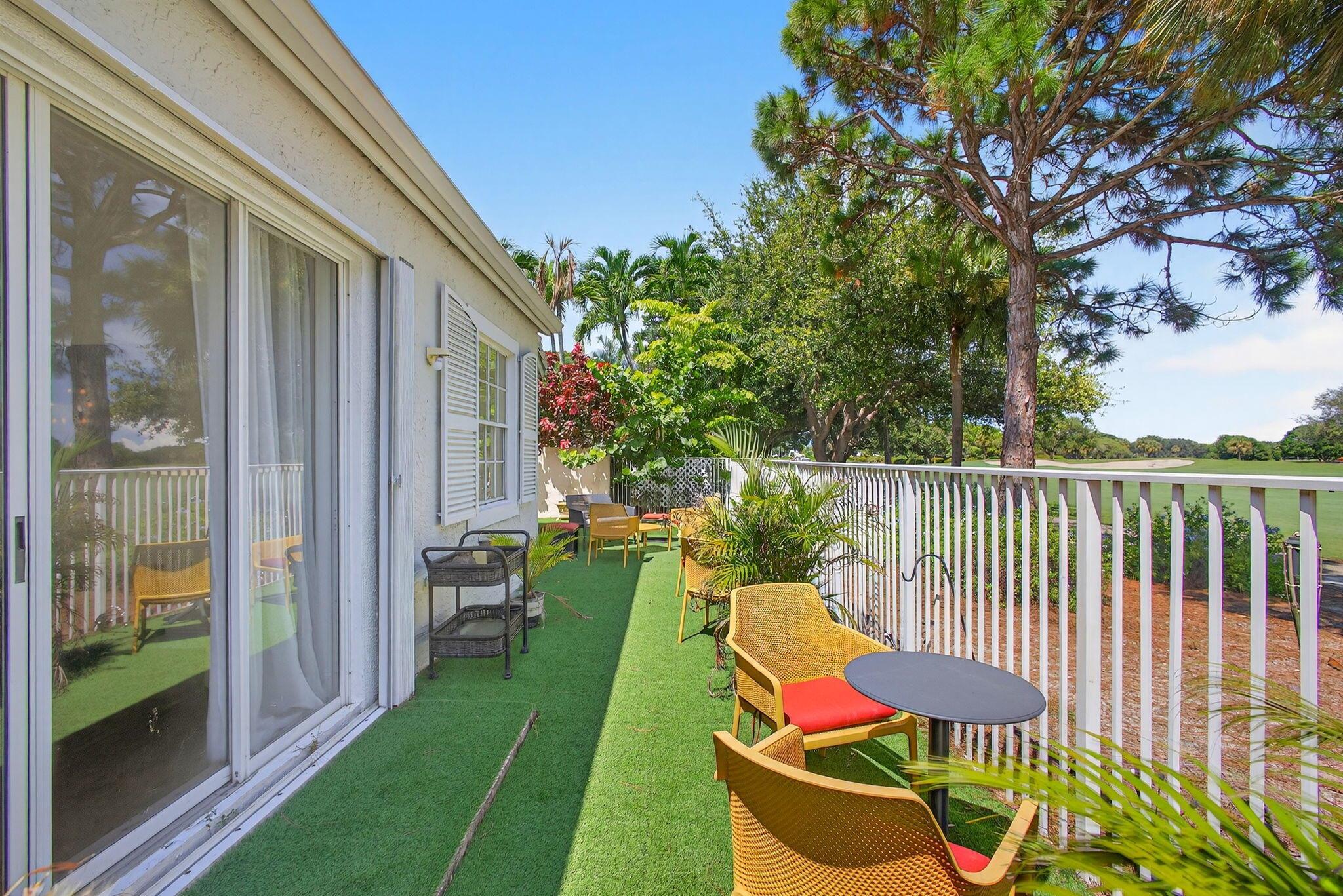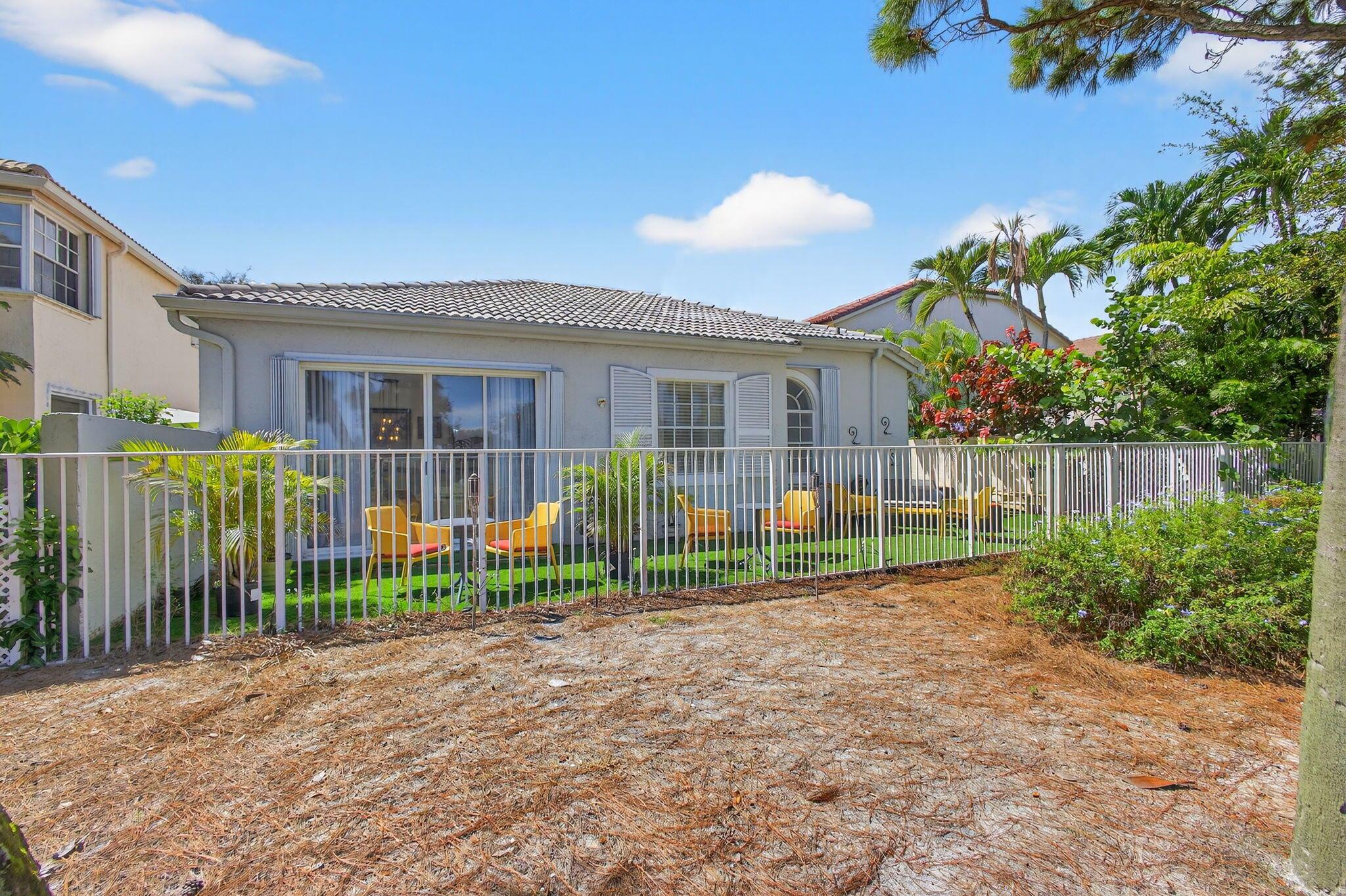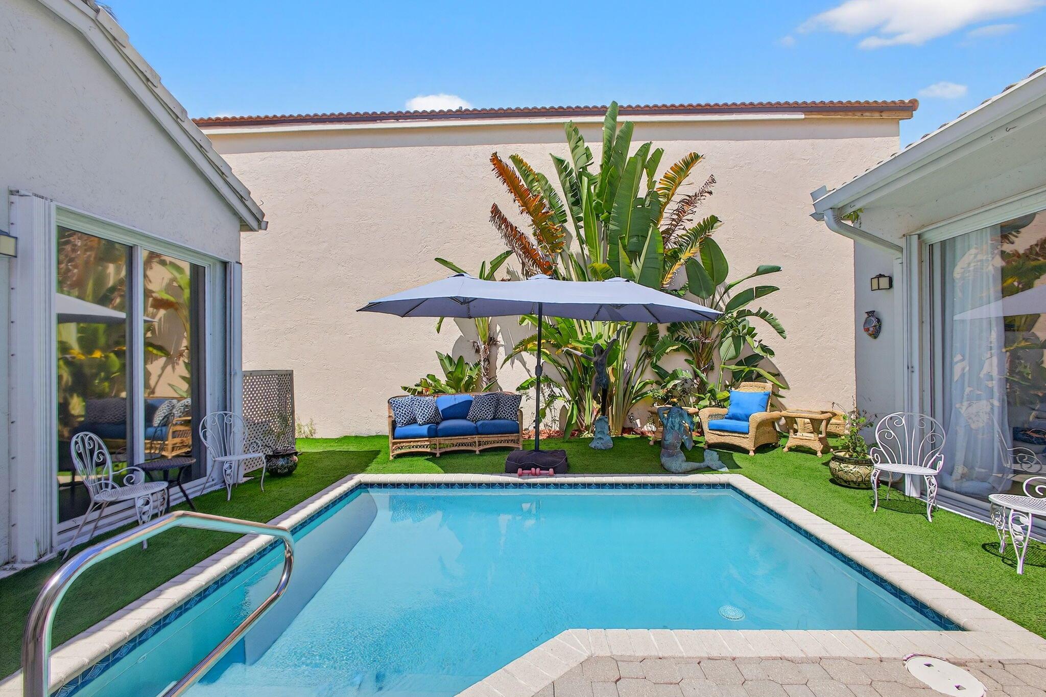 Rarely available single-story courtyard home perfectly situated on a private golf course lot! Experience the best of South Florida living with this distinctive floor plan, where the heart of the home opens to a private courtyard and sparkling pool surrounded by lush tropical landscaping. Start your mornings with coffee overlooking the tranquil fairways or unwind poolside in total privacy. The main residence boasts 2 bedrooms and 2 bathrooms, filled with natural light and highlighted by wood and tile flooring (no carpet!) The open airy design seamlessly blends indoor comfort with picturesque golf course views, creating a home that in both inviting and unique.The kitchen has been tastefully updated with plenty of cabinetry, Corian countertops, and an oversized stainless steel Kitchen Aid