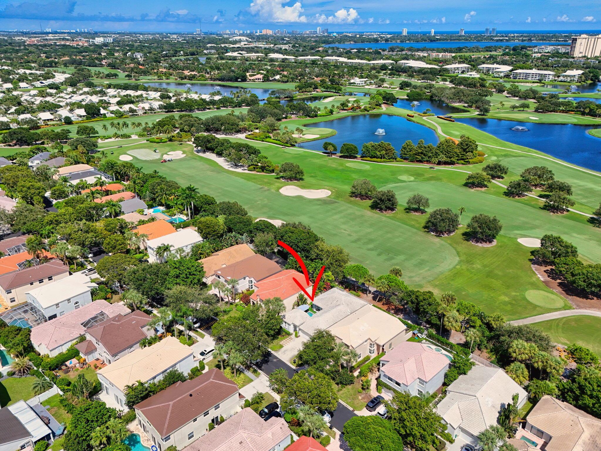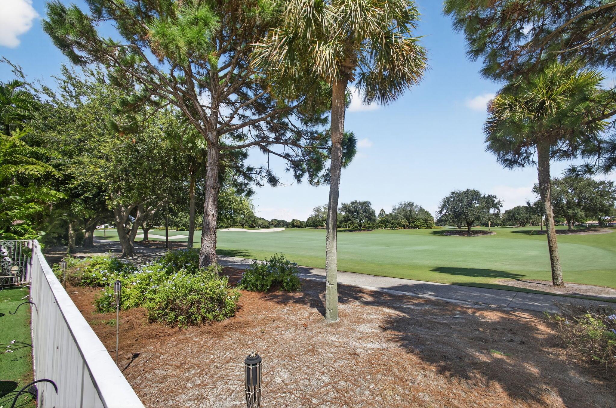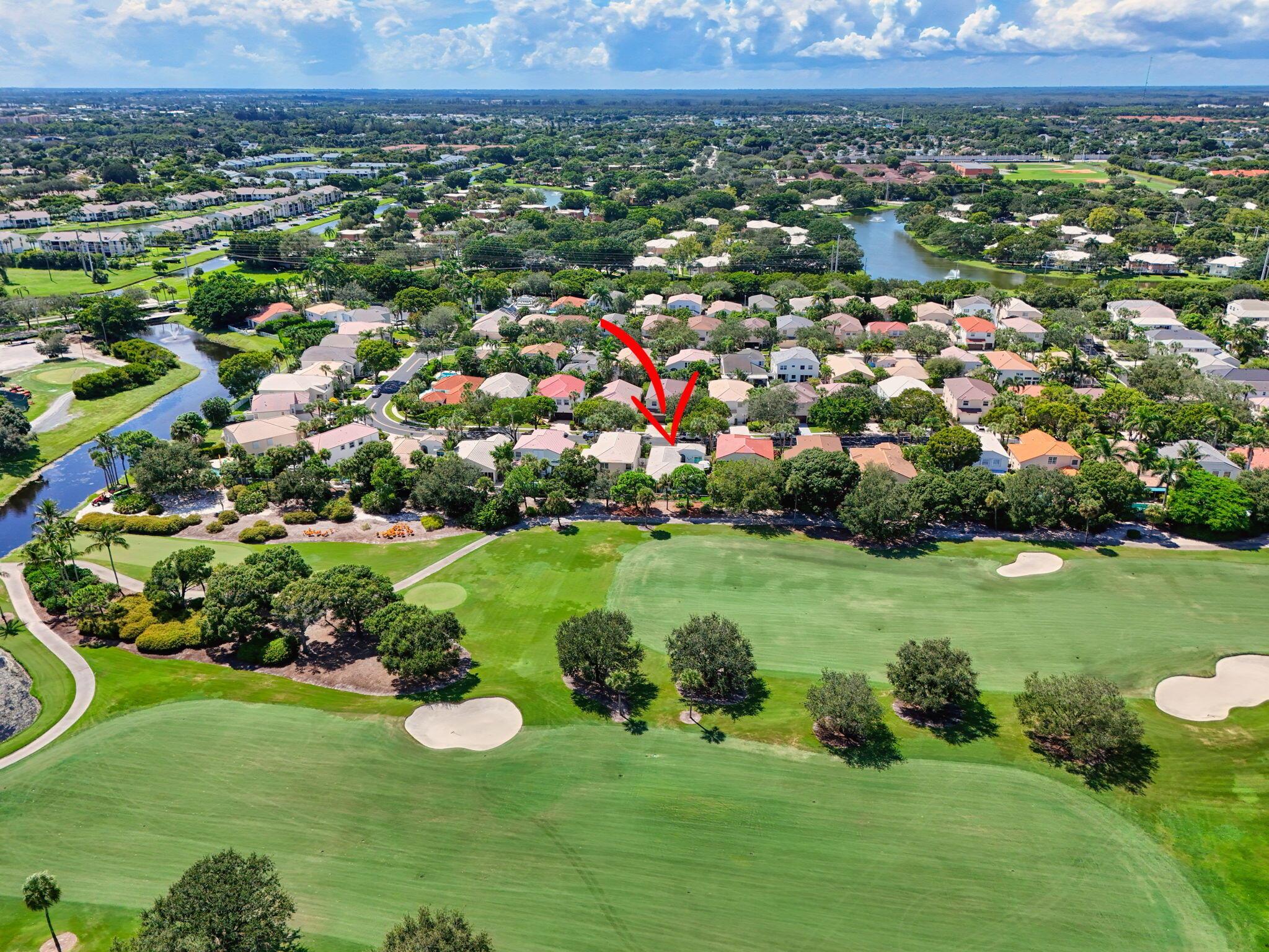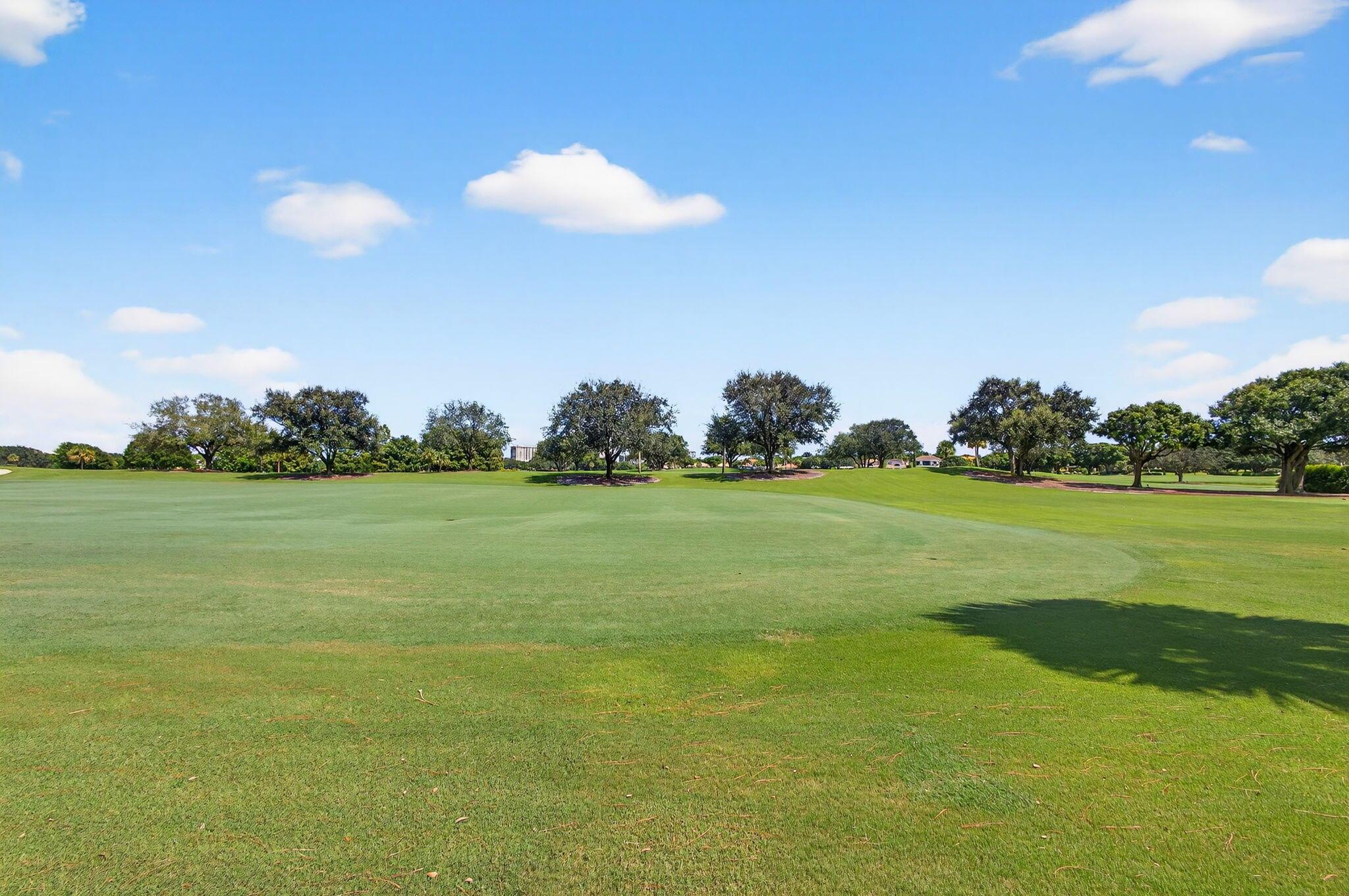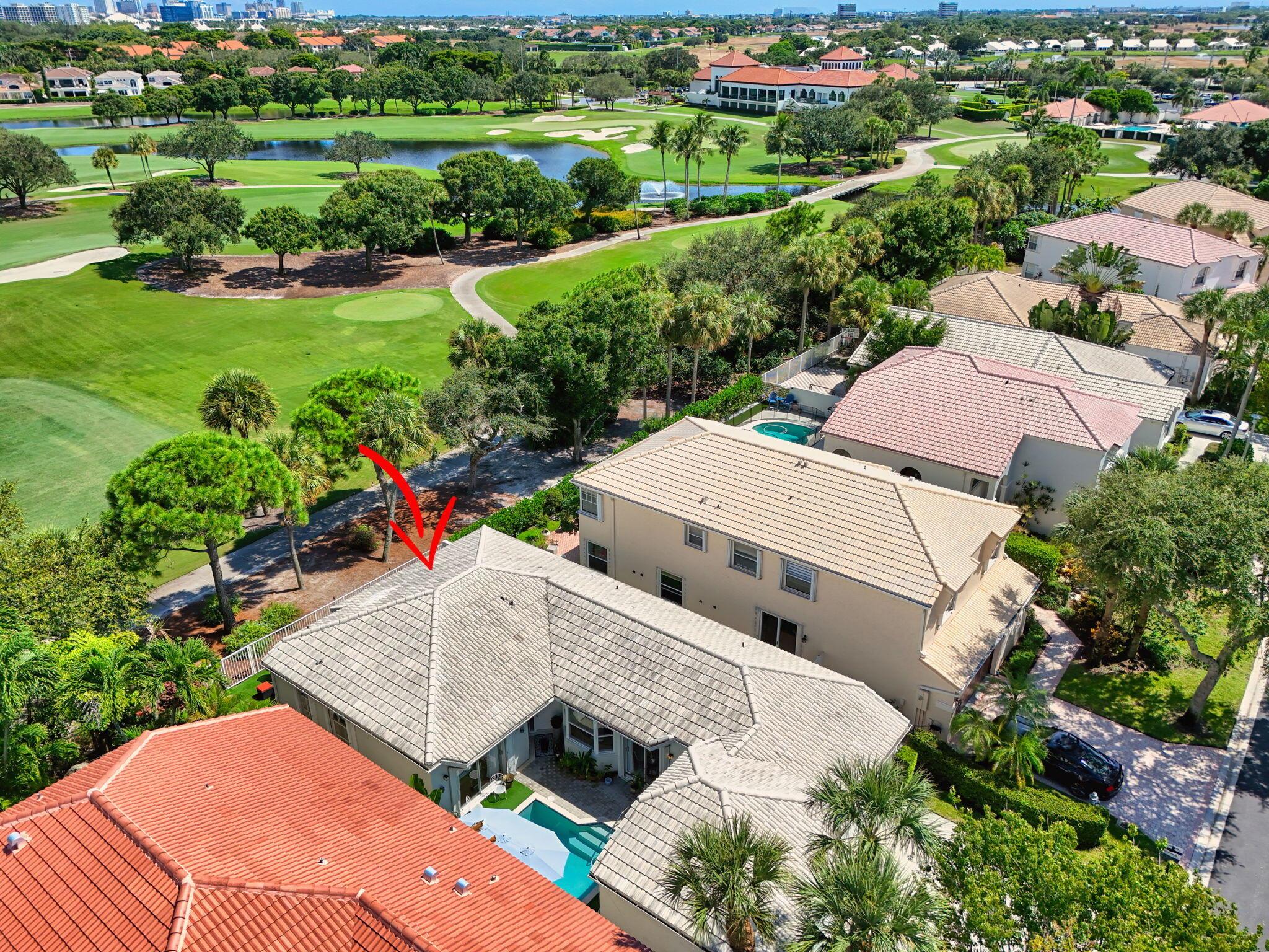 Rarely available single-story courtyard home perfectly situated on a private golf course lot! Experience the best of South Florida living with this distinctive floor plan, where the heart of the home opens to a private courtyard and sparkling pool surrounded by lush tropical landscaping. Start your mornings with coffee overlooking the tranquil fairways or unwind poolside in total privacy. The main residence boasts 2 bedrooms and 2 bathrooms, filled with natural light and highlighted by wood and tile flooring (no carpet!) The open airy design seamlessly blends indoor comfort with picturesque golf course views, creating a home that in both inviting and unique.The kitchen has been tastefully updated with plenty of cabinetry, Corian countertops, and an oversized stainless steel Kitchen Aid