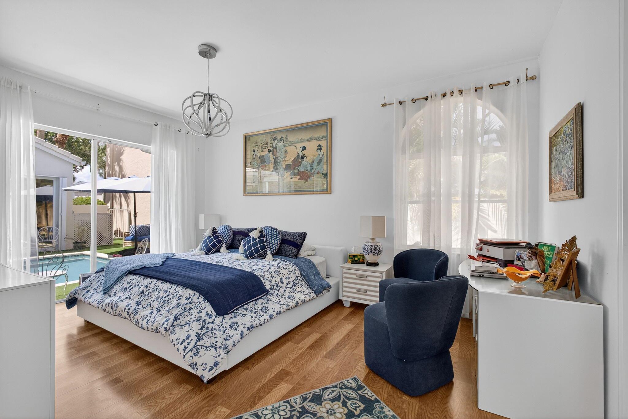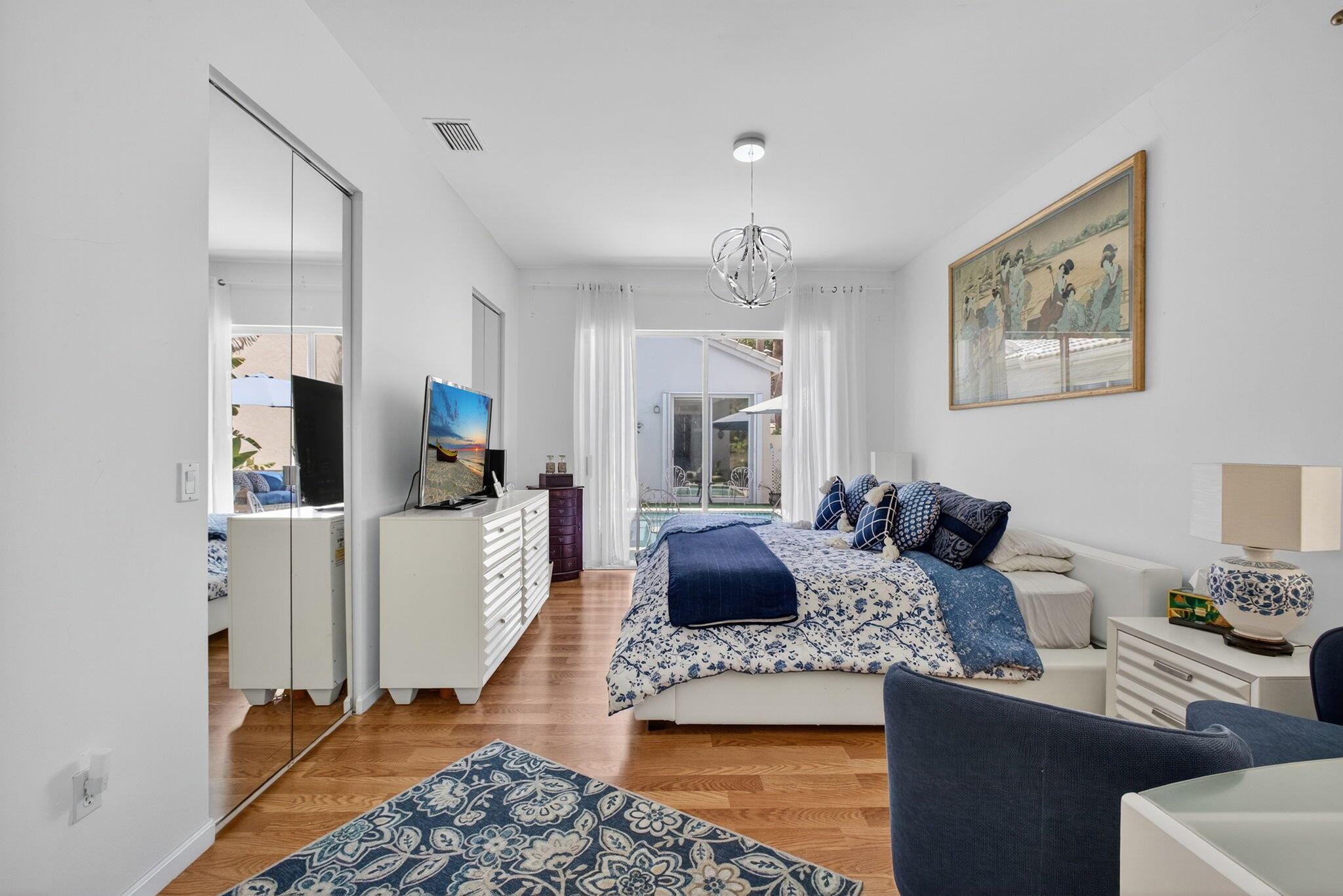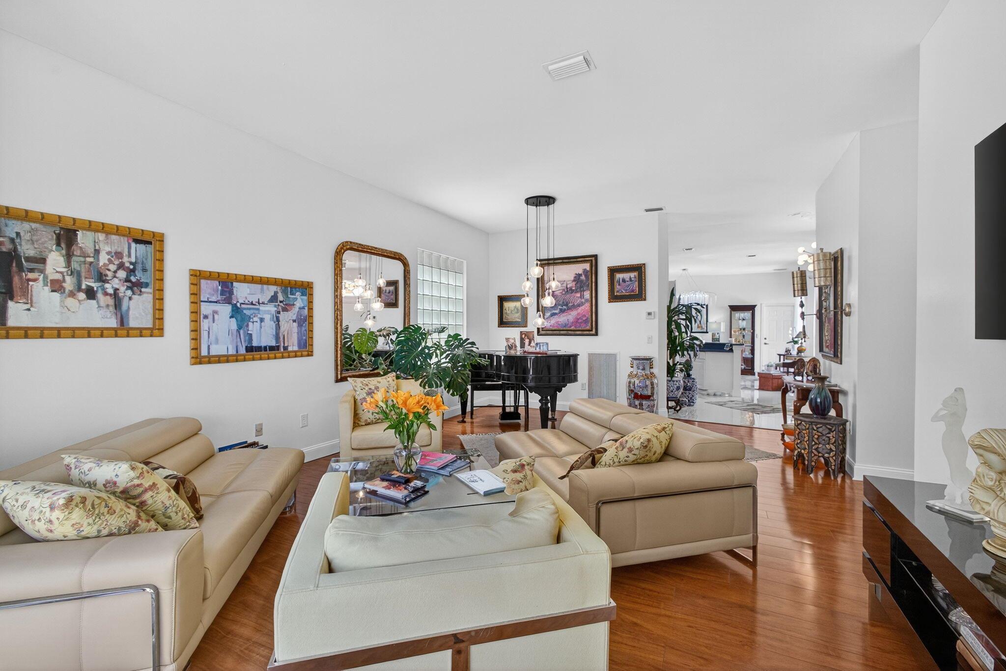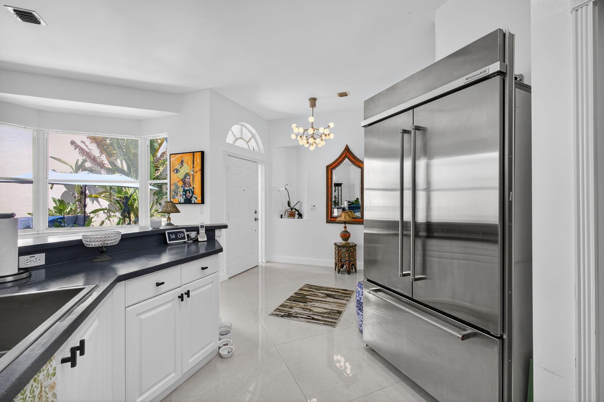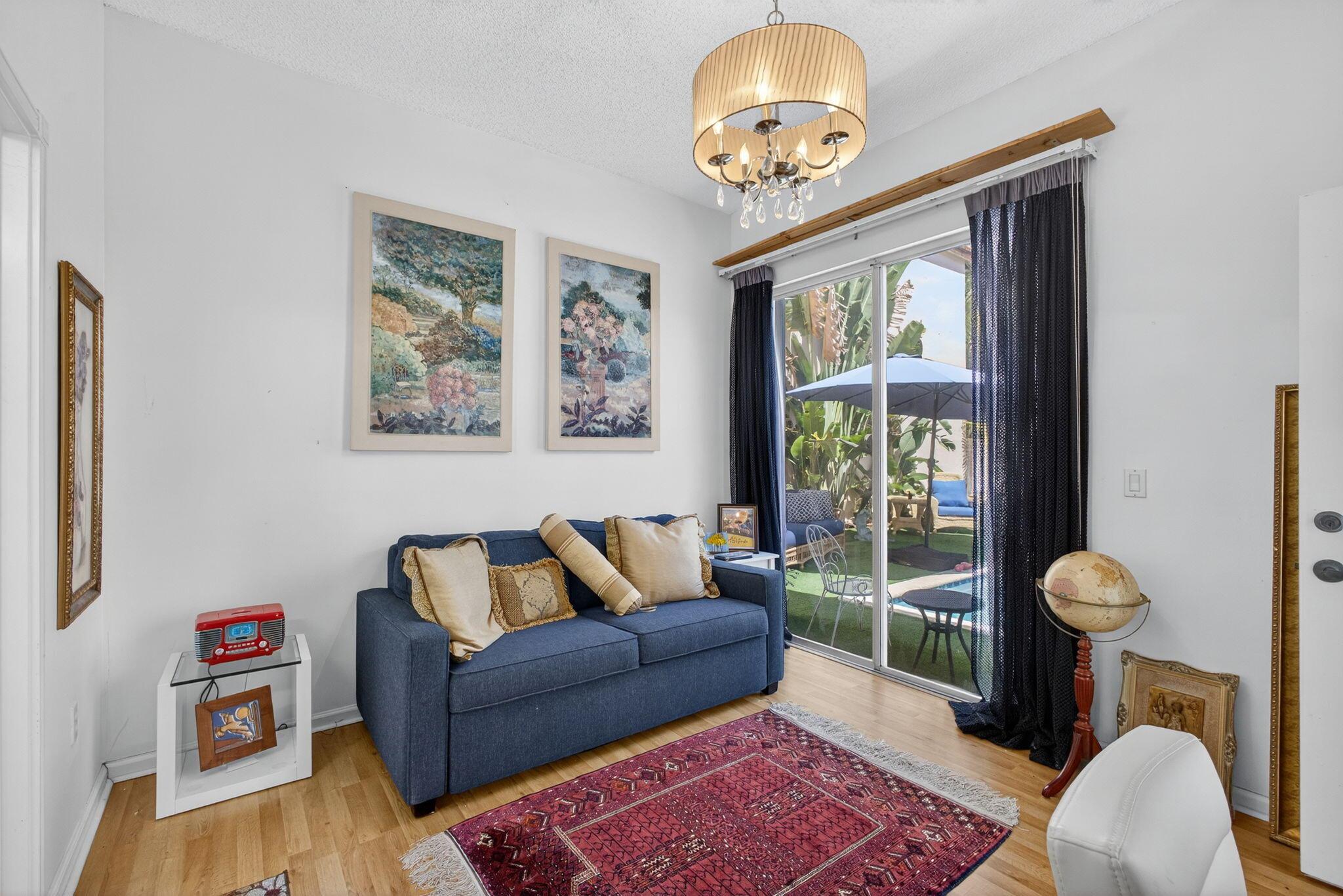Rarely available single-story courtyard home perfectly situated on a private golf course lot! Experience the best of South Florida living with this distinctive floor plan, where the heart of the home opens to a private courtyard and sparkling pool surrounded by lush tropical landscaping. Start your mornings with coffee overlooking the tranquil fairways or unwind poolside in total privacy. The main residence boasts 2 bedrooms and 2 bathrooms, filled with natural light and highlighted by wood and tile flooring (no carpet!) The open airy design seamlessly blends indoor comfort with picturesque golf course views, creating a home that in both inviting and unique.The kitchen has been tastefully updated with plenty of cabinetry, Corian countertops, and an oversized stainless steel Kitchen Aid