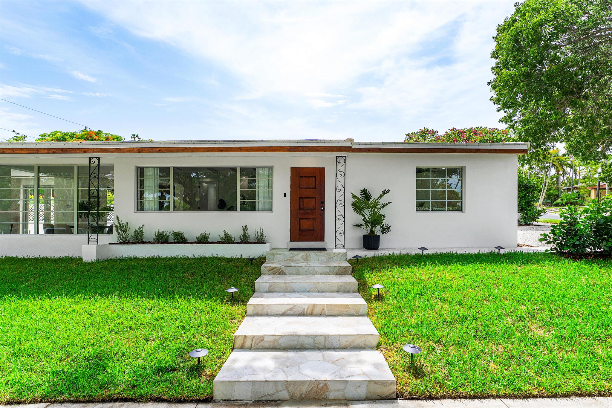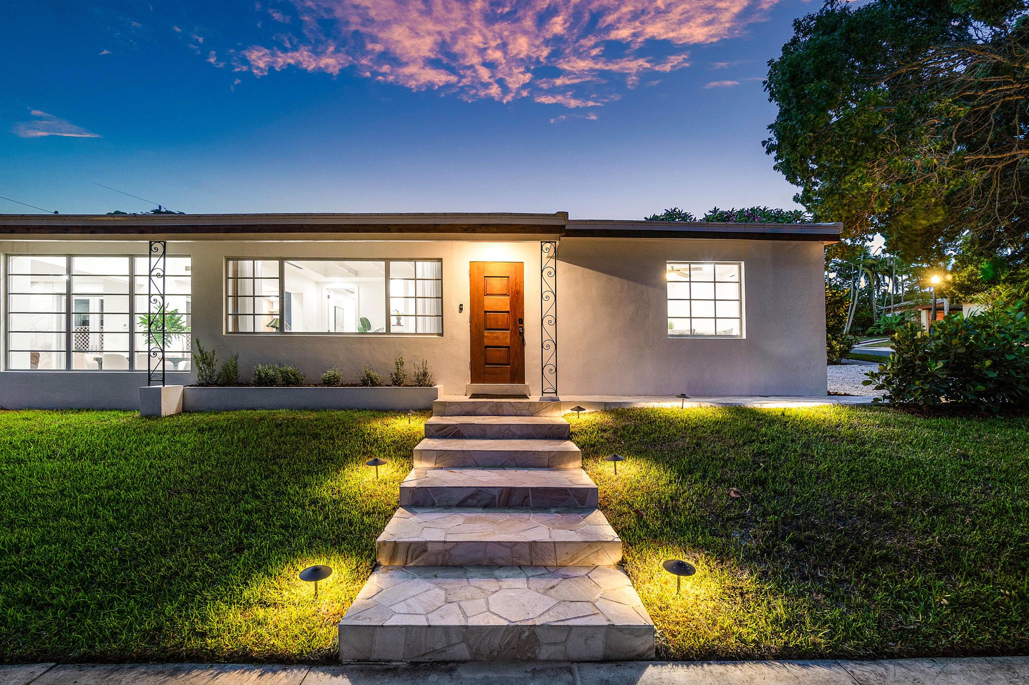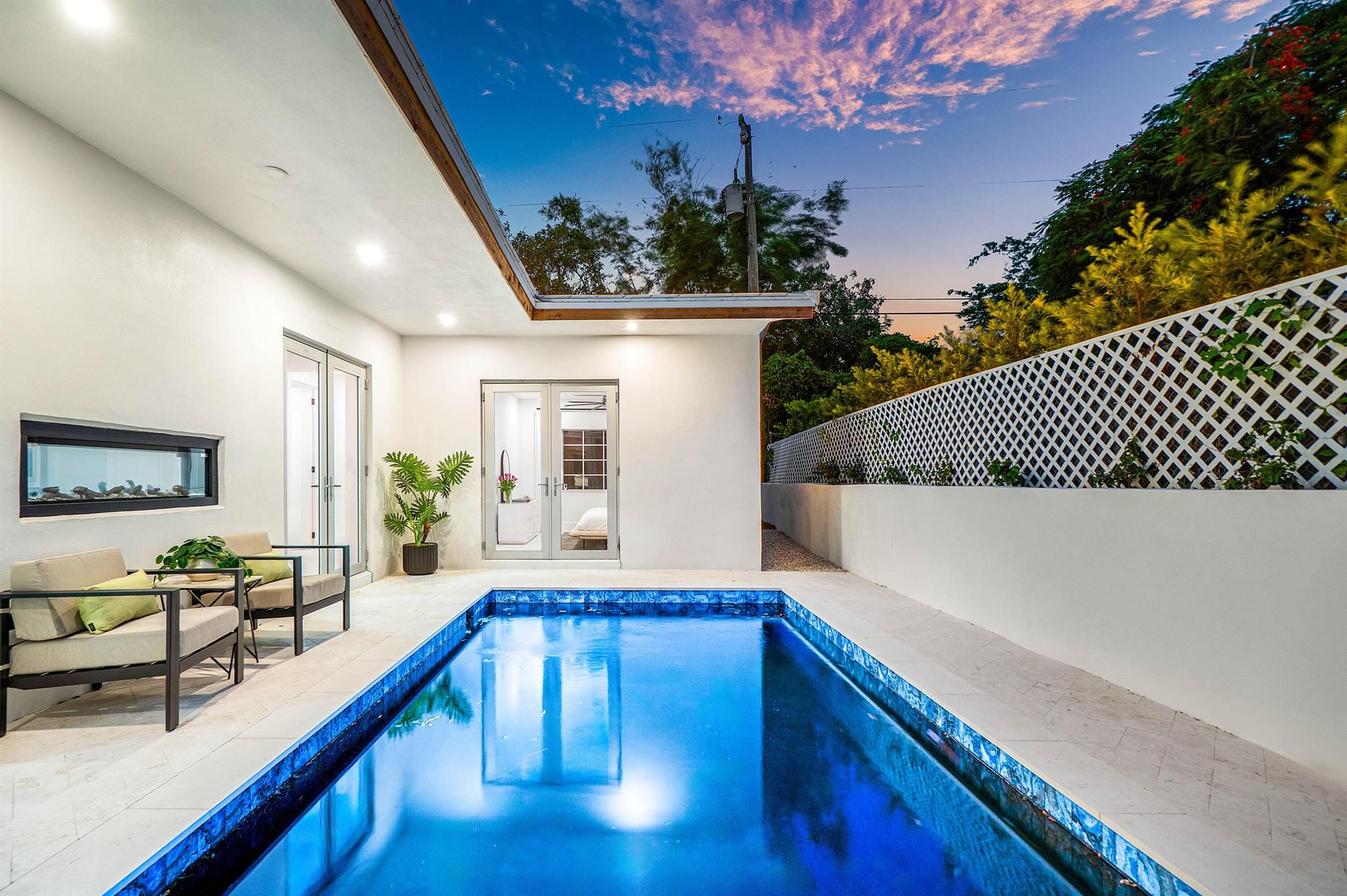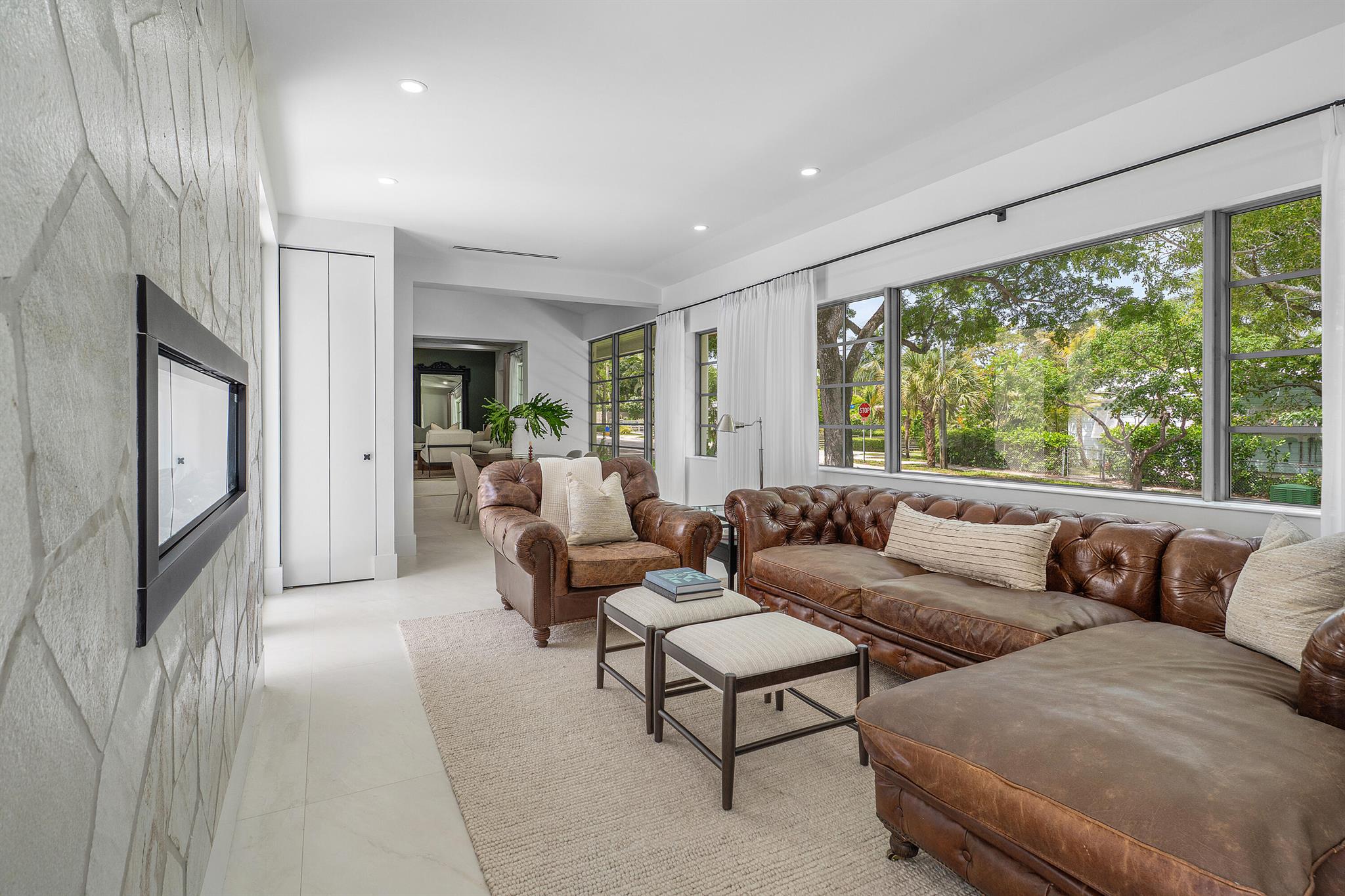2330 Lake Avenue is a true showpiece–reimagined in 2025 by award-winning Flamingo Park Development and thoughtfully crafted to stand apart in one of West Palm Beach’s most beloved historic neighborhoods.Behind its timeless facade lies a fully transformed single-story home offering 4 bedrooms, 3.5 bathrooms, a brand-new addition and pool, and design-forward interior–all within minutes from Downtown West Palm Beach and Palm Beach Island.This home blends historic character with a modern edge. Oversized 4′ x 4′ porcelain tile flooring sets the tone for the custom interior, where exposed ceiling beams, solid core wood doors, and clean-lined trim elevate the space.At the heart of the home is a dramatic dual-sided electric fireplace clad in quartz flagstone mosaic, accompanied