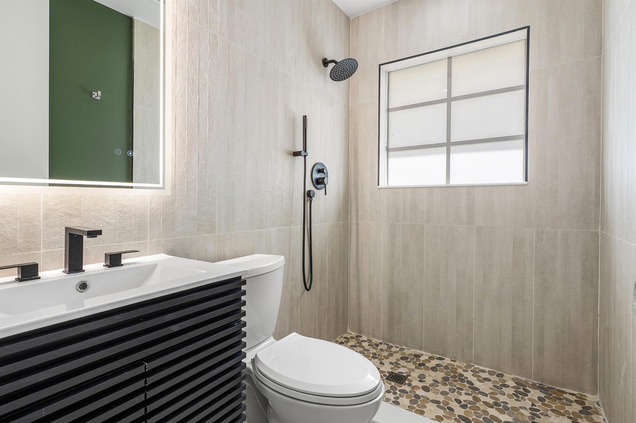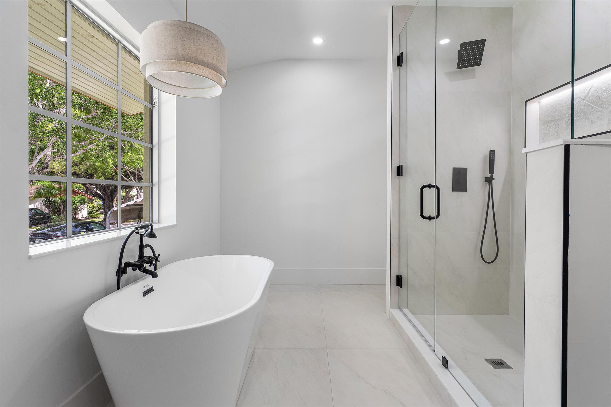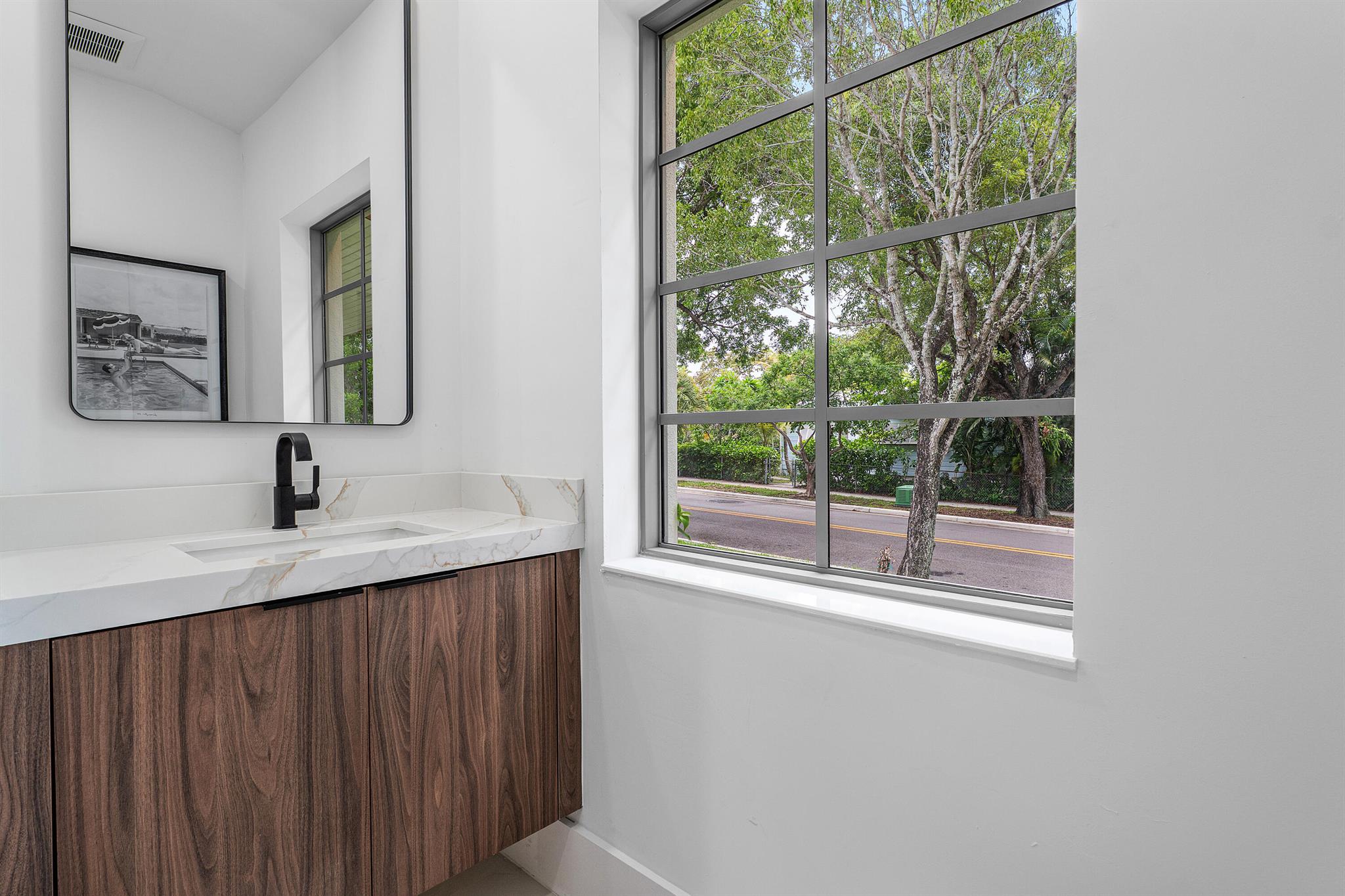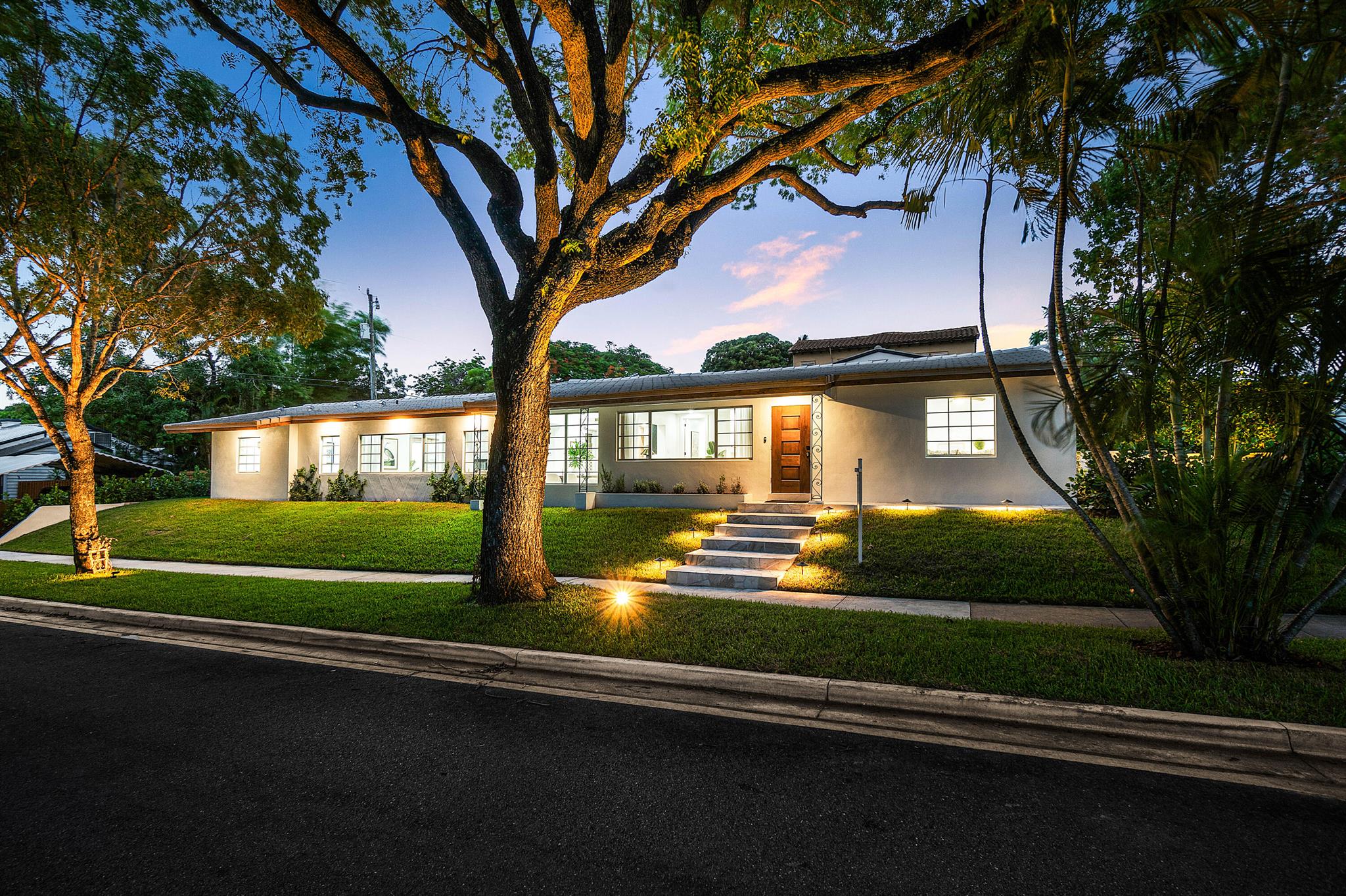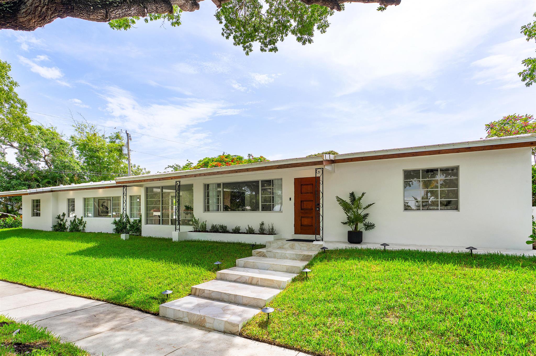 2330 Lake Avenue is a true showpiece–reimagined in 2025 by award-winning Flamingo Park Development and thoughtfully crafted to stand apart in one of West Palm Beach’s most beloved historic neighborhoods.Behind its timeless facade lies a fully transformed single-story home offering 4 bedrooms, 3.5 bathrooms, a brand-new addition and pool, and design-forward interior–all within minutes from Downtown West Palm Beach and Palm Beach Island.This home blends historic character with a modern edge. Oversized 4′ x 4′ porcelain tile flooring sets the tone for the custom interior, where exposed ceiling beams, solid core wood doors, and clean-lined trim elevate the space.At the heart of the home is a dramatic dual-sided electric fireplace clad in quartz flagstone mosaic, accompanied