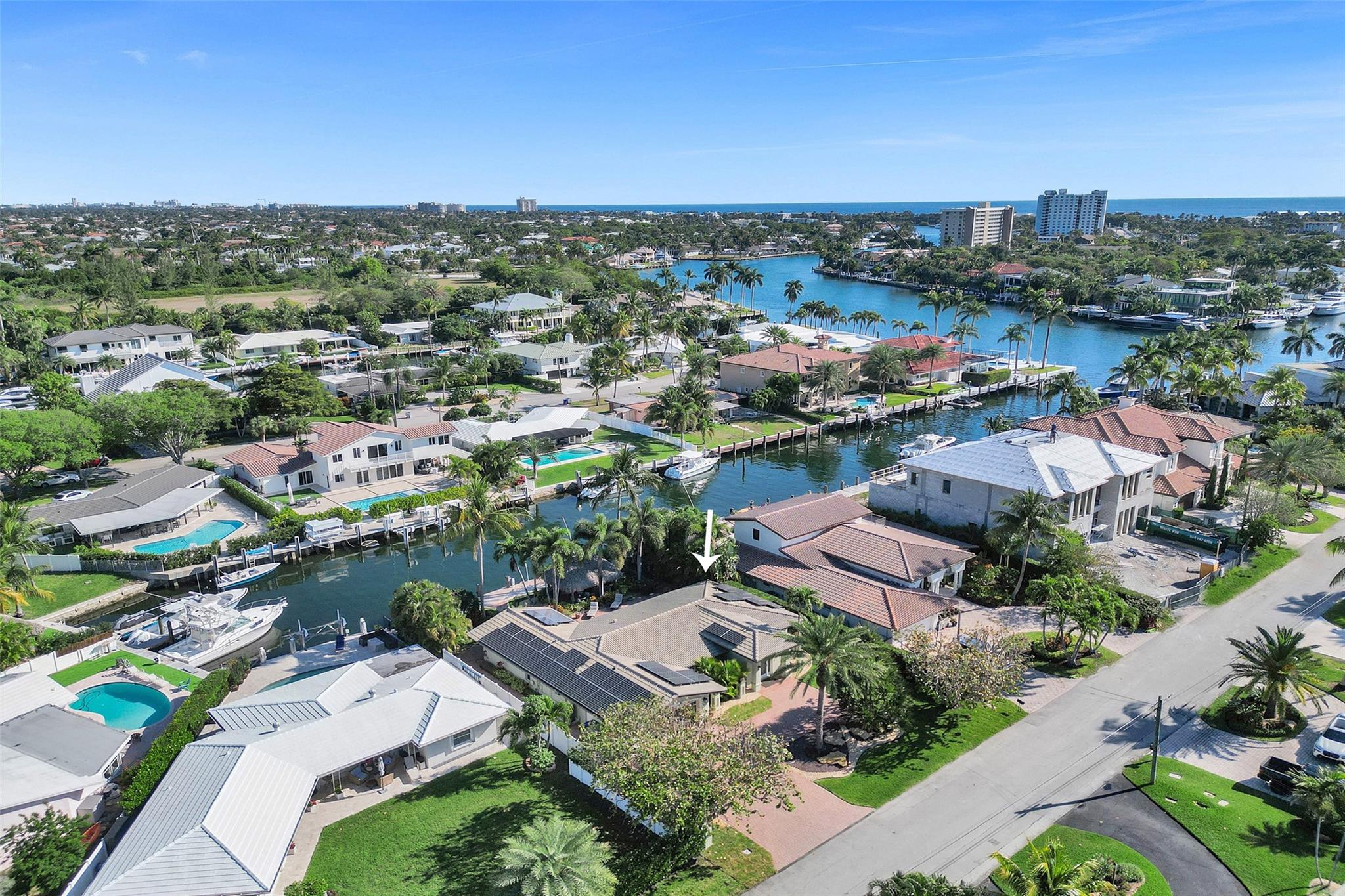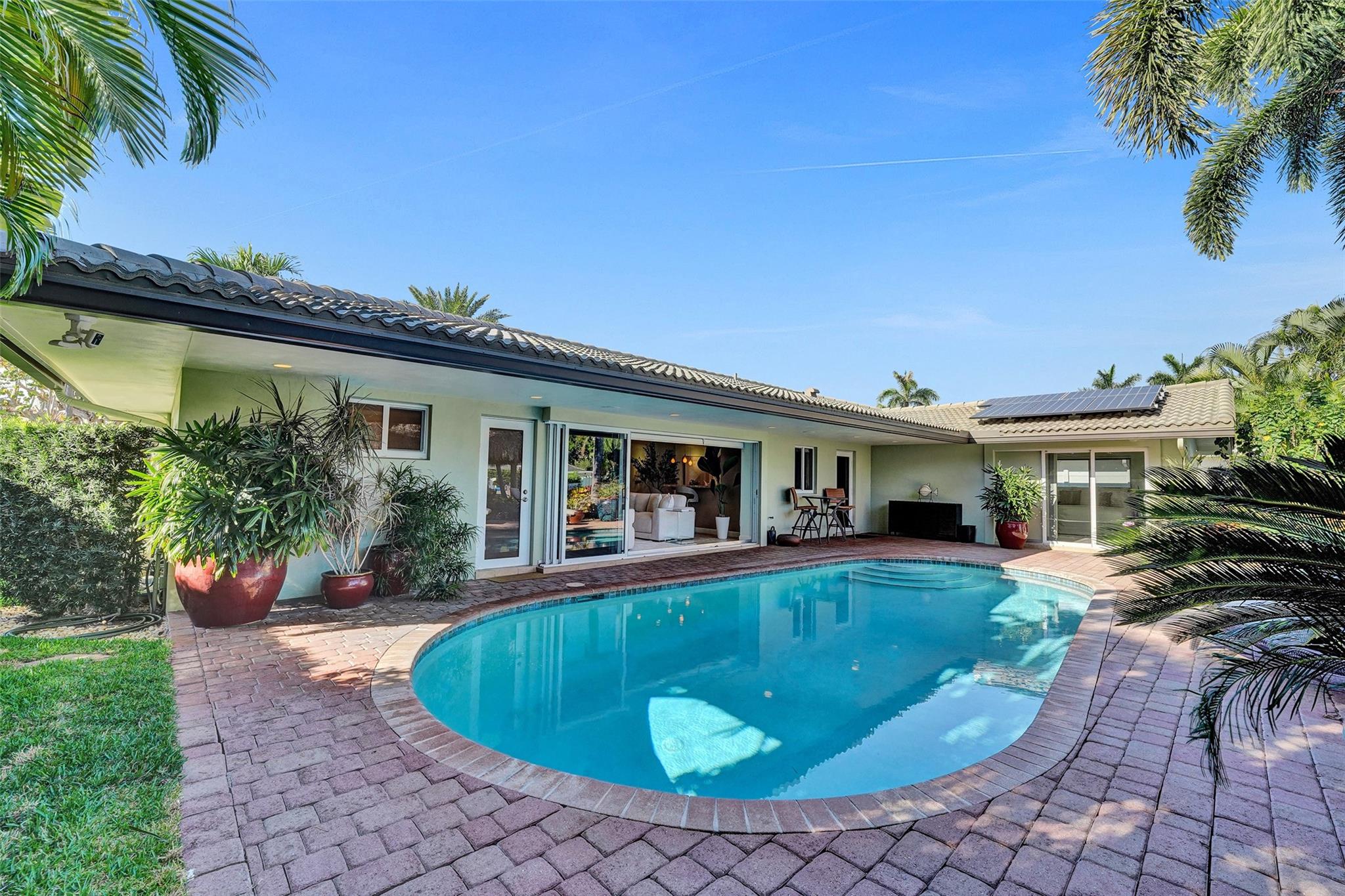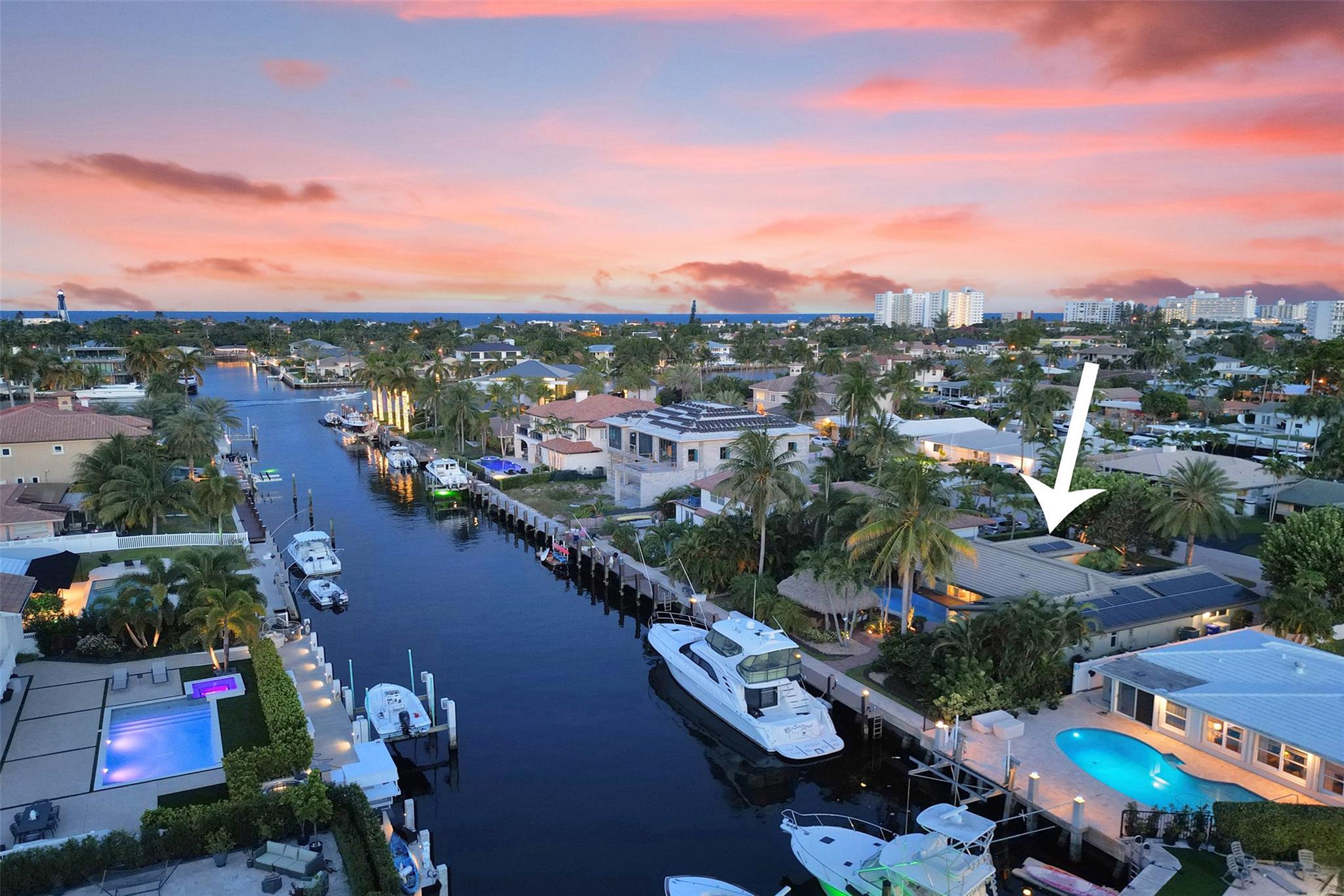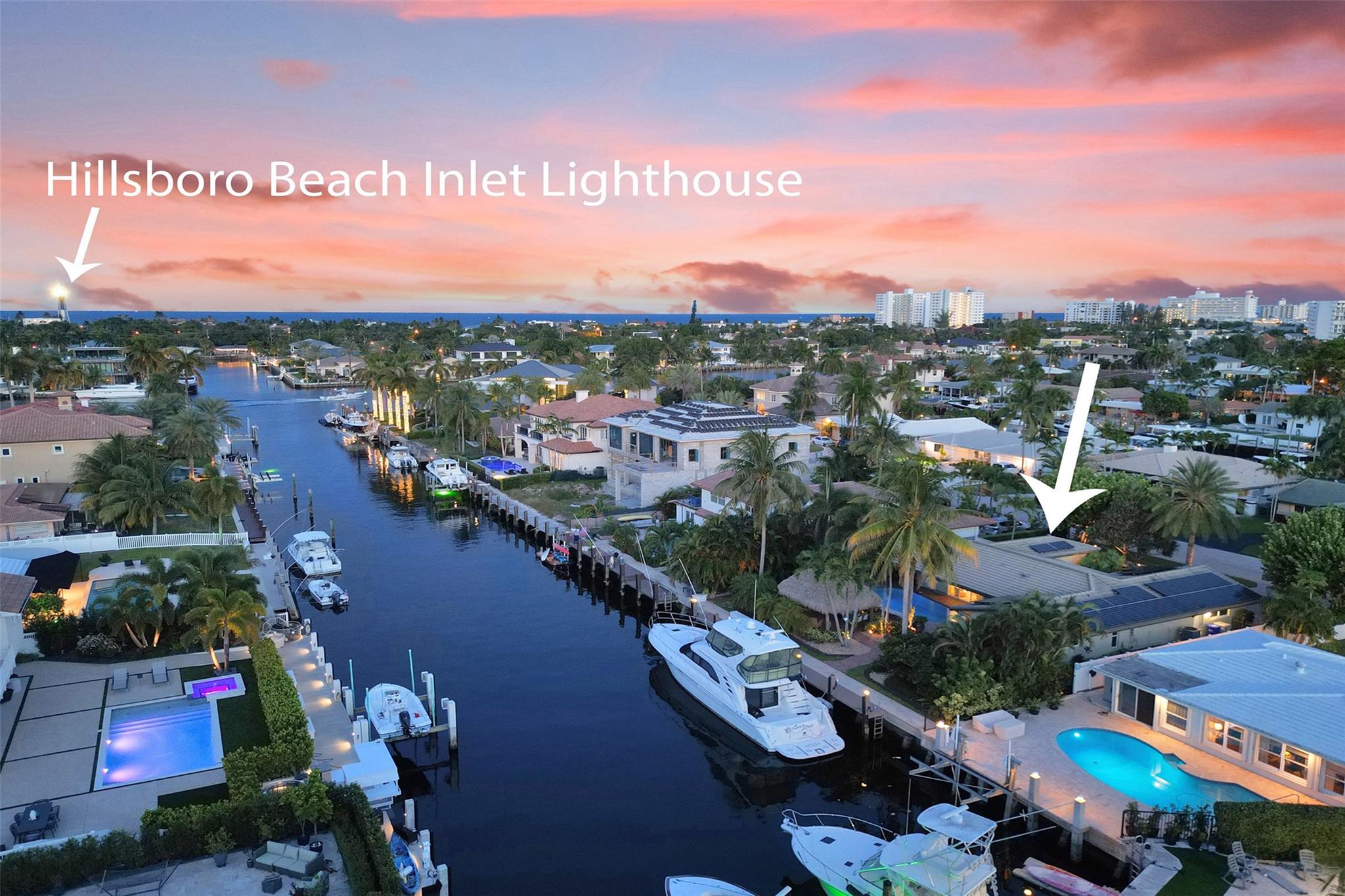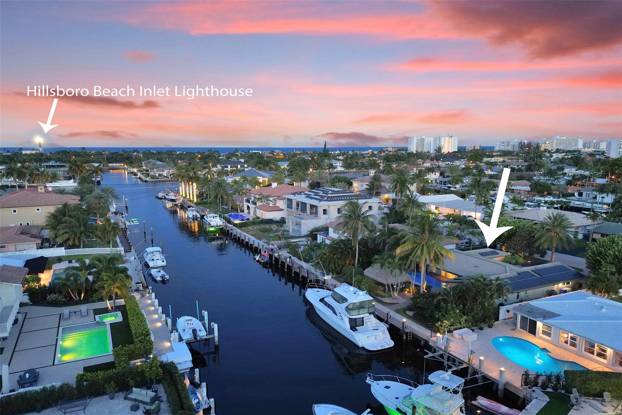 This stunning 2-bed 2-bath w/ office, fully rebuilt in 2008, home on a cul-de-sac offers 80 ft of waterfront & 60 ft of dock, no fixed bridges, & direct access to Intracoastal & ocean—just 6 houses in from the Intracoastal & minutes to the Hillsboro Inlet! Nestled on a spacious 9,600 sq ft lot, this home features a heated pool, an outdoor shower, & a tiki hut—perfect for evening entertaining. Enjoy the added benefits of solar panels & peace of mind w/hurricane impact windows & doors. The property includes a 2-car garage, w/plenty of storage & parking. Boating enthusiasts will appreciate the updated seawall/dock with view of the lighthouse! Income producing dock. A split floor plan provides privacy, & the kitchen boasts Bosch appliances w/ a gas range. Natural Travertine Floors thru out.