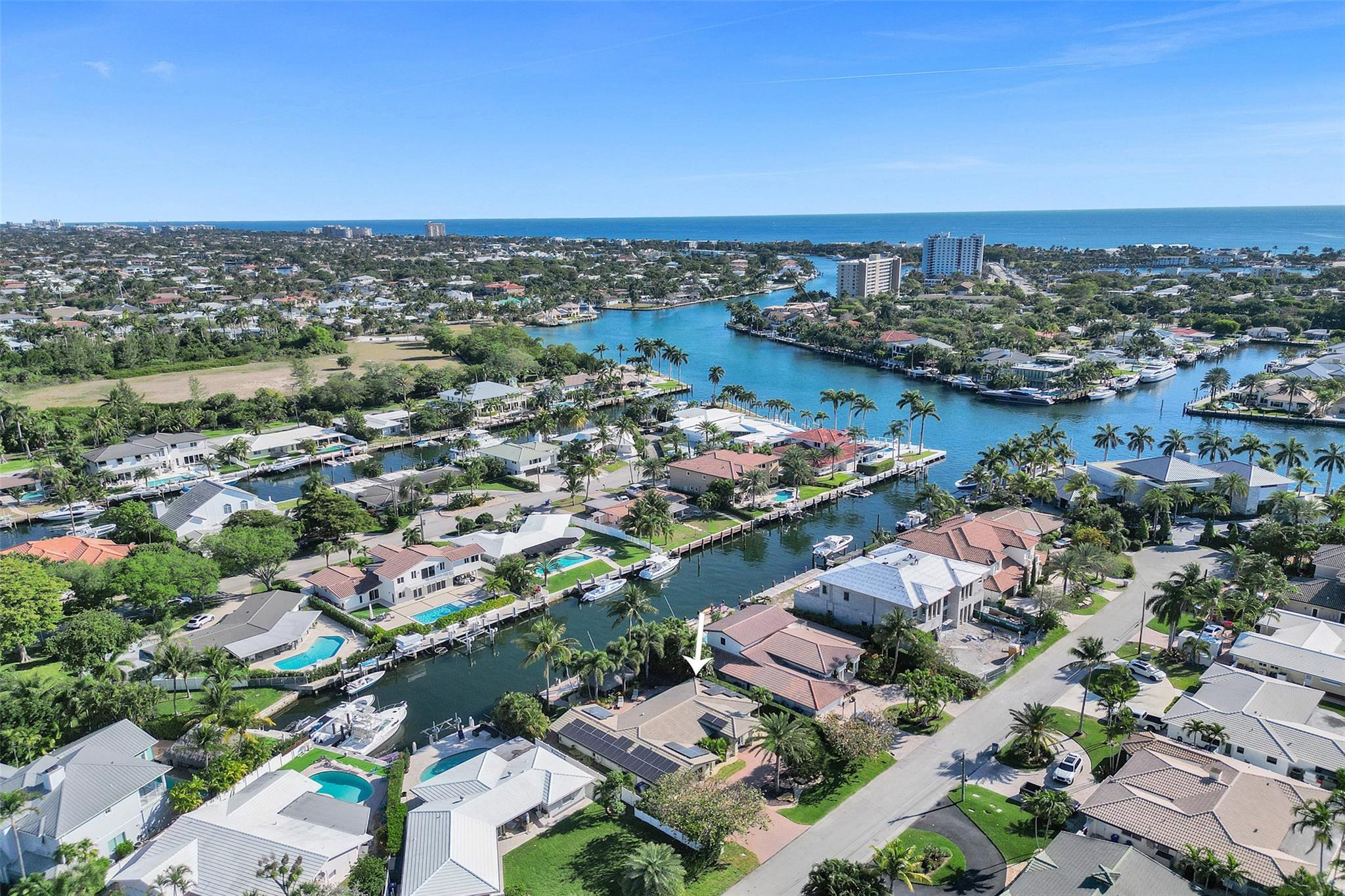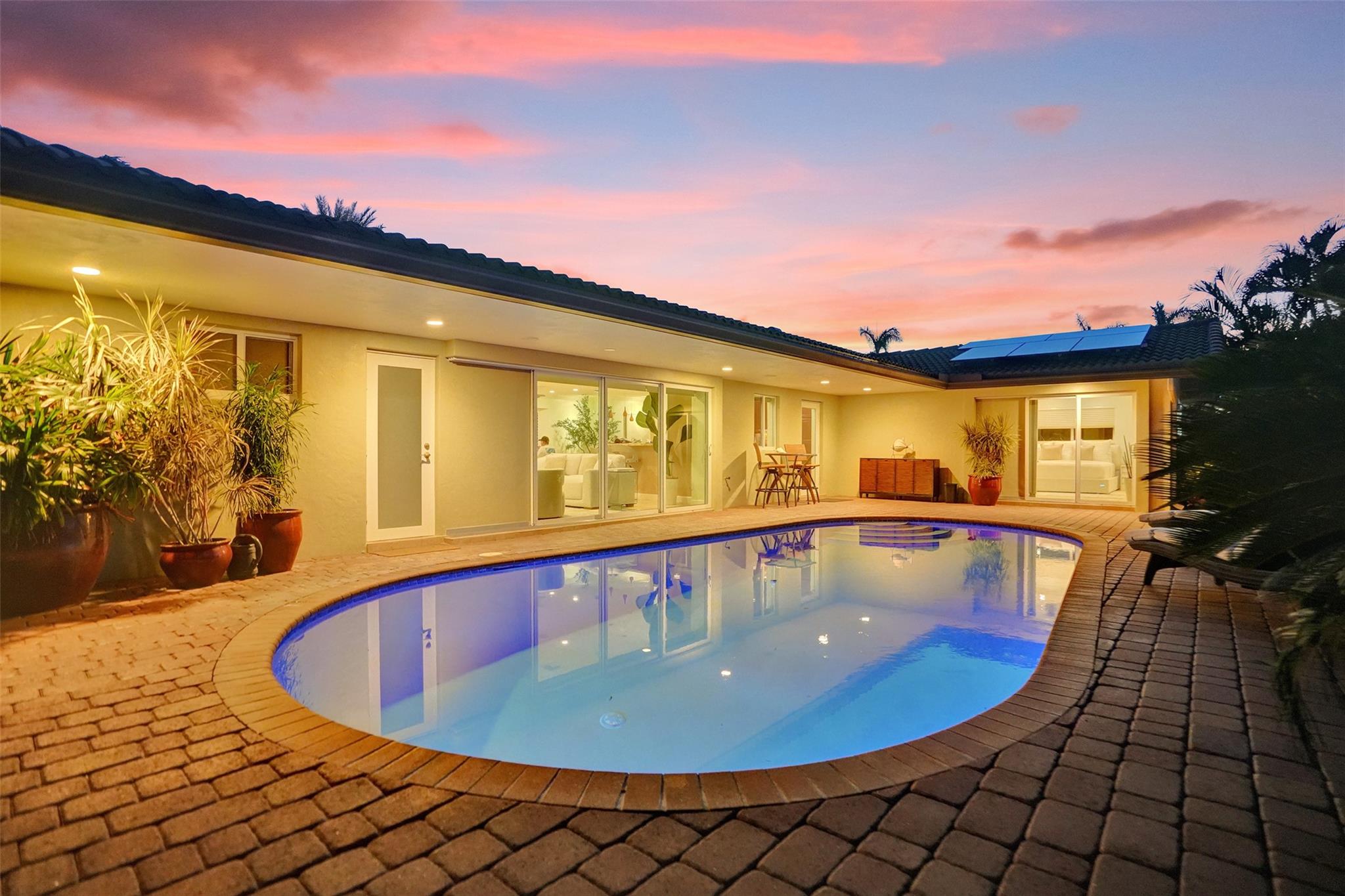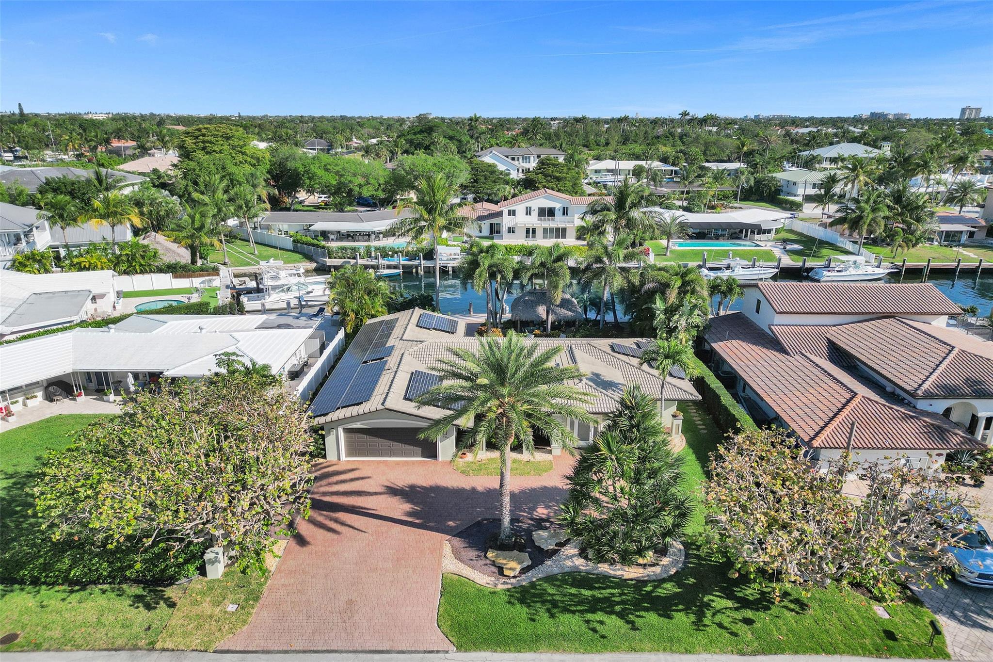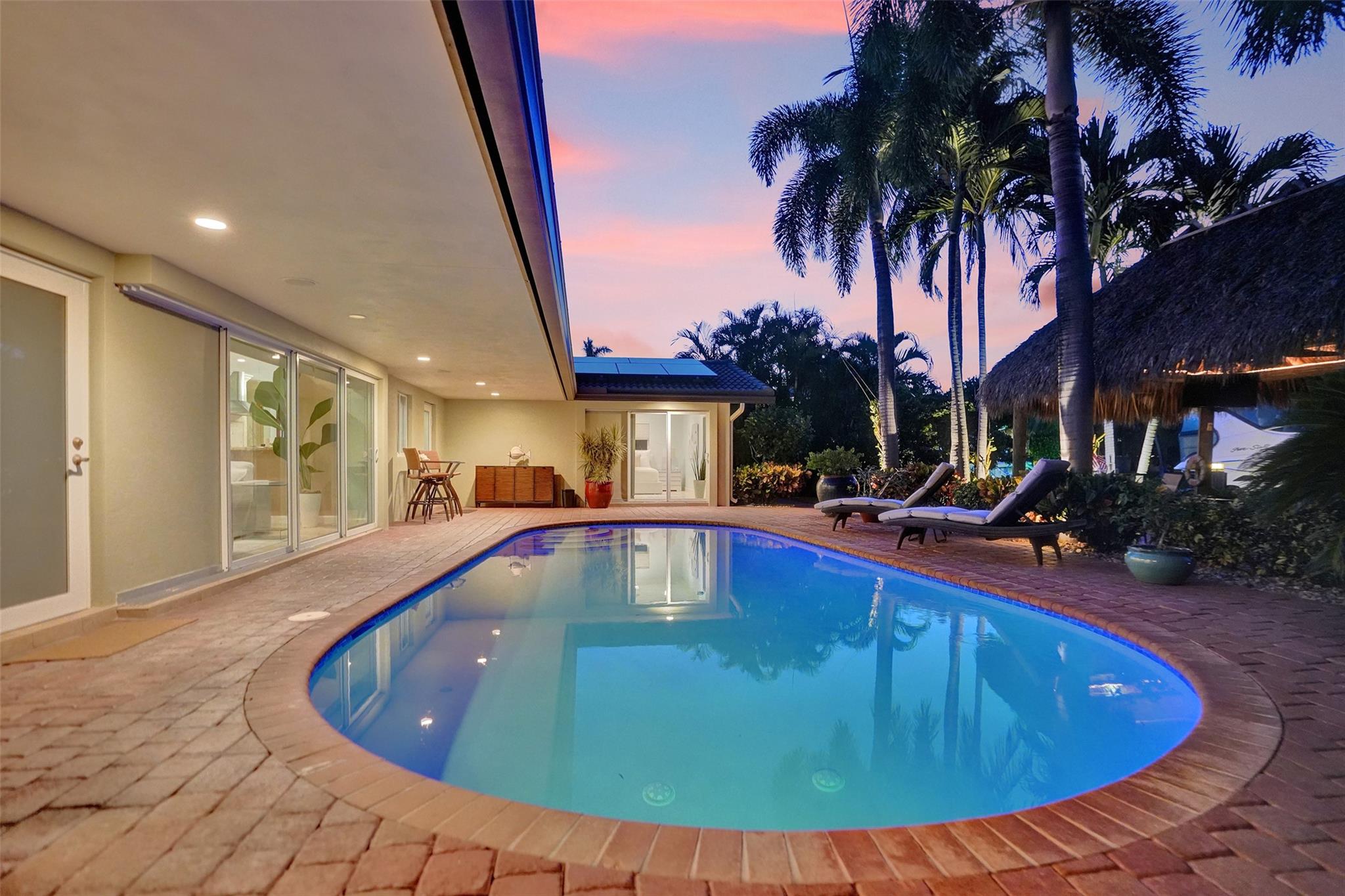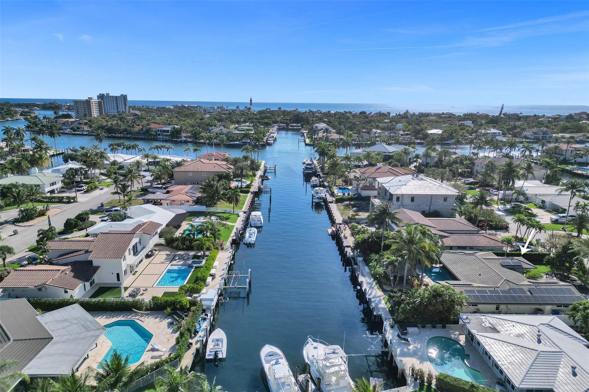 This stunning 2-bed 2-bath w/ office, fully rebuilt in 2008, home on a cul-de-sac offers 80 ft of waterfront & 60 ft of dock, no fixed bridges, & direct access to Intracoastal & ocean—just 6 houses in from the Intracoastal & minutes to the Hillsboro Inlet! Nestled on a spacious 9,600 sq ft lot, this home features a heated pool, an outdoor shower, & a tiki hut—perfect for evening entertaining. Enjoy the added benefits of solar panels & peace of mind w/hurricane impact windows & doors. The property includes a 2-car garage, w/plenty of storage & parking. Boating enthusiasts will appreciate the updated seawall/dock with view of the lighthouse! Income producing dock. A split floor plan provides privacy, & the kitchen boasts Bosch appliances w/ a gas range. Natural Travertine Floors thru out.