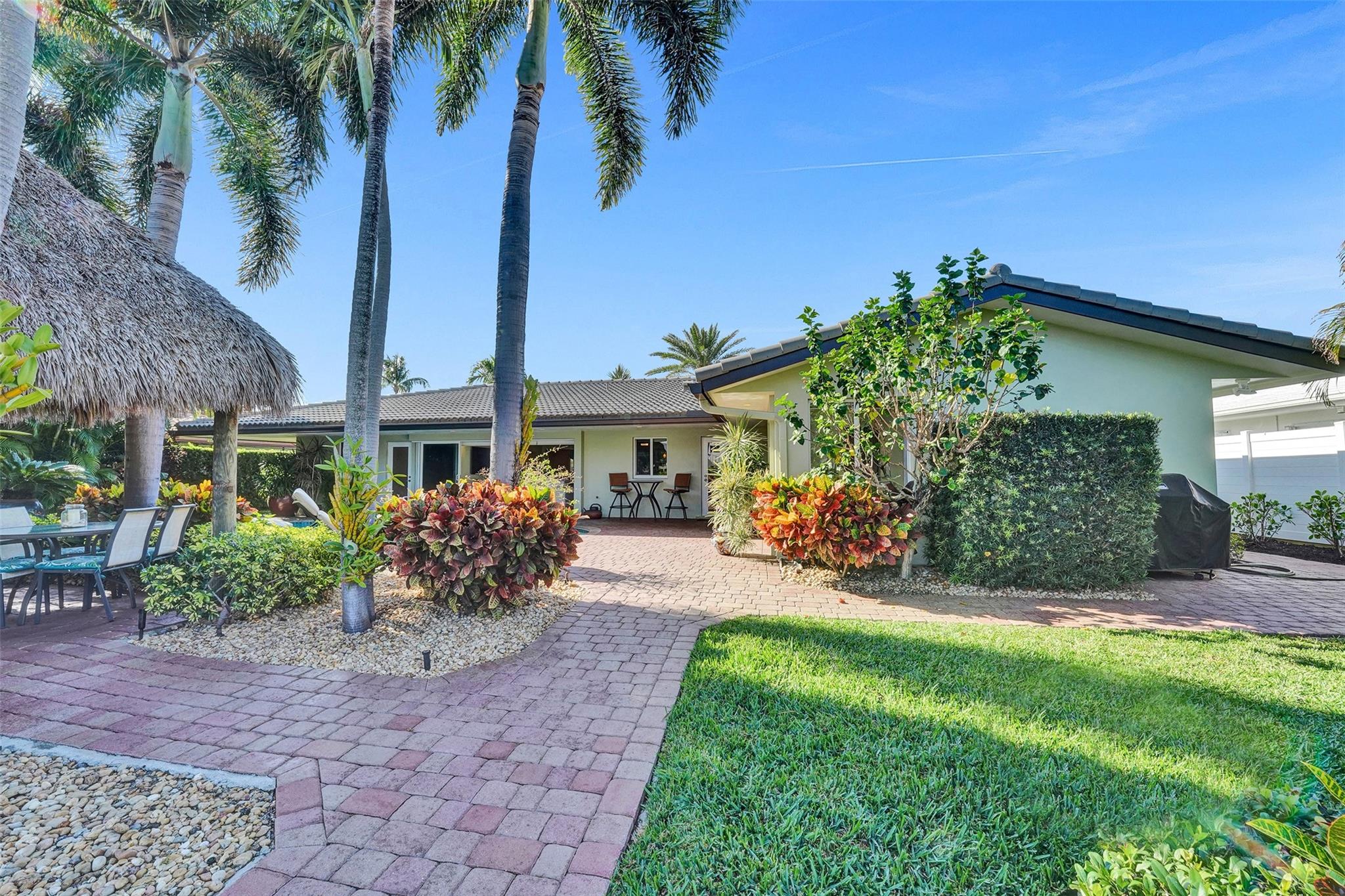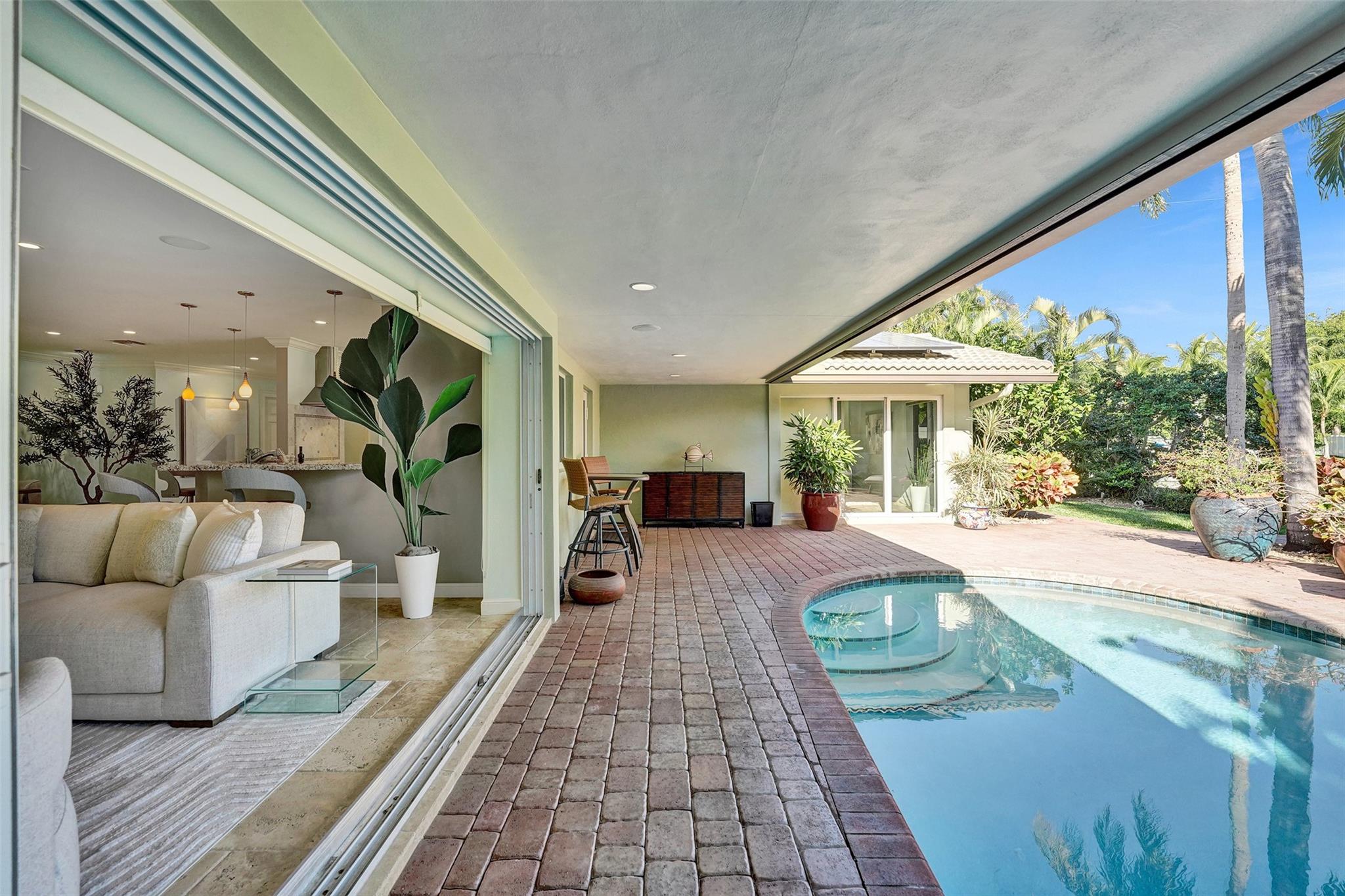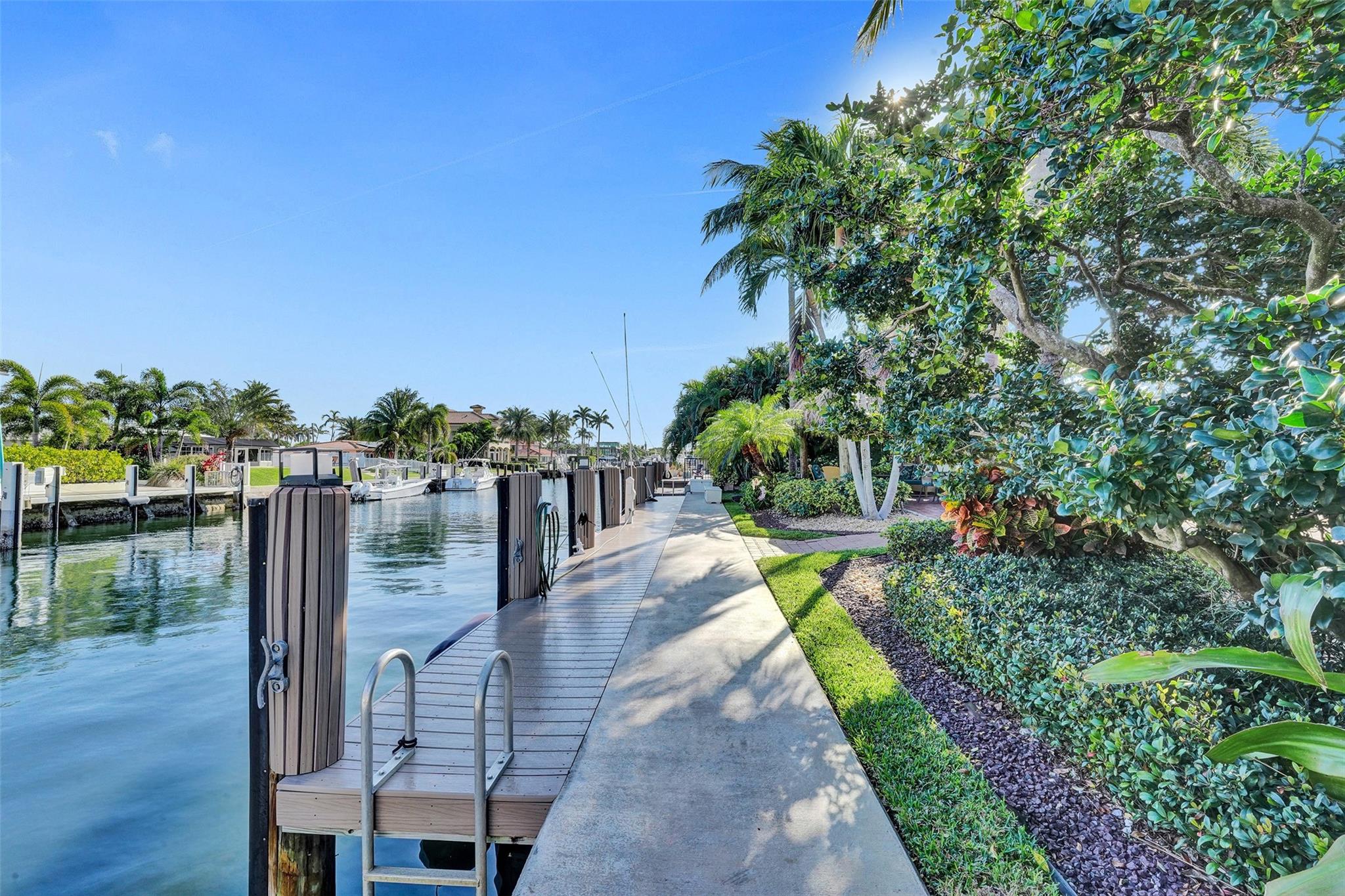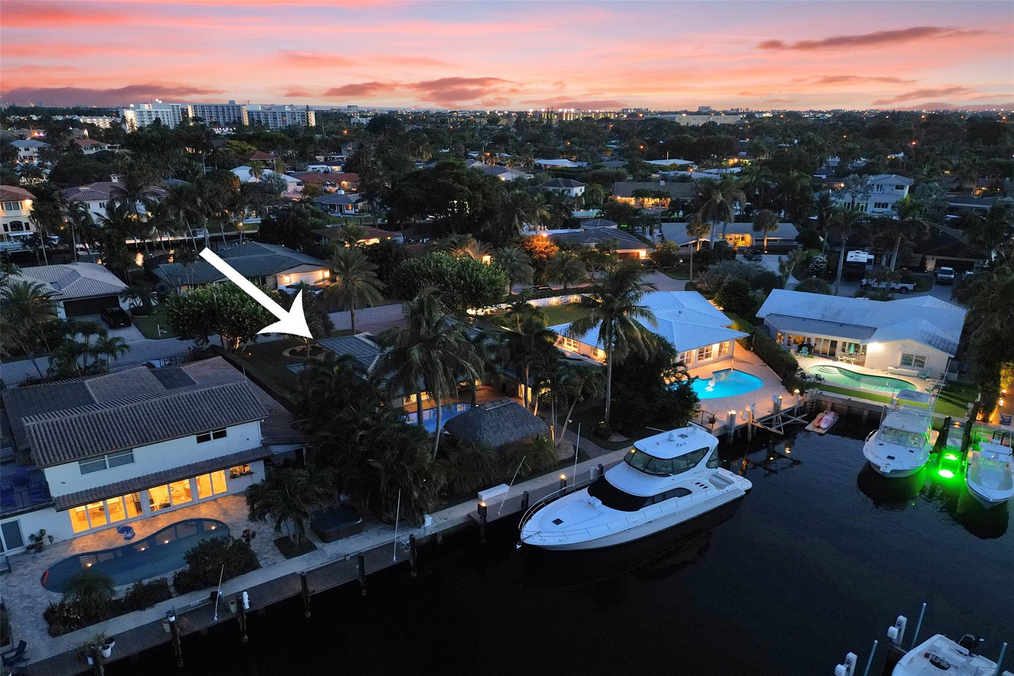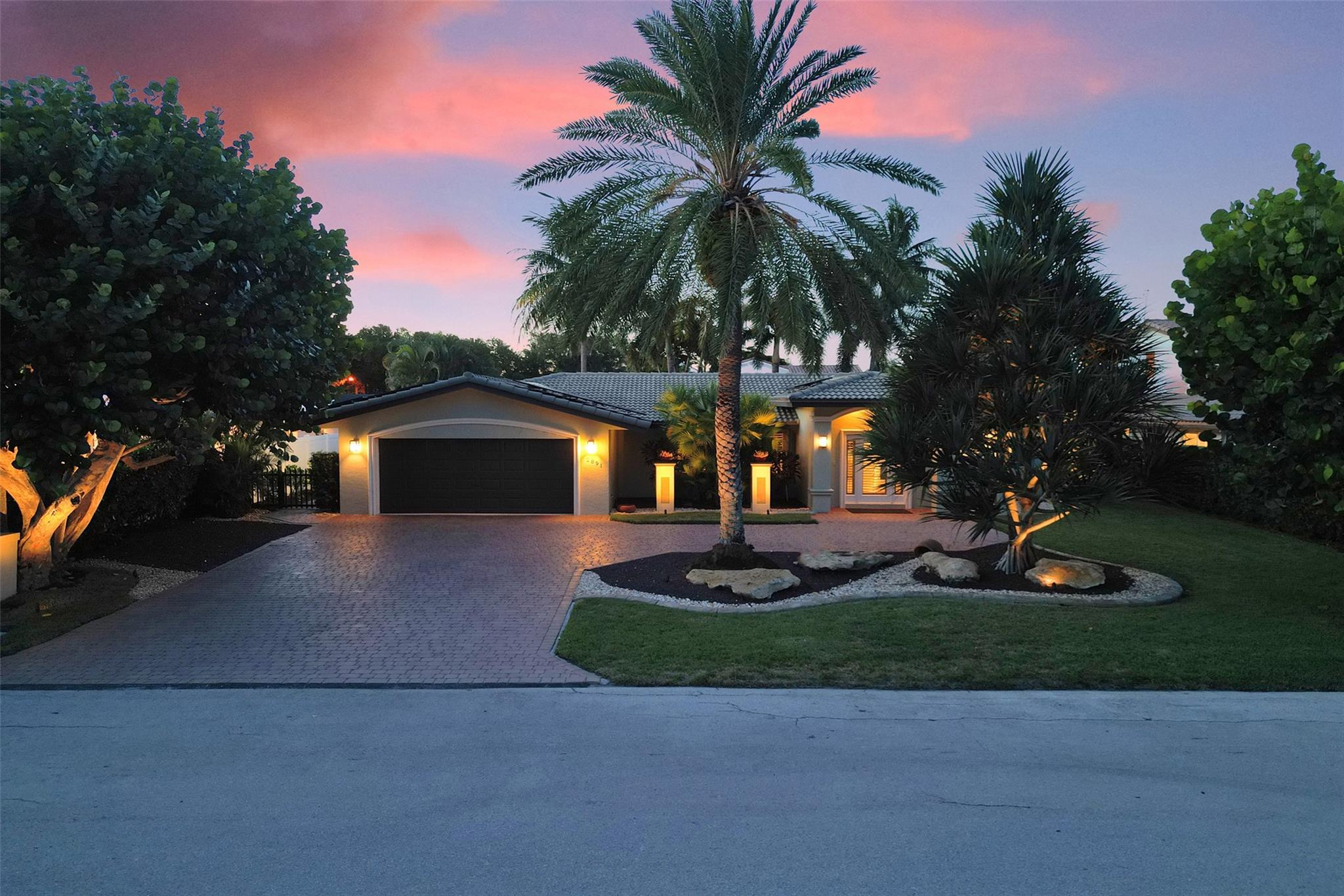 This stunning 2-bed 2-bath w/ office, fully rebuilt in 2008, home on a cul-de-sac offers 80 ft of waterfront & 60 ft of dock, no fixed bridges, & direct access to Intracoastal & ocean—just 6 houses in from the Intracoastal & minutes to the Hillsboro Inlet! Nestled on a spacious 9,600 sq ft lot, this home features a heated pool, an outdoor shower, & a tiki hut—perfect for evening entertaining. Enjoy the added benefits of solar panels & peace of mind w/hurricane impact windows & doors. The property includes a 2-car garage, w/plenty of storage & parking. Boating enthusiasts will appreciate the updated seawall/dock with view of the lighthouse! Income producing dock. A split floor plan provides privacy, & the kitchen boasts Bosch appliances w/ a gas range. Natural Travertine Floors thru out.