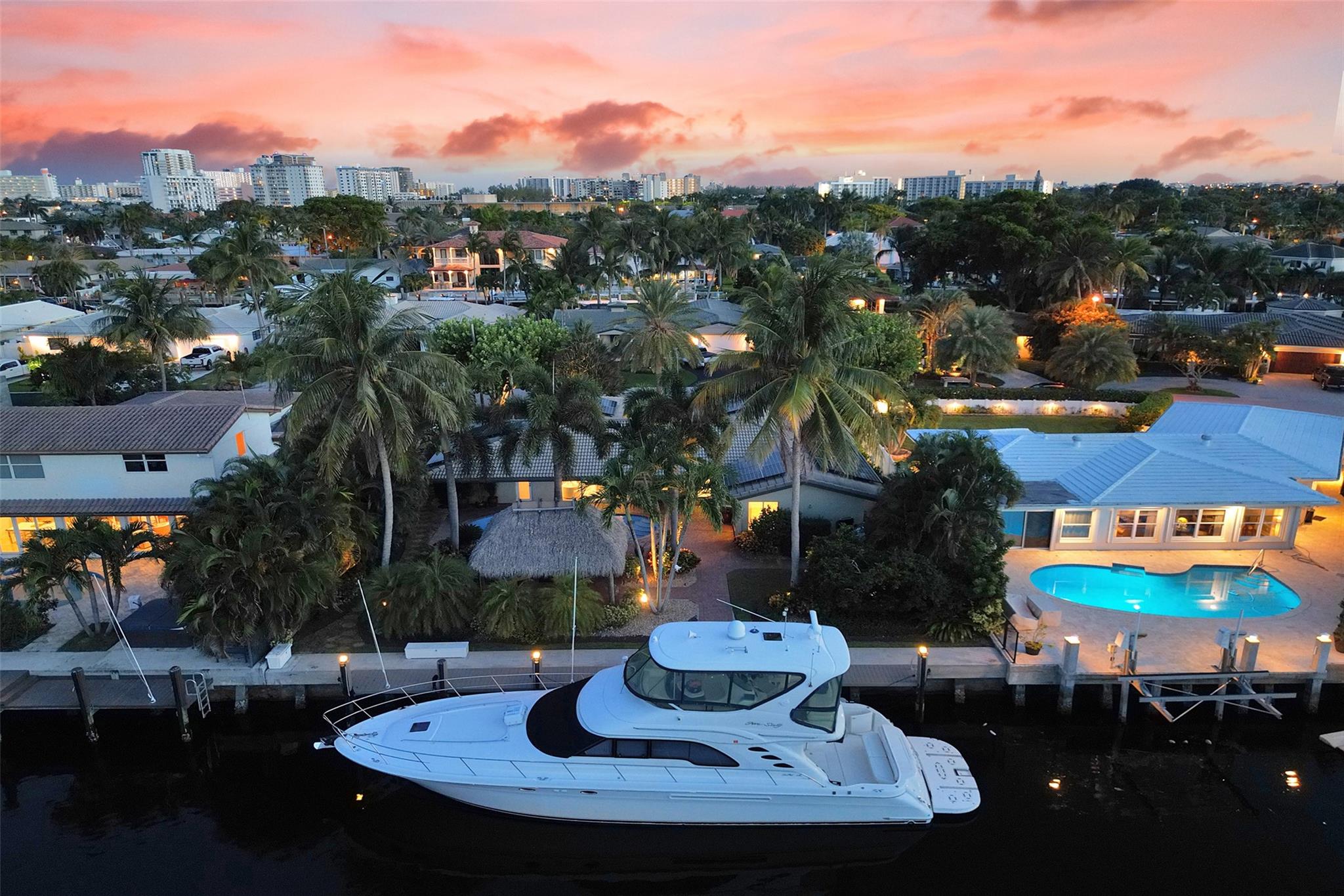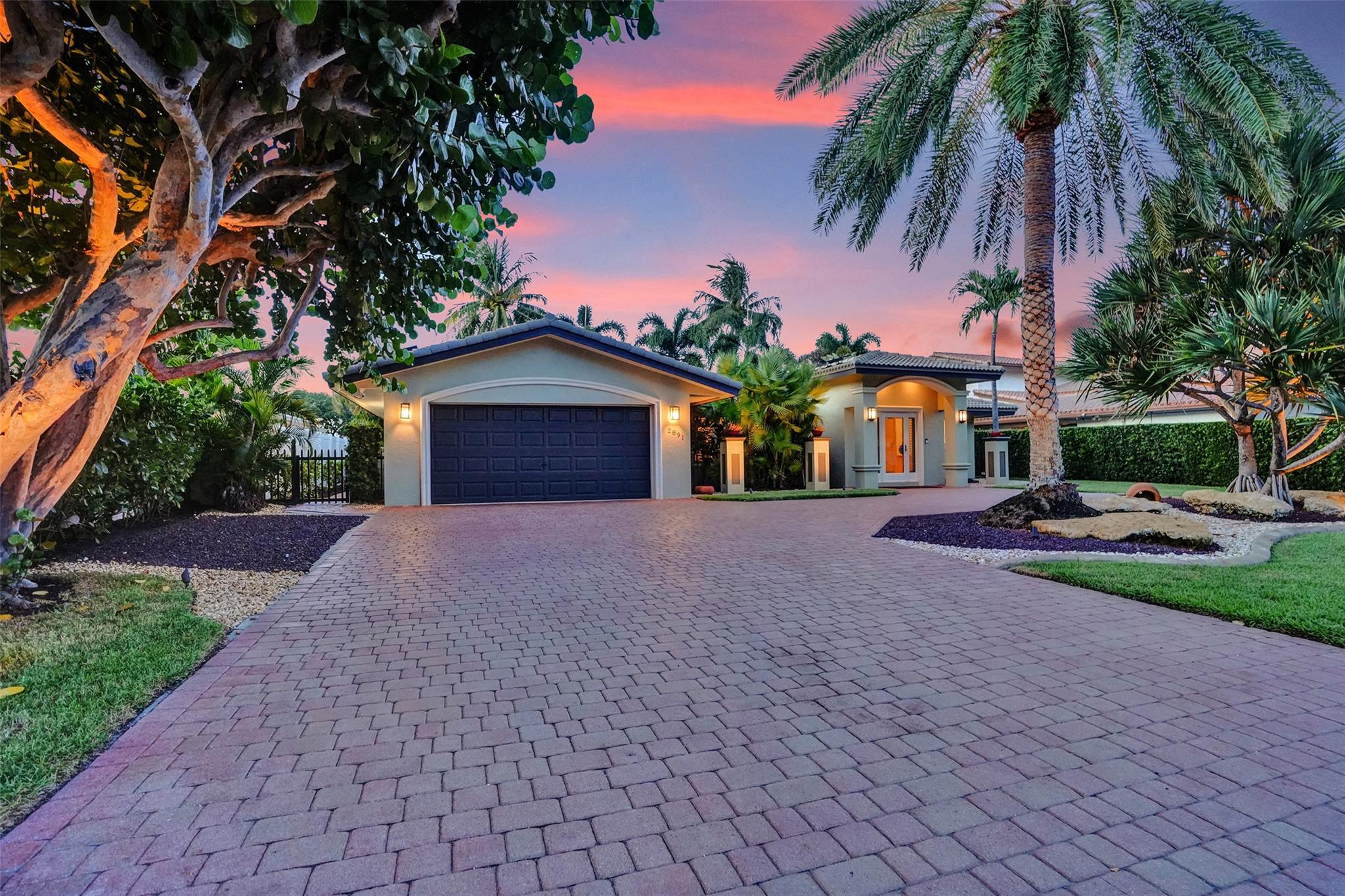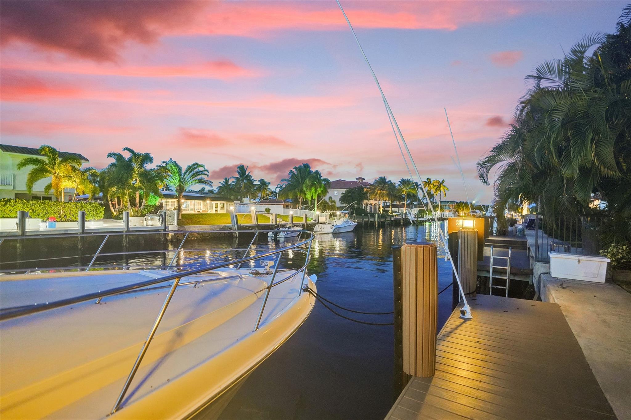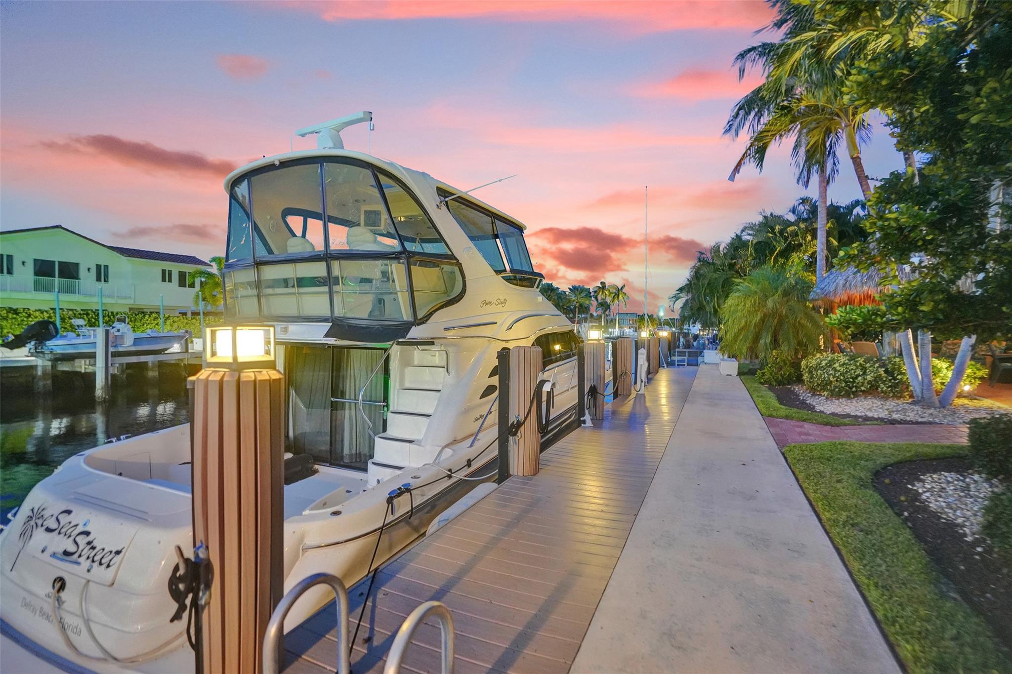 This stunning 2-bed 2-bath w/ office, fully rebuilt in 2008, home on a cul-de-sac offers 80 ft of waterfront & 60 ft of dock, no fixed bridges, & direct access to Intracoastal & ocean—just 6 houses in from the Intracoastal & minutes to the Hillsboro Inlet! Nestled on a spacious 9,600 sq ft lot, this home features a heated pool, an outdoor shower, & a tiki hut—perfect for evening entertaining. Enjoy the added benefits of solar panels & peace of mind w/hurricane impact windows & doors. The property includes a 2-car garage, w/plenty of storage & parking. Boating enthusiasts will appreciate the updated seawall/dock with view of the lighthouse! Income producing dock. A split floor plan provides privacy, & the kitchen boasts Bosch appliances w/ a gas range. Natural Travertine Floors thru out.