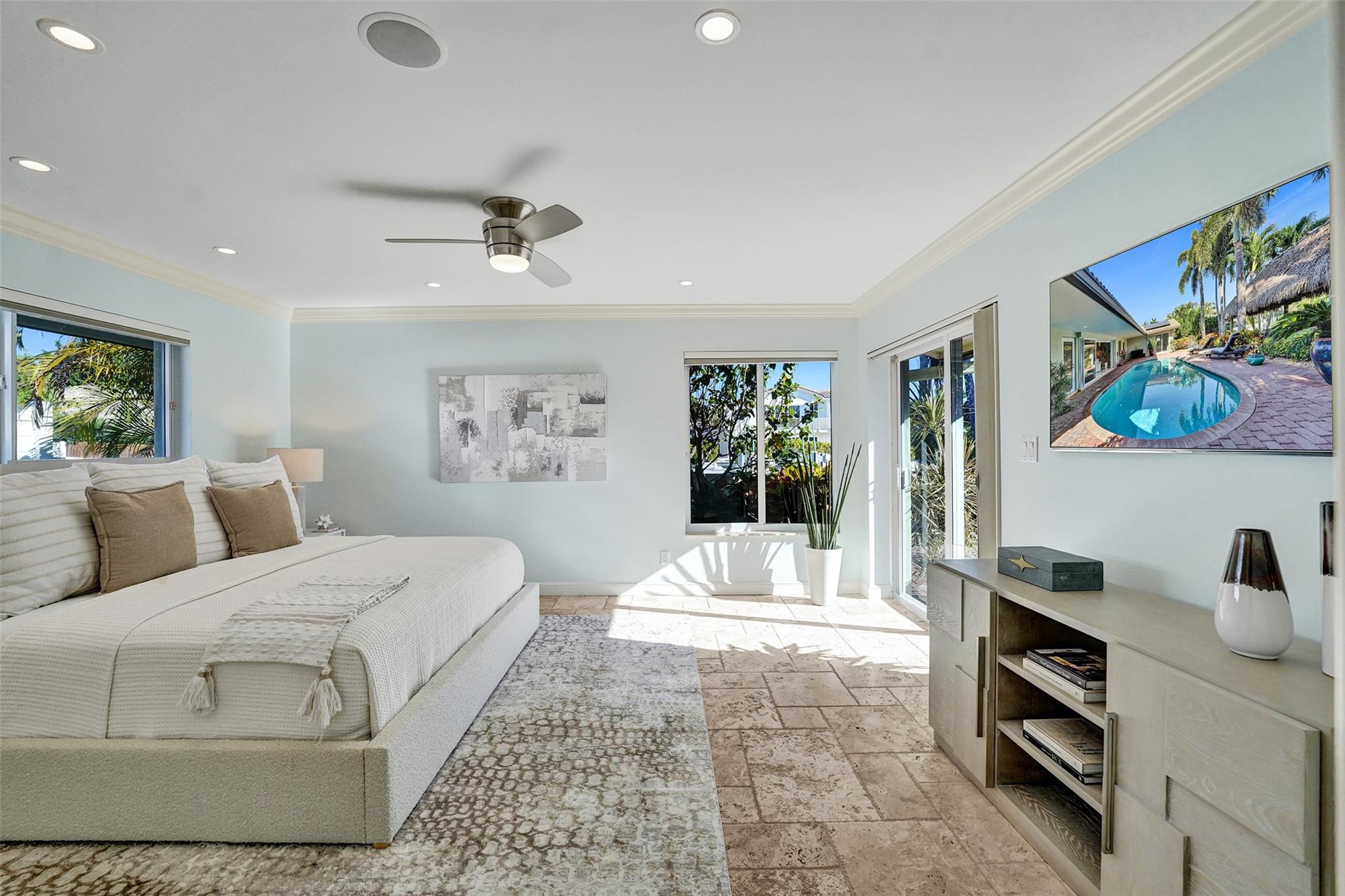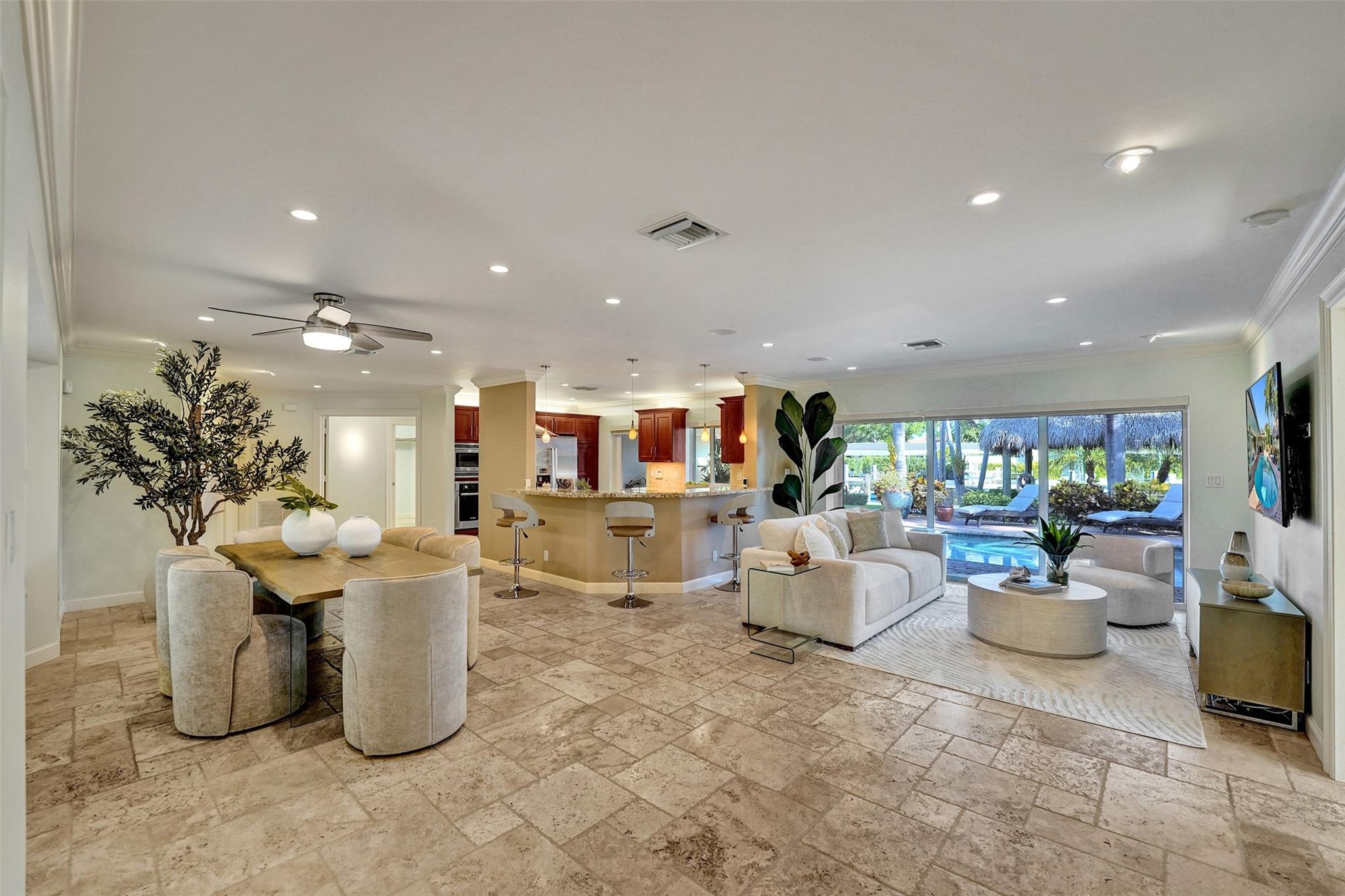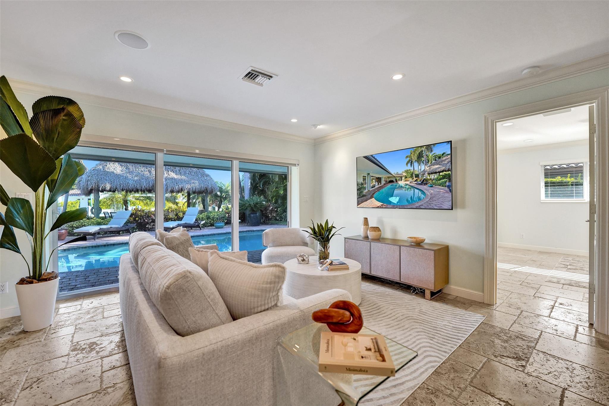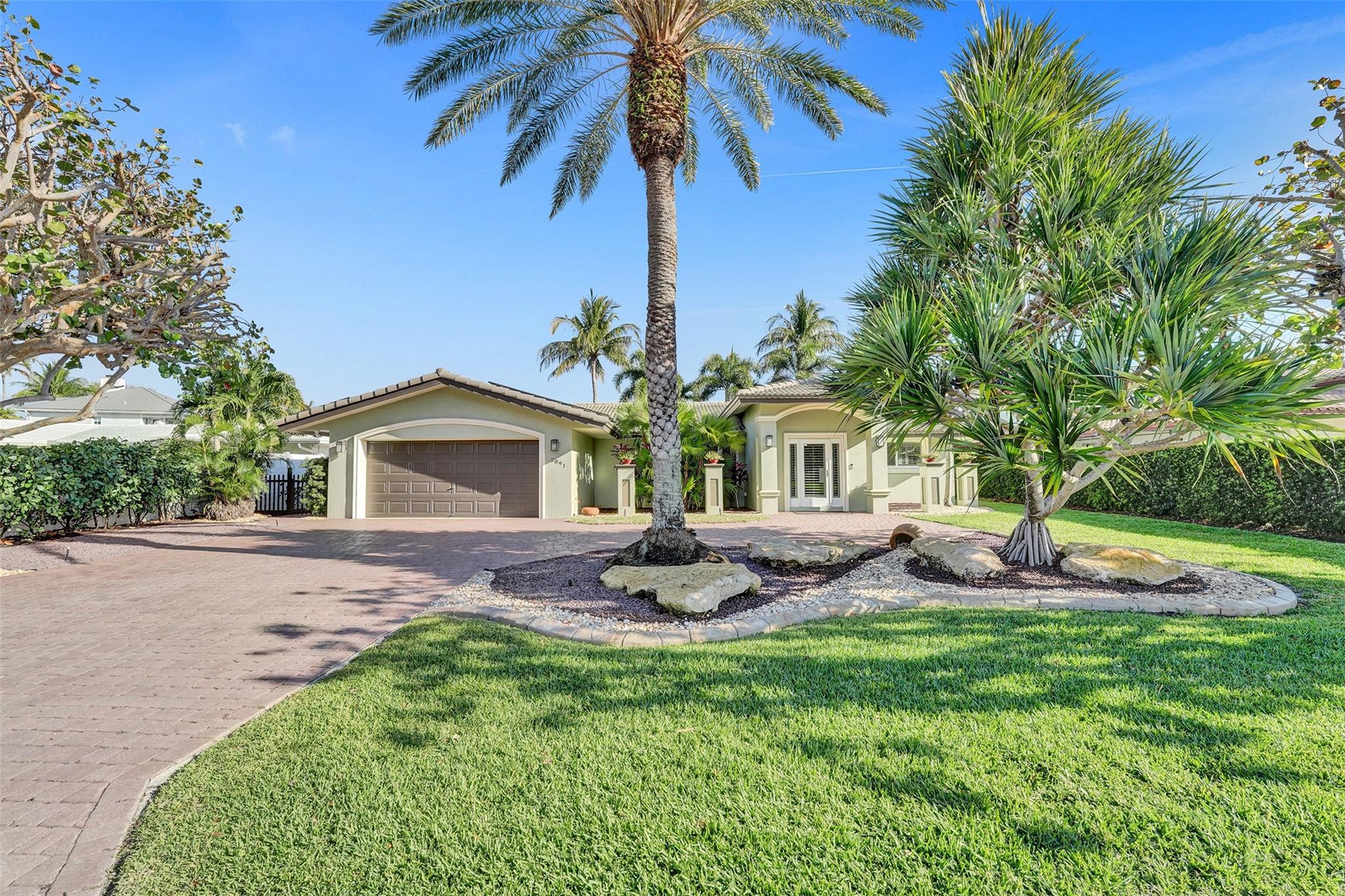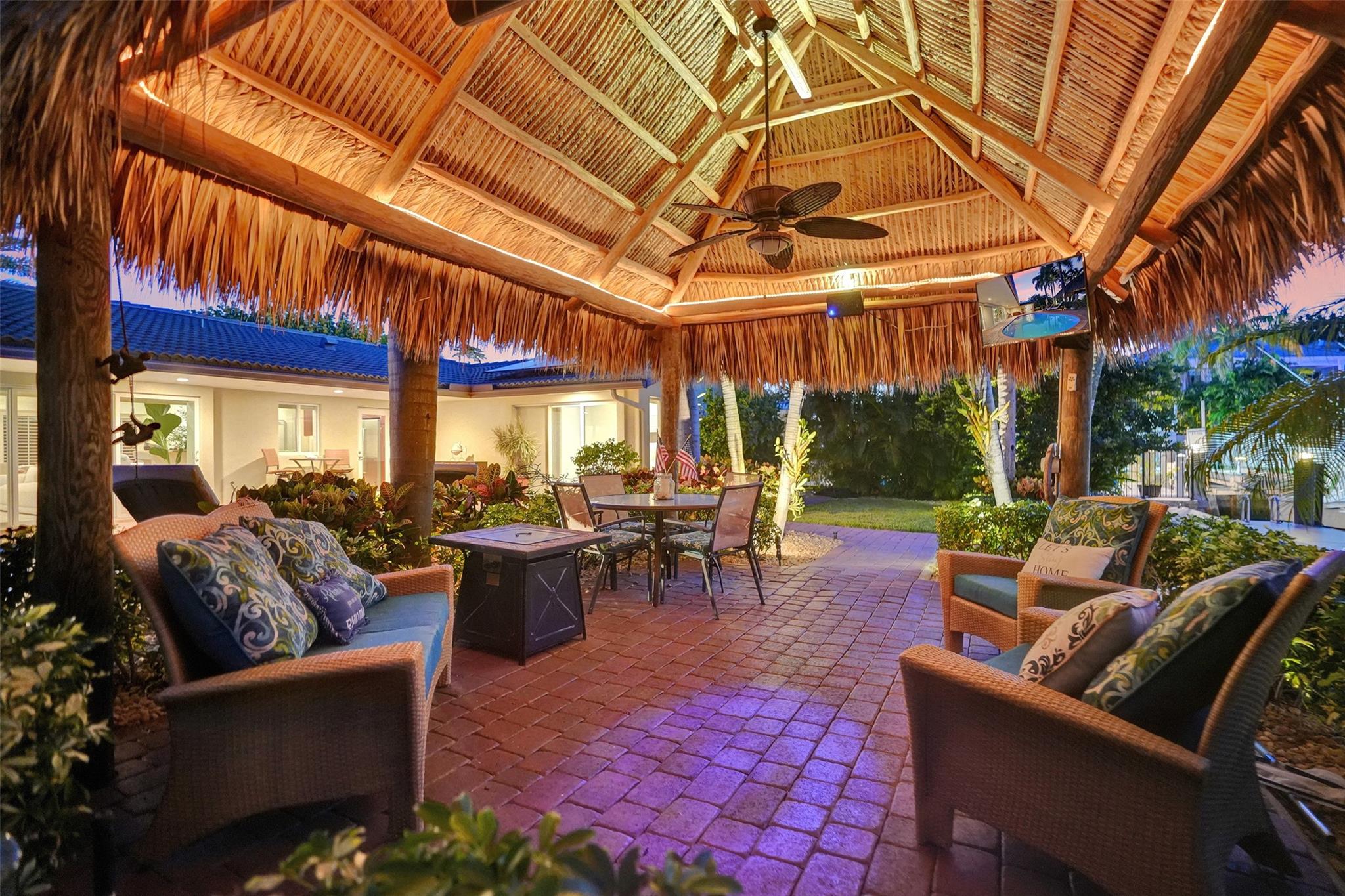 This stunning 2-bed 2-bath w/ office, fully rebuilt in 2008, home on a cul-de-sac offers 80 ft of waterfront & 60 ft of dock, no fixed bridges, & direct access to Intracoastal & ocean—just 6 houses in from the Intracoastal & minutes to the Hillsboro Inlet! Nestled on a spacious 9,600 sq ft lot, this home features a heated pool, an outdoor shower, & a tiki hut—perfect for evening entertaining. Enjoy the added benefits of solar panels & peace of mind w/hurricane impact windows & doors. The property includes a 2-car garage, w/plenty of storage & parking. Boating enthusiasts will appreciate the updated seawall/dock with view of the lighthouse! Income producing dock. A split floor plan provides privacy, & the kitchen boasts Bosch appliances w/ a gas range. Natural Travertine Floors thru out.