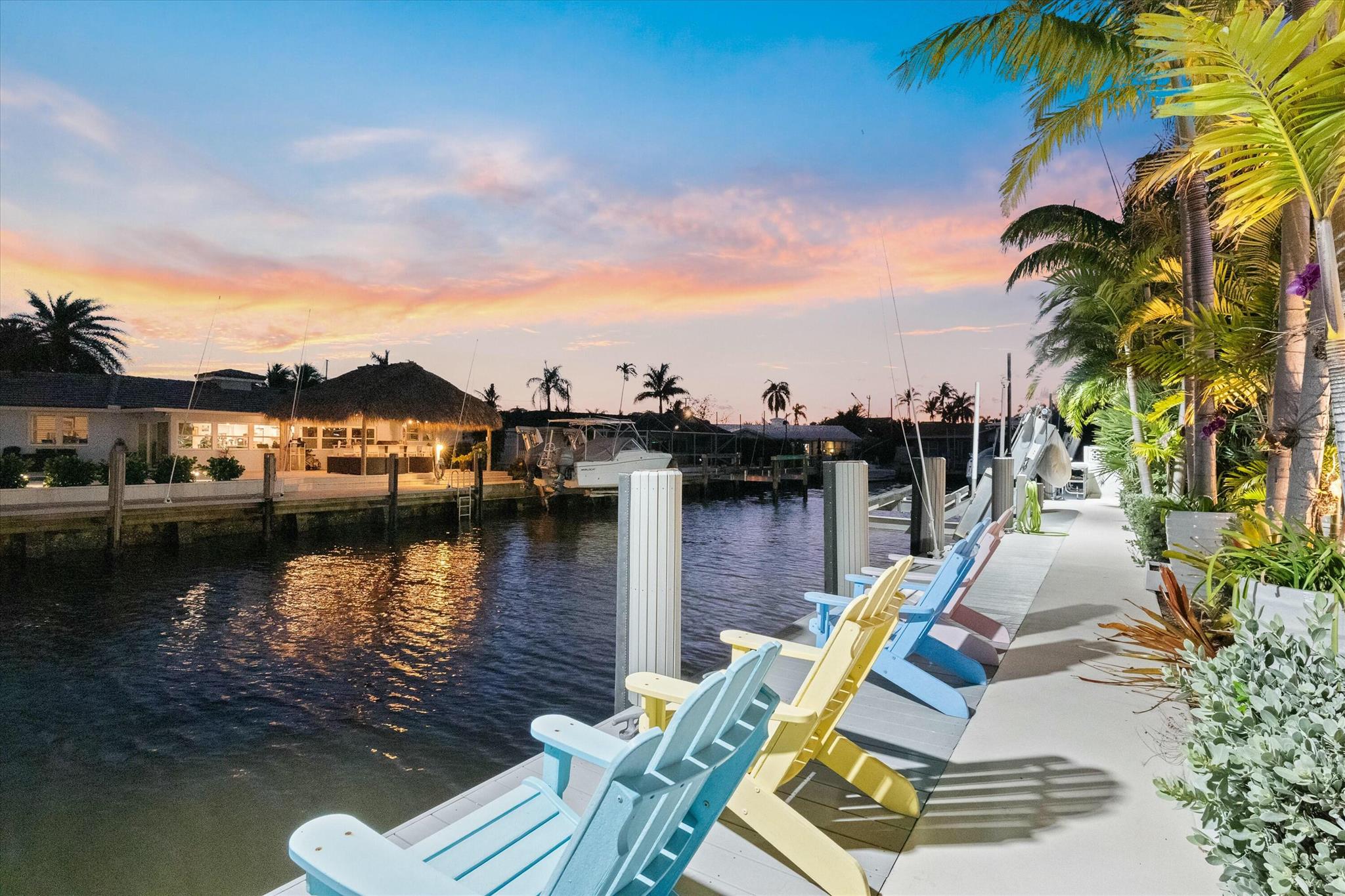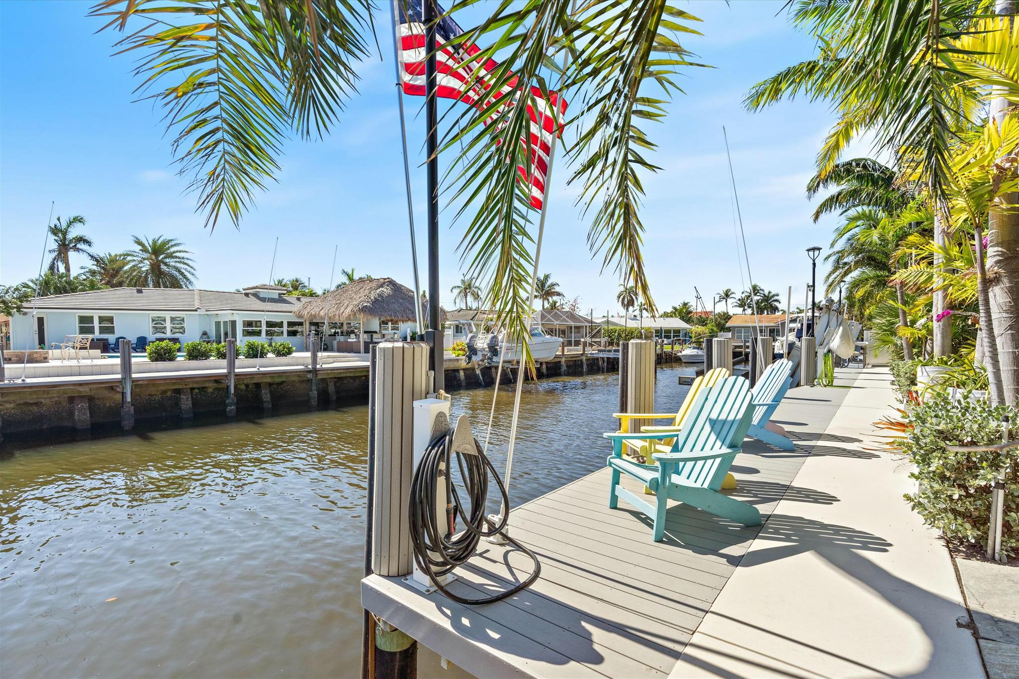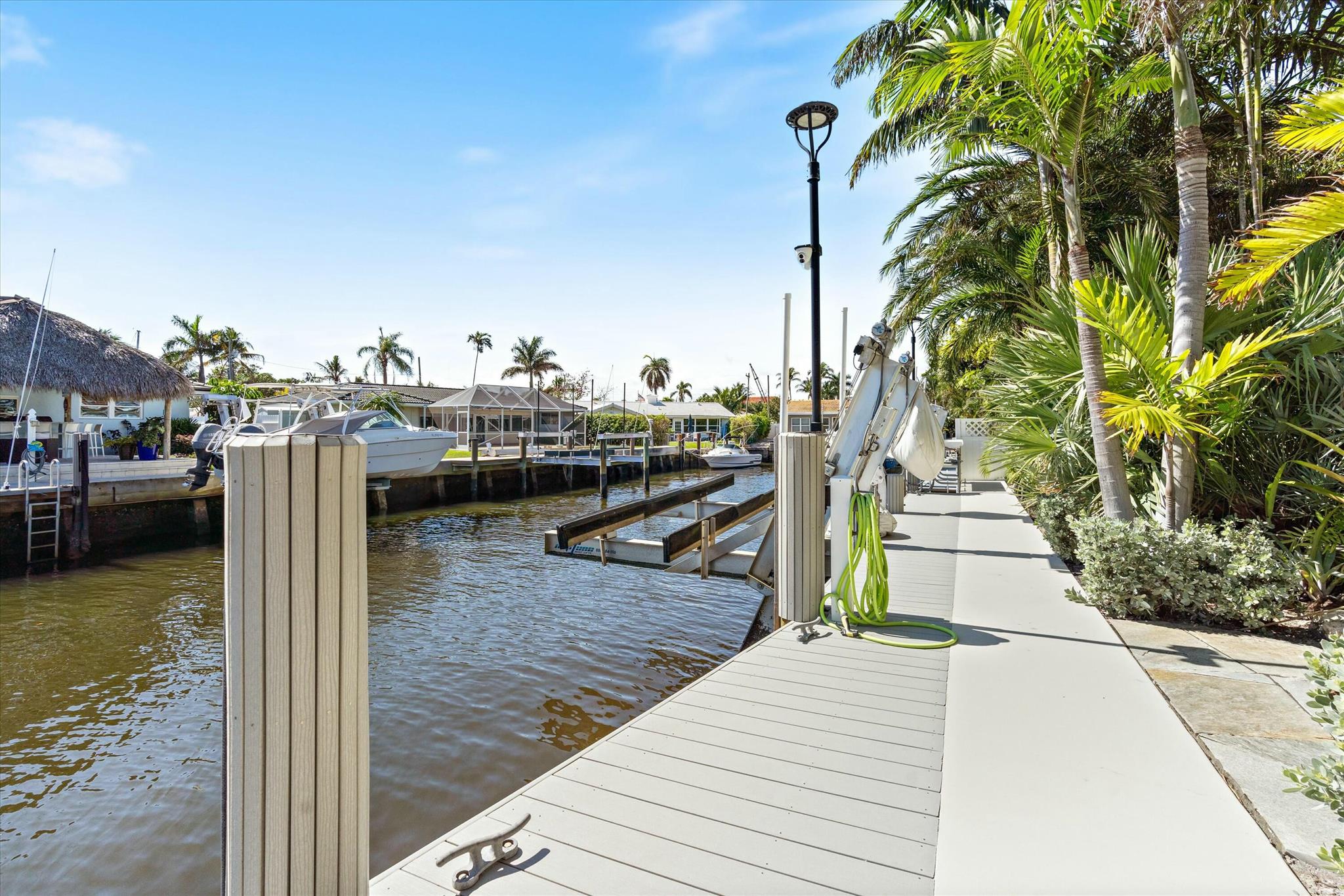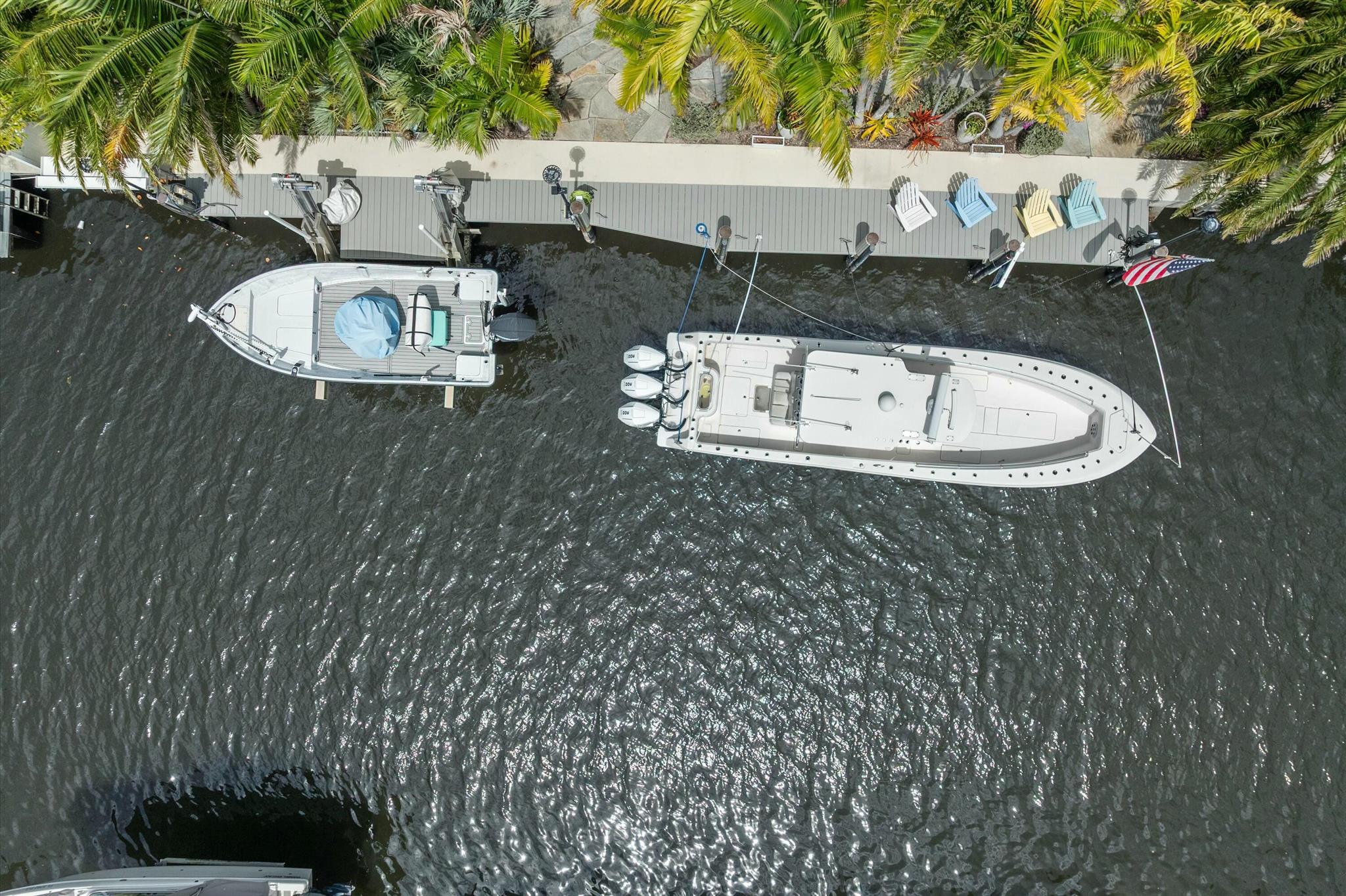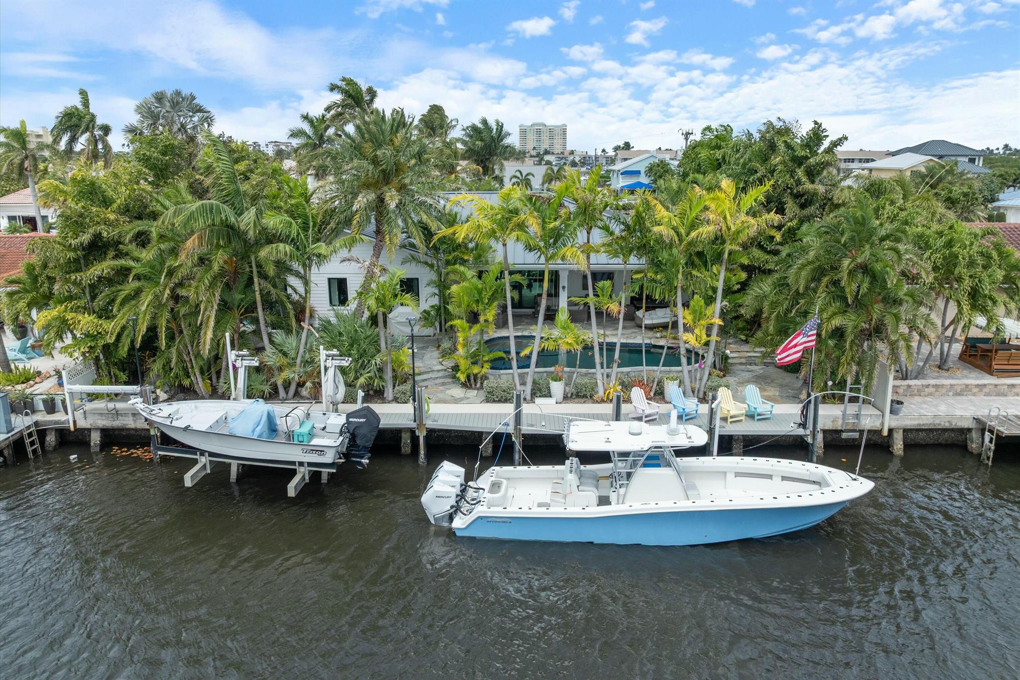 This exceptional waterfront residence has been completely rebuilt from the ground up, with only one original garage wall retained to meet city remodel regulations. Elevated to enhance views and offer added storm protection, the home, back patio, and dock sit on a raised lot that maximizes both lifestyle and longevity. Boating enthusiasts will appreciate the 90 feet of prime waterfrontage, complete with a private dock, 20,000-pound boat lift, wet slip for vessels up to 50 feet, water and electric hookups, and a built-in filet station. With direct ocean access and no fixed bridges, the inlet is just two miles away–making this a rare opportunity to own a true boater’s paradise.The home is available fully turnkey, complete with fine furnishings and all the daily essentials. It is truly