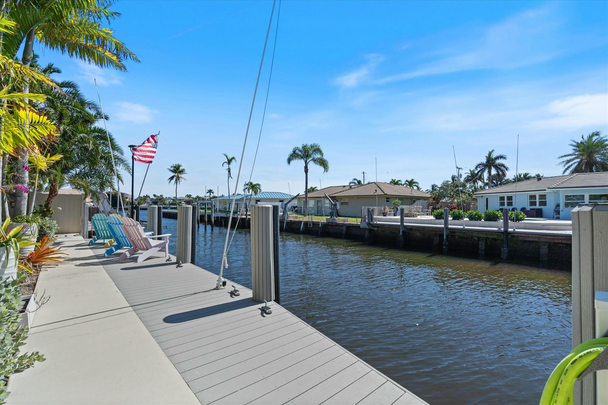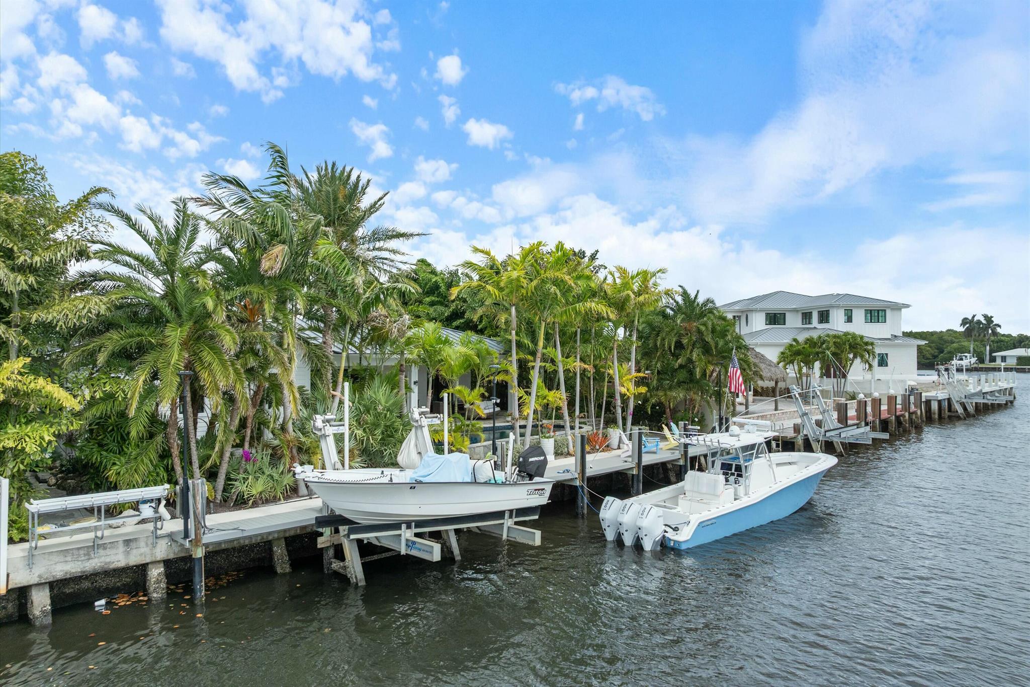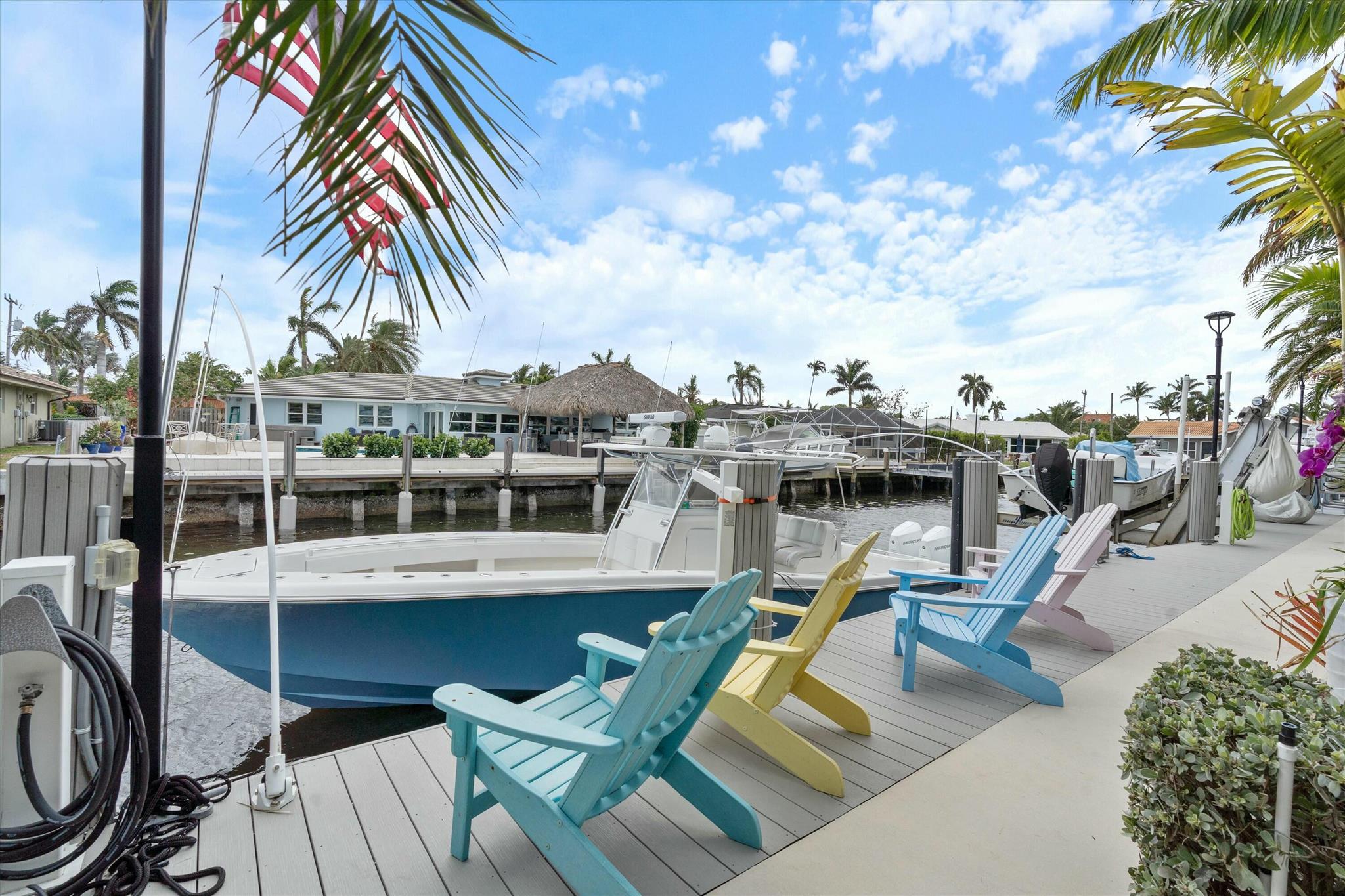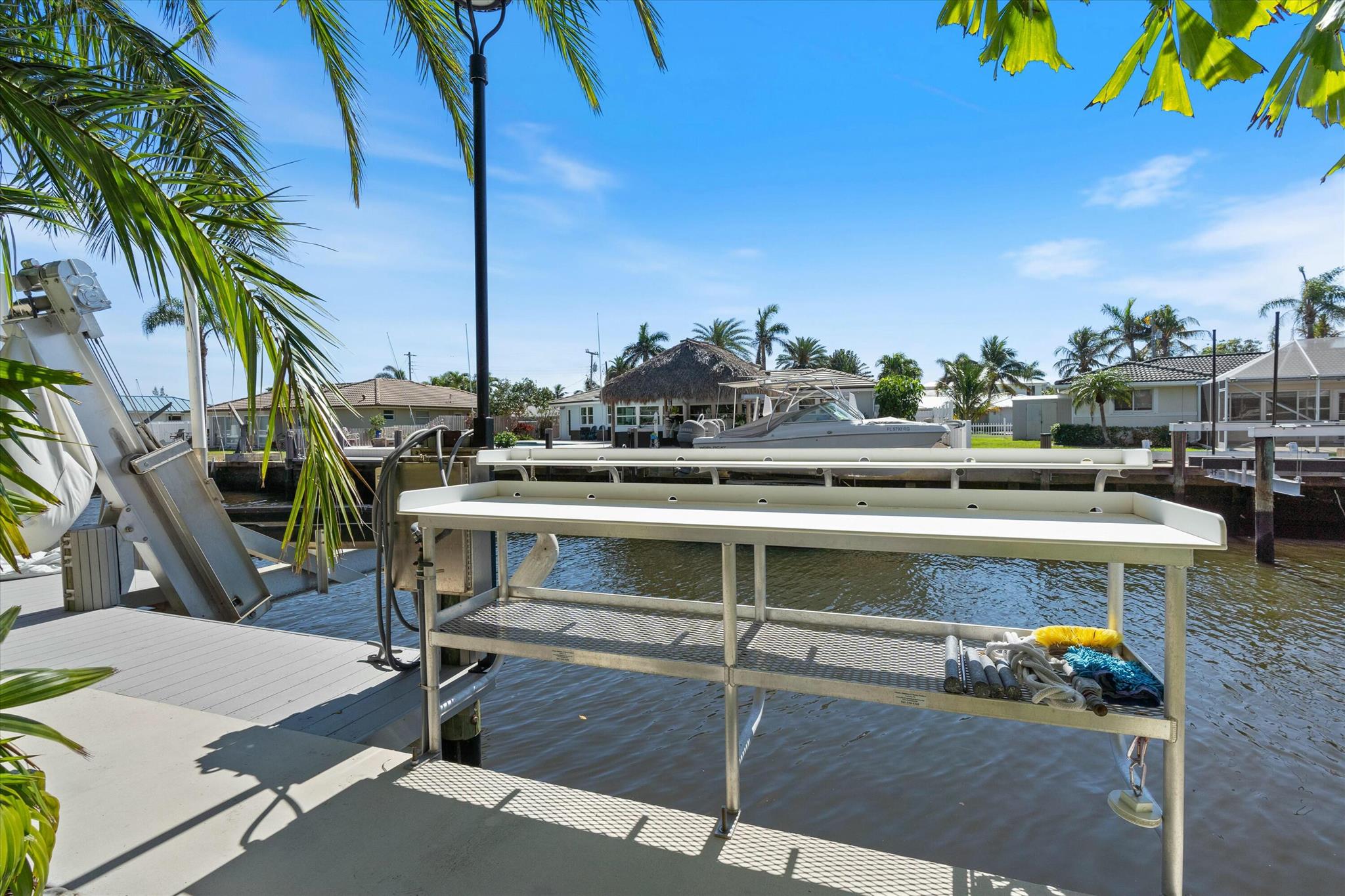 This exceptional waterfront residence has been completely rebuilt from the ground up, with only one original garage wall retained to meet city remodel regulations. Elevated to enhance views and offer added storm protection, the home, back patio, and dock sit on a raised lot that maximizes both lifestyle and longevity. Boating enthusiasts will appreciate the 90 feet of prime waterfrontage, complete with a private dock, 20,000-pound boat lift, wet slip for vessels up to 50 feet, water and electric hookups, and a built-in filet station. With direct ocean access and no fixed bridges, the inlet is just two miles away–making this a rare opportunity to own a true boater’s paradise.The home is available fully turnkey, complete with fine furnishings and all the daily essentials. It is truly