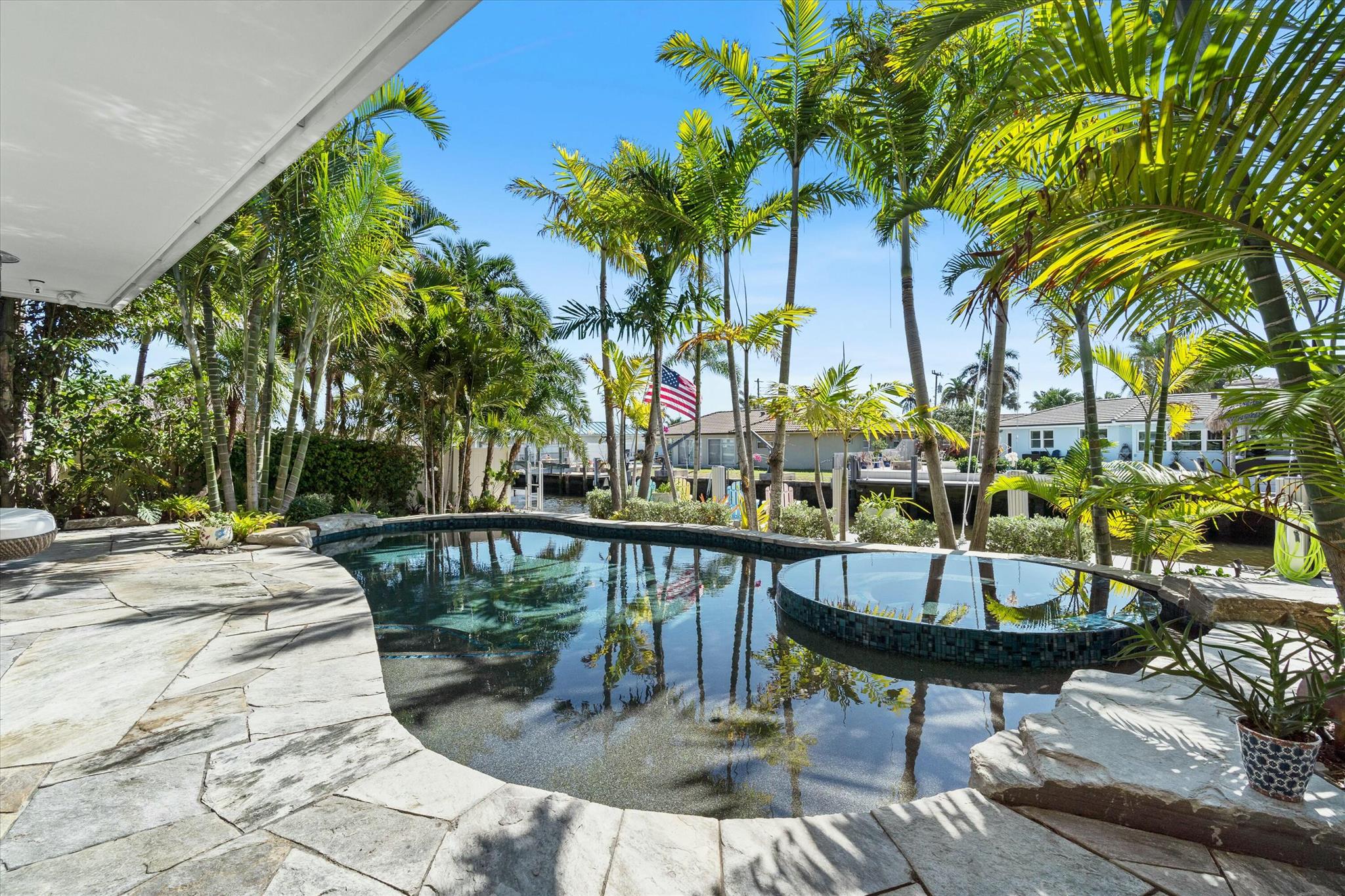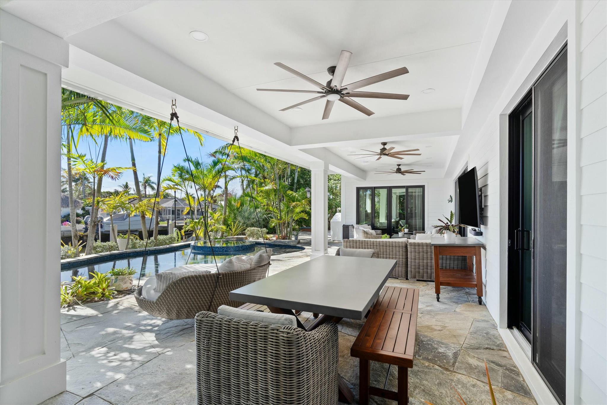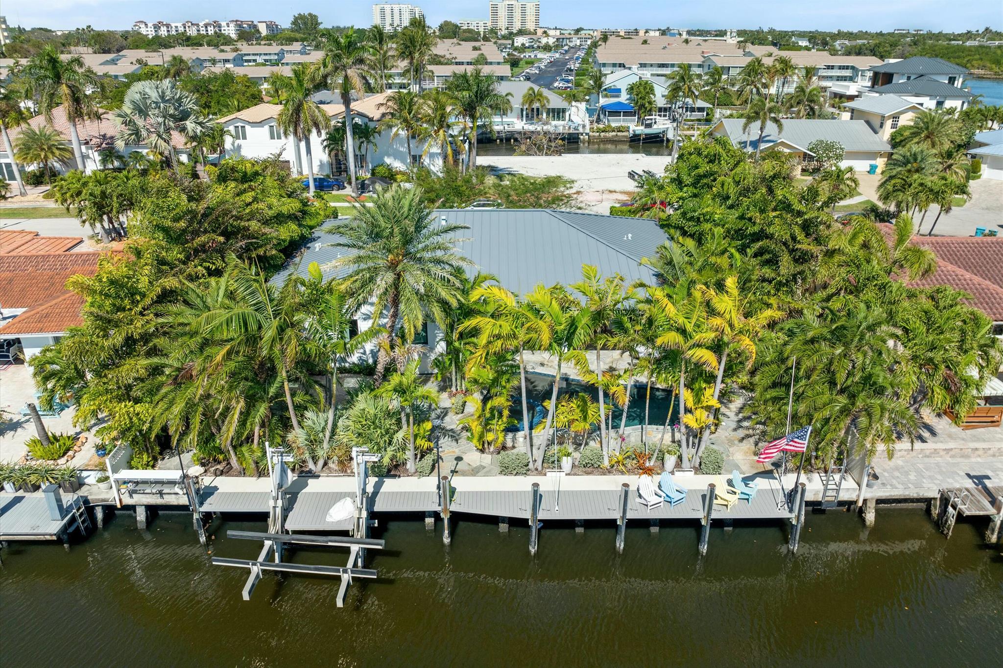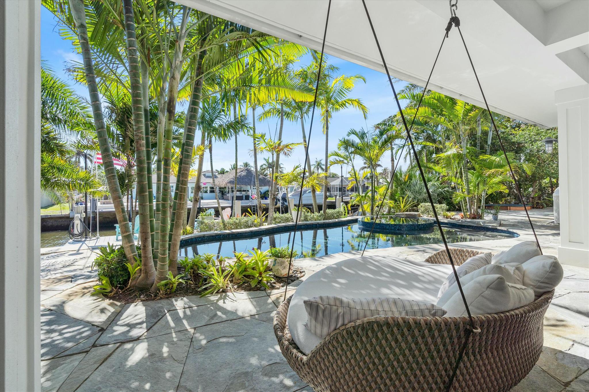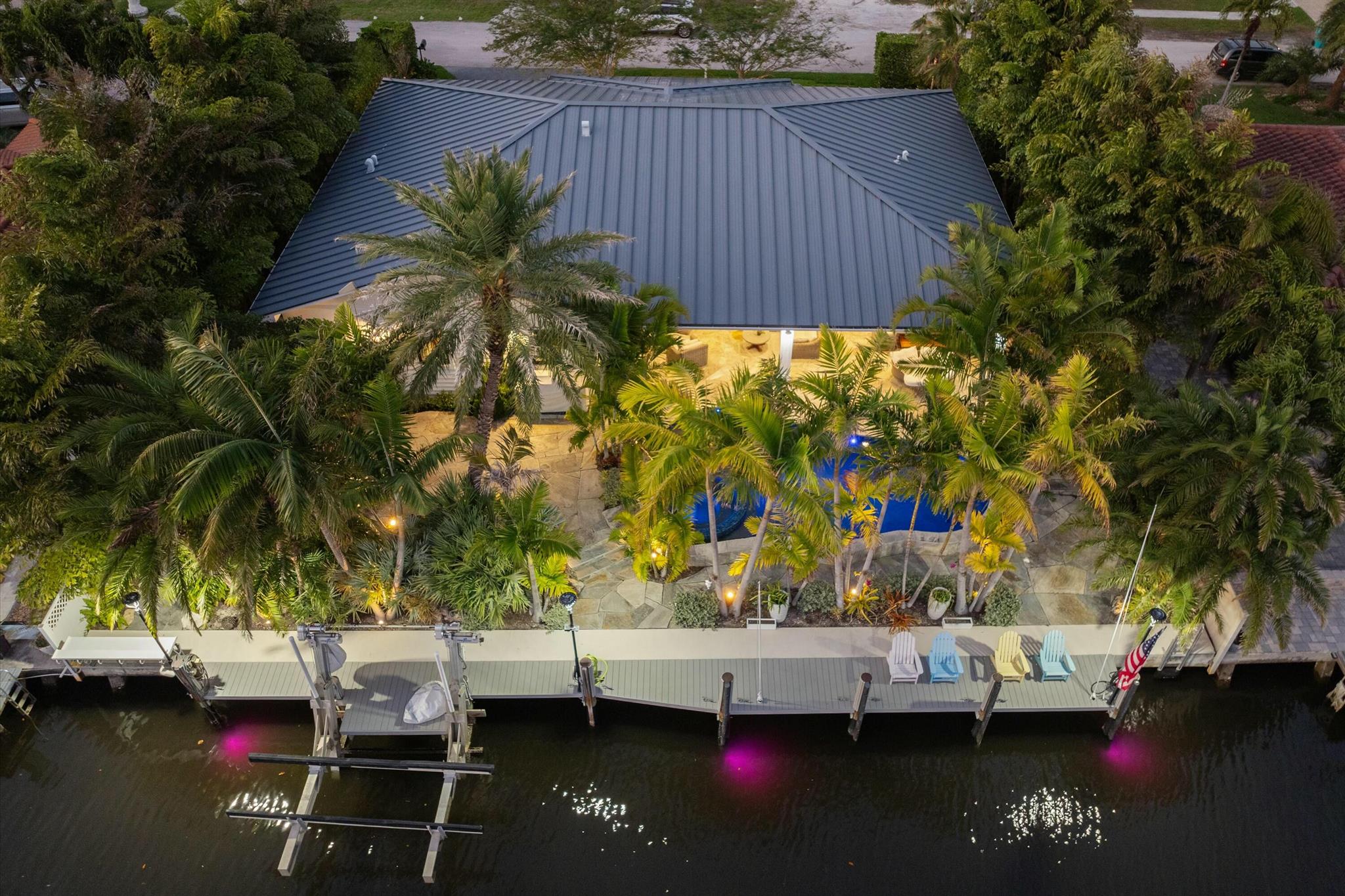 This exceptional waterfront residence has been completely rebuilt from the ground up, with only one original garage wall retained to meet city remodel regulations. Elevated to enhance views and offer added storm protection, the home, back patio, and dock sit on a raised lot that maximizes both lifestyle and longevity. Boating enthusiasts will appreciate the 90 feet of prime waterfrontage, complete with a private dock, 20,000-pound boat lift, wet slip for vessels up to 50 feet, water and electric hookups, and a built-in filet station. With direct ocean access and no fixed bridges, the inlet is just two miles away–making this a rare opportunity to own a true boater’s paradise.The home is available fully turnkey, complete with fine furnishings and all the daily essentials. It is truly
