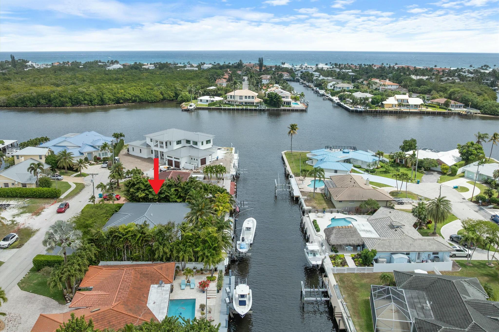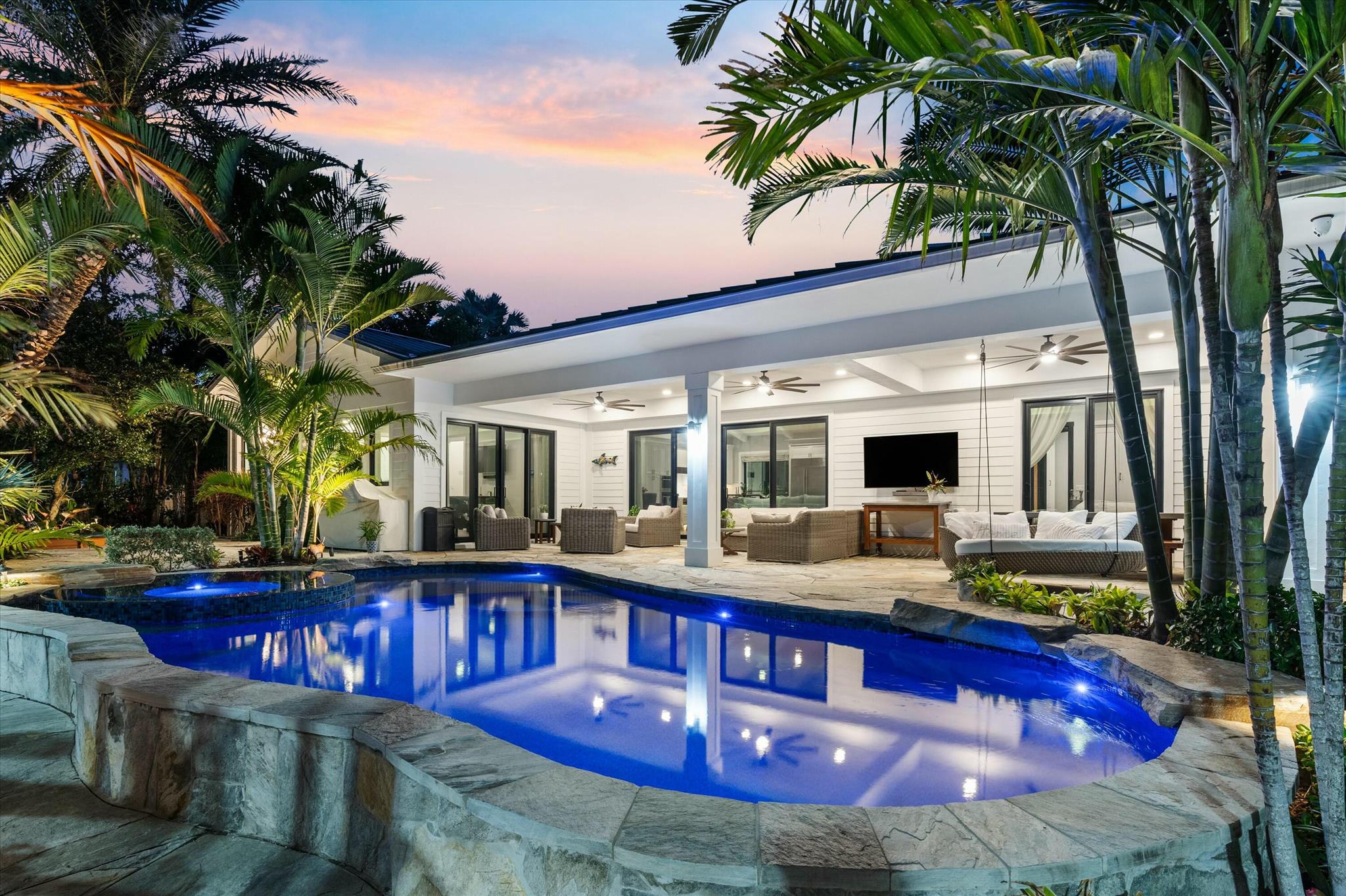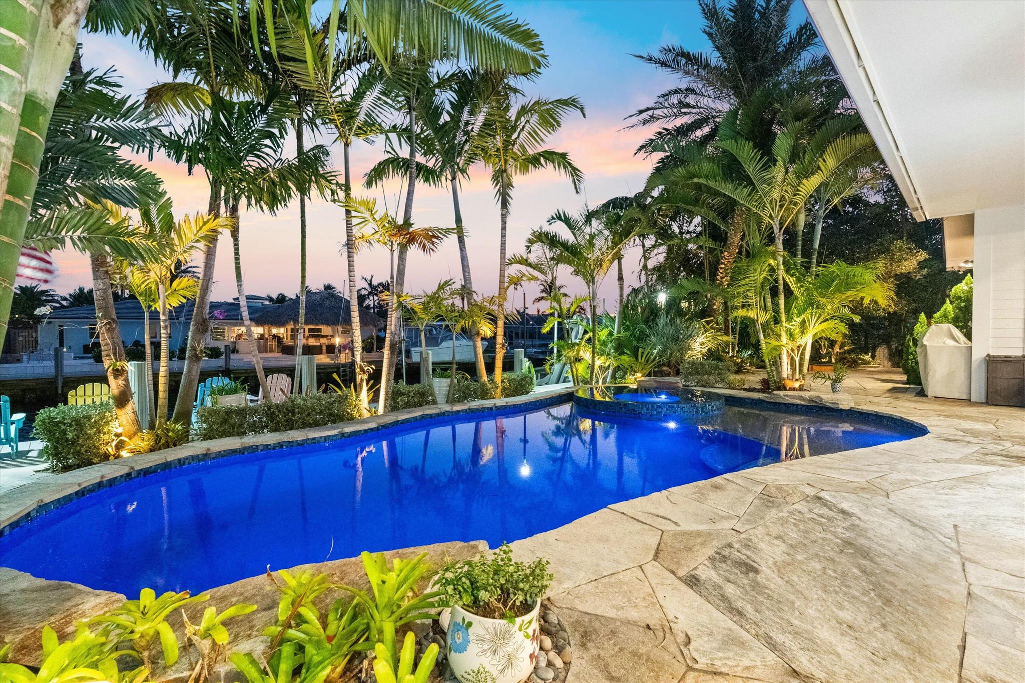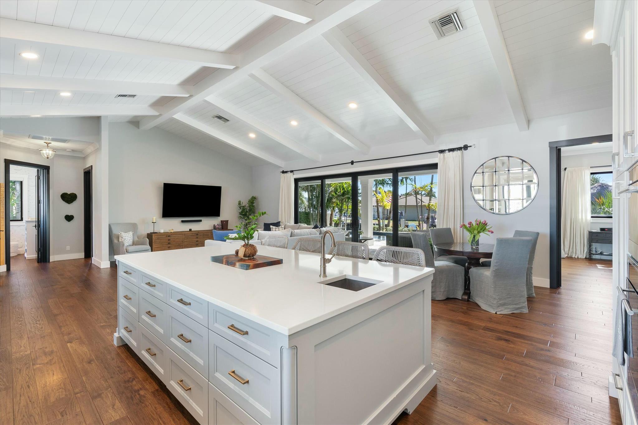 This exceptional waterfront residence has been completely rebuilt from the ground up, with only one original garage wall retained to meet city remodel regulations. Elevated to enhance views and offer added storm protection, the home, back patio, and dock sit on a raised lot that maximizes both lifestyle and longevity. Boating enthusiasts will appreciate the 90 feet of prime waterfrontage, complete with a private dock, 20,000-pound boat lift, wet slip for vessels up to 50 feet, water and electric hookups, and a built-in filet station. With direct ocean access and no fixed bridges, the inlet is just two miles away–making this a rare opportunity to own a true boater’s paradise.The home is available fully turnkey, complete with fine furnishings and all the daily essentials. It is truly