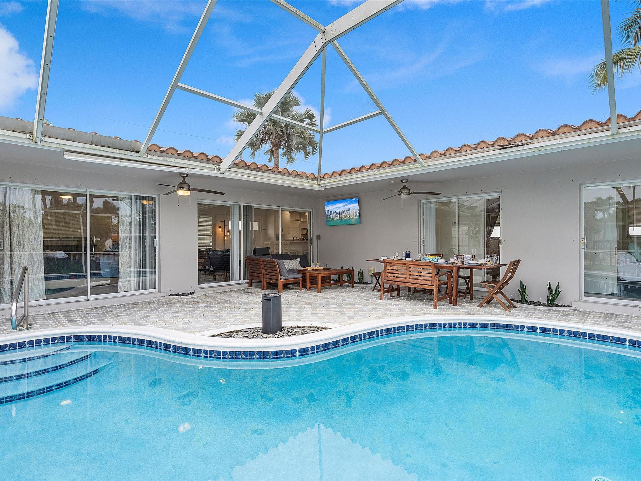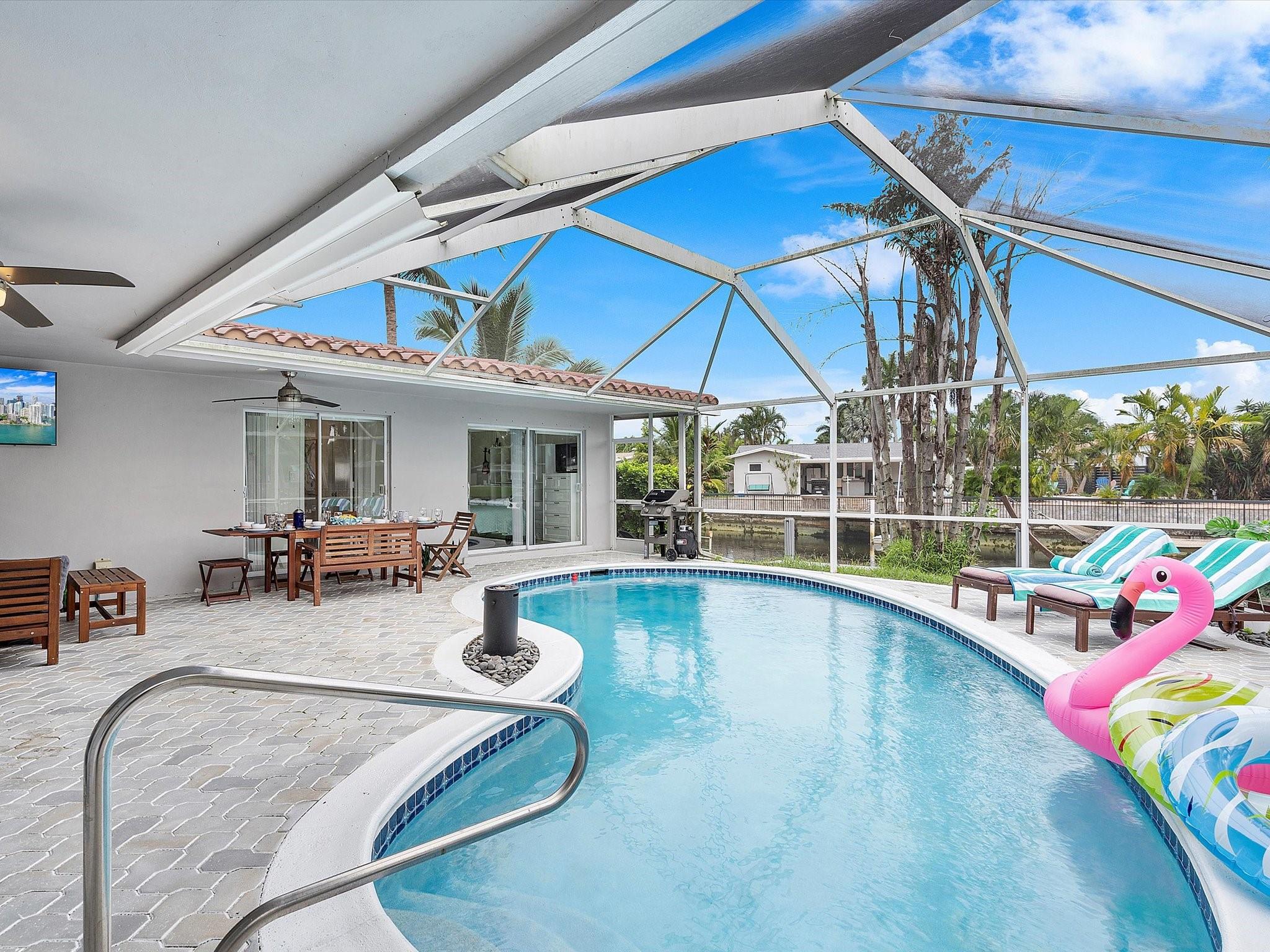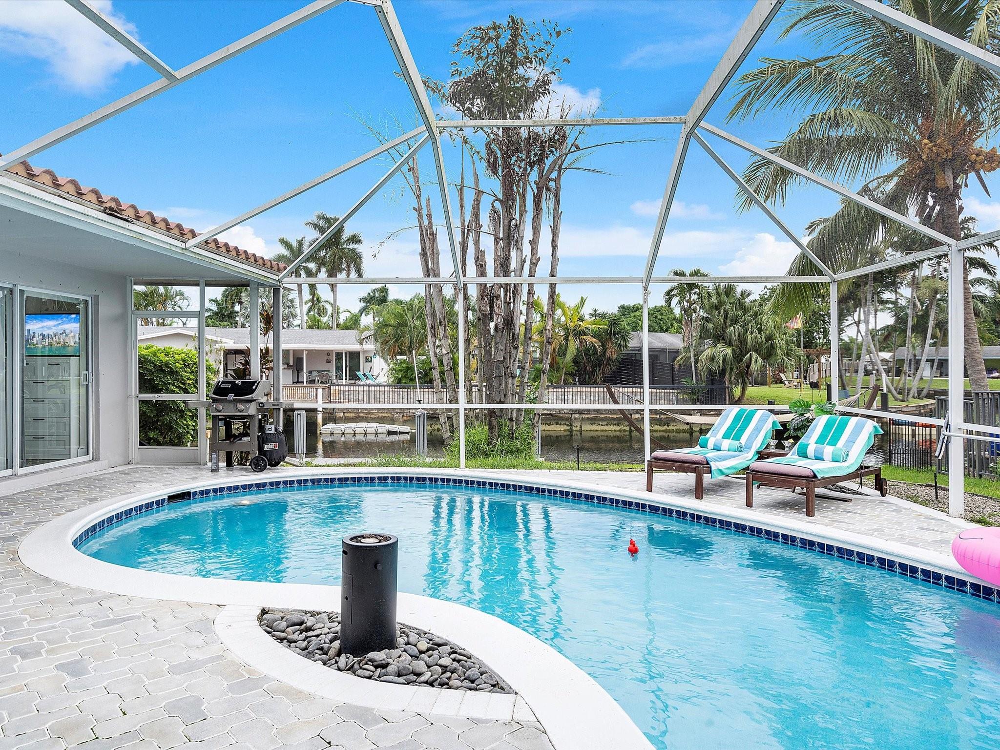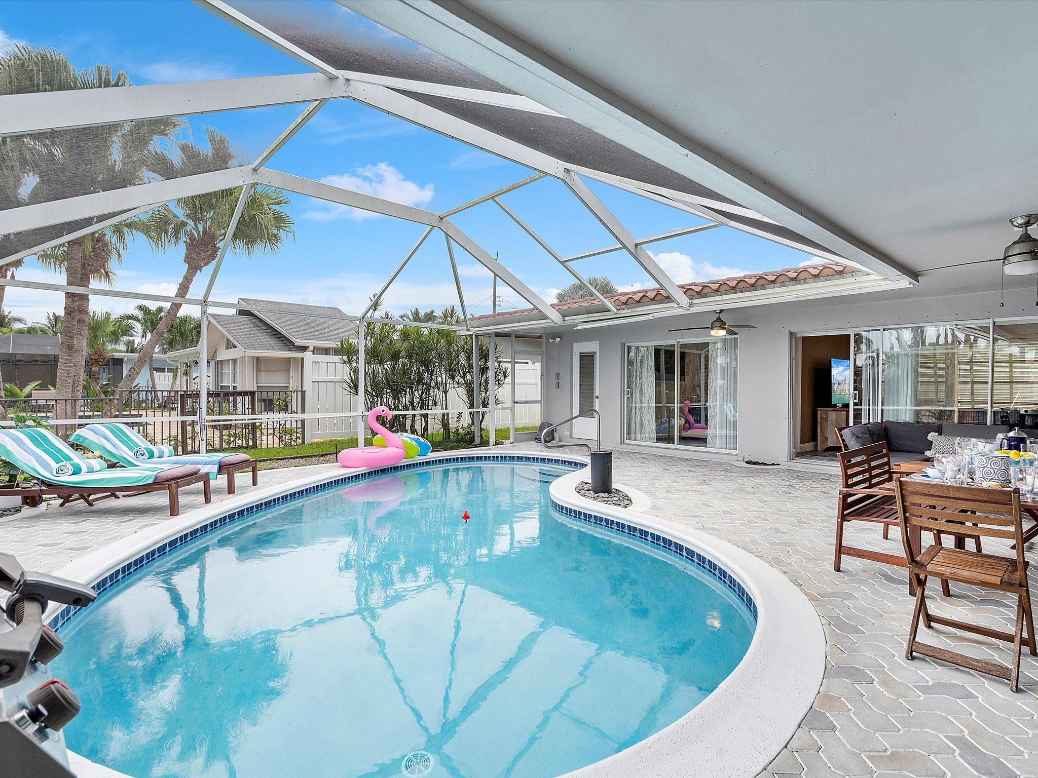 Waterfront home with screened in porch and heated pool for enjoying the outdoors bug free. The screen also makes sure to always having a clean pool. 3-bed, 2-bath home boasts ocean access and a private dock. 67 ft of deep water with fixed bridges but also has ocean access for fishing and a beautiful ride to the inlet. Split floorplan make it attractive for families or guests getting their own space. Plenty of storage with 3 sheds that stay. Furniture open to negotiation as well. Quick access to I95 if you need to commute or get anywhere fast! Buildfax in attachments.