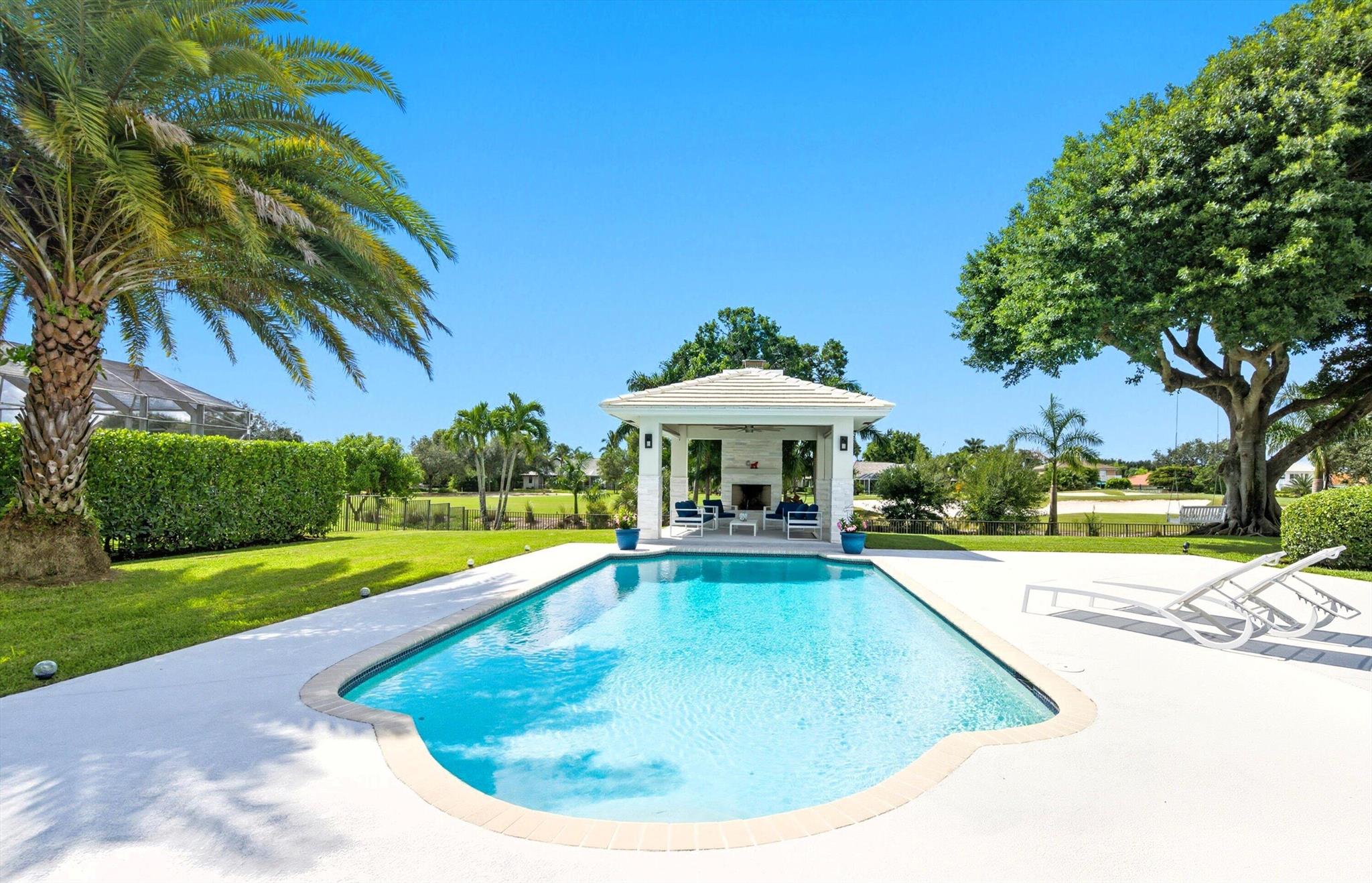 Stunning pool home with spectacular views. One of the most desired half acre lots in Meadow Wood overlooking the golf course. Close to Wanderers Club, Wellington International and Global Dressage. Home features impact glass, tile roof, large kitchen with stainless steel appliances, electric fireplace, 3 bedrooms plus den/office. Cabana bath and oversized patio. Pool pavillion with wood burning fireplace. Fully fenced, fruit trees (avocado, mango, cherry). Low HOA fee of $17 per month.