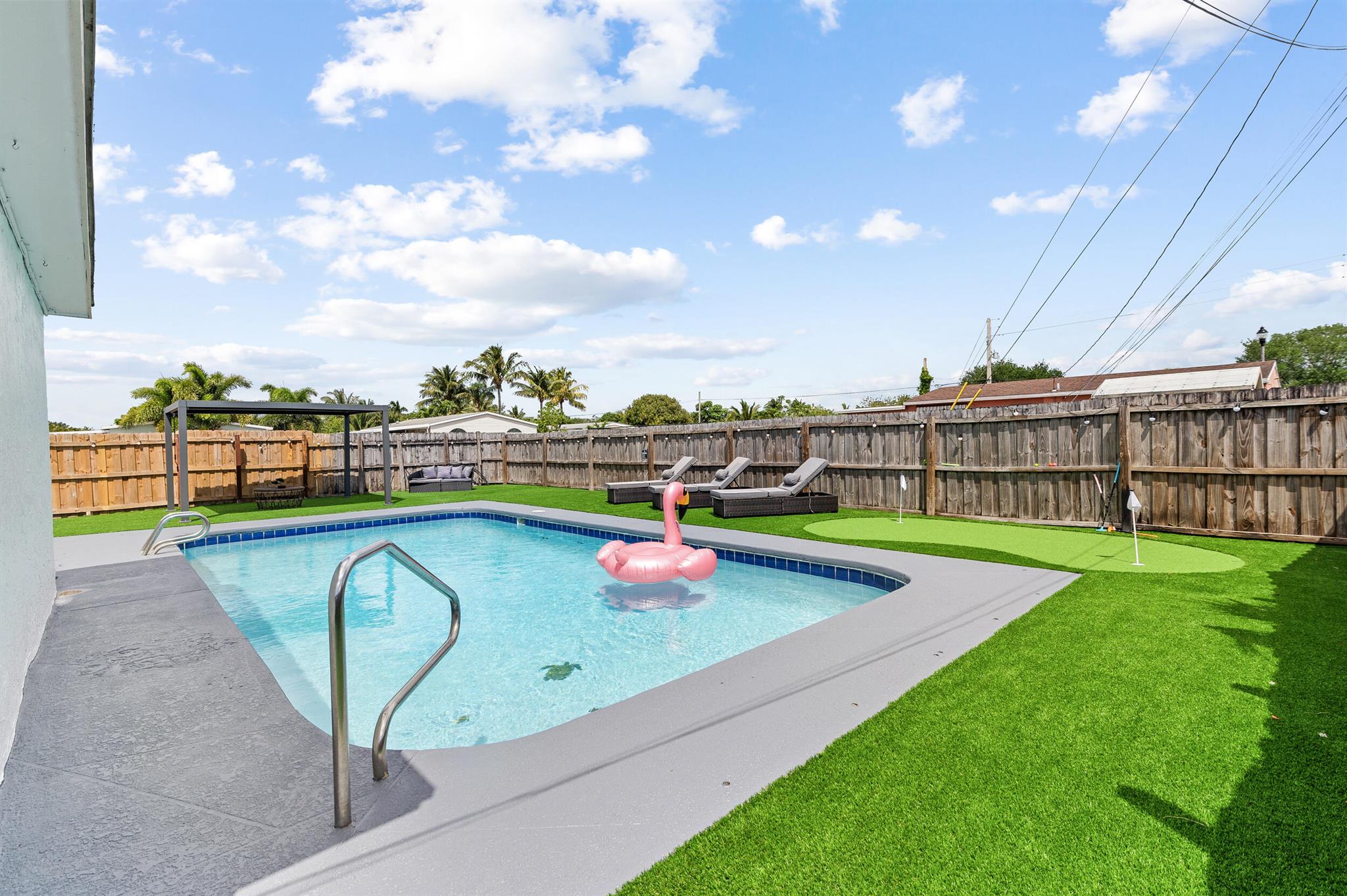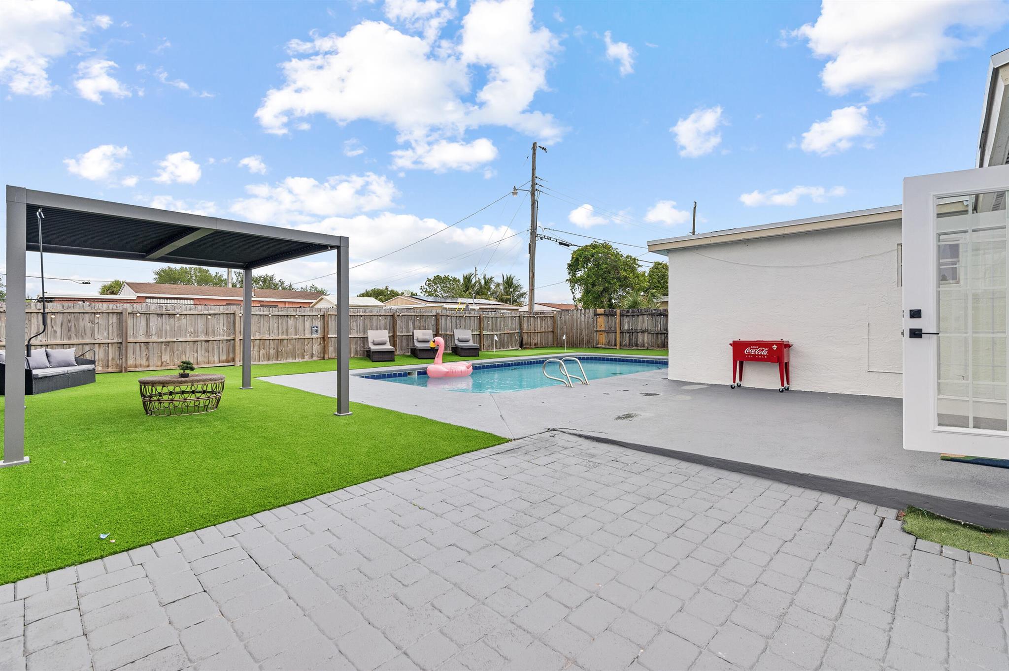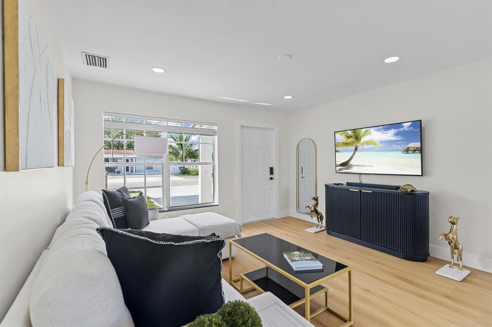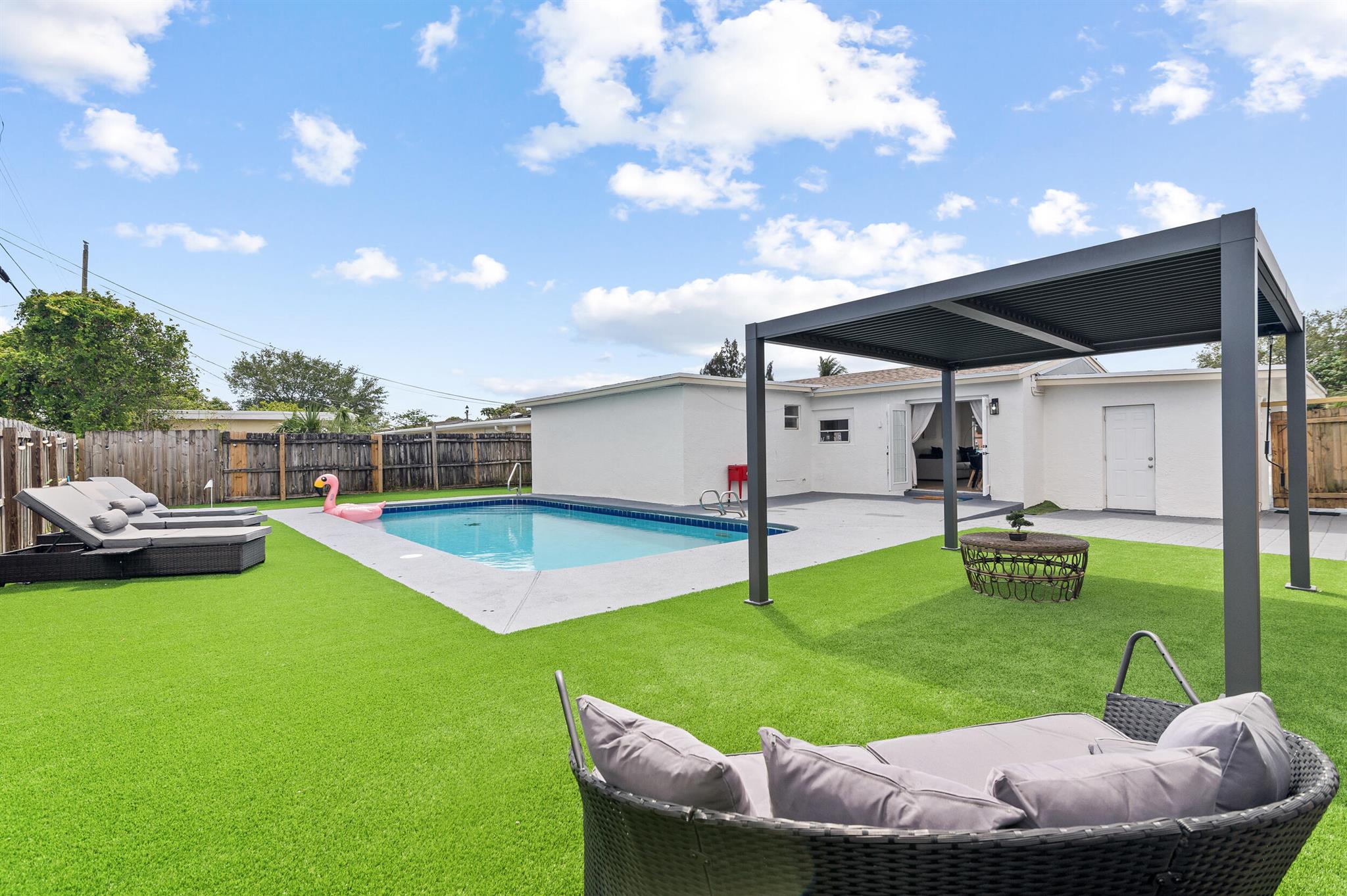 Incredible POOL home nestled on large CORNER lot in NON-HOA Community!! Endless possibilities await from this beautifully renovated 3 bedroom, 2 bath pool home, NEW ROOF (2024) in the heart of West Palm Beach! Owner has updated this single story residence with new designer paint, luxury vinyl flooring throughout (no carpet!), LED lighting and completely furnished like a model! Updated kitchen with granite counter tops and stainless steel appliances. HUGE primary suite with connected sitting area/office or den/media room. BOTH bathrooms updated with custom vanities – master boasts mosaic tile floor and large shower; guest bath offers LED mirror and combo tub/shower. RELAX in your private backyard oasis! Take advantage of the Florida Sunshine as you lounge around your large open pool,