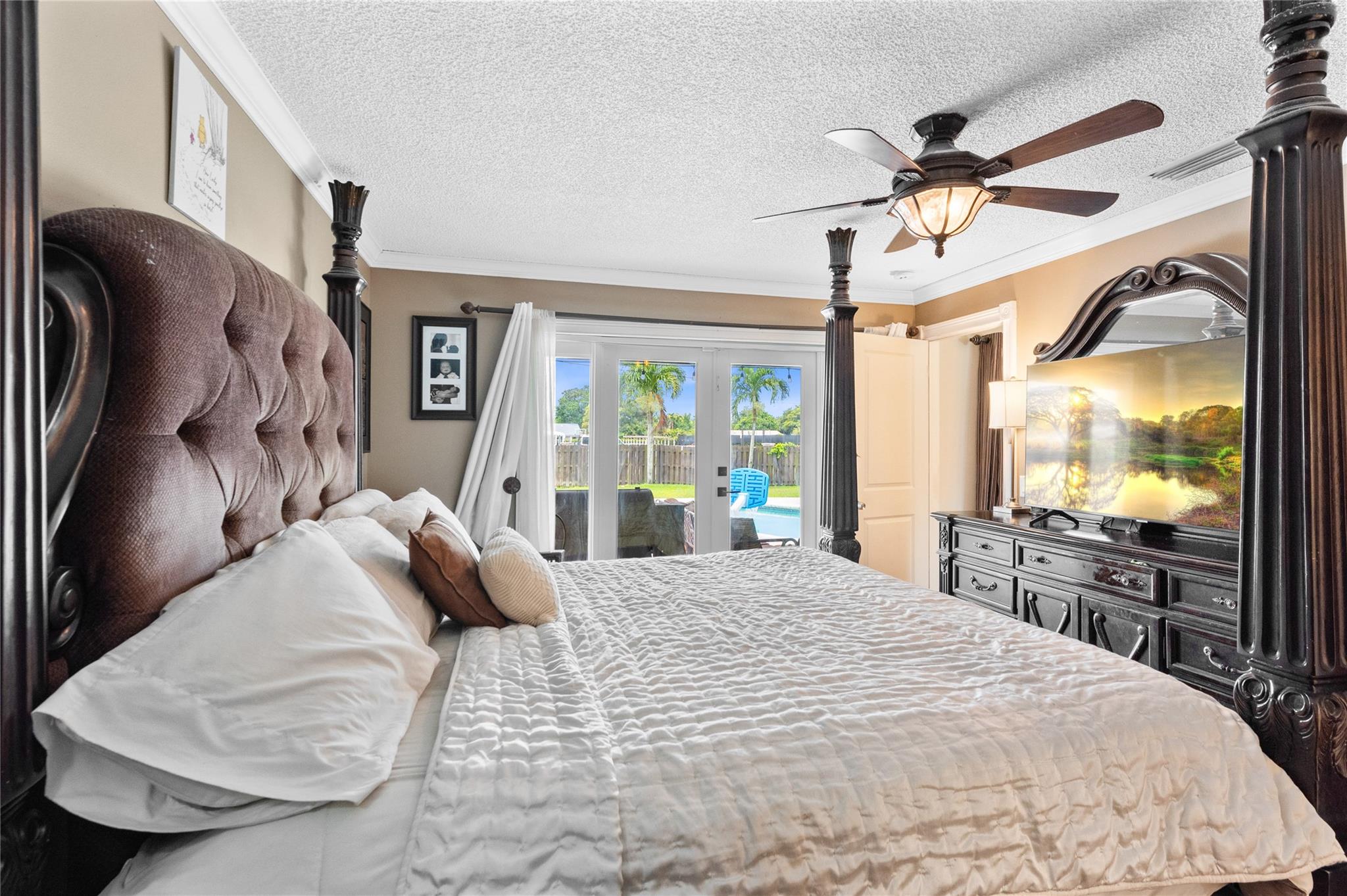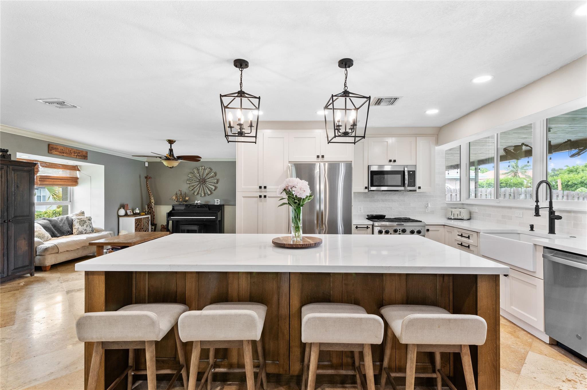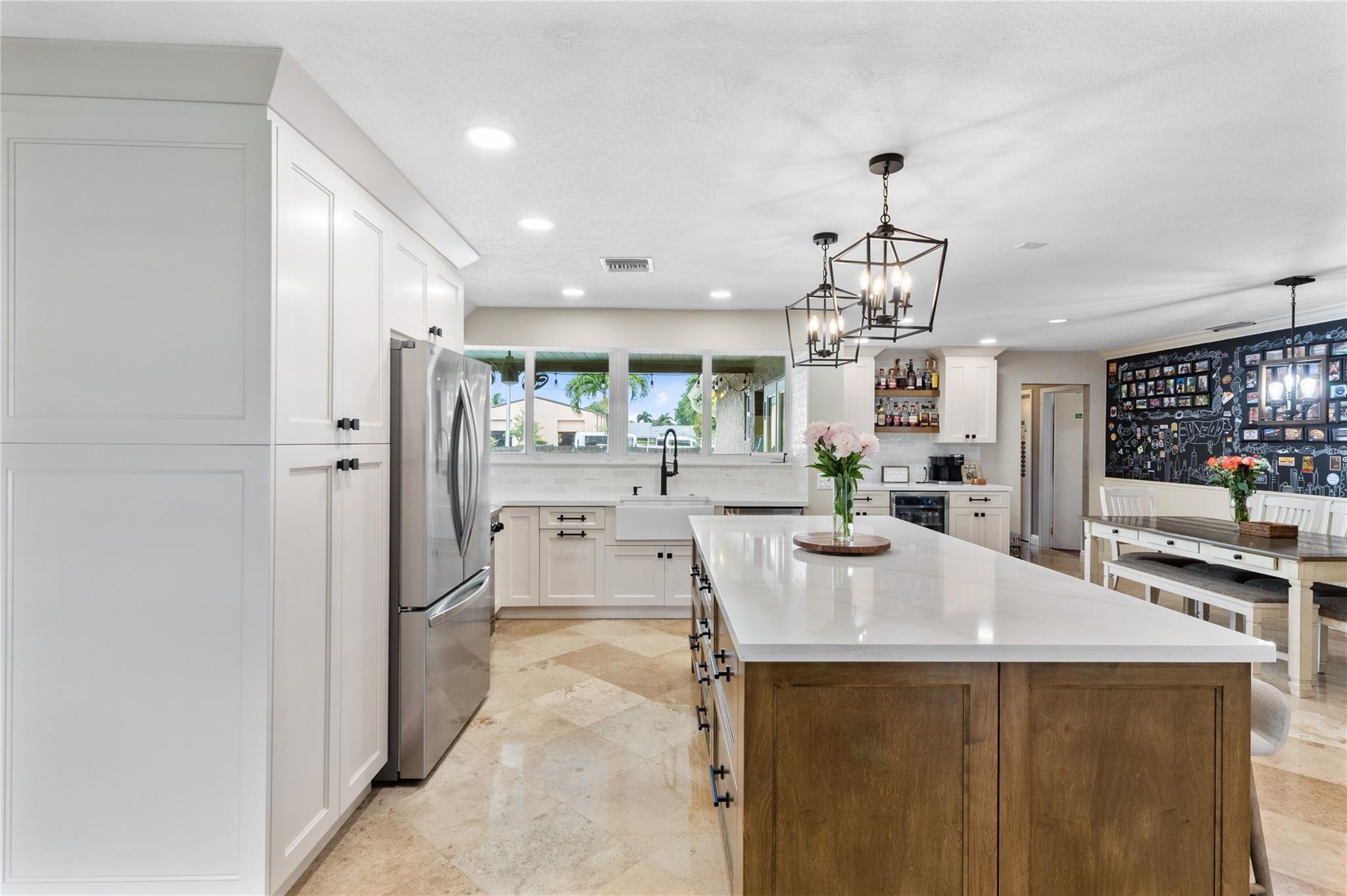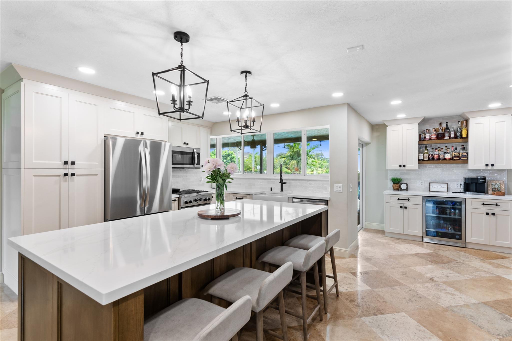 Substantially remodeled 4BR/2BA pool home on XL lot just under ¼ acre—no HOA! 2,256 SF under air. Open floor plan, split concept. Updated kitchen w/ SS appliances incl. gas range, quartz counters, lg island w/ seating, farmhouse sink, coffee bar & wine fridge. Impact windows/French doors, crown molding, travertine tile, laminate in BRs, stamped concrete in media/theater room. No popcorn ceilings. Both baths have a classic yet updated feel, offering timeless finishes & modern comfort. Roof 2019, A/C 5 yrs. Private fenced yard, fruit tree & generous stamped driveway. A must-see gem!