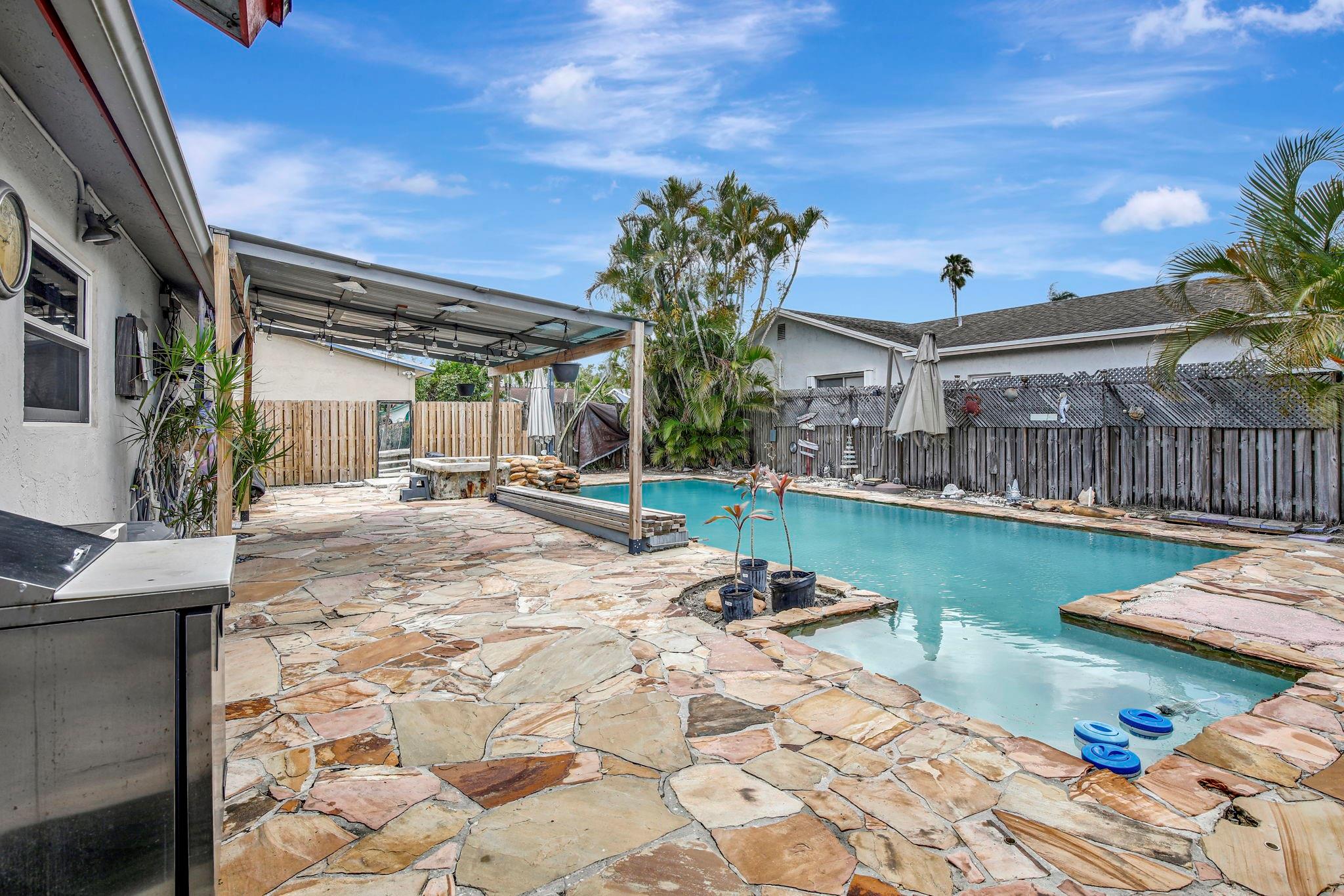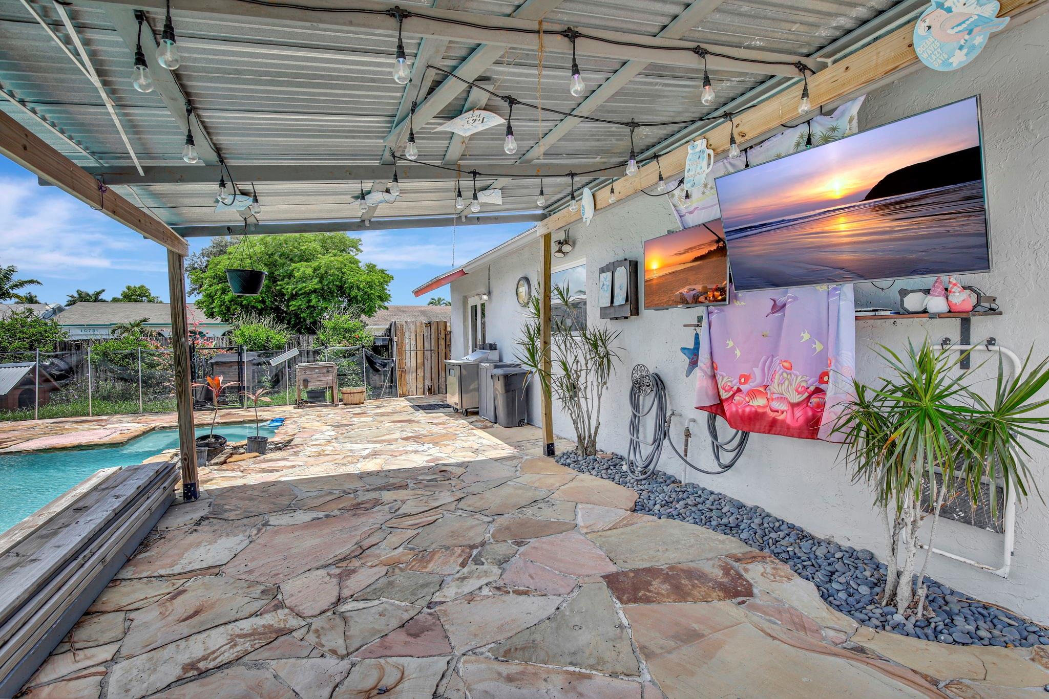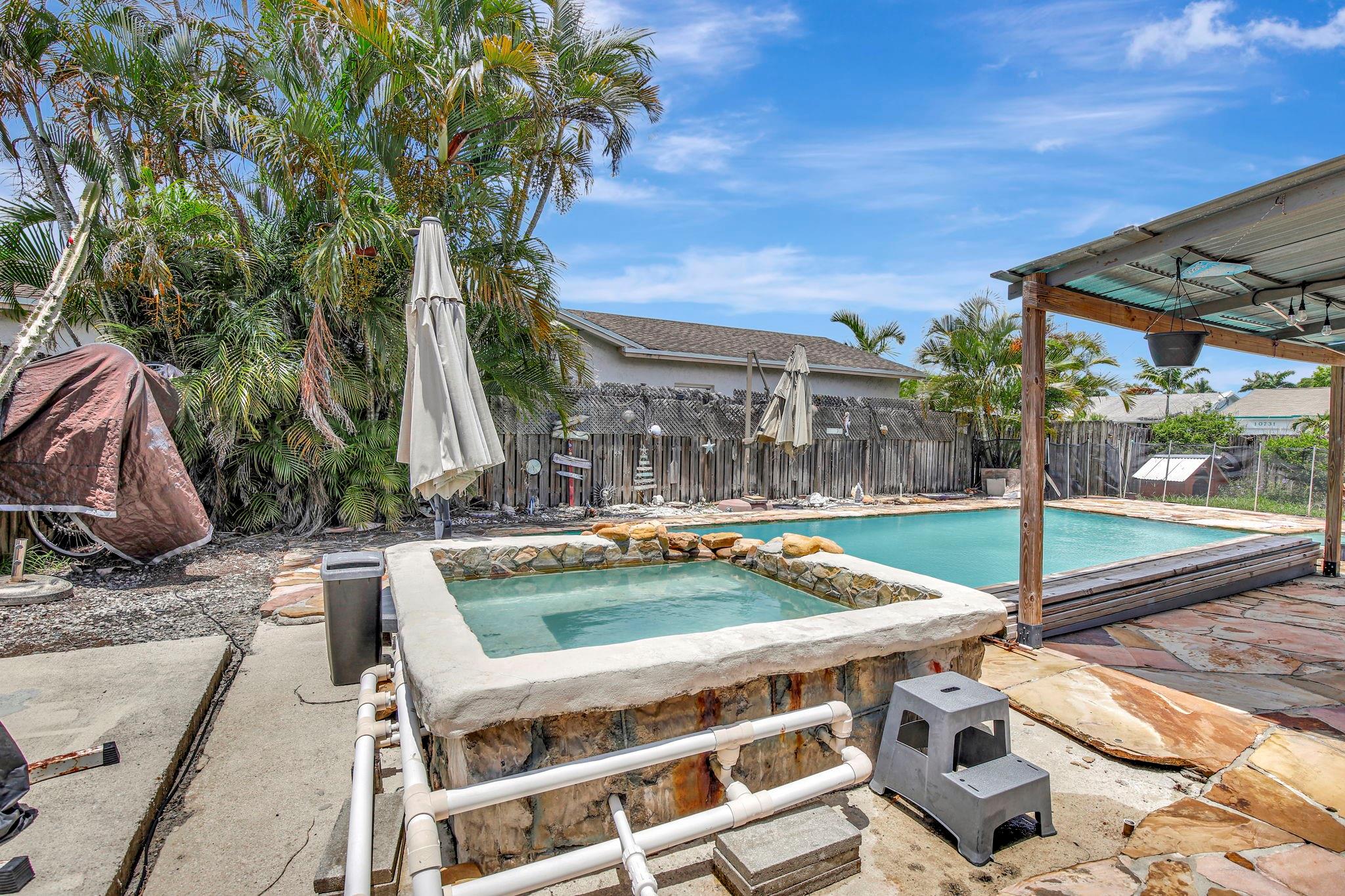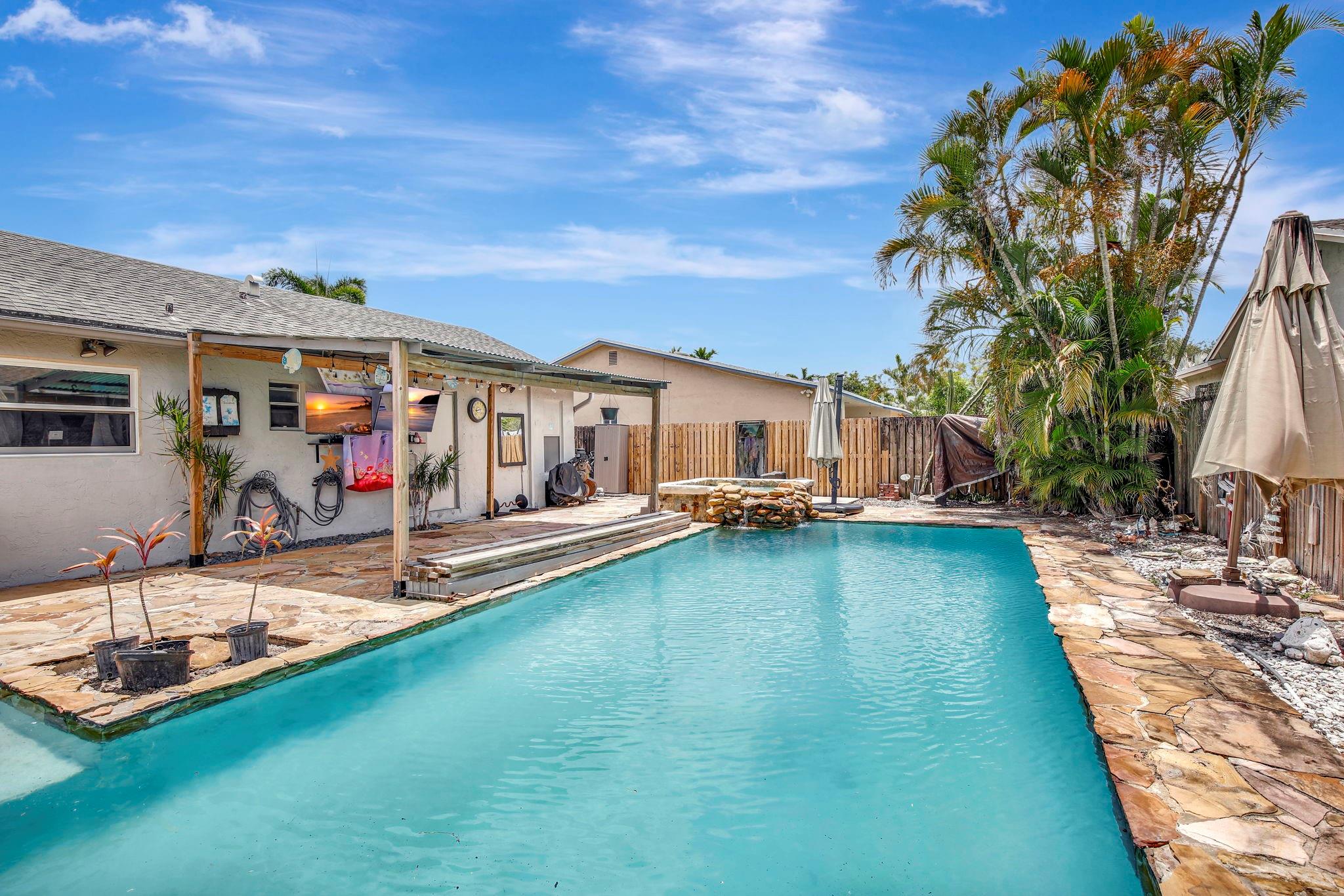 This 3/2 single-family home has spacious corner lot in a great location. Listed PARTIALLY FURNISHED shown, but negotiable and MOTIVATED SELLER. Artsy Colorful Family Fun Vibe or make it your own to fit your lifestyle. No HOA. Home Inspection done roof & a/c passed. Features heated pool and spa unique sandstone deck with door to bathroom. Outdoor covered patio to relax & entertain with Two Mounted TVs, deli-fridge, fenced backyard. Vaulted Ceiling living room encased with Pecky Cypress wood panels, mirrors, and brick. Remodeled kitchen has plenty of storage with 42” Cherry cabinets. Garage was partially converted into a versatile bonus space with its own separate entrance perfect for an office, guest, or potential rental income opportunity.