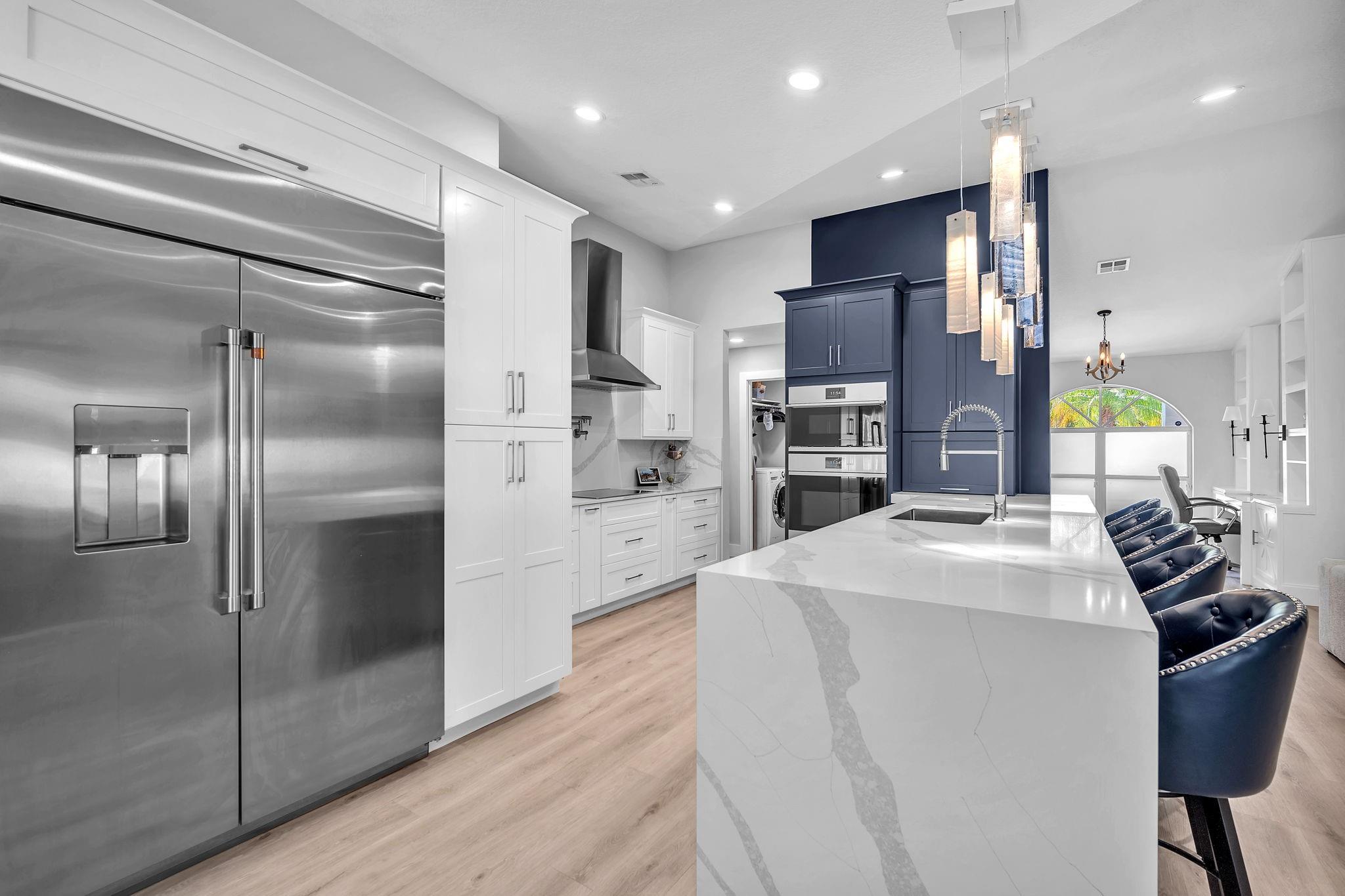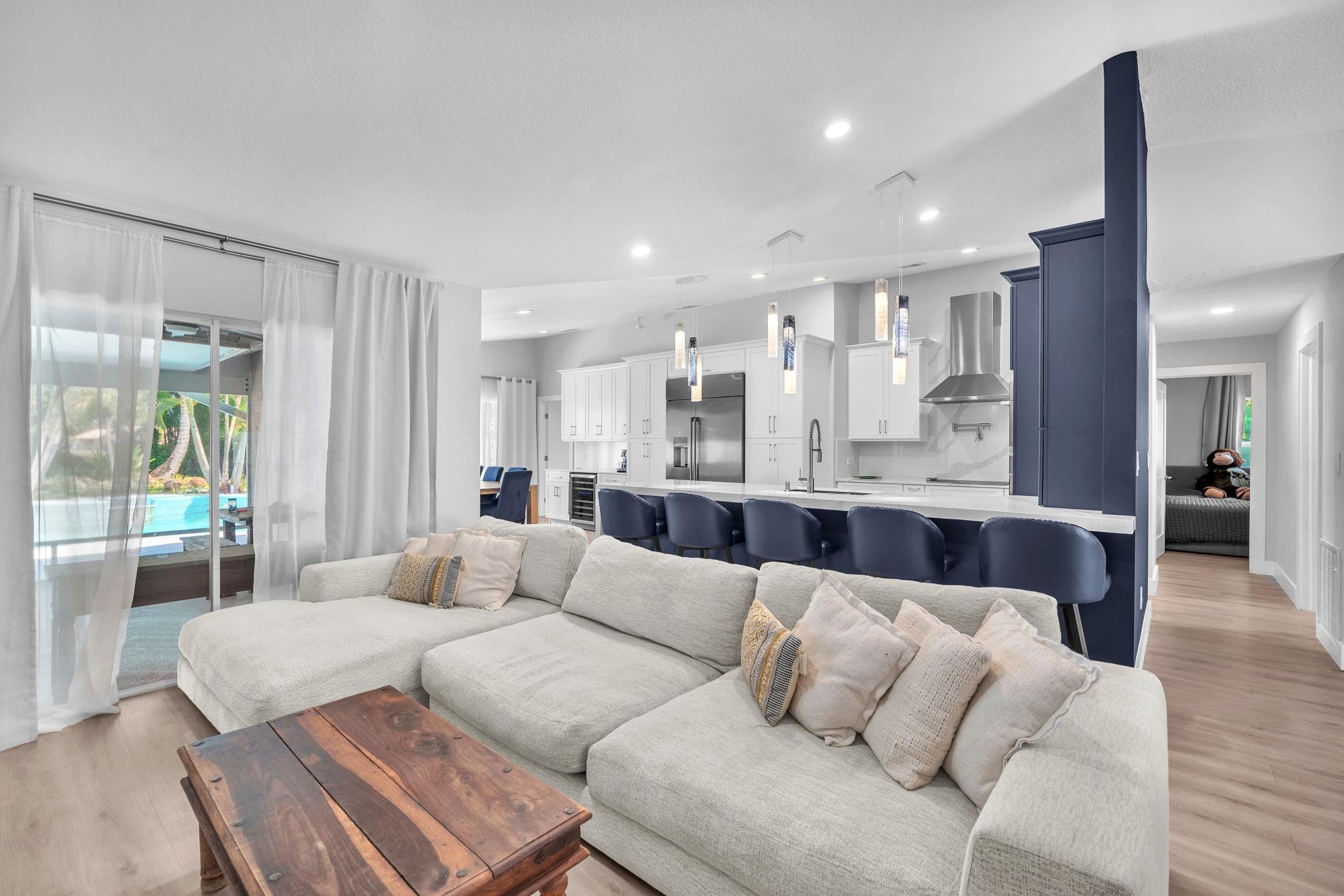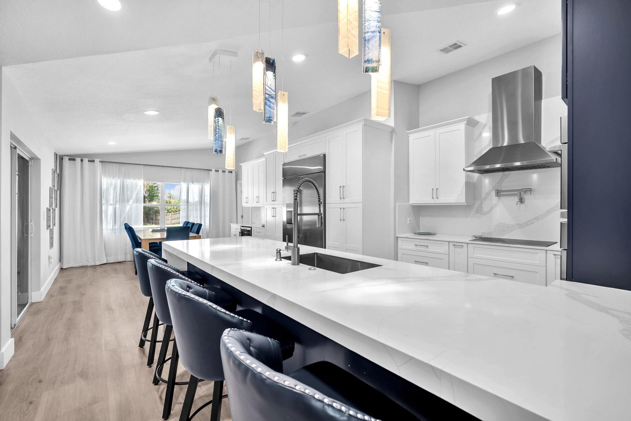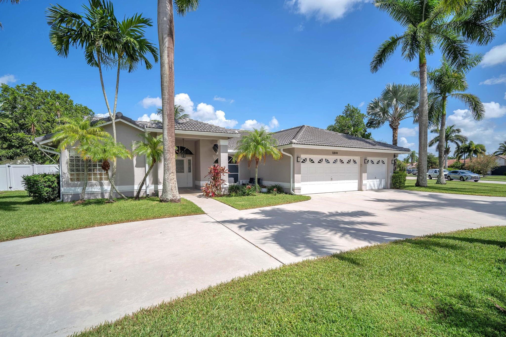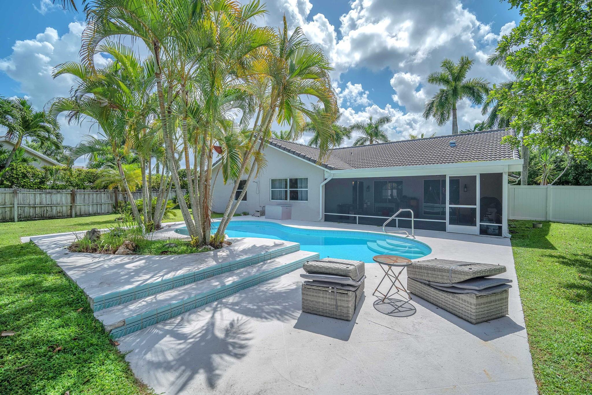 Welcome to this stunning fully renovated 4/3 home on a spacious .43-acre corner lot. Featuring 2 primary en-suites, pool, chef’s kitchen & 3 car garage! The chef’s dream kitchen boasts wood cabinetry, quartz countertops, GE Café appliances, abundant storage & under cabinet lights! All 3 bathrooms have been tastefully renovated, w/quartz countertops. Laminate flooring runs throughout except in bathrooms. Enjoy outdoor living w/fully fenced pie-shaped lot, pool, & screened, covered patio—perfect for entertaining. The 3-car garage offers A/C venting & epoxy floor, plus a circular driveway provides ample parking. Roof (2021), A/C (2021), tankless water heater (2020), hurricane panels, & generator hook-up. Not included in sale:3 pendant lights, entry fixture, window treatments & wine fridge