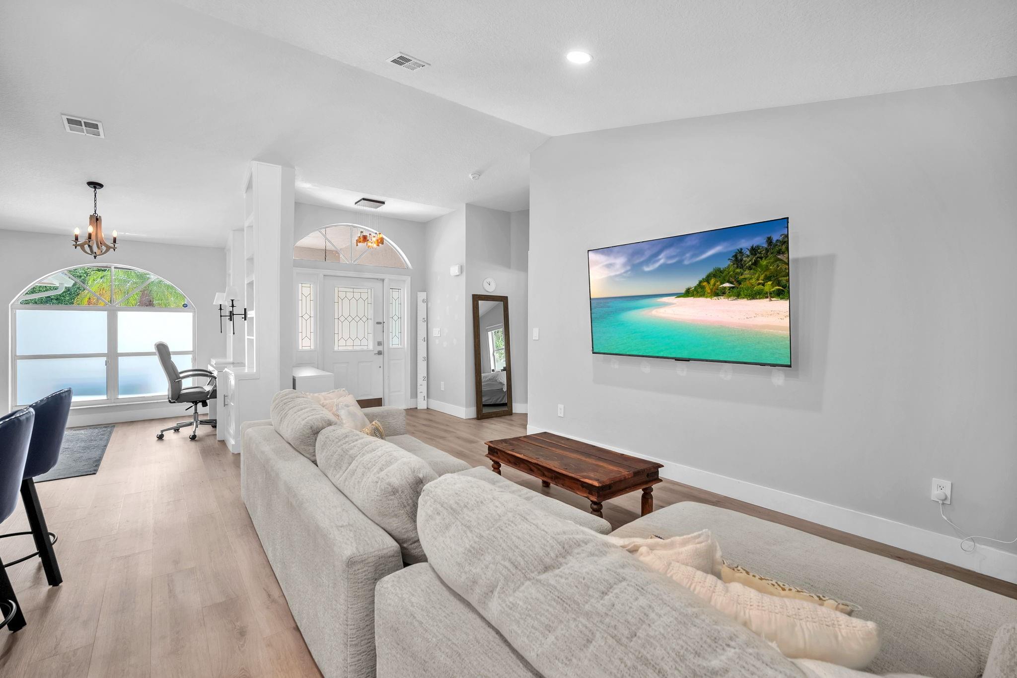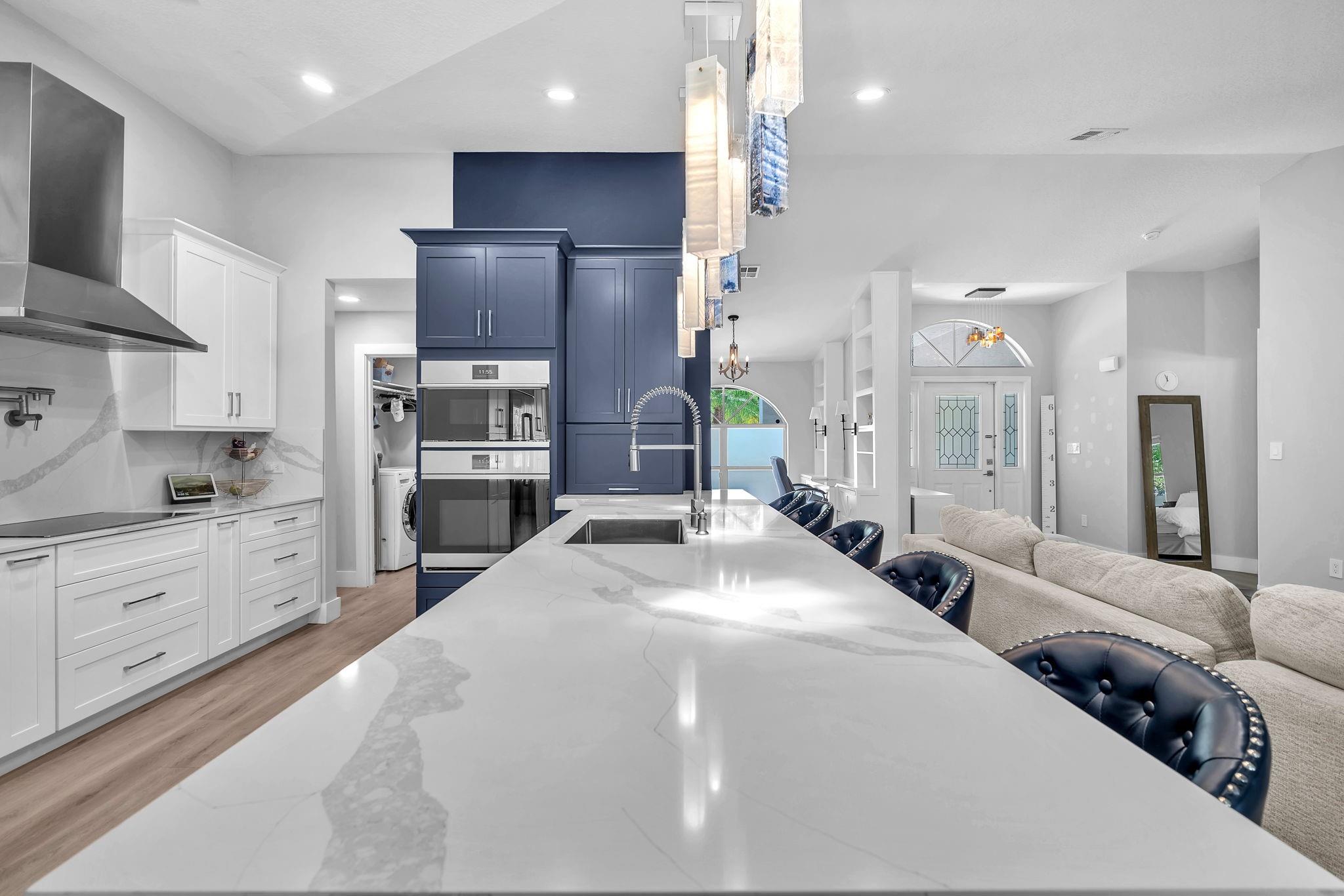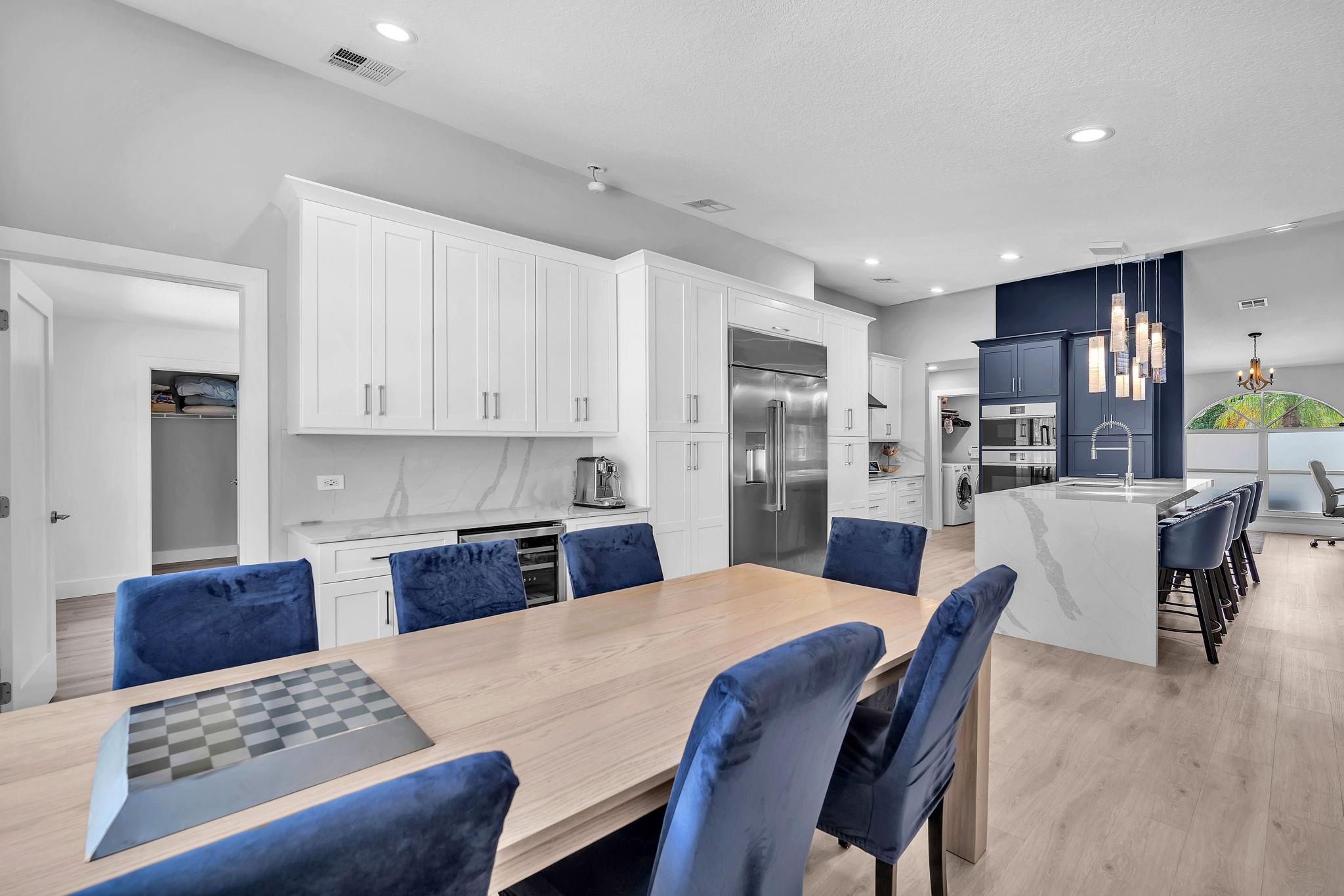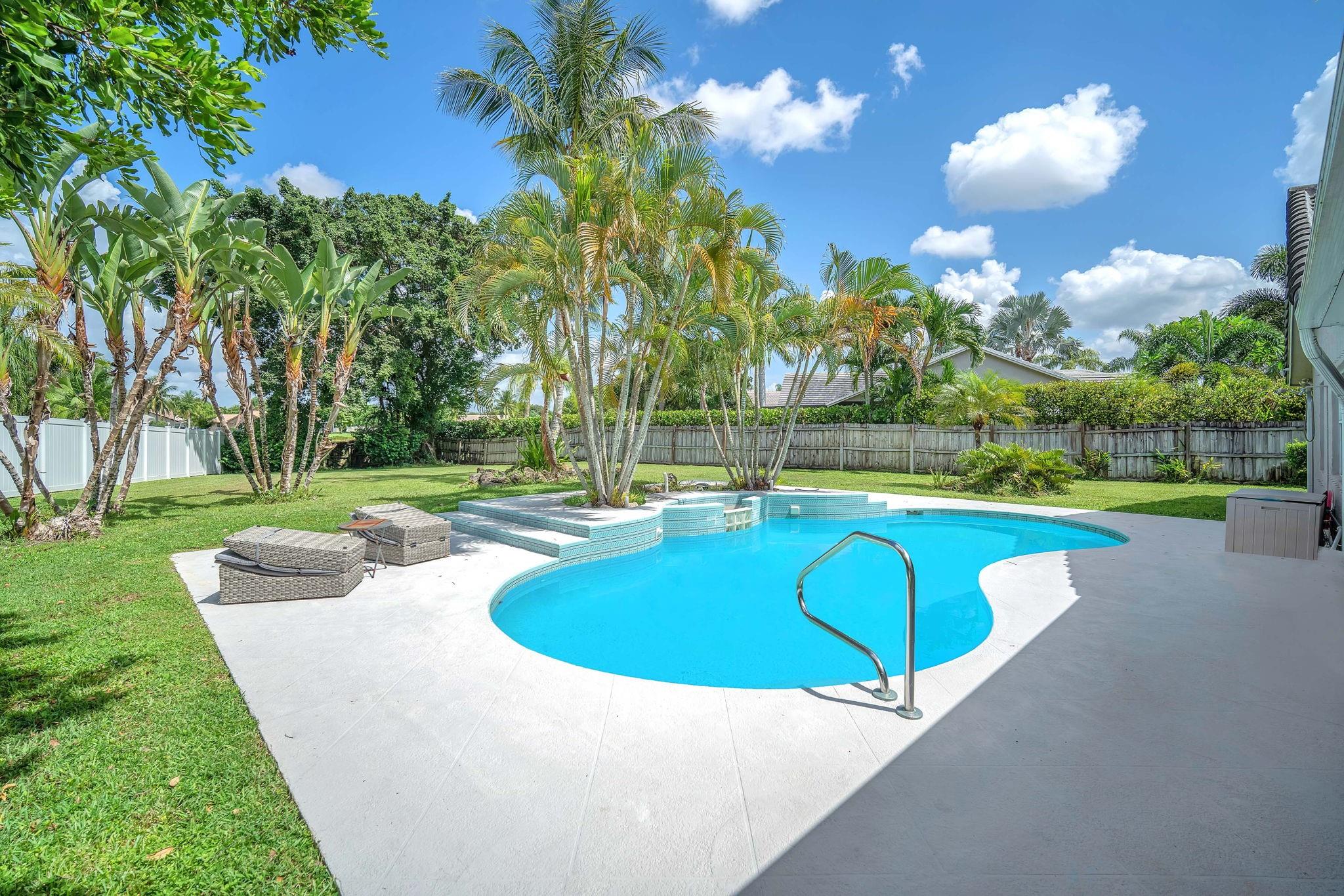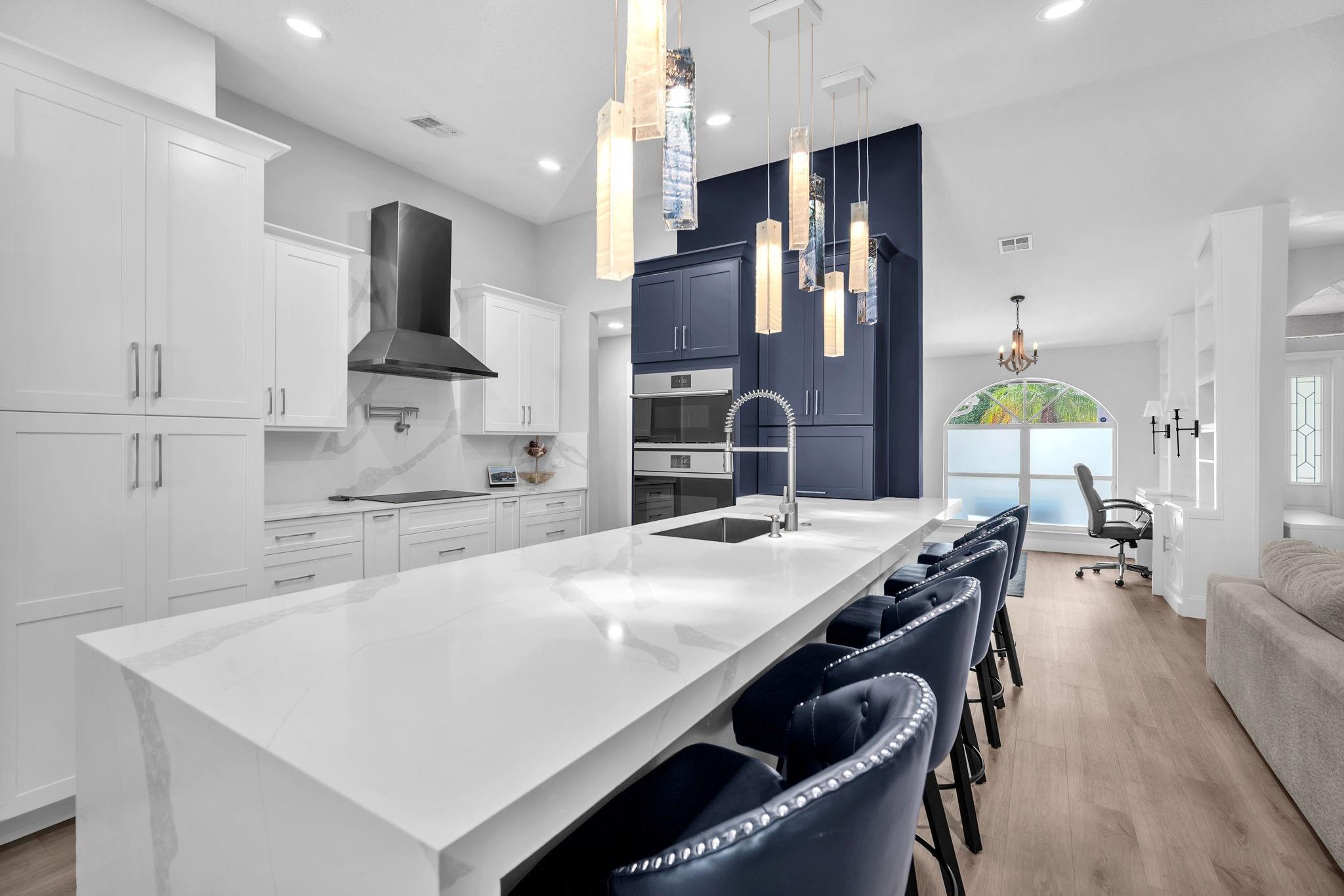 Welcome to this stunning fully renovated 4/3 home on a spacious .43-acre corner lot. Featuring 2 primary en-suites, pool, chef’s kitchen & 3 car garage! The chef’s dream kitchen boasts wood cabinetry, quartz countertops, GE Café appliances, abundant storage & under cabinet lights! All 3 bathrooms have been tastefully renovated, w/quartz countertops. Laminate flooring runs throughout except in bathrooms. Enjoy outdoor living w/fully fenced pie-shaped lot, pool, & screened, covered patio—perfect for entertaining. The 3-car garage offers A/C venting & epoxy floor, plus a circular driveway provides ample parking. Roof (2021), A/C (2021), tankless water heater (2020), hurricane panels, & generator hook-up. Not included in sale:3 pendant lights, entry fixture, window treatments & wine fridge