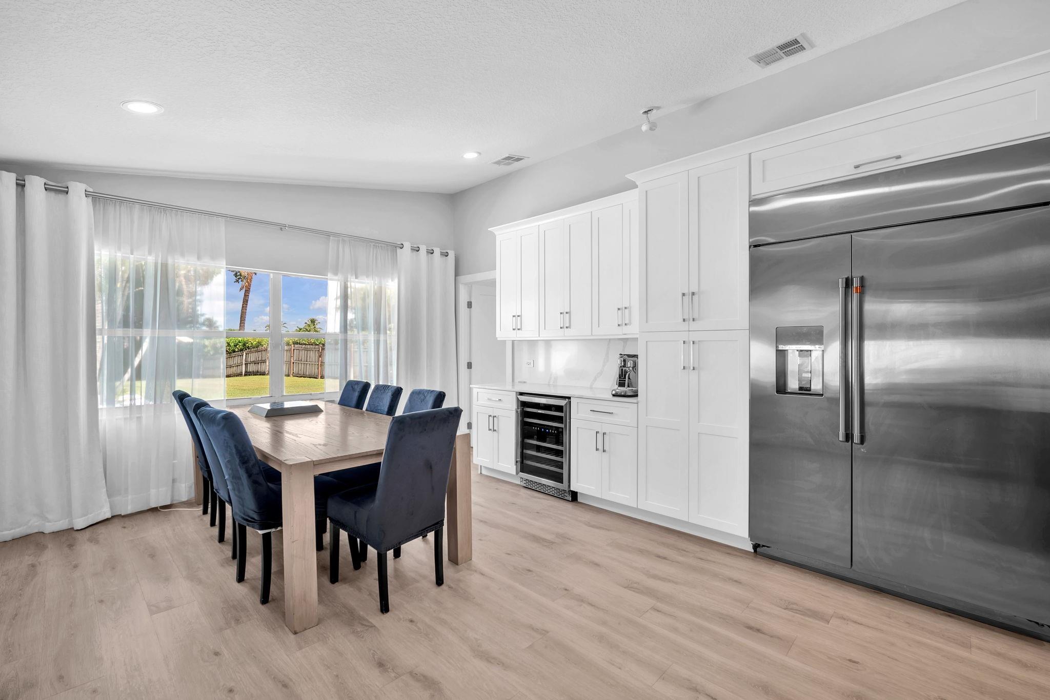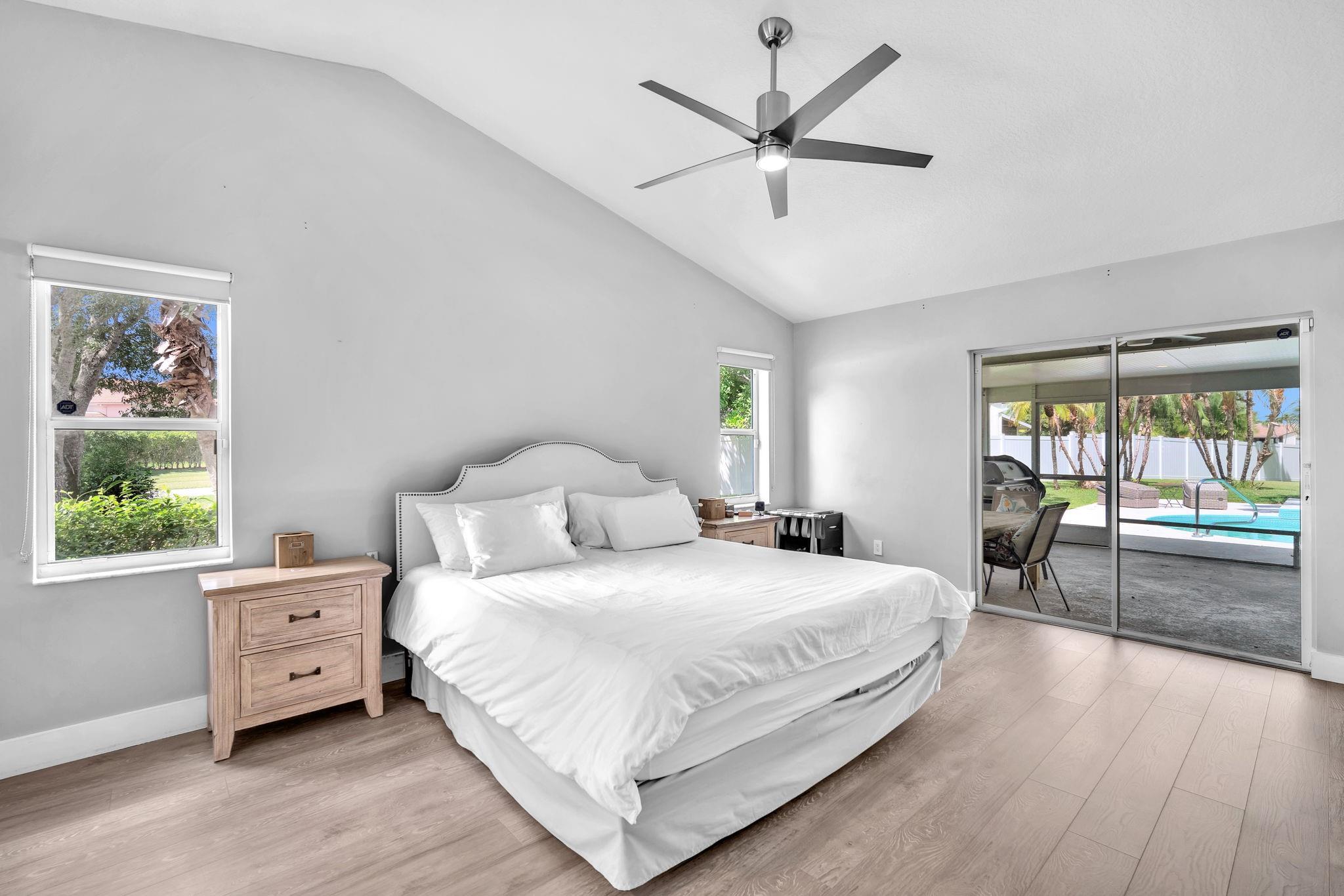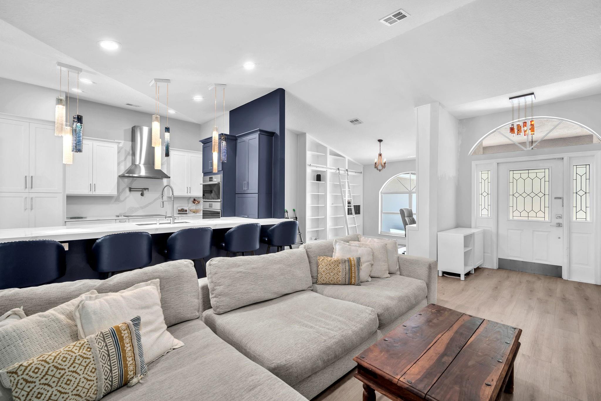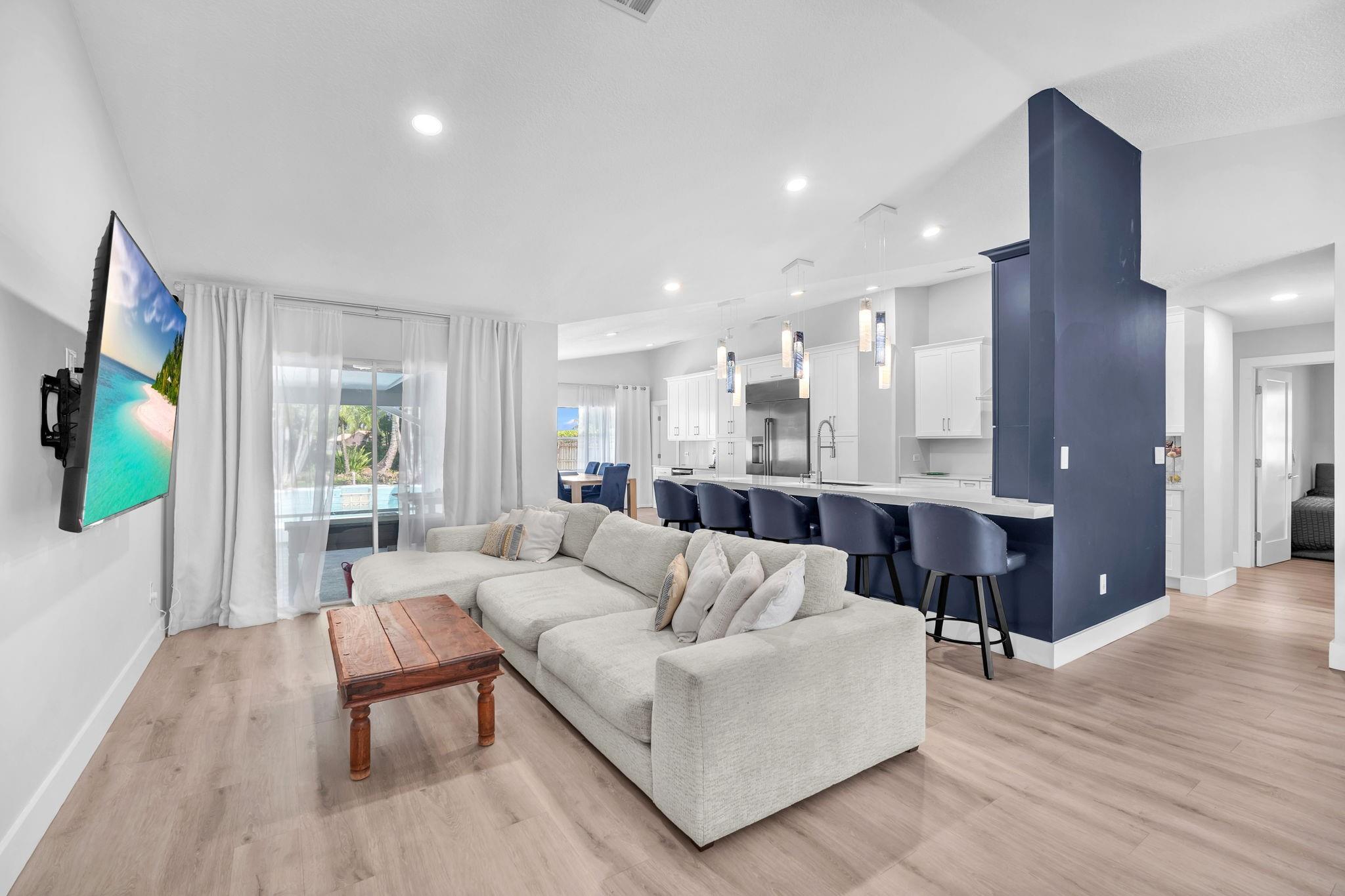 Welcome to this stunning fully renovated 4/3 home on a spacious .43-acre corner lot. Featuring 2 primary en-suites, pool, chef’s kitchen & 3 car garage! The chef’s dream kitchen boasts wood cabinetry, quartz countertops, GE Café appliances, abundant storage & under cabinet lights! All 3 bathrooms have been tastefully renovated, w/quartz countertops. Laminate flooring runs throughout except in bathrooms. Enjoy outdoor living w/fully fenced pie-shaped lot, pool, & screened, covered patio—perfect for entertaining. The 3-car garage offers A/C venting & epoxy floor, plus a circular driveway provides ample parking. Roof (2021), A/C (2021), tankless water heater (2020), hurricane panels, & generator hook-up. Not included in sale:3 pendant lights, entry fixture, window treatments & wine fridge