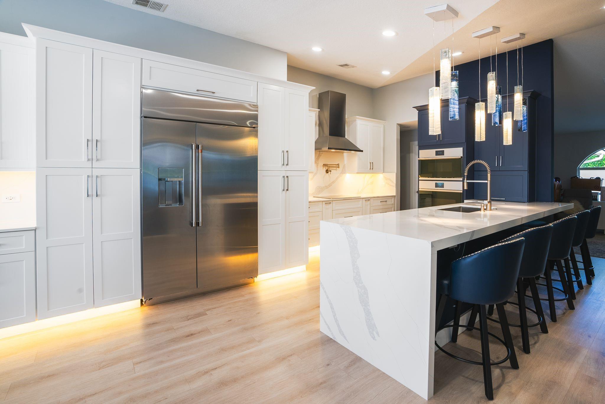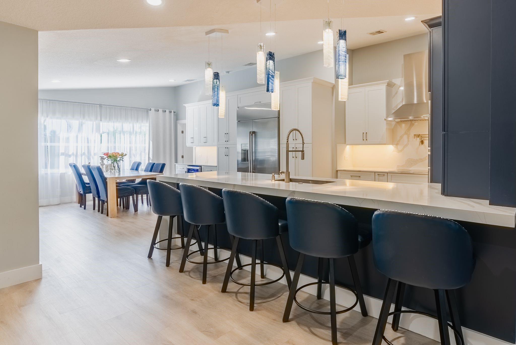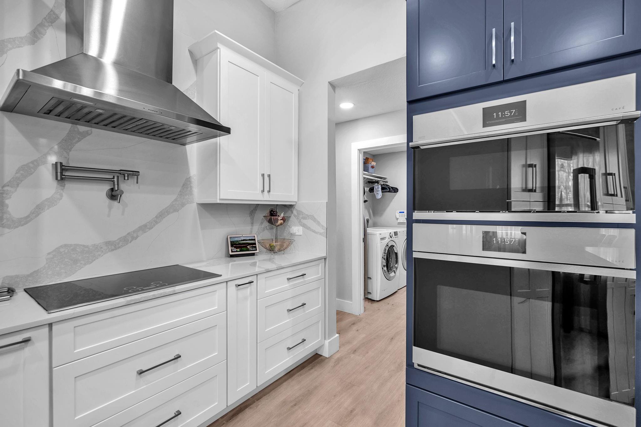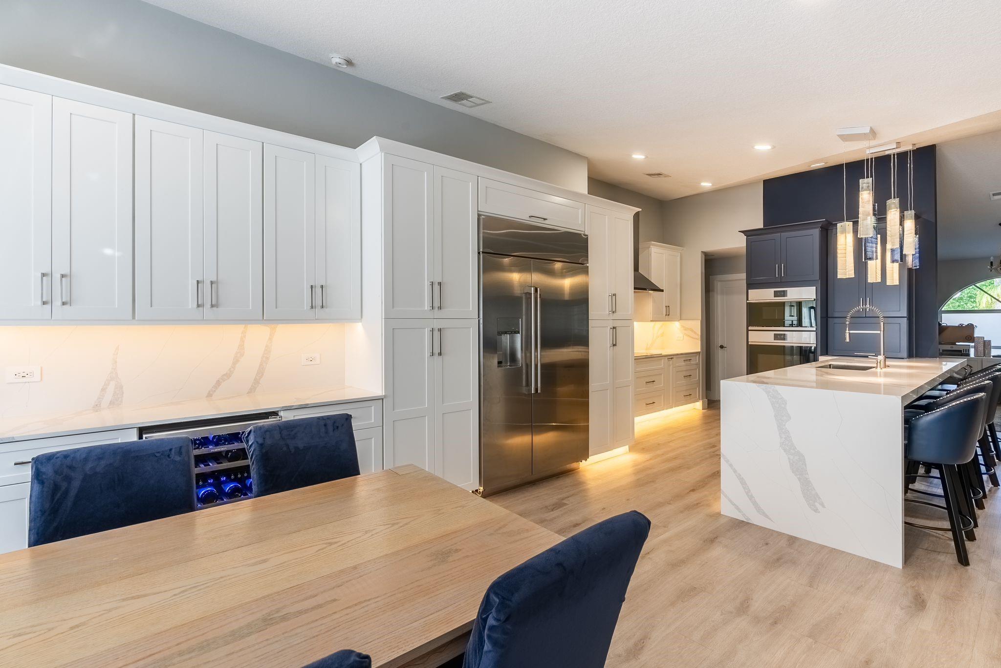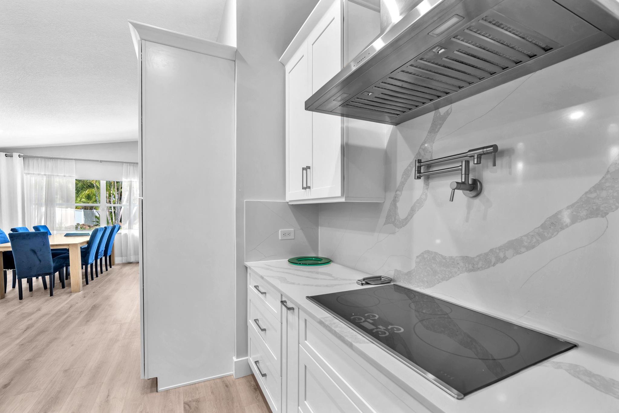 Welcome to this stunning fully renovated 4/3 home on a spacious .43-acre corner lot. Featuring 2 primary en-suites, pool, chef’s kitchen & 3 car garage! The chef’s dream kitchen boasts wood cabinetry, quartz countertops, GE Café appliances, abundant storage & under cabinet lights! All 3 bathrooms have been tastefully renovated, w/quartz countertops. Laminate flooring runs throughout except in bathrooms. Enjoy outdoor living w/fully fenced pie-shaped lot, pool, & screened, covered patio—perfect for entertaining. The 3-car garage offers A/C venting & epoxy floor, plus a circular driveway provides ample parking. Roof (2021), A/C (2021), tankless water heater (2020), hurricane panels, & generator hook-up. Not included in sale:3 pendant lights, entry fixture, window treatments & wine fridge
