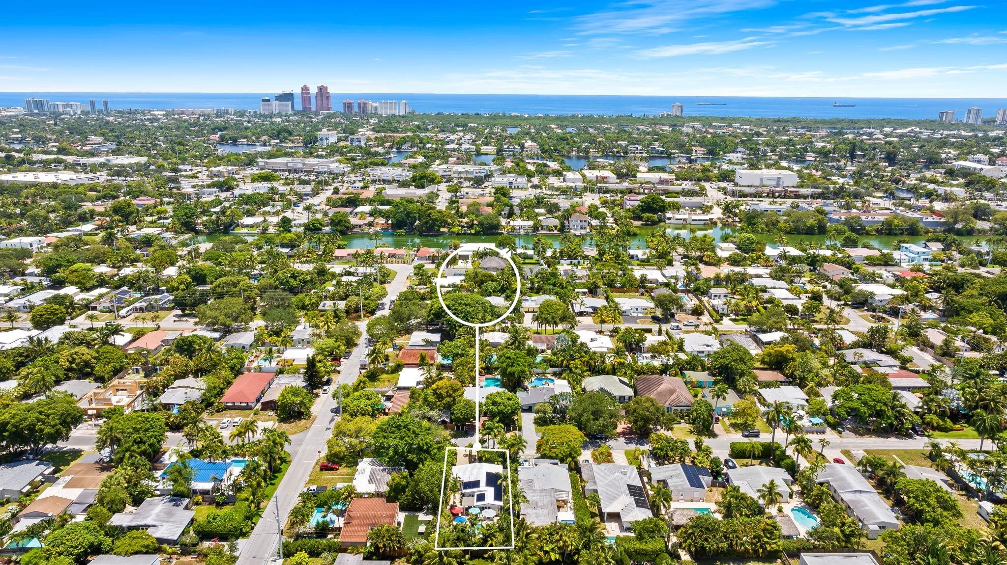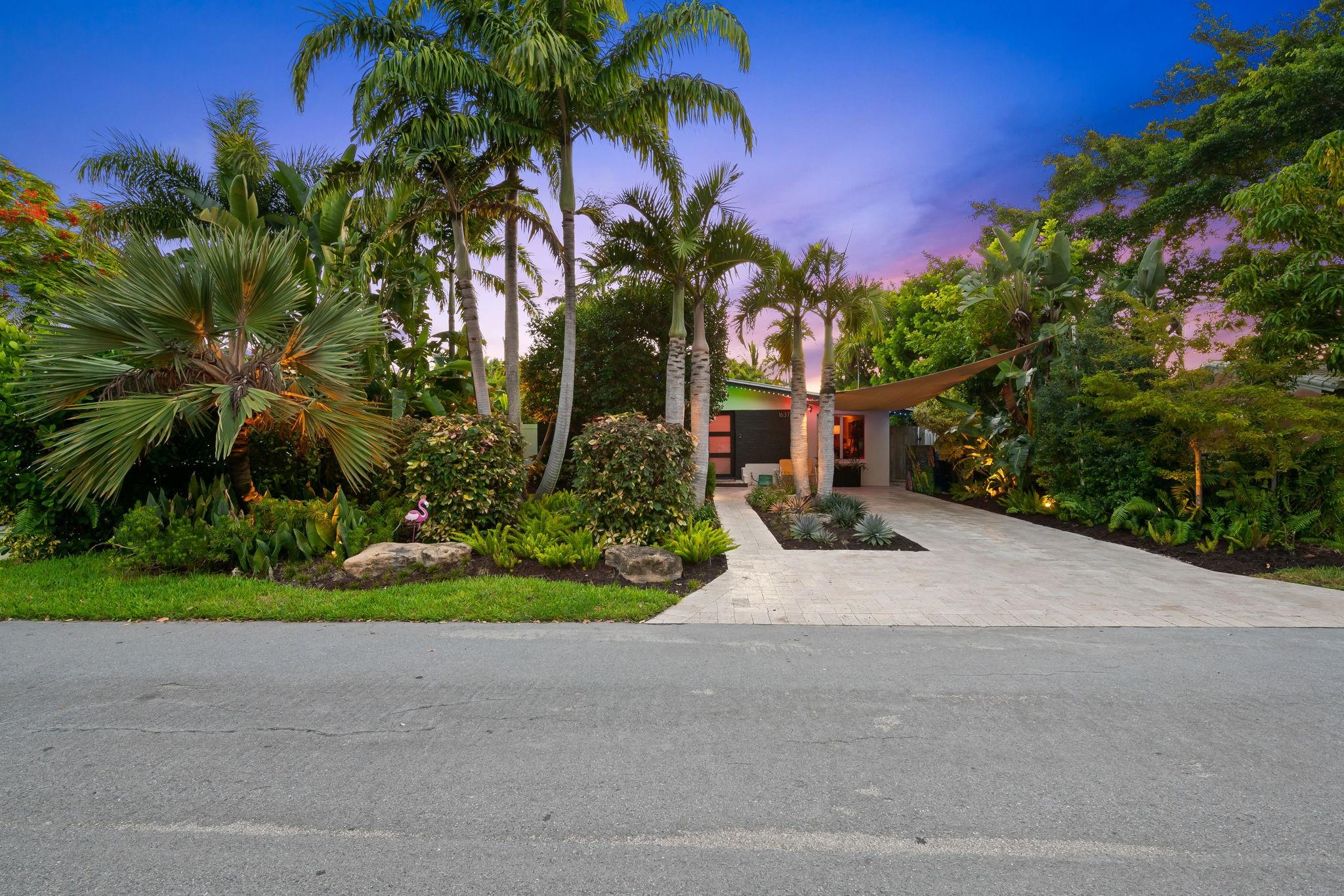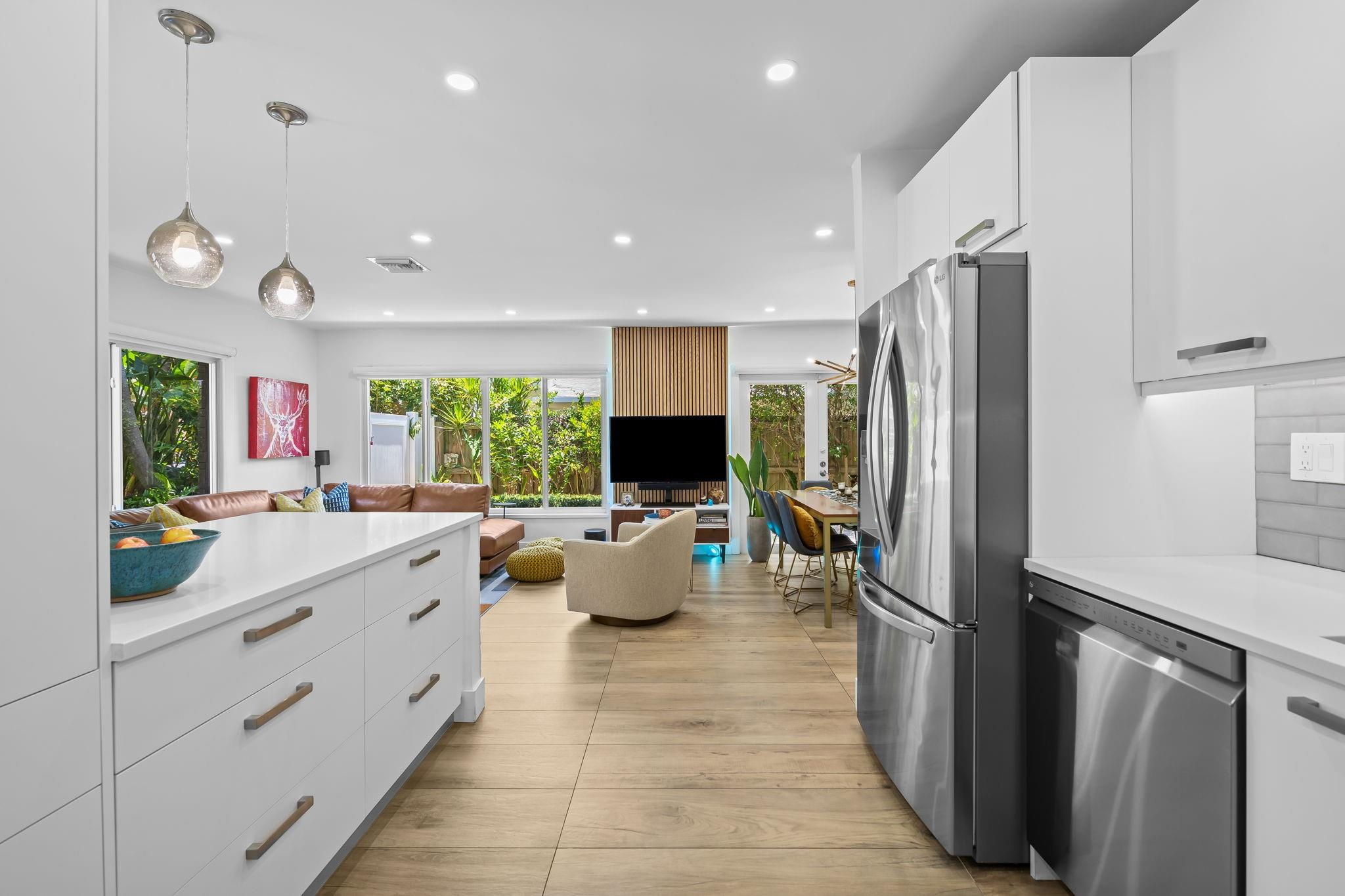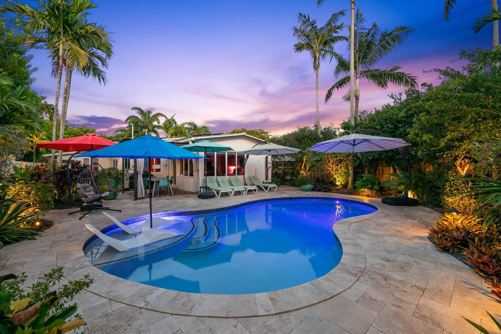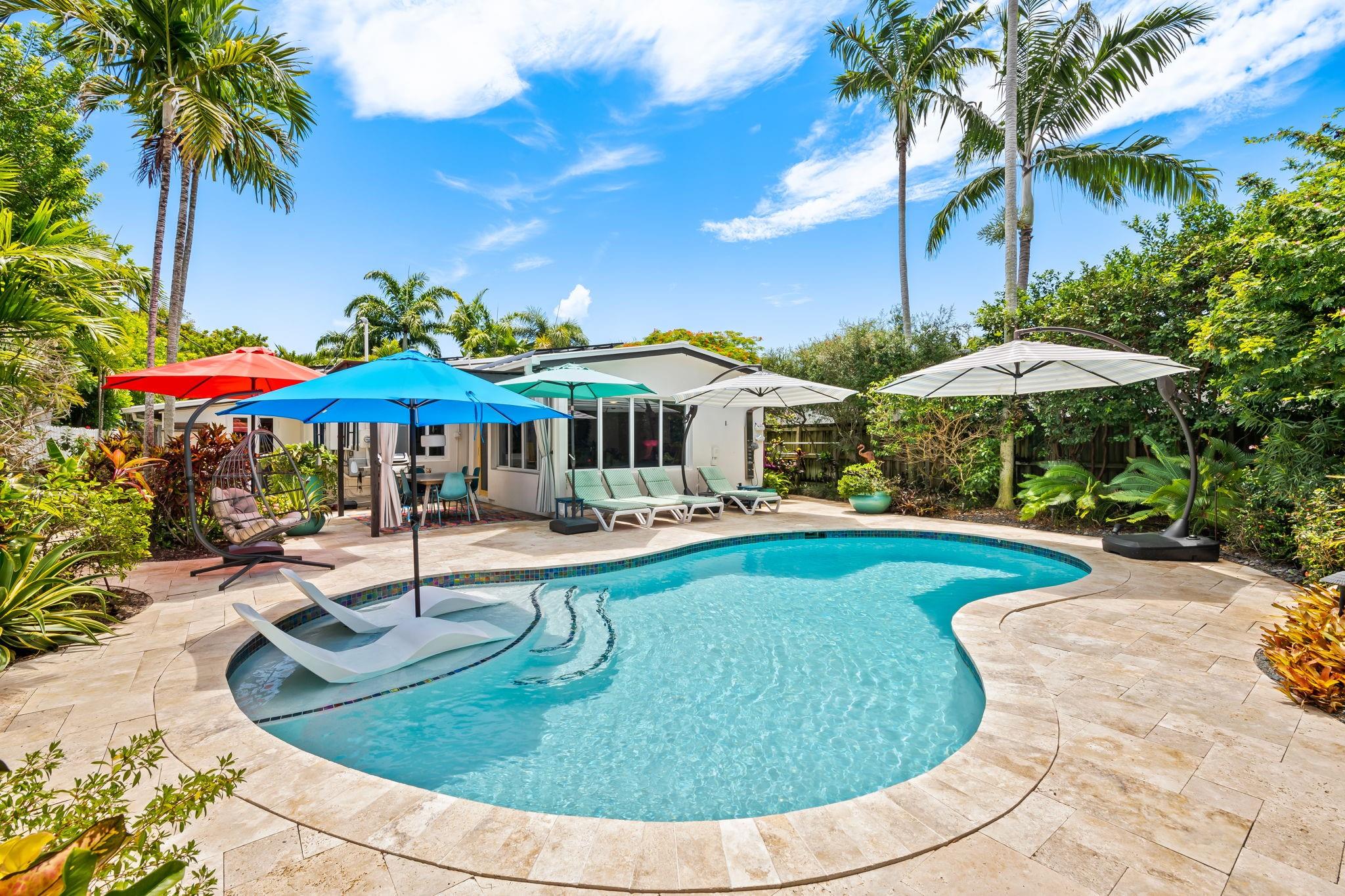Thoughtfully curated modern retreat in the heart of Fort Lauderdale blends high design with relaxed S. Florida living. Inside, sleek wood-look tile floors, crisp white walls, and impact-rated windows flood the home with natural light. The open-concept kitchen is perfect for entertaining. The primary suite offers a walk-in closet, tranquil pool views, and direct pool access. Its spa-inspired ensuite includes a soaking tub, rain shower, and dual vanities. Outside, the backyard is a tropical paradise with a heated saltwater pool, metal-roofed pergola, and vibrant landscaping. The home is equipped with a premium metal roof, solar panels, and three A/C zones for efficient climate control. Located near Wilton Manors, downtown Fort Lauderdale, and the beach, this property blends style and comfort