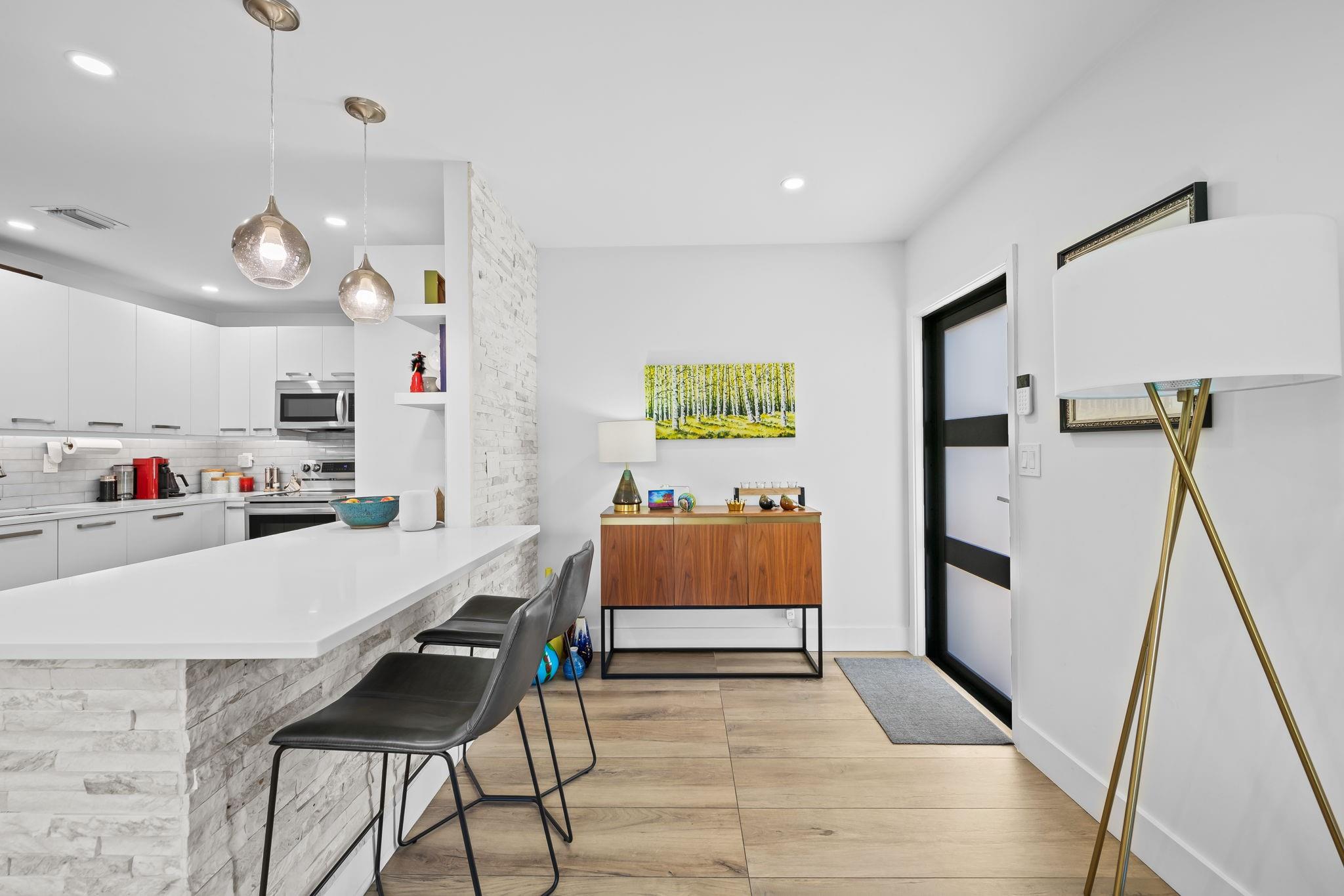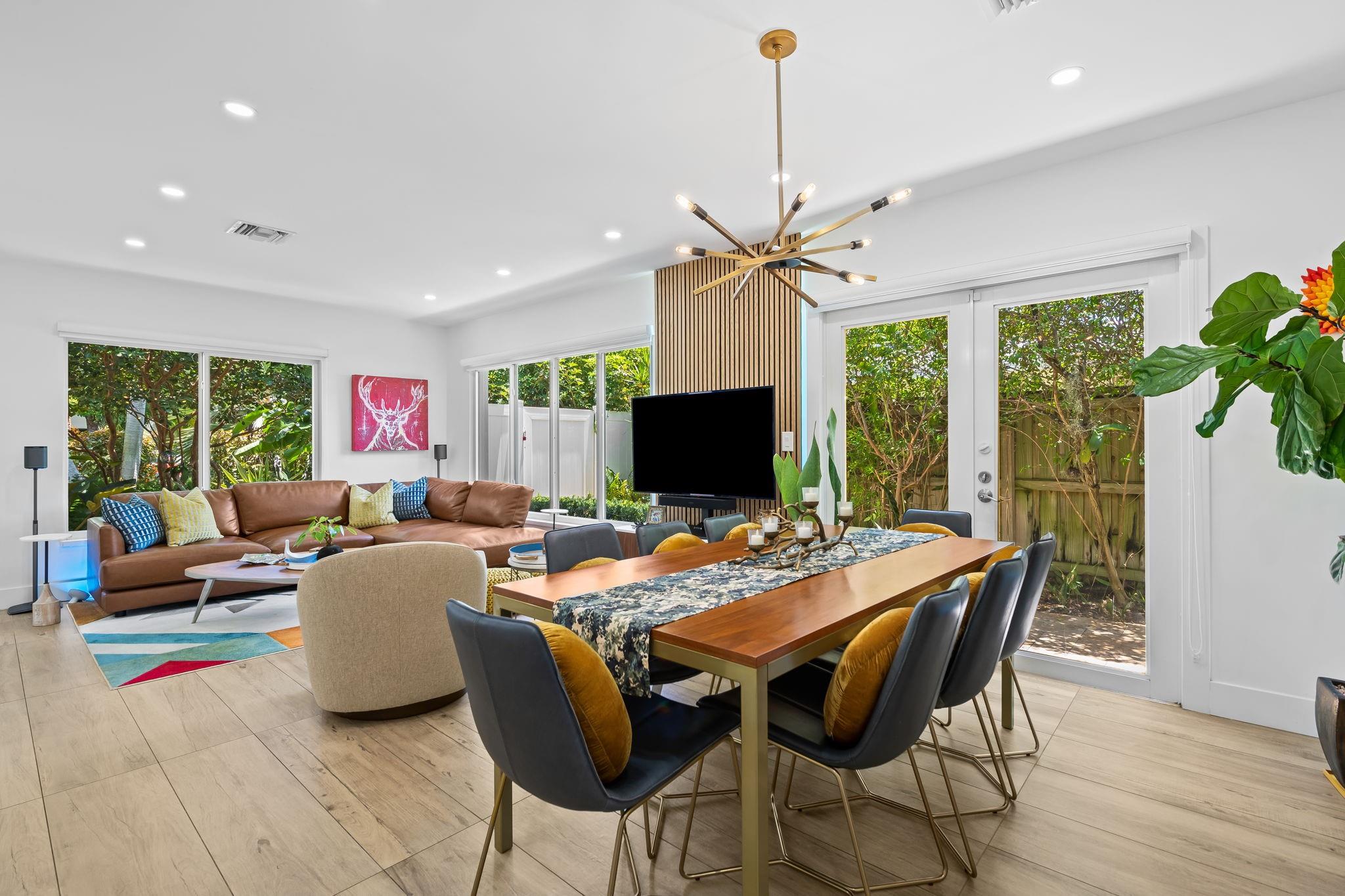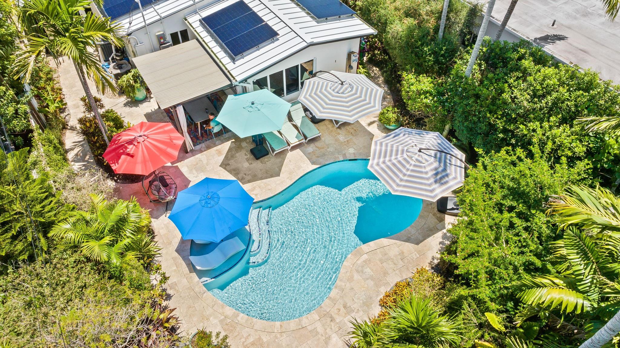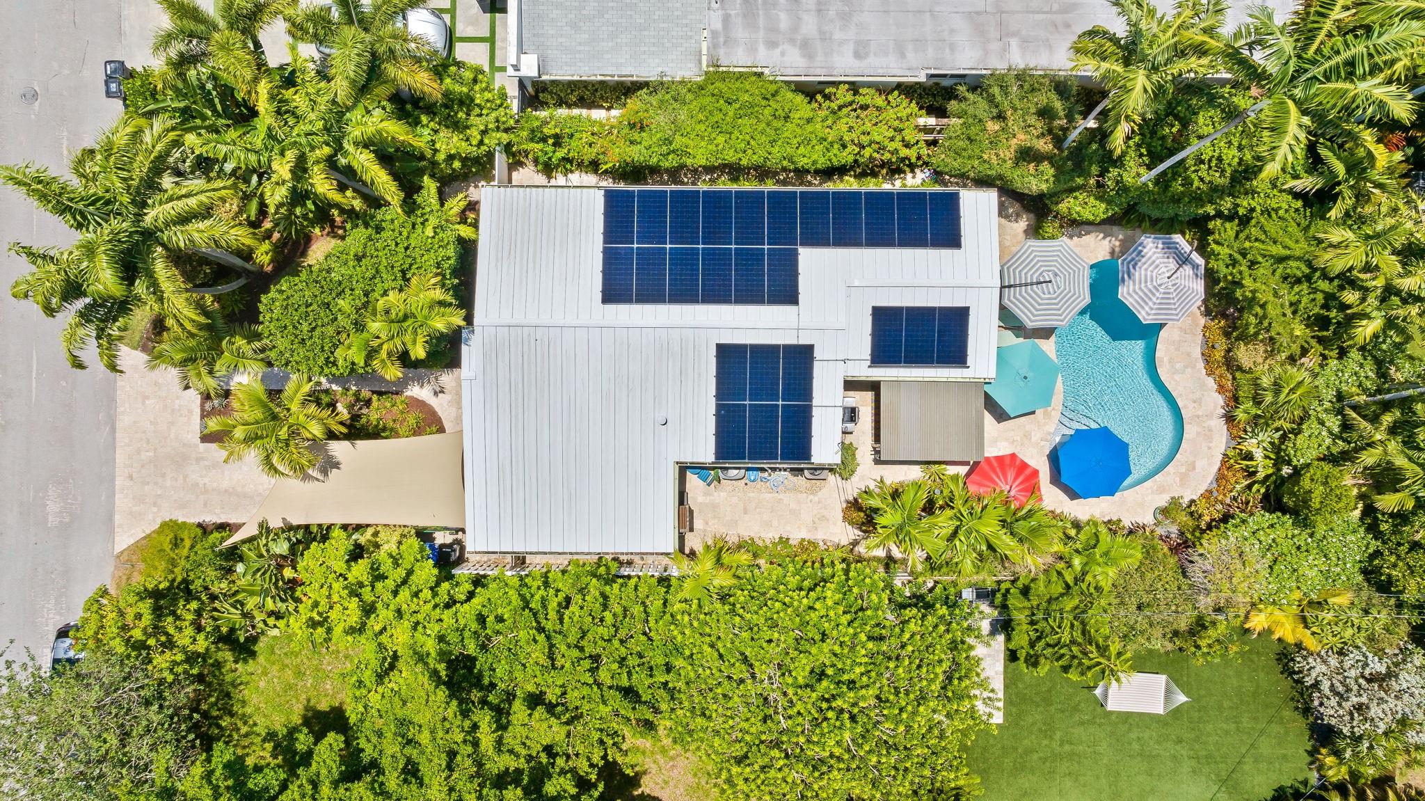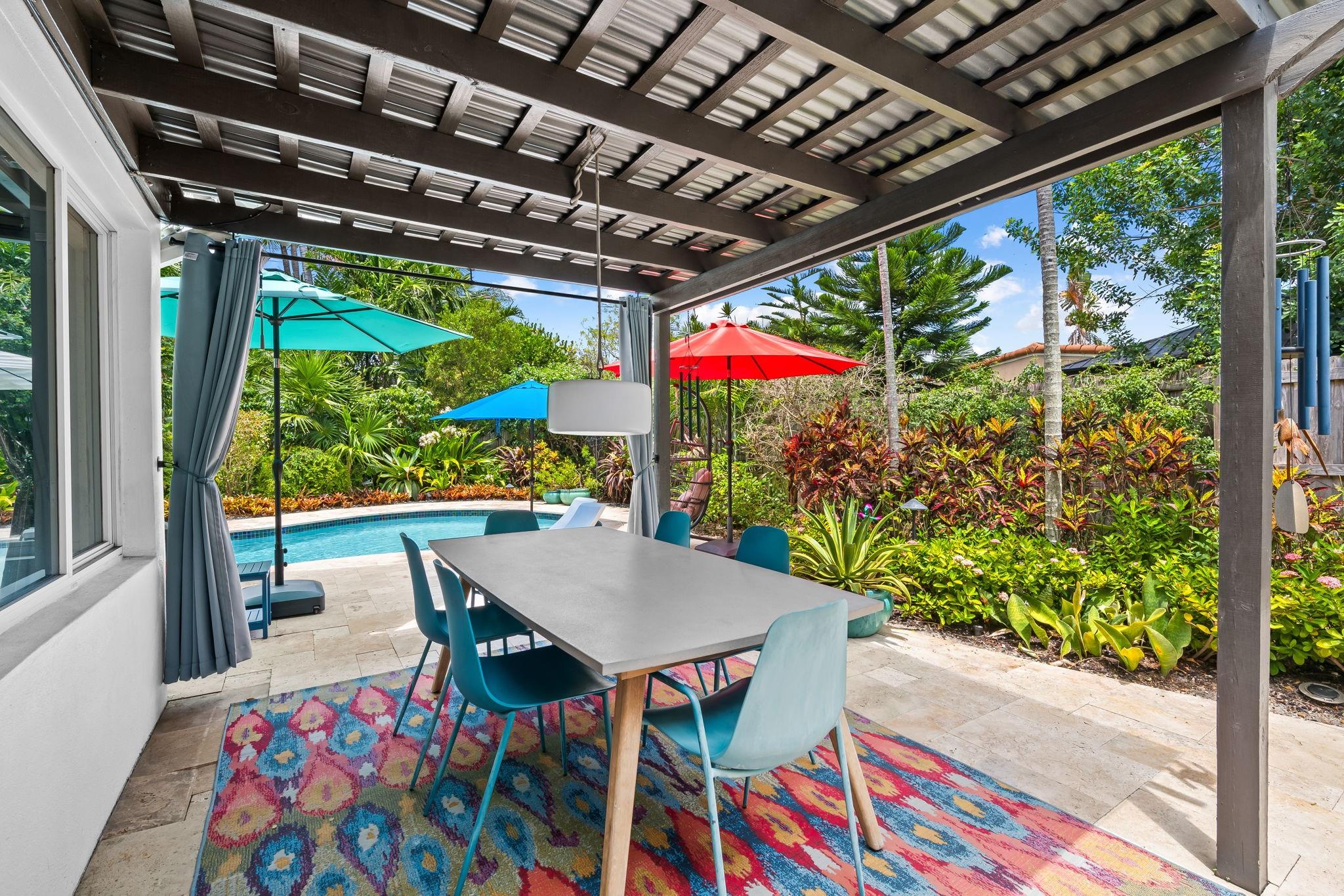 Thoughtfully curated modern retreat in the heart of Fort Lauderdale blends high design with relaxed S. Florida living. Inside, sleek wood-look tile floors, crisp white walls, and impact-rated windows flood the home with natural light. The open-concept kitchen is perfect for entertaining. The primary suite offers a walk-in closet, tranquil pool views, and direct pool access. Its spa-inspired ensuite includes a soaking tub, rain shower, and dual vanities. Outside, the backyard is a tropical paradise with a heated saltwater pool, metal-roofed pergola, and vibrant landscaping. The home is equipped with a premium metal roof, solar panels, and three A/C zones for efficient climate control. Located near Wilton Manors, downtown Fort Lauderdale, and the beach, this property blends style and comfort