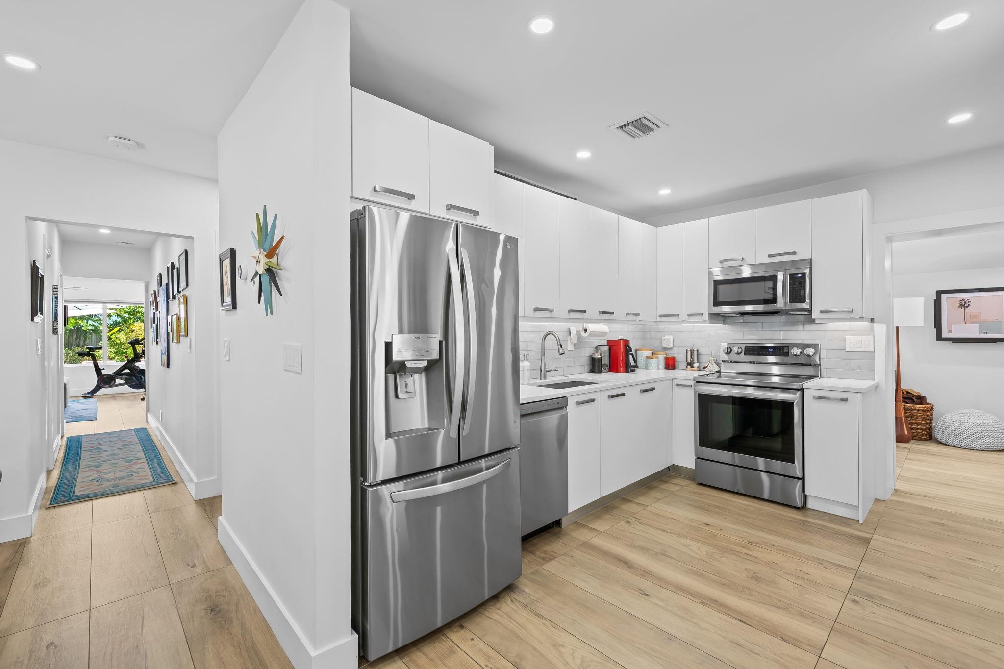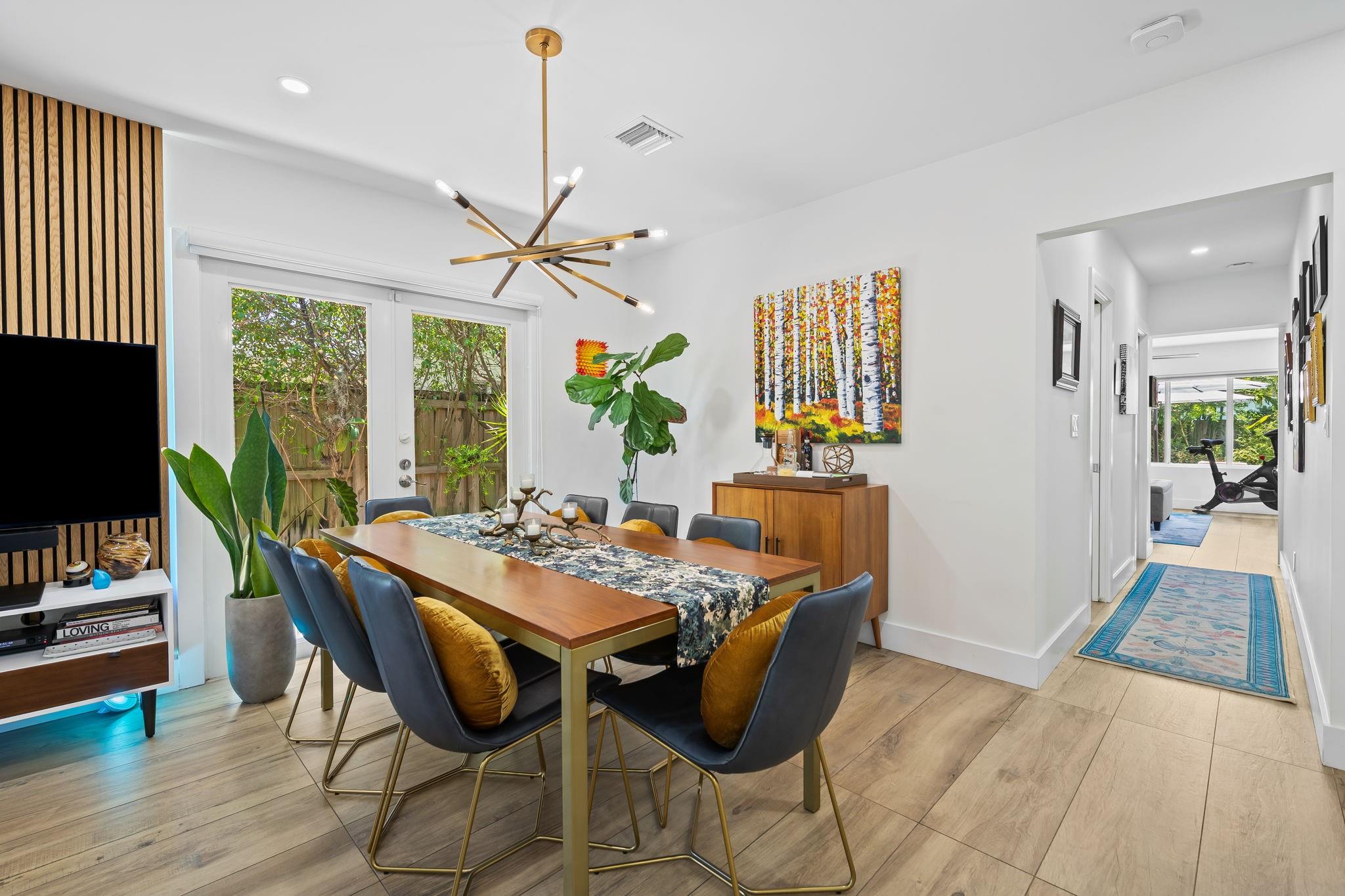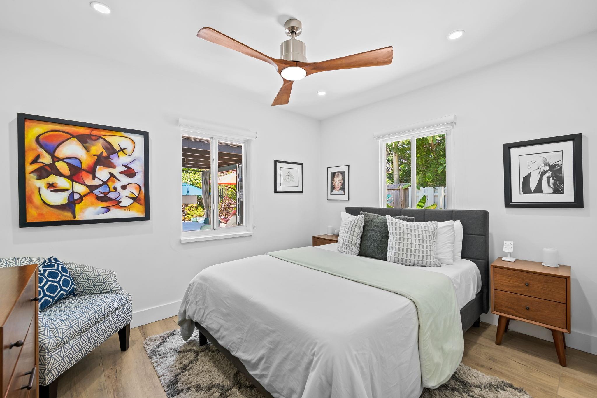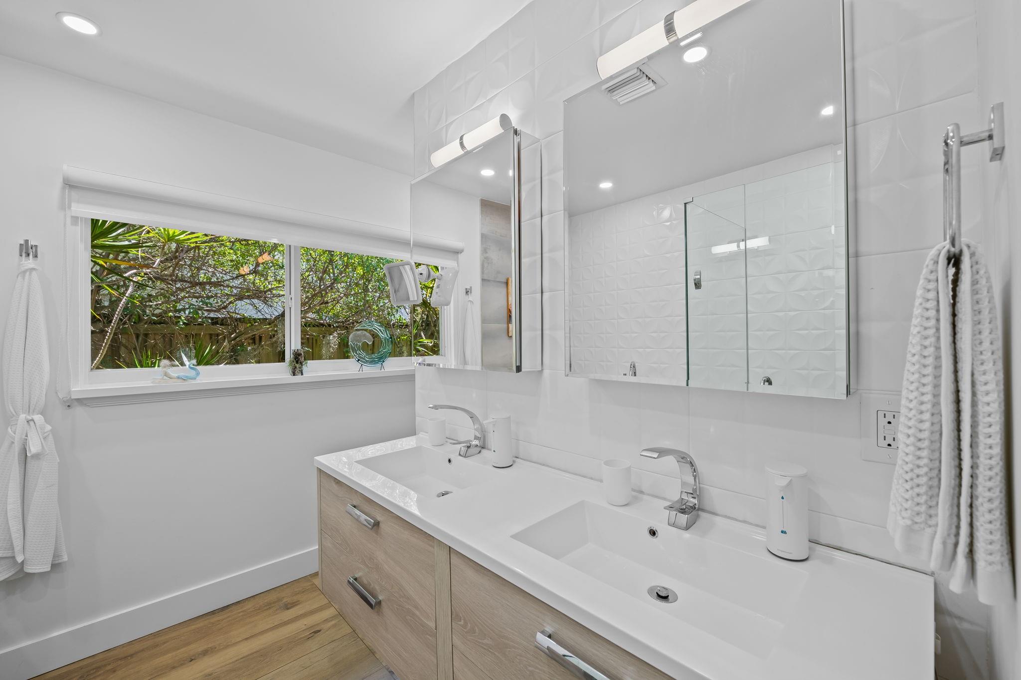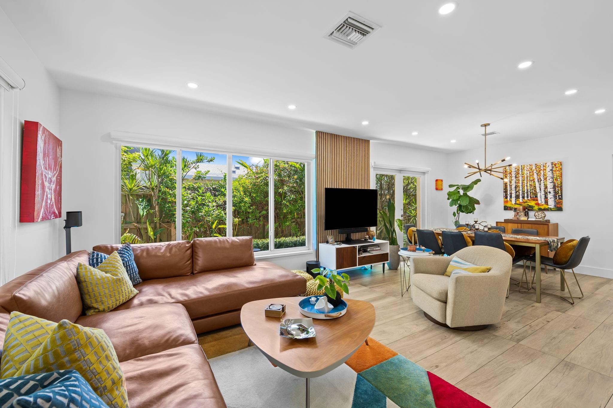 Thoughtfully curated modern retreat in the heart of Fort Lauderdale blends high design with relaxed S. Florida living. Inside, sleek wood-look tile floors, crisp white walls, and impact-rated windows flood the home with natural light. The open-concept kitchen is perfect for entertaining. The primary suite offers a walk-in closet, tranquil pool views, and direct pool access. Its spa-inspired ensuite includes a soaking tub, rain shower, and dual vanities. Outside, the backyard is a tropical paradise with a heated saltwater pool, metal-roofed pergola, and vibrant landscaping. The home is equipped with a premium metal roof, solar panels, and three A/C zones for efficient climate control. Located near Wilton Manors, downtown Fort Lauderdale, and the beach, this property blends style and comfort