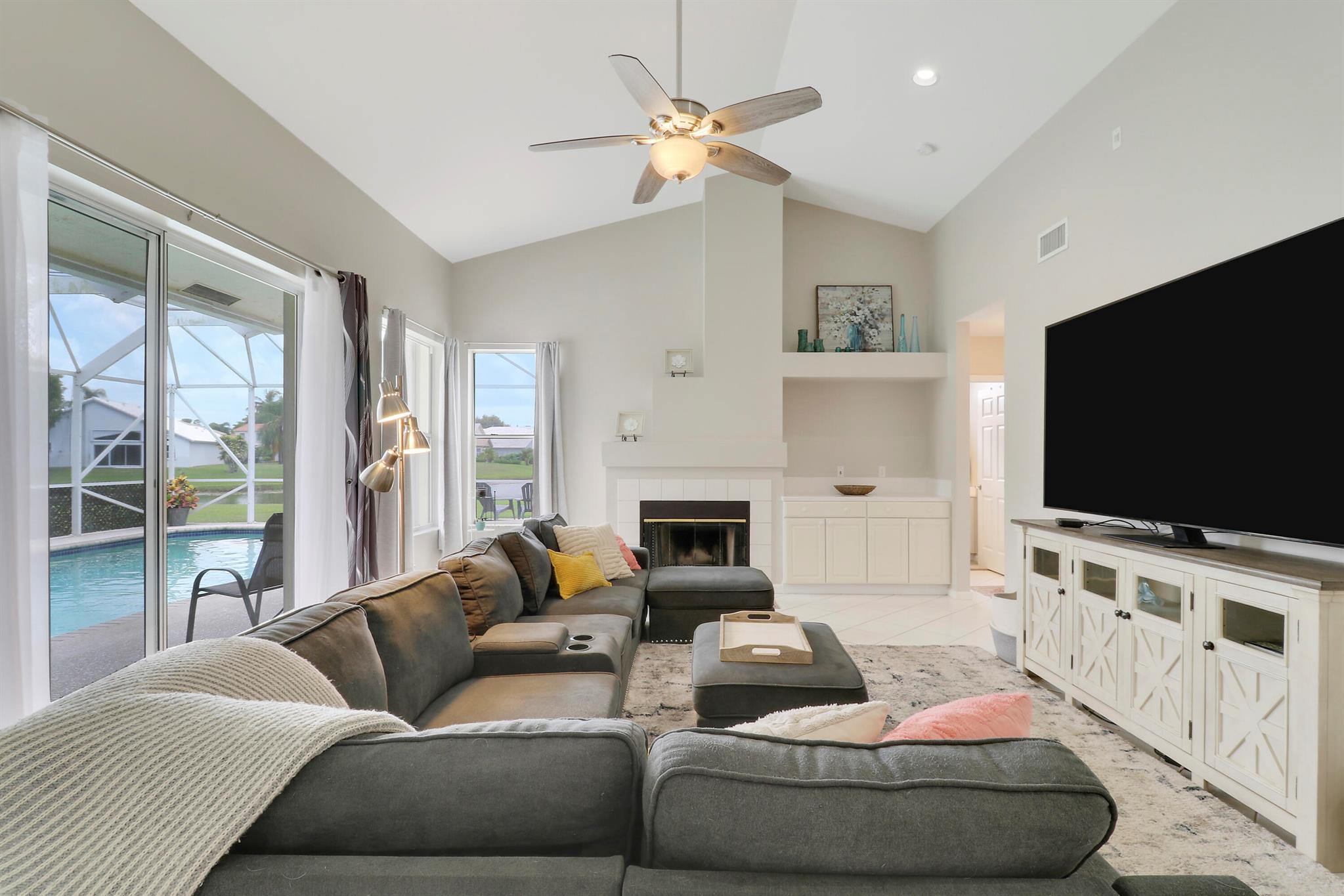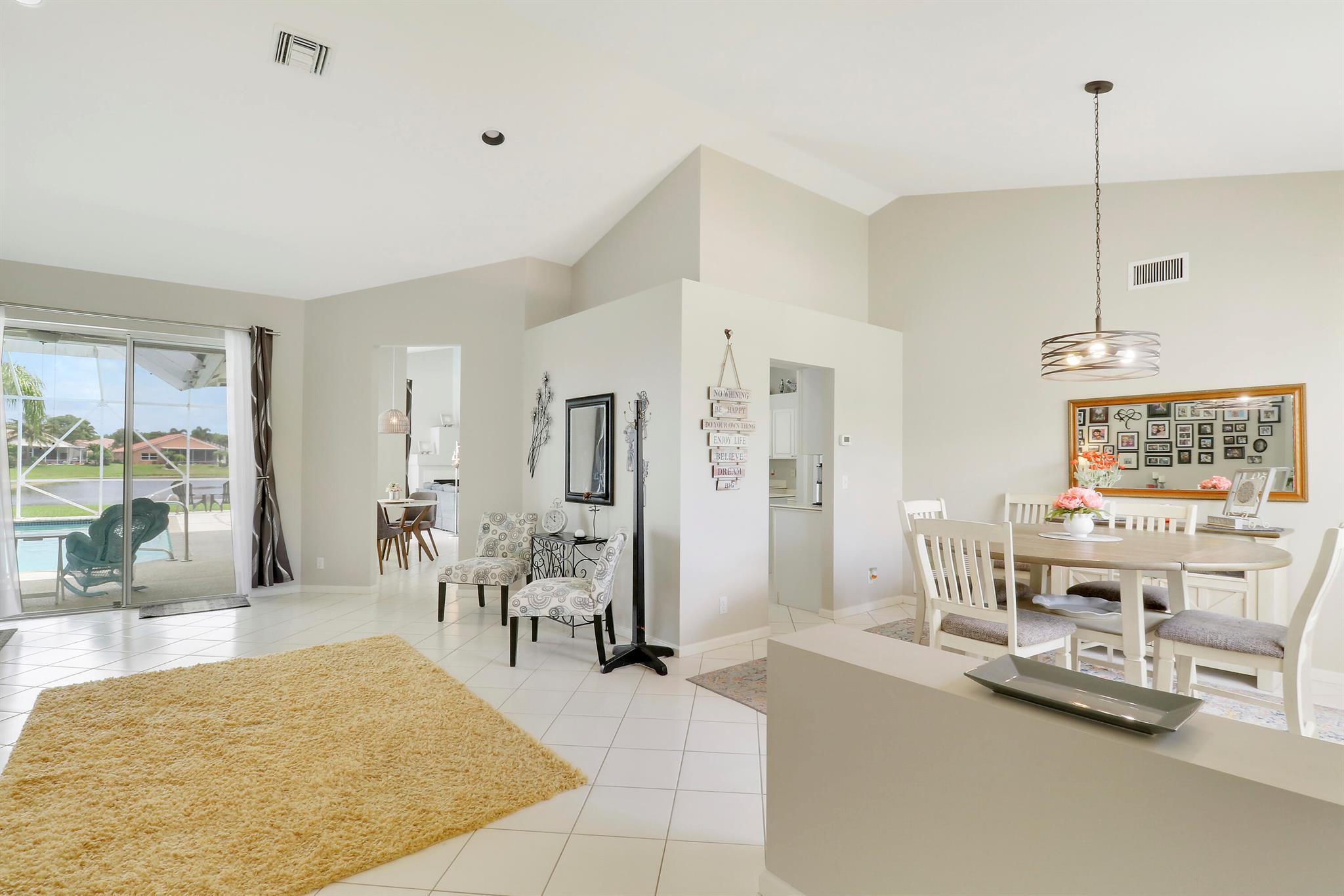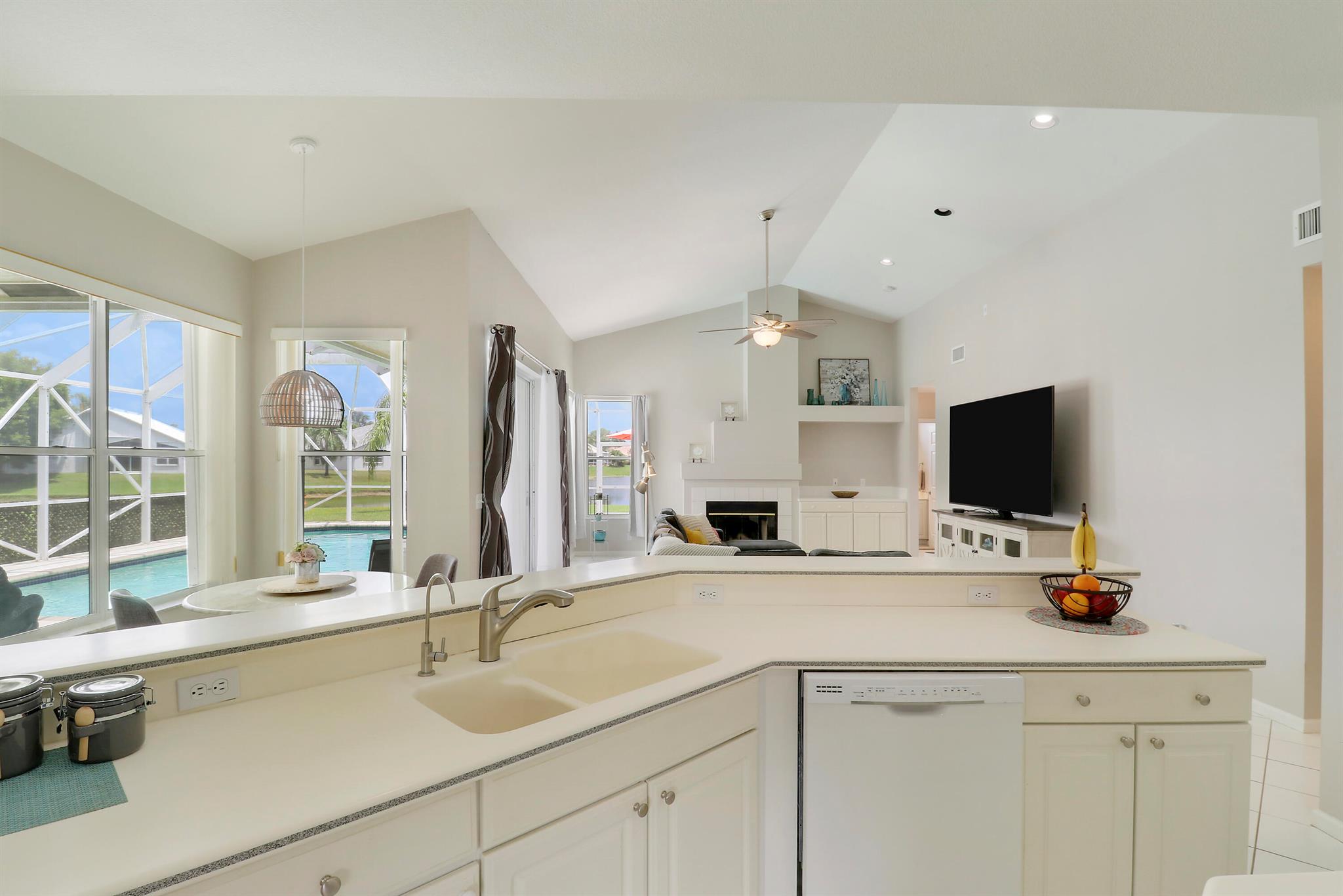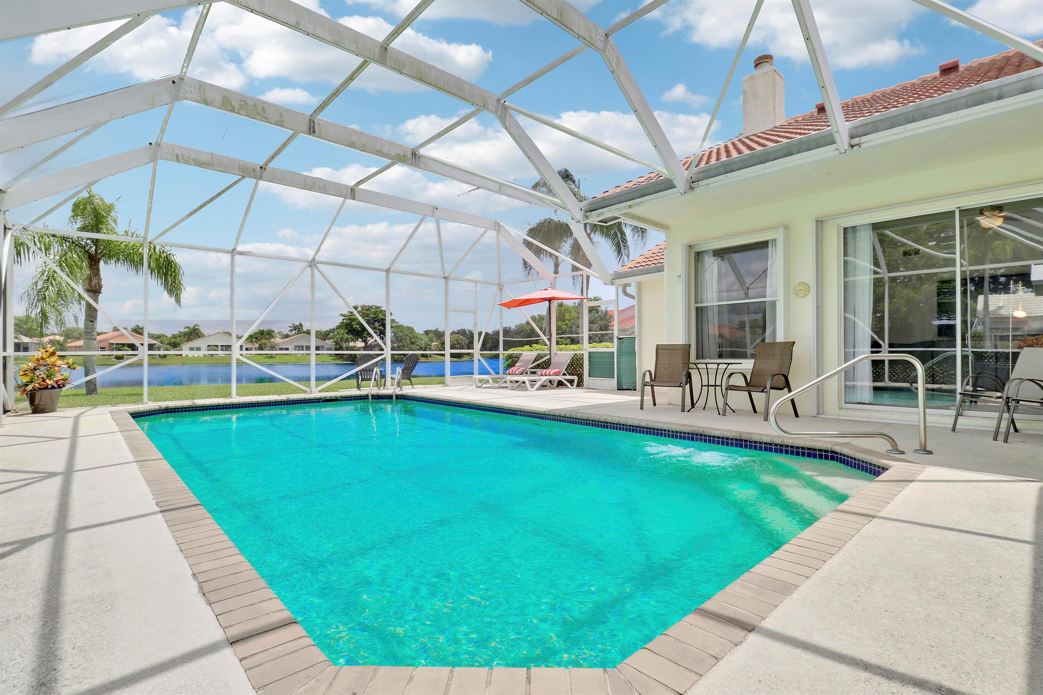 RARELY ON THE MARKET 4 Bdrm. 3 Full baths, 3 car garage pool home with wide lake view. This home features vaulted ceilings, accordion shutters throughout and whole house generator. ADDITIONAL UPGRADES INCLUDE: NEW garage door opener in 2024. The ROOF, POOL heater/chiller and lights are 2023. More upgrades completed in 2022, Repainted interior walls/ceiling, California Closets,Walk-in closet/barn door in primary, New interior doors/hardware, New doorbell/front door lock, New light fixtures (removed fluorescent and replaced with canned lighting in kitchen), Ceiling fans, Cabinetry in laundry room, Outdoor fan, Outdoor porch/garage lights, New sink fixtures in kitchen and bathrooms. This home is waiting for its new owner to make it their own.