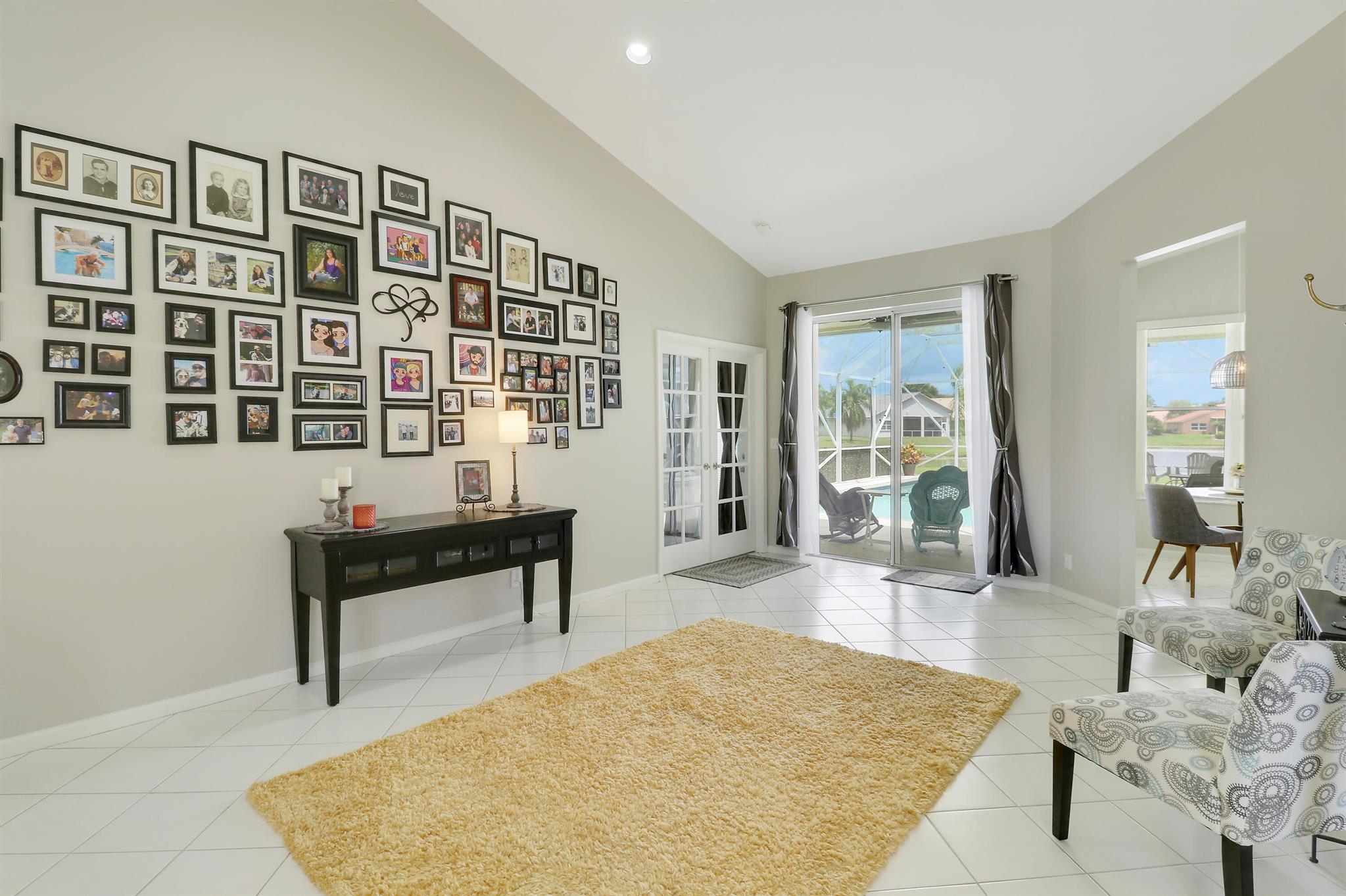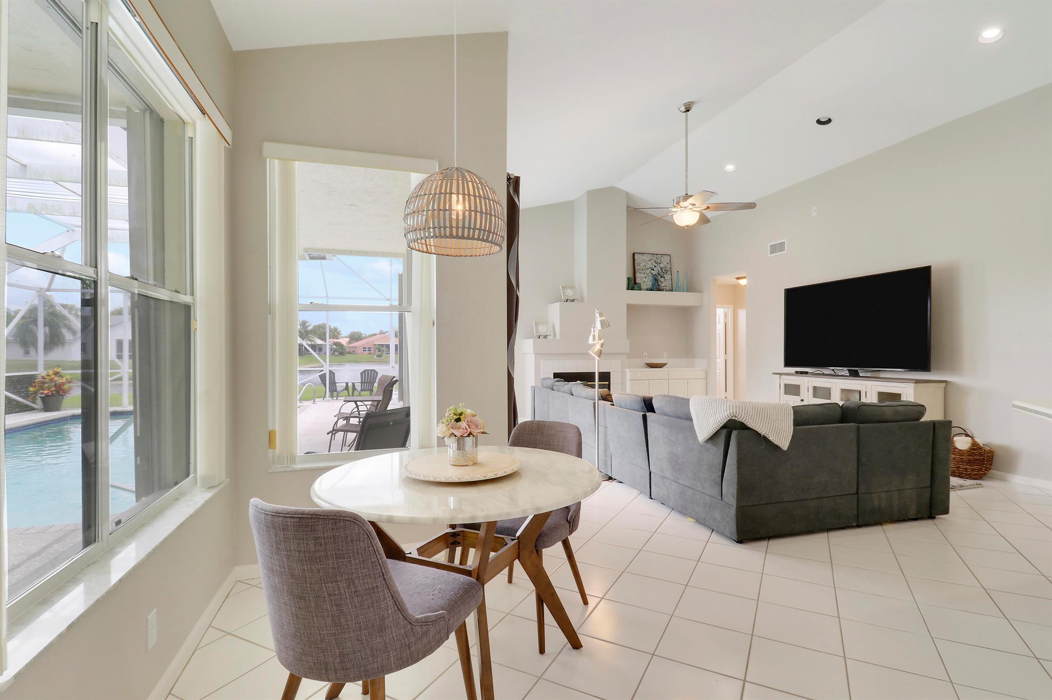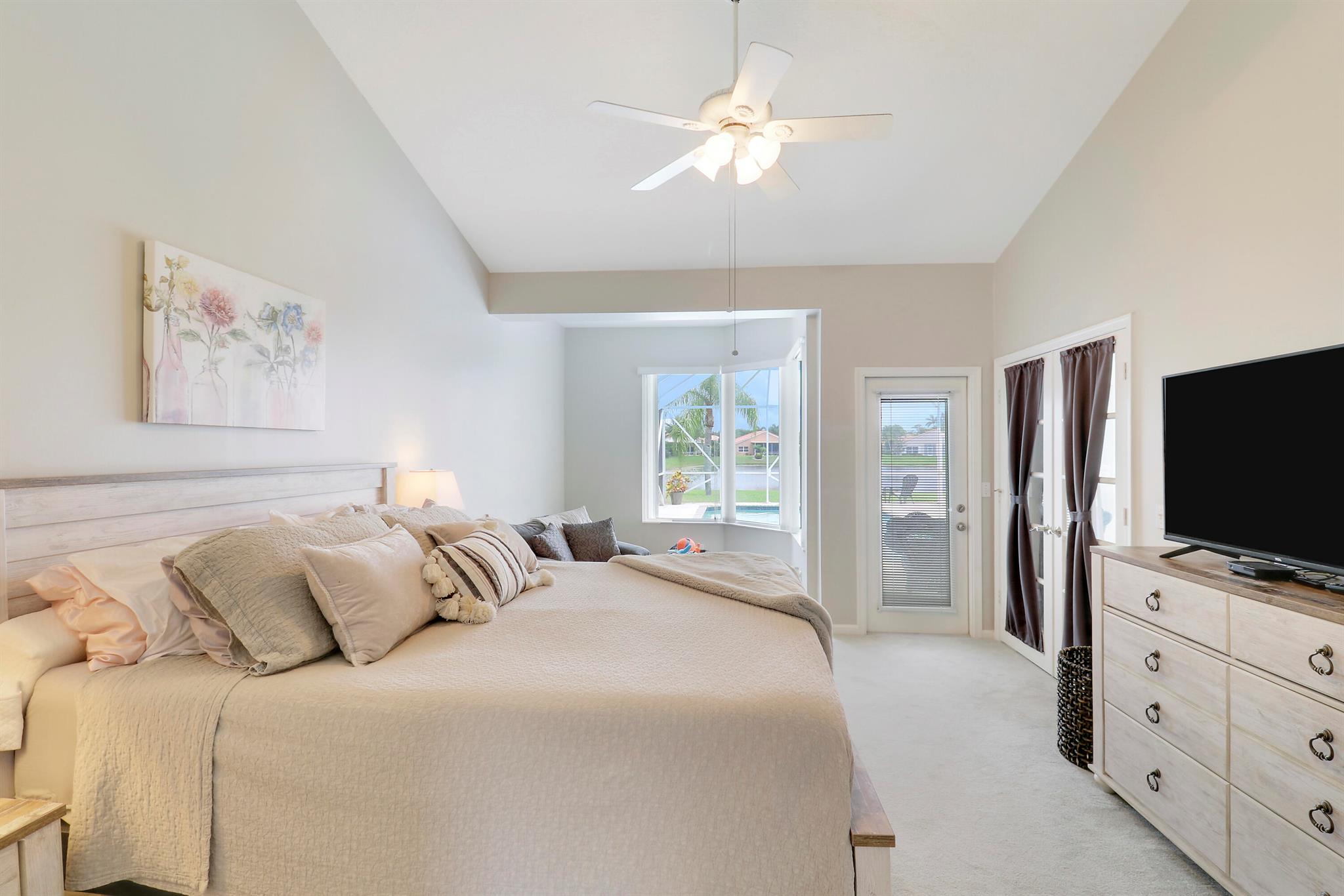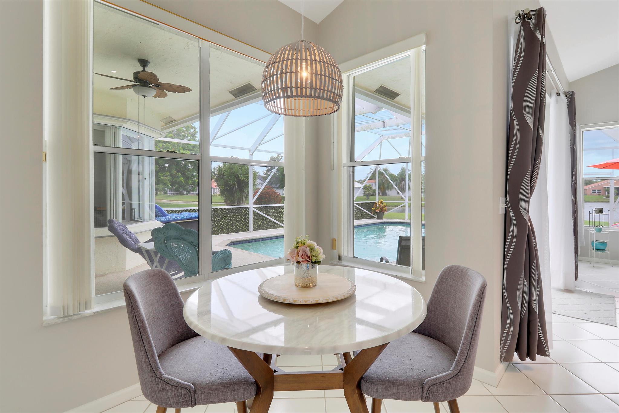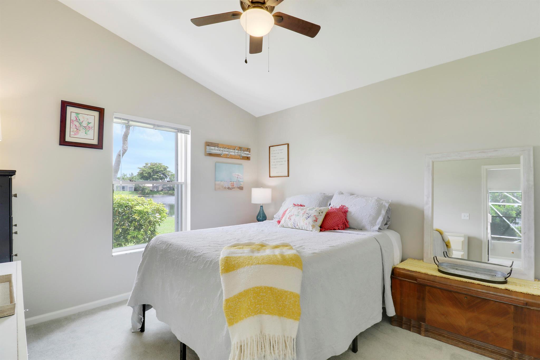RARELY ON THE MARKET 4 Bdrm. 3 Full baths, 3 car garage pool home with wide lake view. This home features vaulted ceilings, accordion shutters throughout and whole house generator. ADDITIONAL UPGRADES INCLUDE: NEW garage door opener in 2024. The ROOF, POOL heater/chiller and lights are 2023. More upgrades completed in 2022, Repainted interior walls/ceiling, California Closets,Walk-in closet/barn door in primary, New interior doors/hardware, New doorbell/front door lock, New light fixtures (removed fluorescent and replaced with canned lighting in kitchen), Ceiling fans, Cabinetry in laundry room, Outdoor fan, Outdoor porch/garage lights, New sink fixtures in kitchen and bathrooms. This home is waiting for its new owner to make it their own.