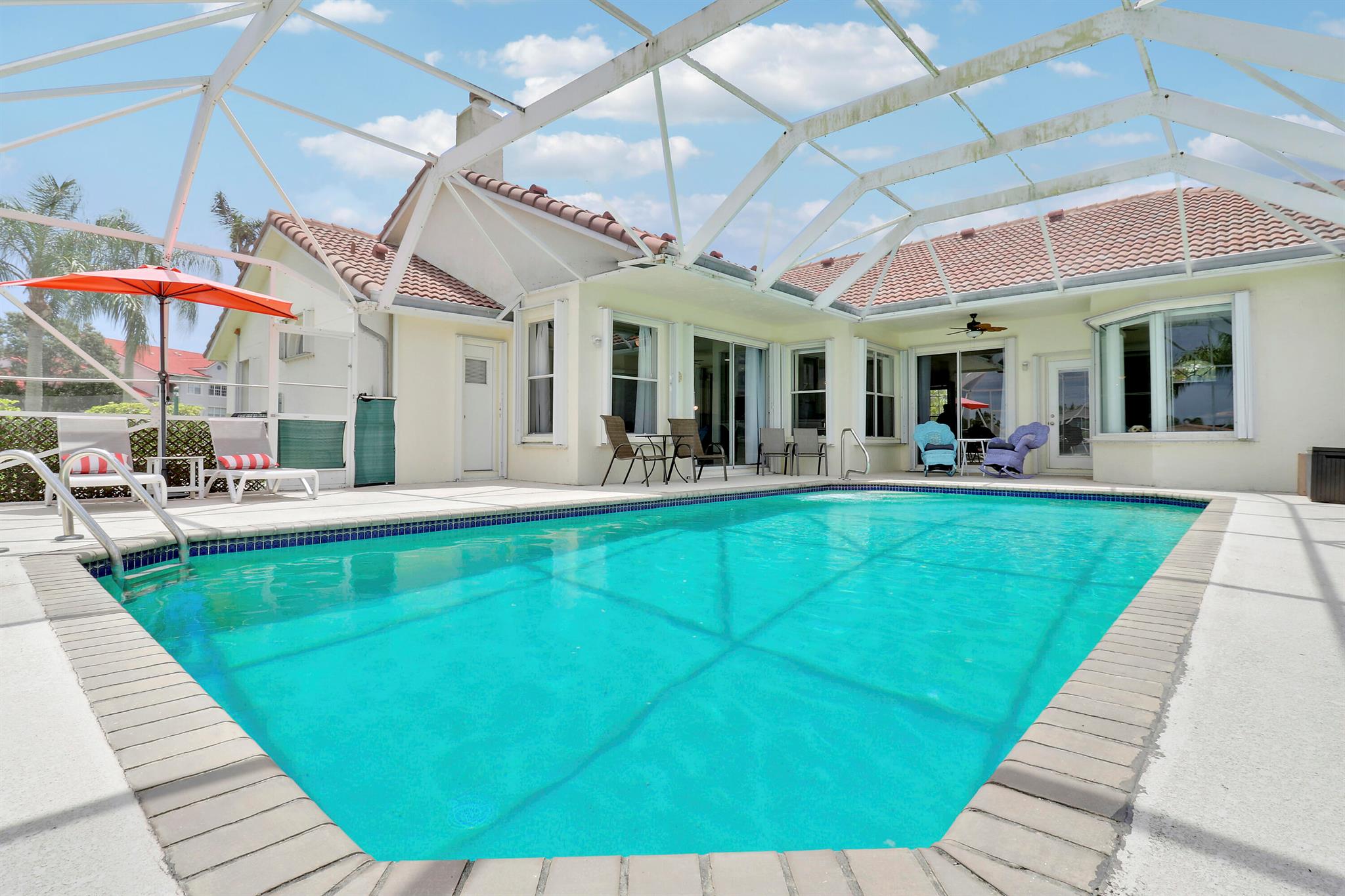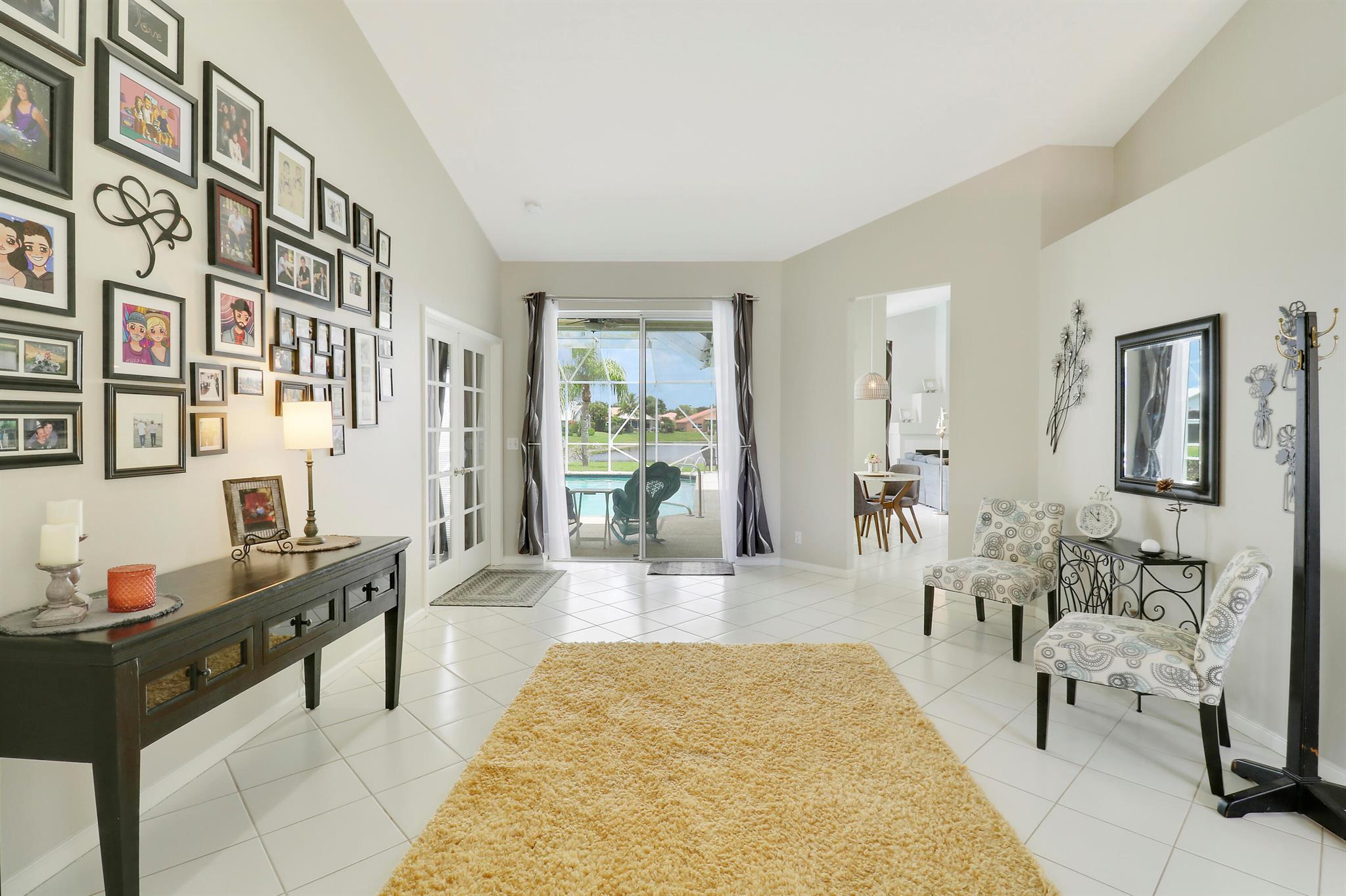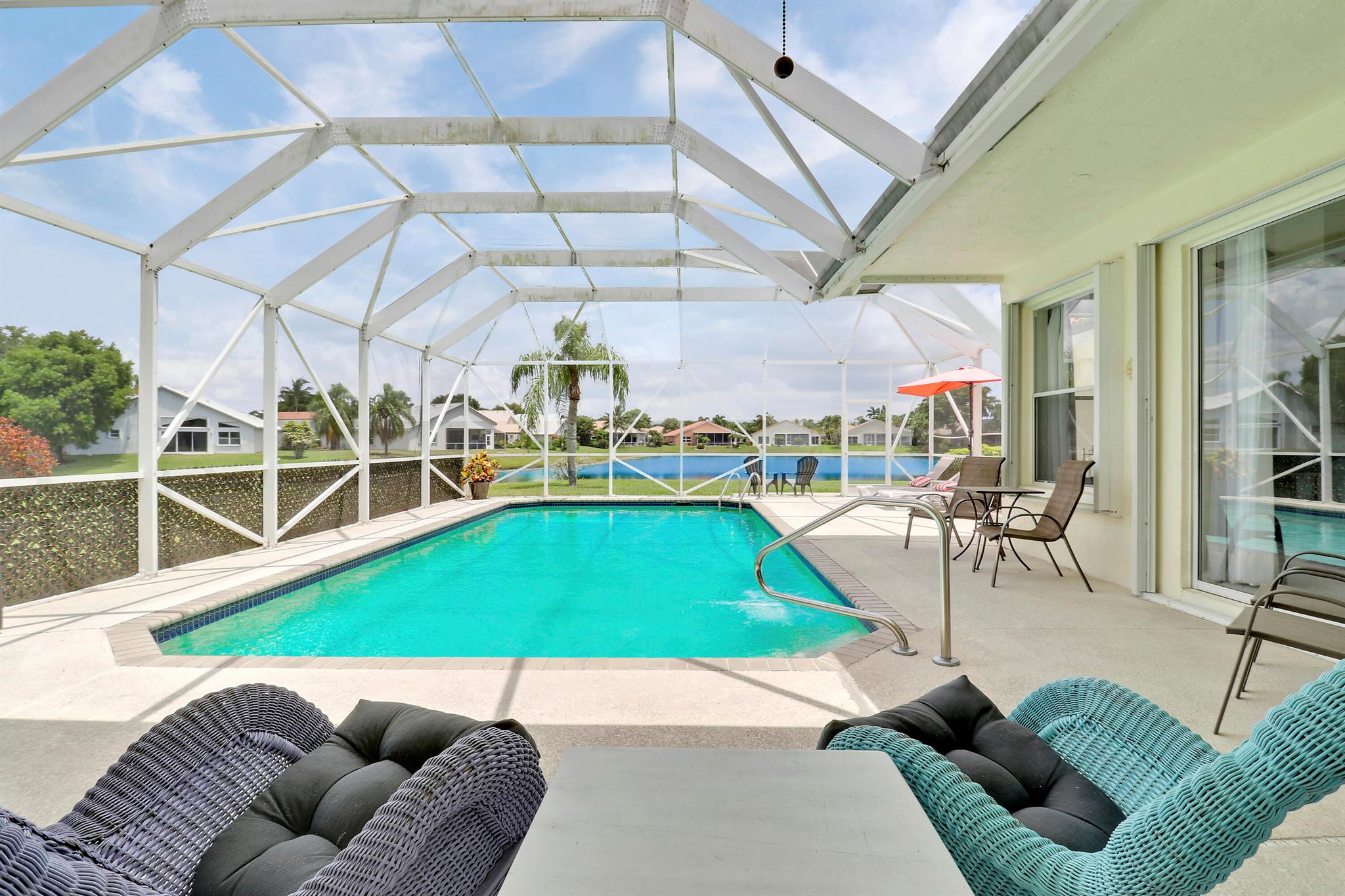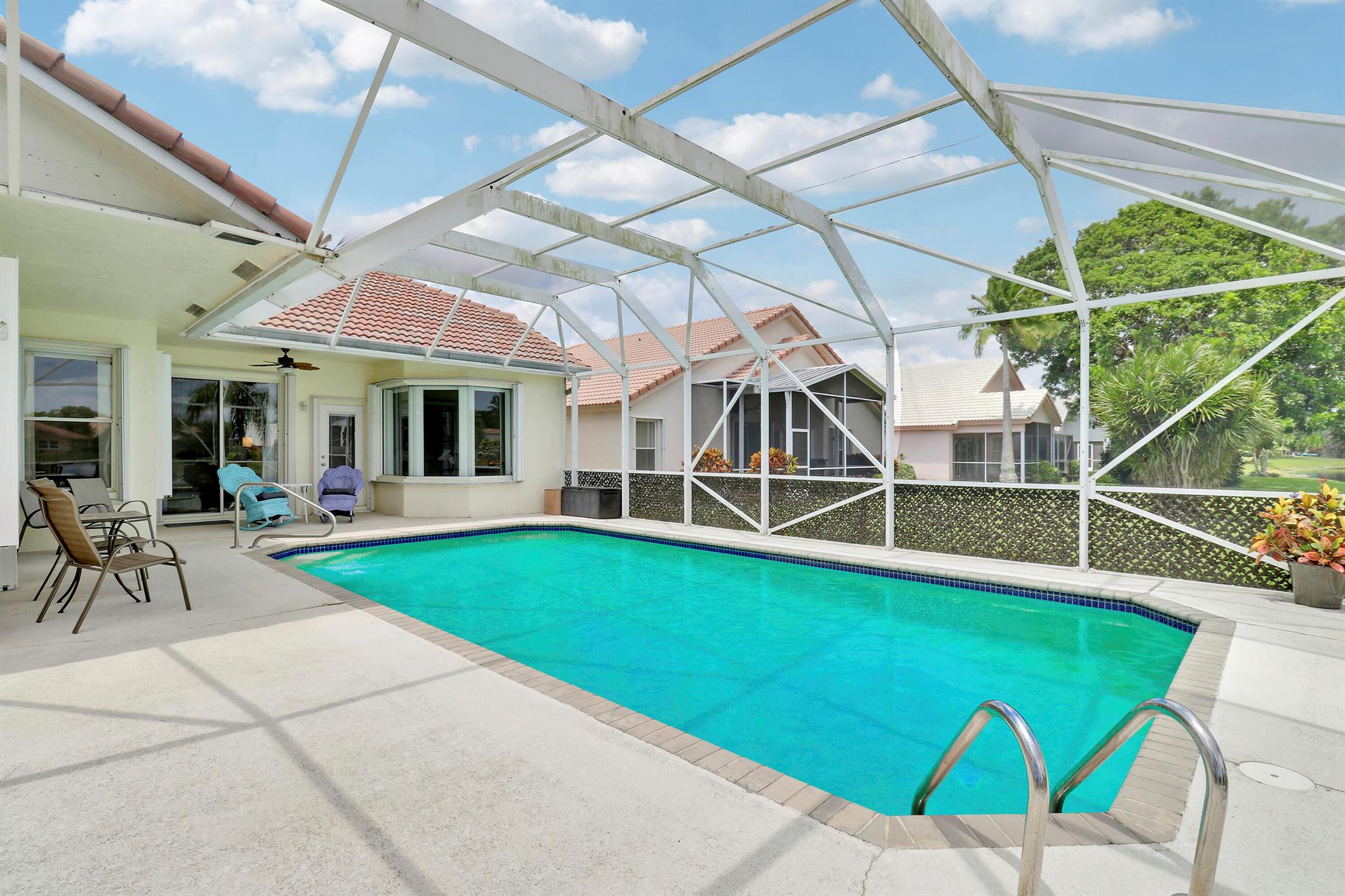 RARELY ON THE MARKET 4 Bdrm. 3 Full baths, 3 car garage pool home with wide lake view. This home features vaulted ceilings, accordion shutters throughout and whole house generator. ADDITIONAL UPGRADES INCLUDE: NEW garage door opener in 2024. The ROOF, POOL heater/chiller and lights are 2023. More upgrades completed in 2022, Repainted interior walls/ceiling, California Closets,Walk-in closet/barn door in primary, New interior doors/hardware, New doorbell/front door lock, New light fixtures (removed fluorescent and replaced with canned lighting in kitchen), Ceiling fans, Cabinetry in laundry room, Outdoor fan, Outdoor porch/garage lights, New sink fixtures in kitchen and bathrooms. This home is waiting for its new owner to make it their own.