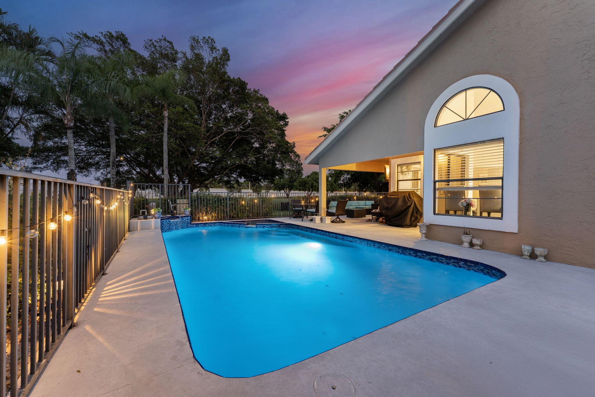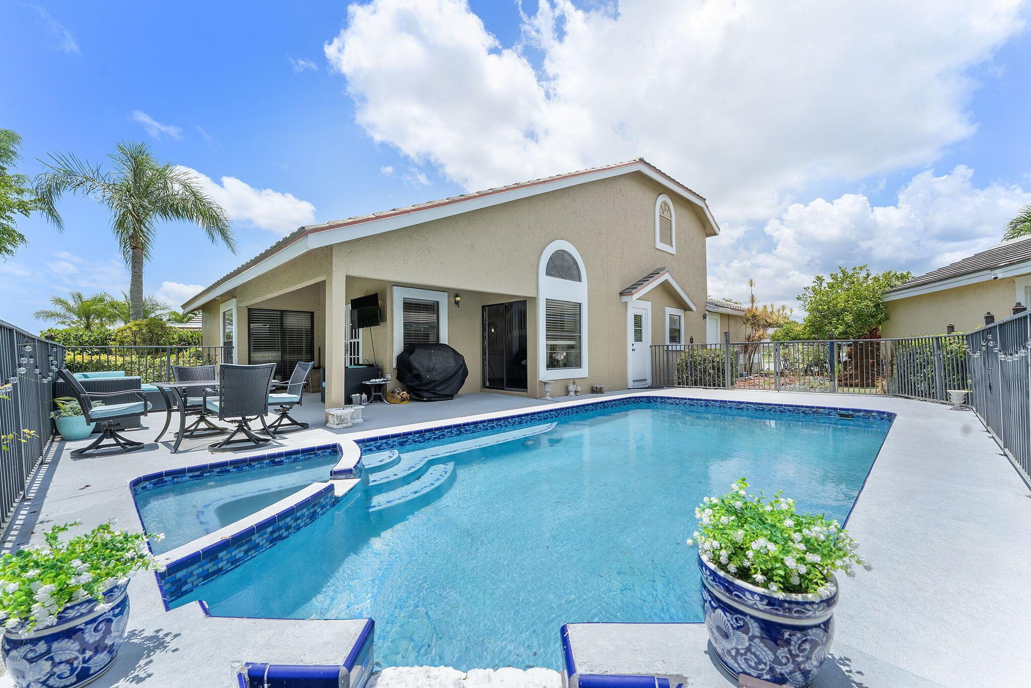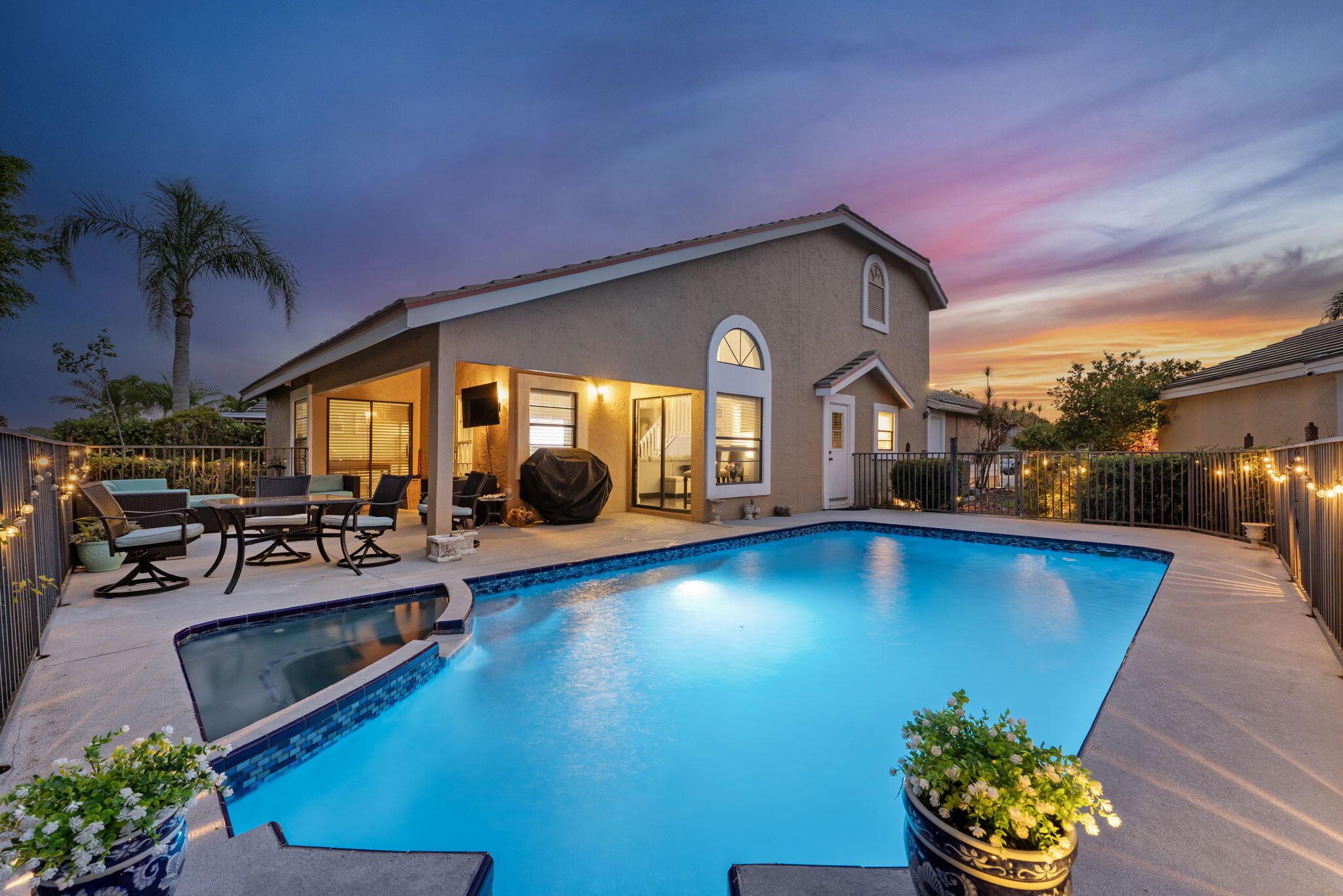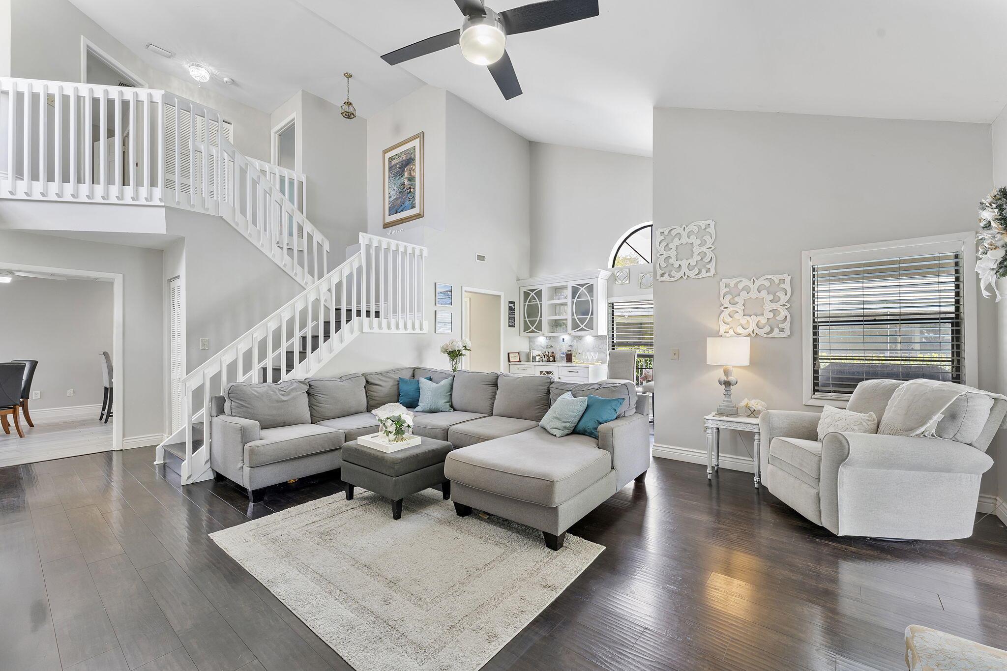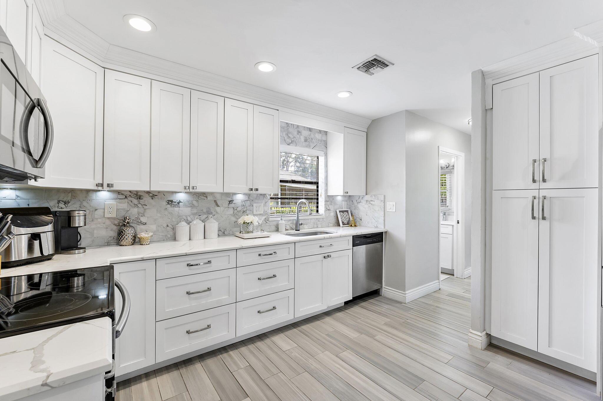 Welcome to your dream home on the 5th hole of a beautifully maintained golf course, nestled in a quiet cul-de-sac in one of South Florida’s premier gated communities with low HOA fees. This 3-bedroom, 2.5-bath home spans 1,851 sq ft under air, offering a bright and open floor plan with vaulted ceilings and stylish updates throughout. The primary suite is conveniently located on the first floor, featuring a spacious walk-in closet, ensuite bath with a separate soaking tub and walk-in shower. Enjoy cooking in the brand-new designer kitchen, complete with quartz countertops & backsplash, stainless steel appliances, and tile flooring. The rest of the home boasts beautiful wood look vinyl flooring, blending style and durability.