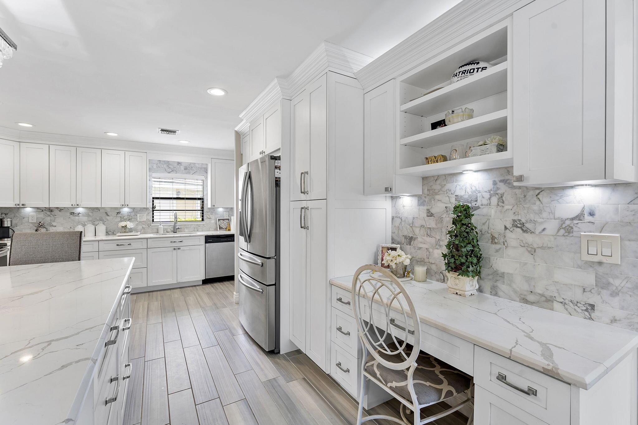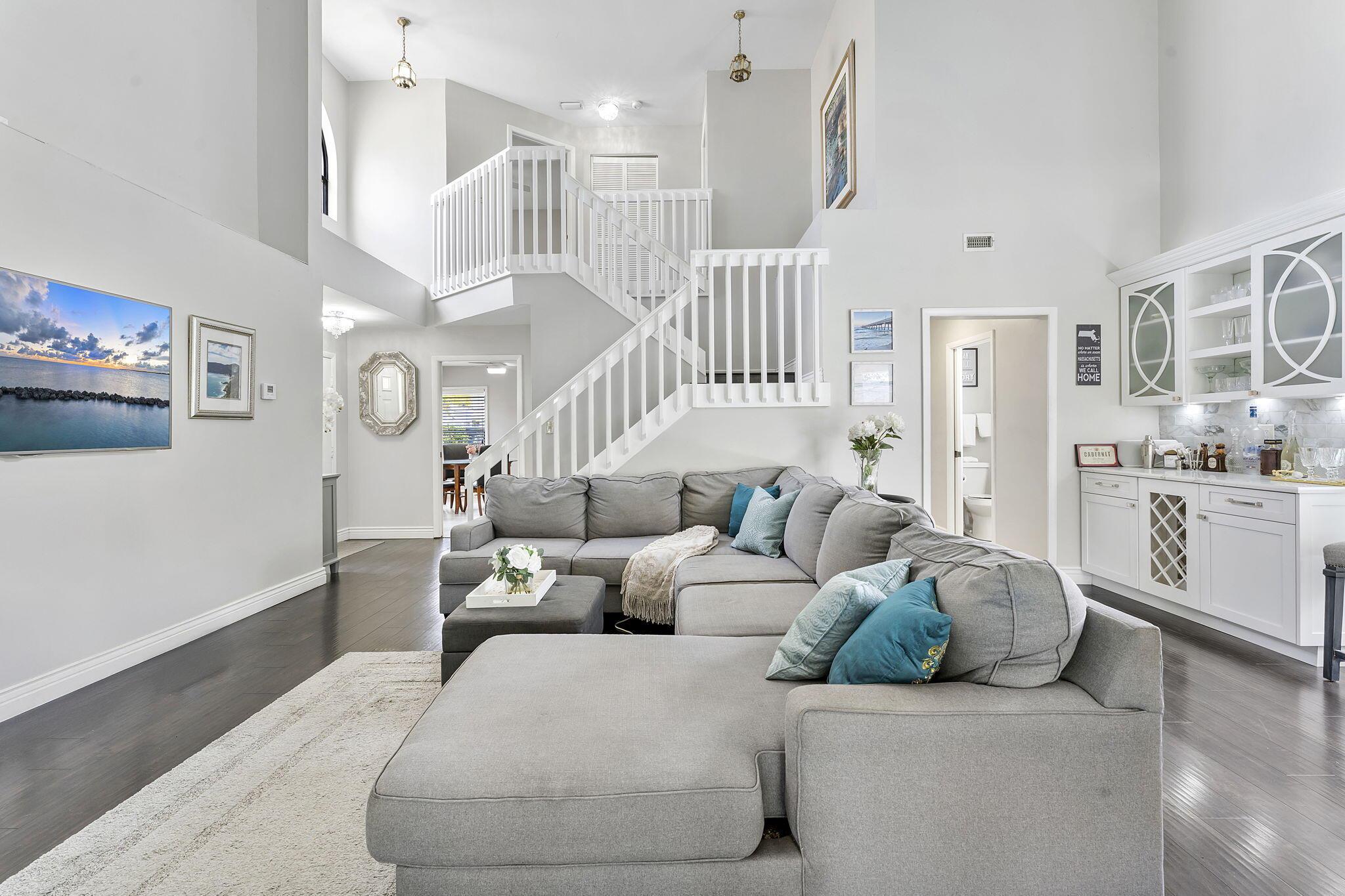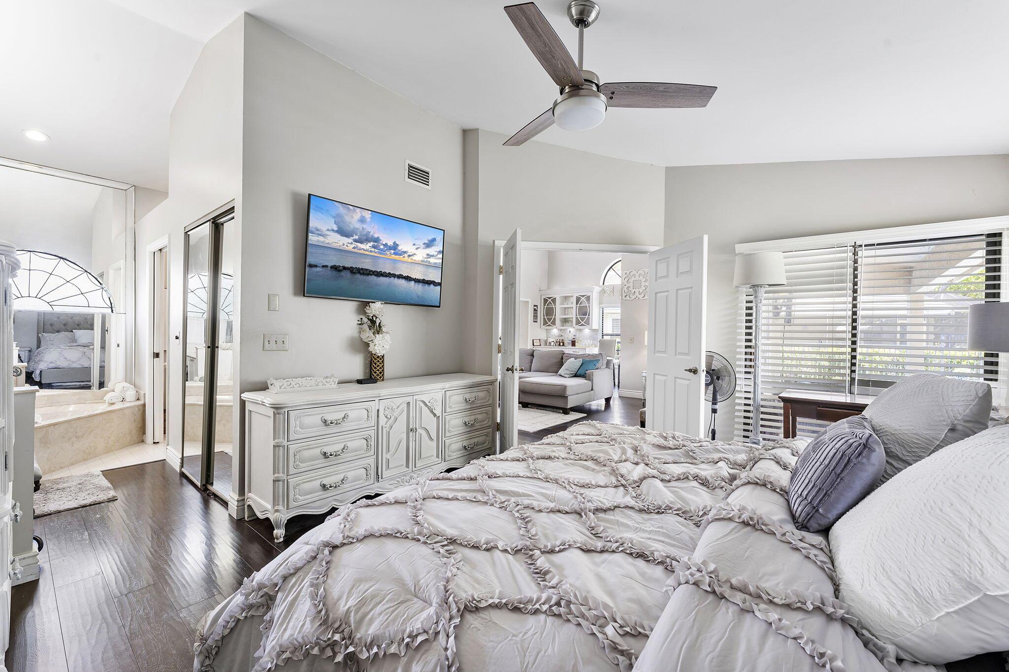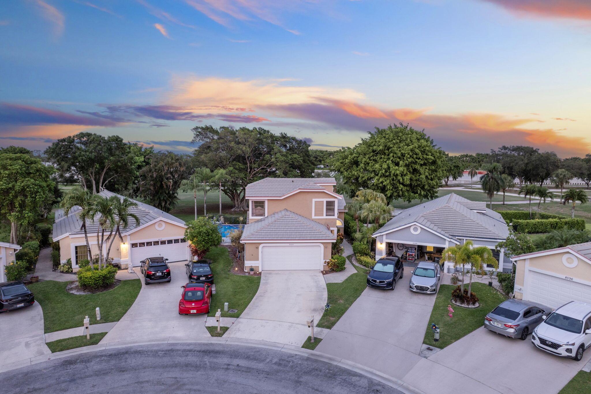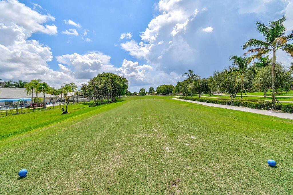 Welcome to your dream home on the 5th hole of a beautifully maintained golf course, nestled in a quiet cul-de-sac in one of South Florida’s premier gated communities with low HOA fees. This 3-bedroom, 2.5-bath home spans 1,851 sq ft under air, offering a bright and open floor plan with vaulted ceilings and stylish updates throughout. The primary suite is conveniently located on the first floor, featuring a spacious walk-in closet, ensuite bath with a separate soaking tub and walk-in shower. Enjoy cooking in the brand-new designer kitchen, complete with quartz countertops & backsplash, stainless steel appliances, and tile flooring. The rest of the home boasts beautiful wood look vinyl flooring, blending style and durability.