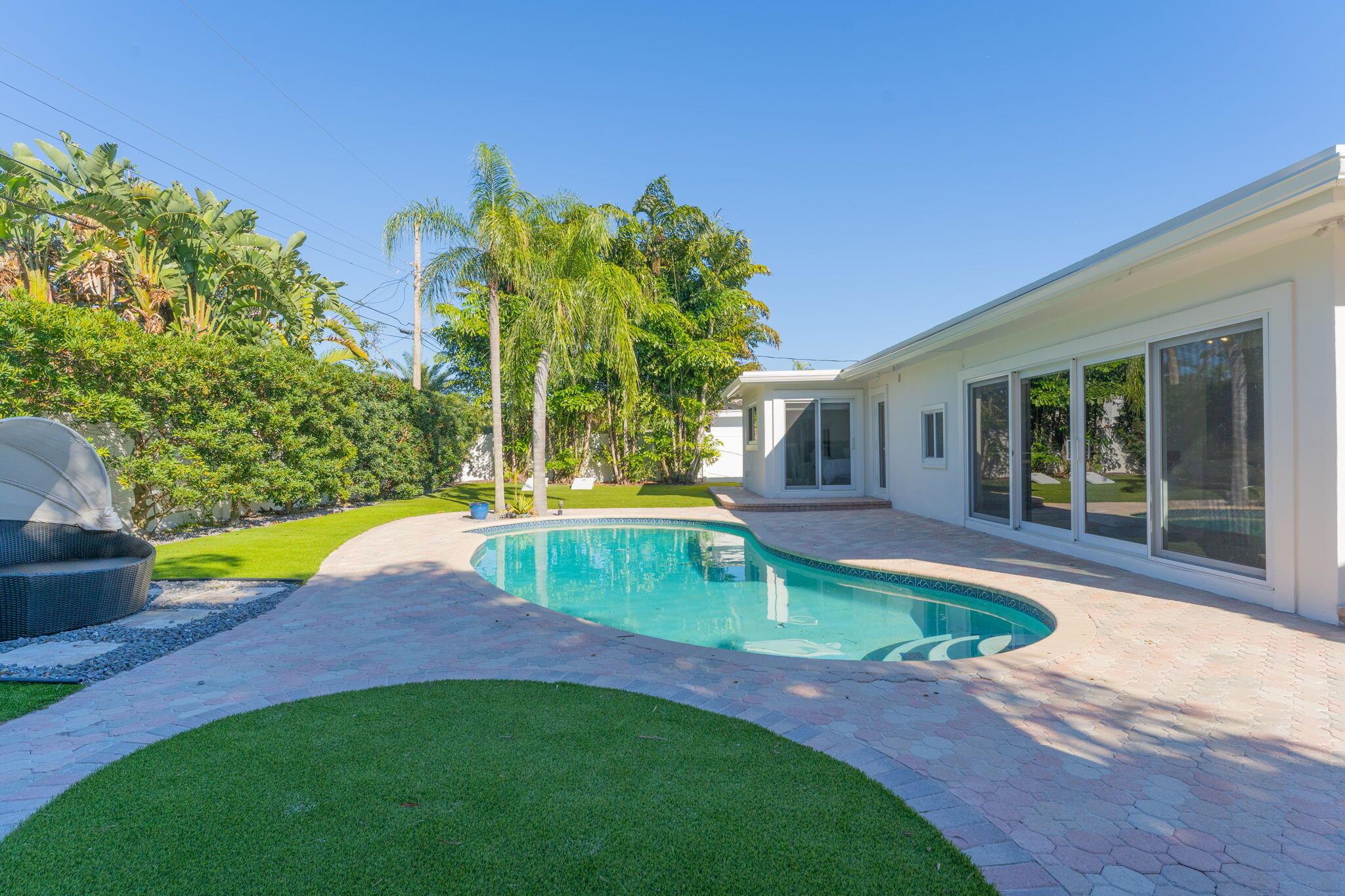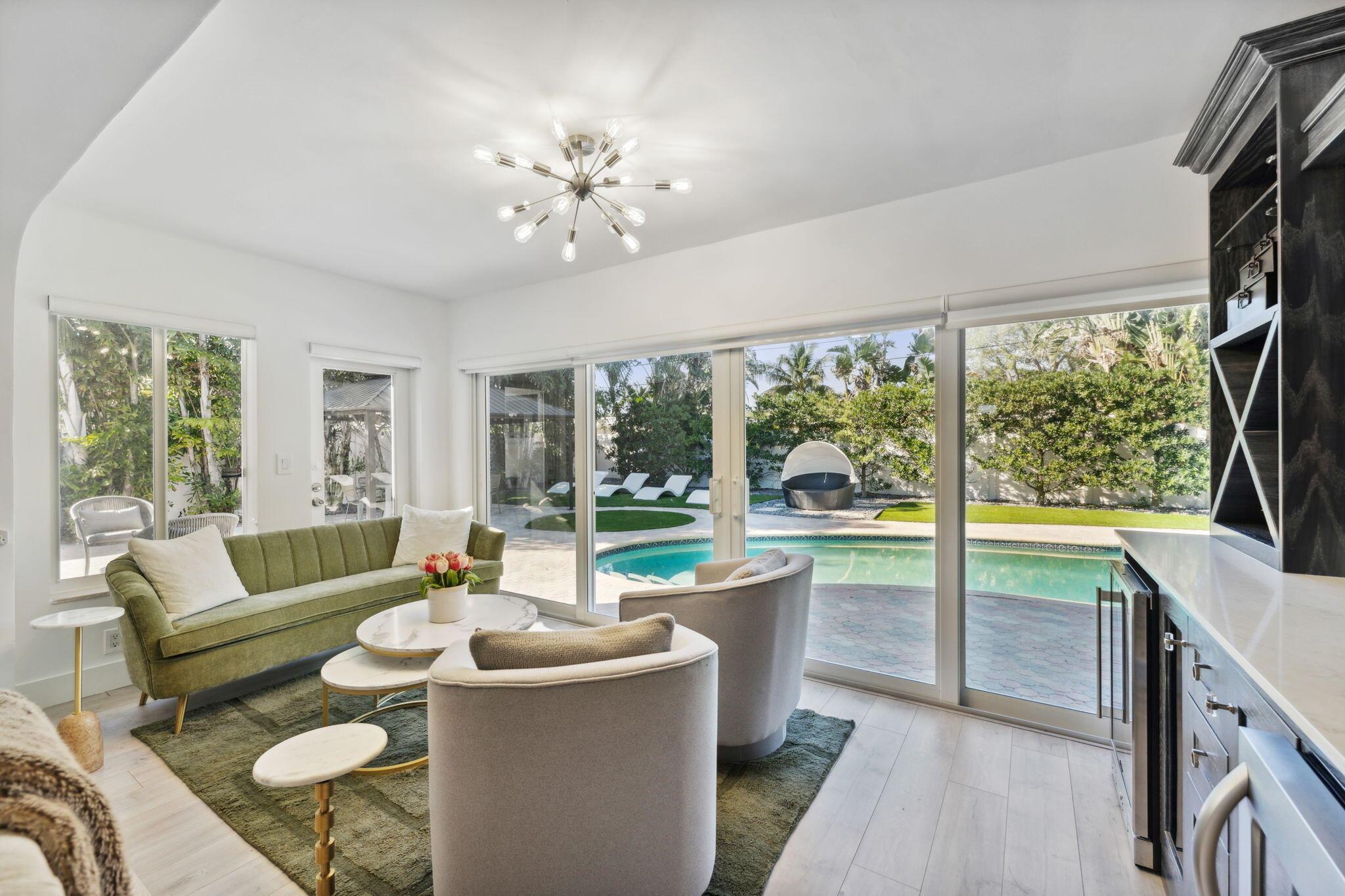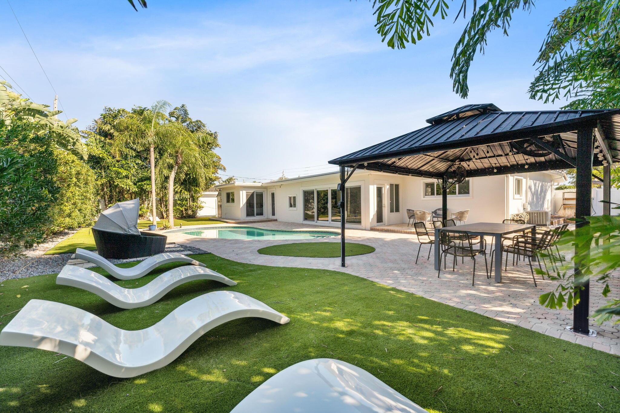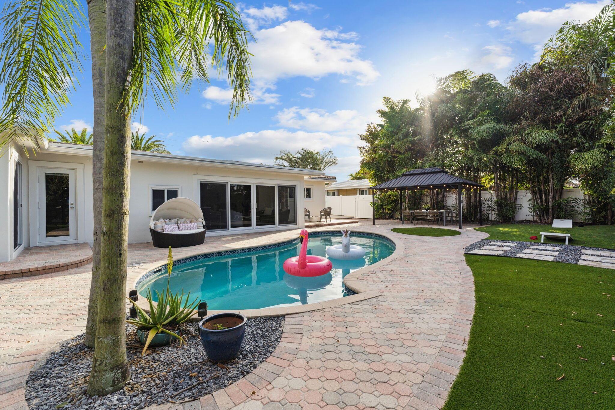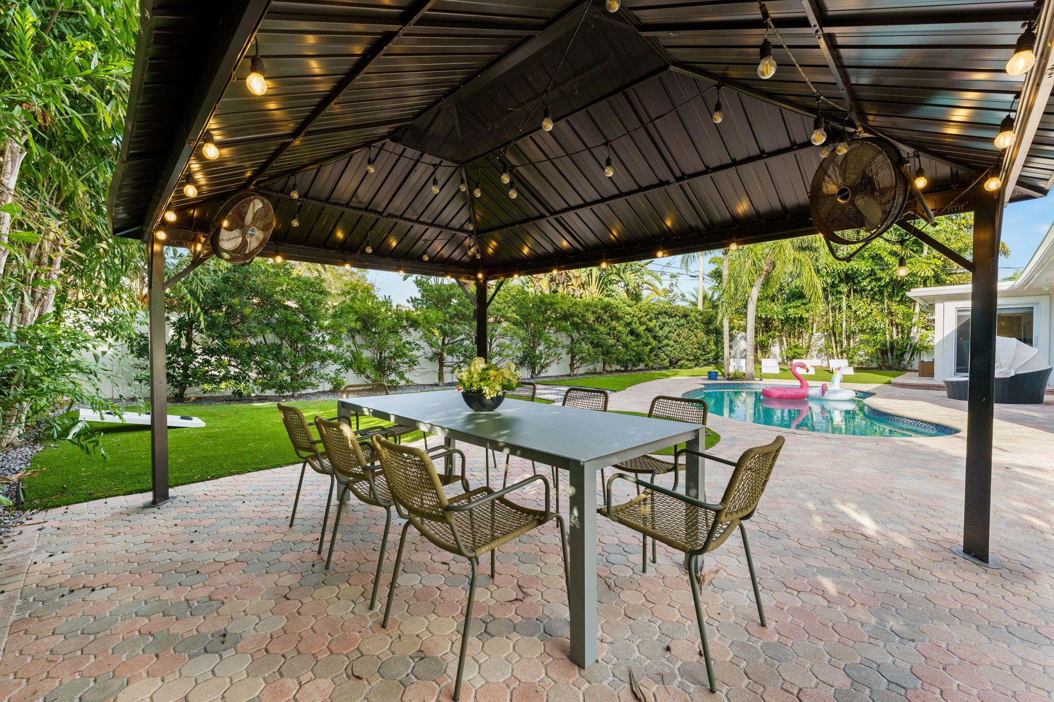Stunning 3BR/2BA home in the prestigious Lighthouse Point! Currently an AirBnb but it can be your Dream Home. Step into a bright, open-concept great room with vaulted ceilings and views of the resort-style backyard. The chef’s kitchen boasts quartz countertops, custom cabinetry, Carrara marble backsplash, stainless steel appliances, and walnut-wrapped beams. Adjacent is a Florida room with a built-in bar and oversized sliders leading to the pool and electric-wired gazebo–perfect for entertaining.Enjoy low-maintenance living with artificial turf, a fully irrigated vegetable garden, and seamless indoor-outdoor flow. The oversized primary suite features a custom dressing room/office/nursery space, spa-style bath, double vanities, large shower, and direct pool access.