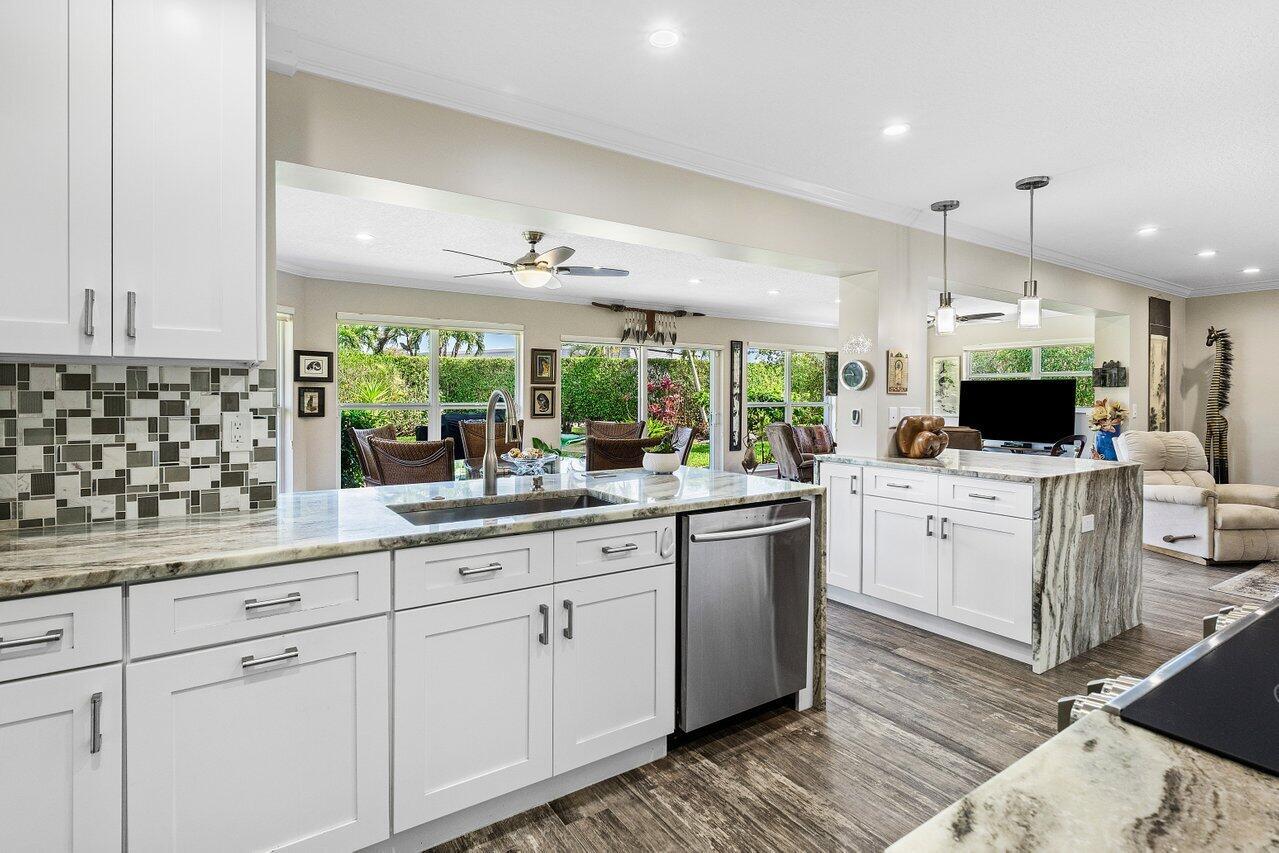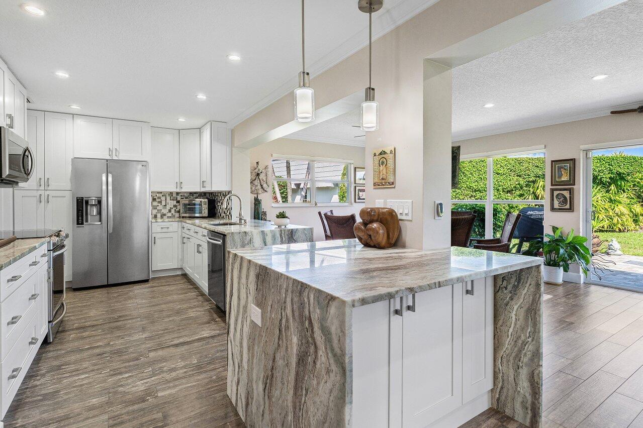 Welcome to Your Move-In Ready Oasis in Atlantis.Tucked away on a one-of-a-kind, fully hedged lot, this beautifully remodeled home offers the ultimate in privacy and peace of mind; all in the highly sought-after community of Atlantis.From the moment you walk in, you’ll feel the difference. The open-concept floor plan is perfect for both entertaining and everyday living, centered around a stunning new kitchen featuring shaker cabinetry, stainless steel appliances, granite countertops, and a freestanding island with a waterfall granite top–ideal for extra storage, serving, or gathering with friends and family.