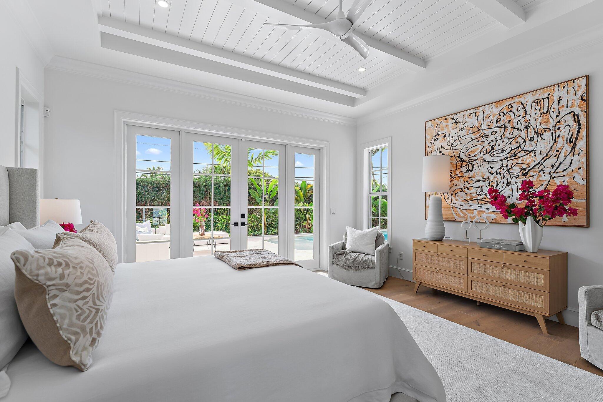 Easterly breezes await off of Lakeside Drive in this brand new construction estate, ”The Palm House”, curated by RJS Builders. Architecturally stunning and nestled amongst beautiful garden views with approximately 5,574 square feet of indoor/outdoor space, 4,046 square feet under air, for a total of 4 full bedrooms, plus den, loft, and 4.5 bathrooms. Beyond the coral stone foyer and private office, an expansive living room with fireplace and dining area seamlessly transition under voluminous ceilings, with wood beams above white oak floors, each with uniquely orchestrated garden and pool views. Stately Chef’s kitchen, prep pantry with second refrigerator, dry bar with wine cooler and ice maker, and counter seating for gatherings, is anchored by white cabinetry and select
