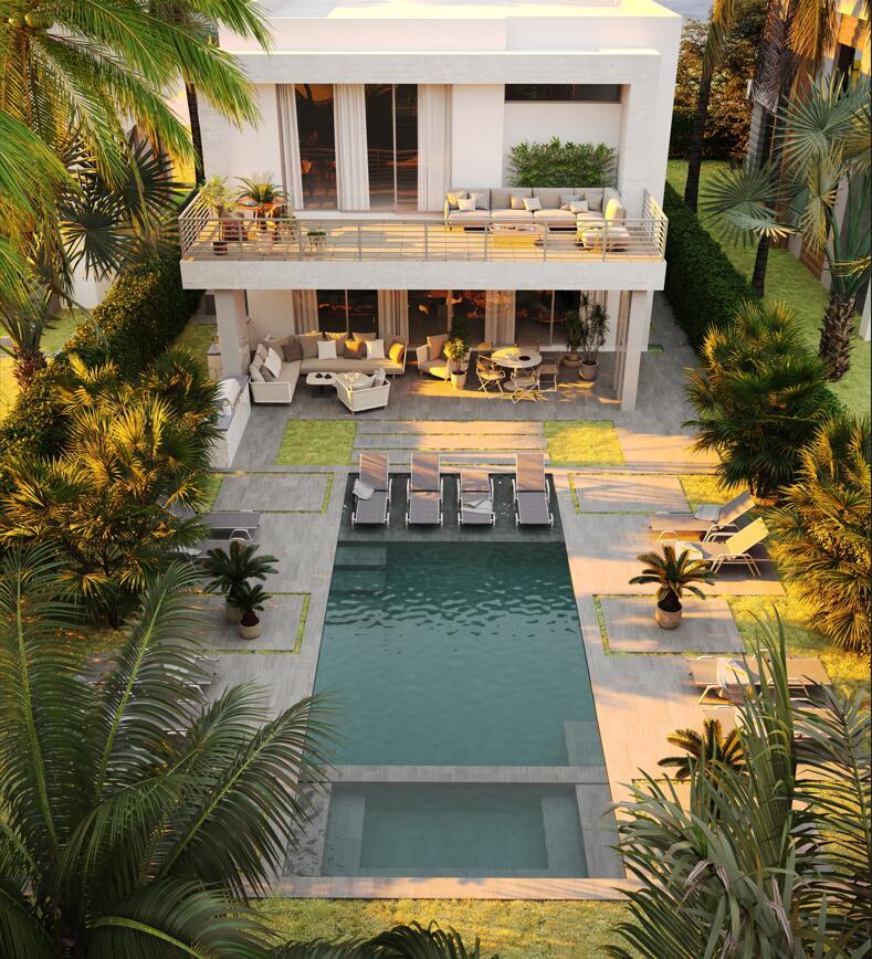 This stunning 4 bedroom 4 full bath and 1 half, new-construction home, , offers 3,556 SF of air-conditioned space and 4,989 total SF. The sophisticated interior design features cool color tones, large-format tiles, and gorgeous slab selections, with every detail carefully curated to exude unique luxury both inside and out. A dramatic 22-foot foyer leads to an open-concept kitchen, dining, and living area. The first floor includes a versatile flex room, powder room, and laundry.The backyard oasis includes a covered patio, outdoor kitchen, and a large pool surrounded by lush landscaping–perfect for South