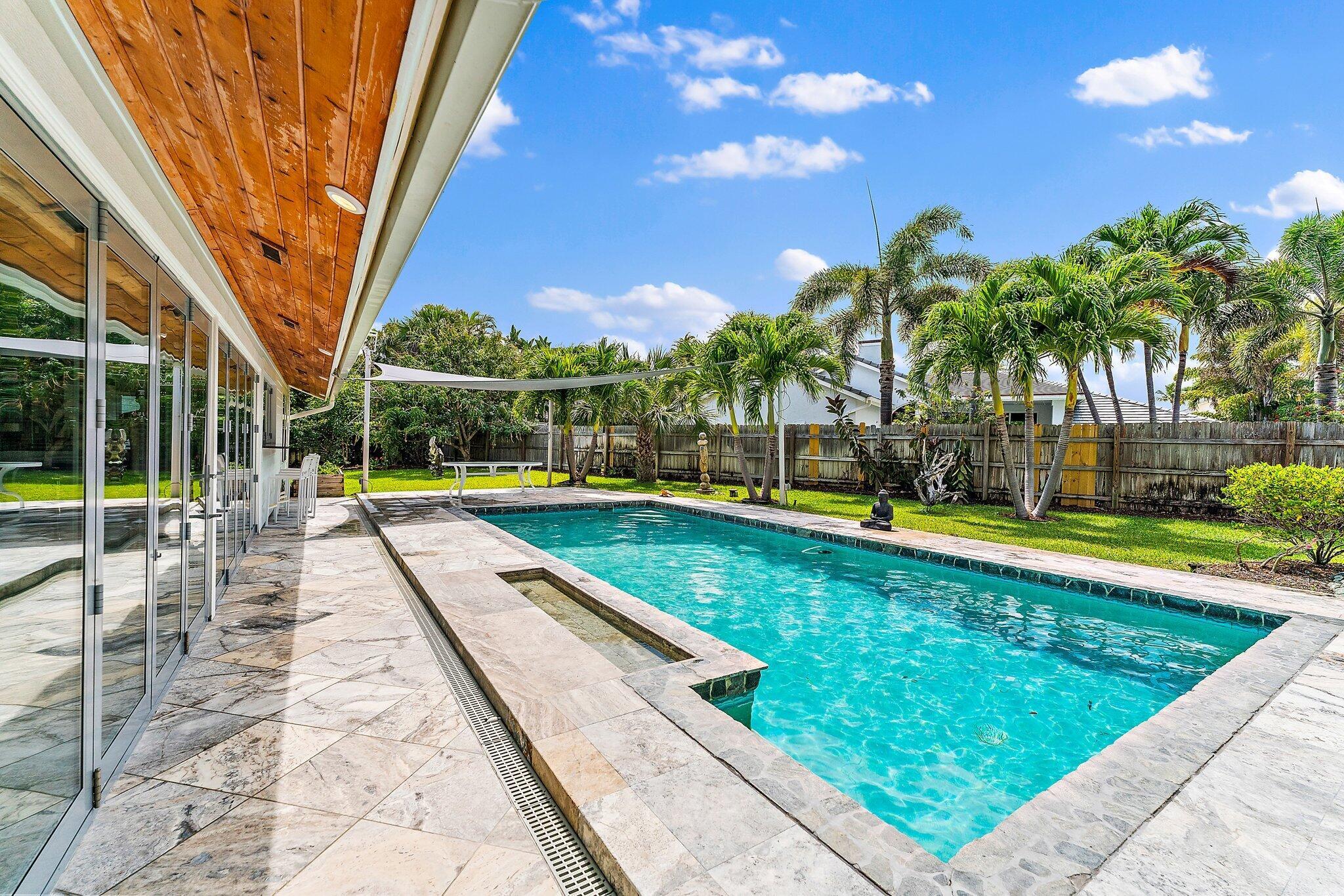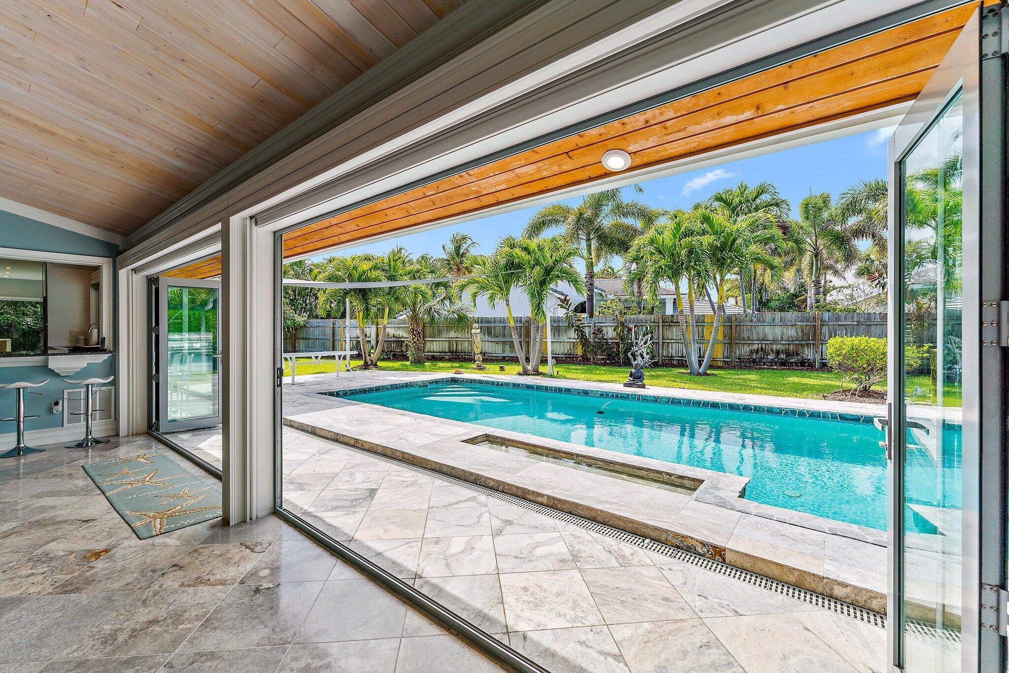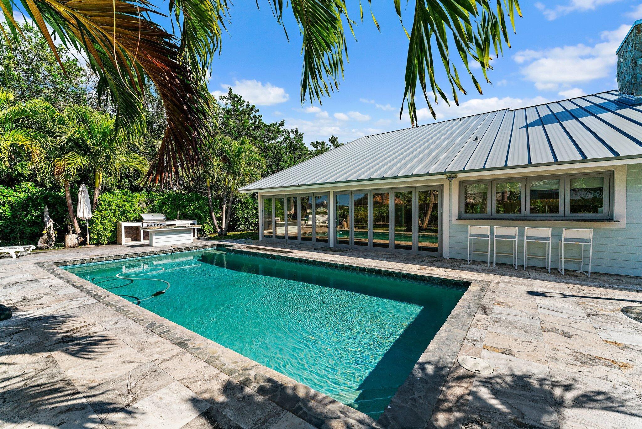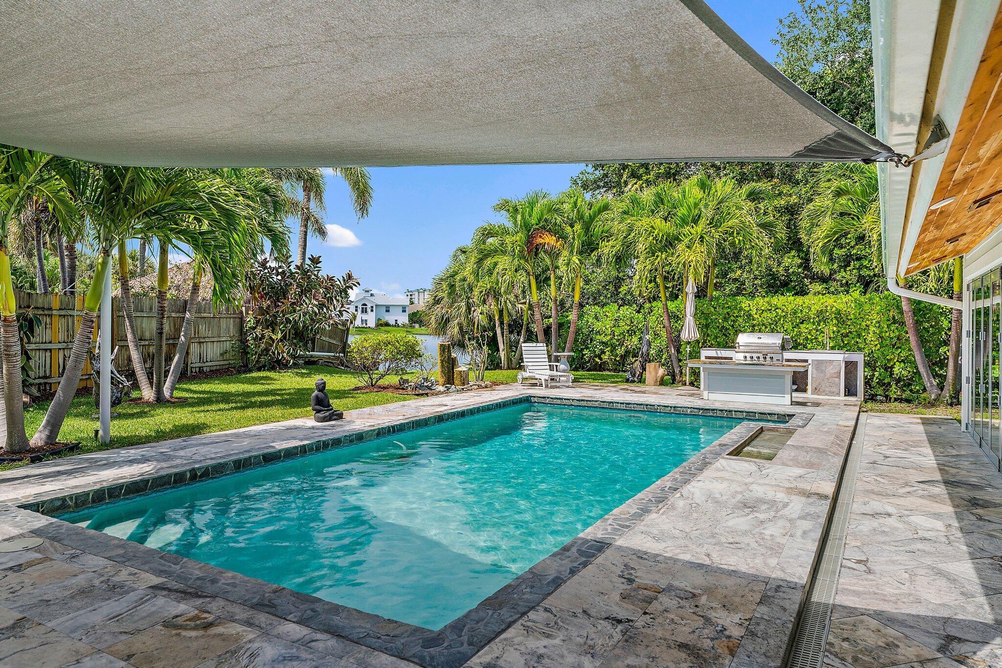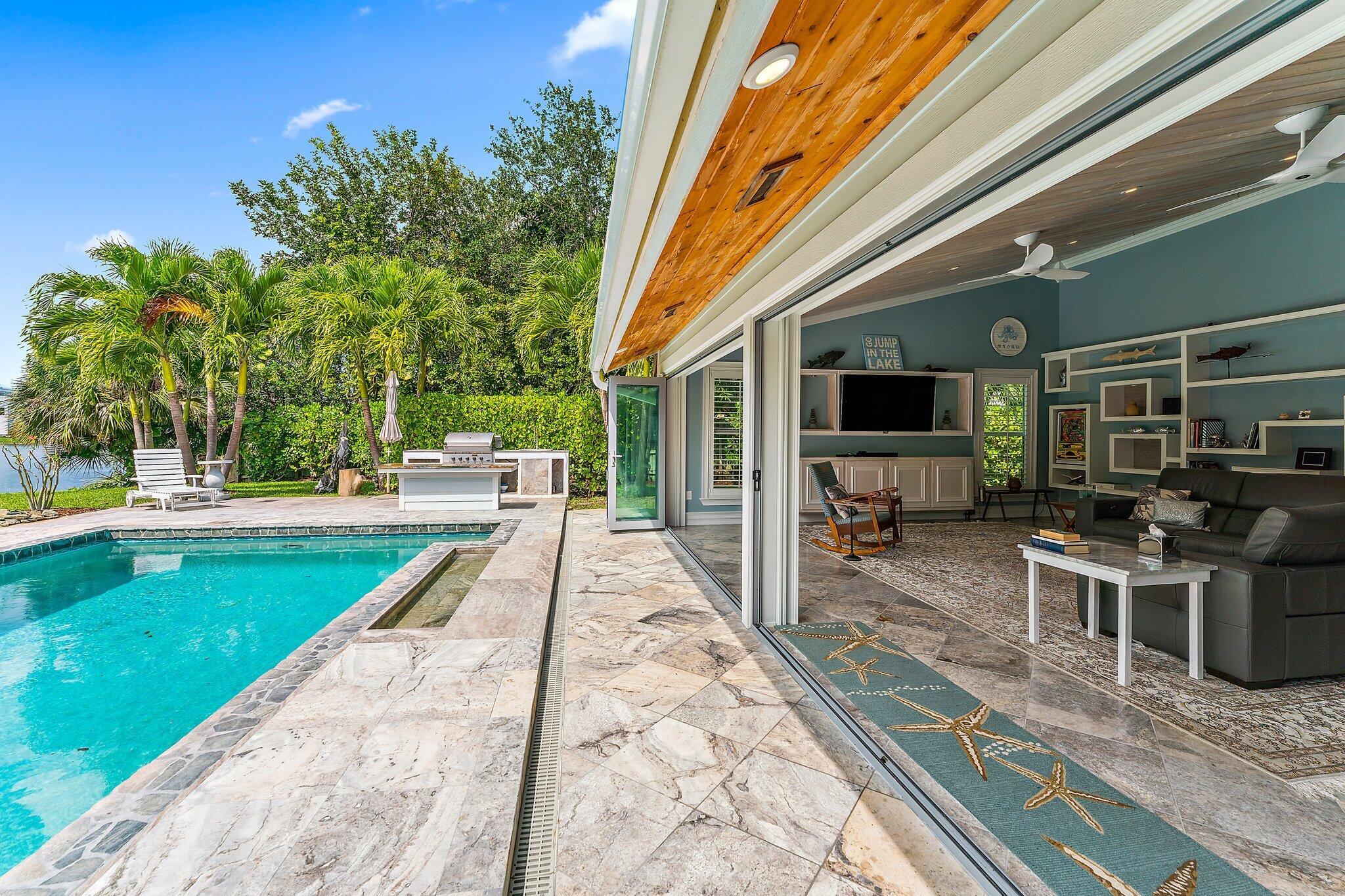 An updated home with a brand new metal roof, located on the lake in a unique community of Olympus. The house boasts large bedrooms, formal living and dining rooms, fireplace, impact windows, bamboo and tile floors! Step into the welcoming foyer to the formal living room with vaulted ceilings and a waterfall wall. The formal dining room is open to the living room and the kitchen, it can be converted into additional bedroom. A full complement of top of the line appliances, and fully retractable impact windows looking out to the lake, heated pool, and lanai. Master suite is oversized with vaulted ceilings. Olympus is located near the beaches of Juno and Jupiter as well as great dining and shopping venues. This home offers a luxurious living experience experience.