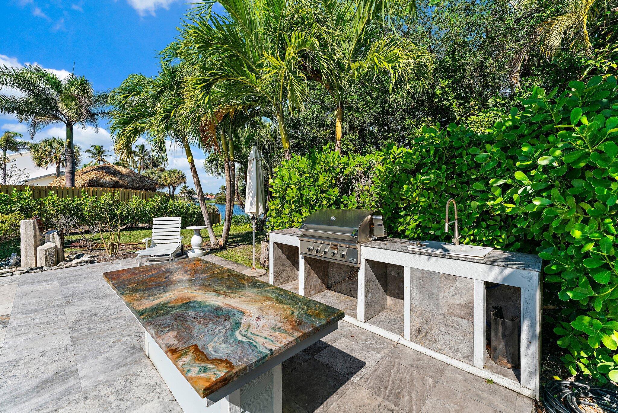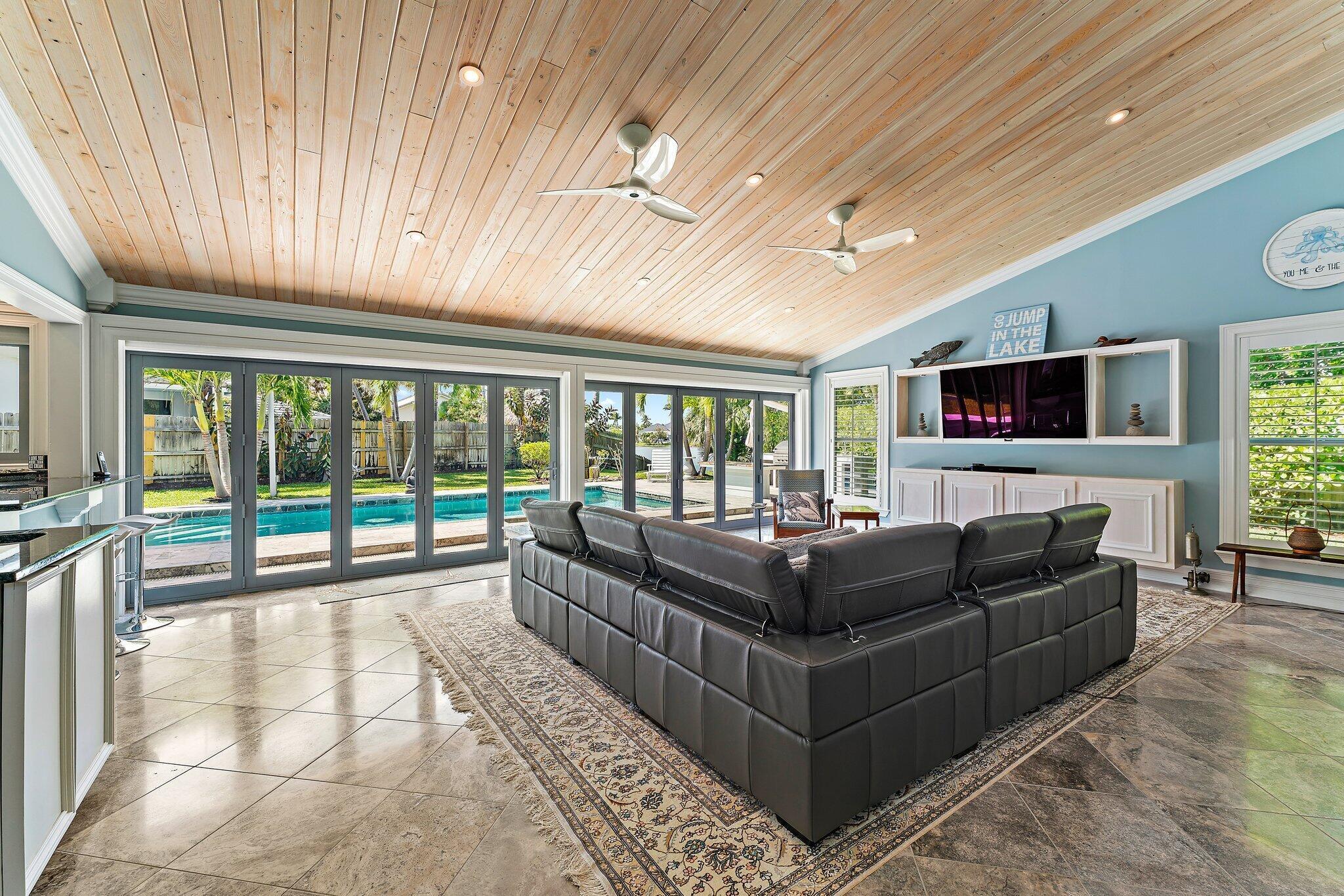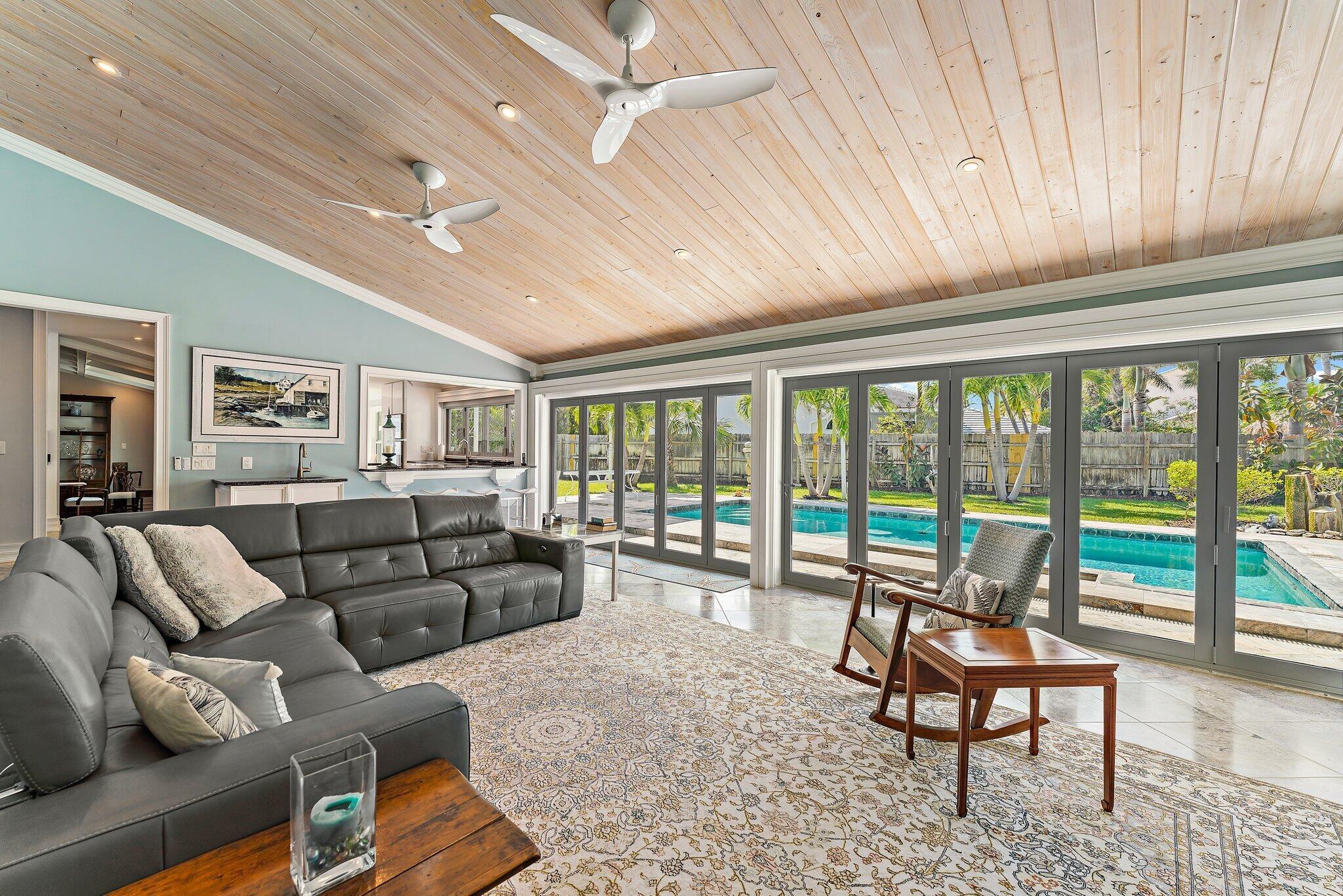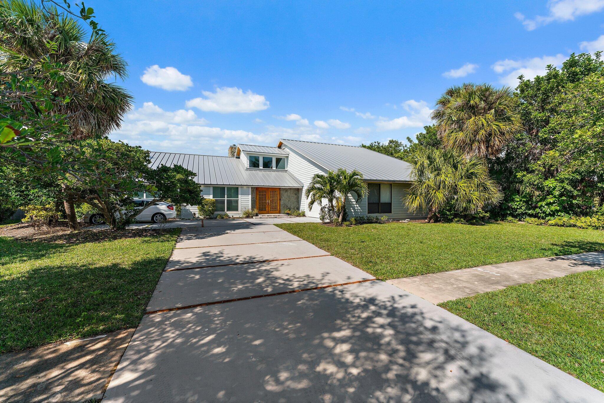 An updated home with a brand new metal roof, located on the lake in a unique community of Olympus. The house boasts large bedrooms, formal living and dining rooms, fireplace, impact windows, bamboo and tile floors! Step into the welcoming foyer to the formal living room with vaulted ceilings and a waterfall wall. The formal dining room is open to the living room and the kitchen, it can be converted into additional bedroom. A full complement of top of the line appliances, and fully retractable impact windows looking out to the lake, heated pool, and lanai. Master suite is oversized with vaulted ceilings. Olympus is located near the beaches of Juno and Jupiter as well as great dining and shopping venues. This home offers a luxurious living experience experience.