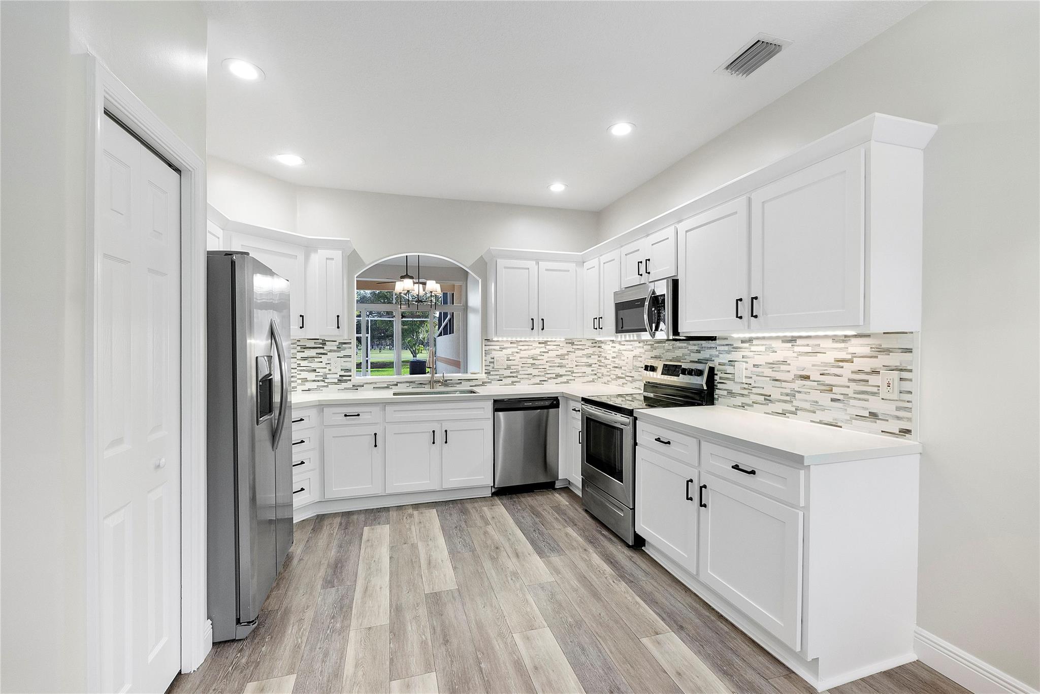 Breathtaking views of the Oaks Golf Course in the desirable Palm Aire Country Club. Located in the private gated community of Fairview Pointe is this lovely two story townhome with primary suite downstairs and two additional bedrooms upstairs along with a spacious loft. Professionally painted neutral colors throughout. Eat-in kitchen with updated white shaker cabinetry, quartz countertops and SS appliances. Newer A/C. The huge screened paver patio is an extension to to the living areas and perfect for entertaining. Wake up to beautiful sunrises over the golf course. IMPACT windows and doors. Garage is immaculate with custom cabinetry and epoxy flooring. Front landscape lighting with large paver driveway. Community has pool. Roofs and landscaping maintained by HOA. Pets allowed.