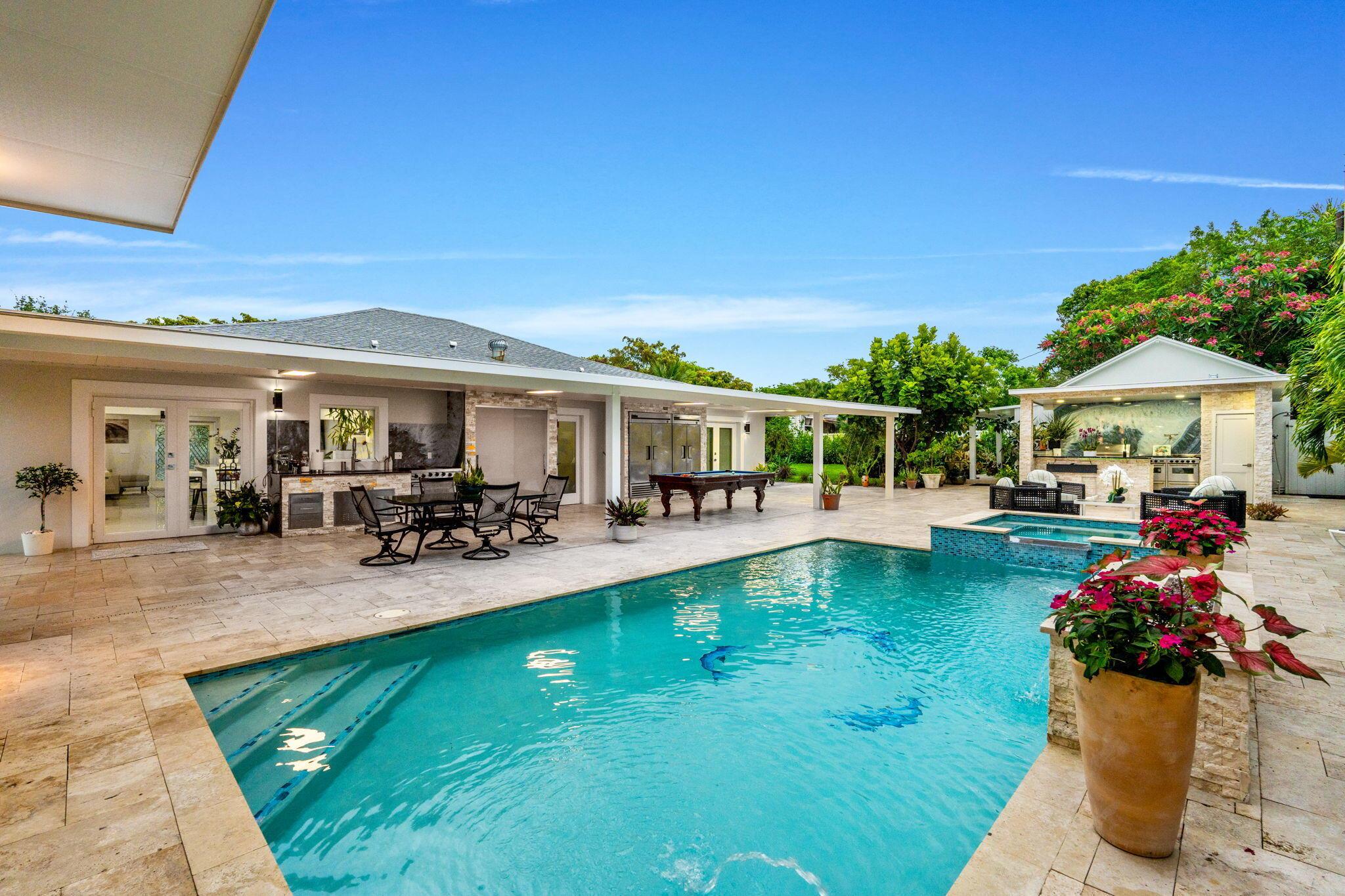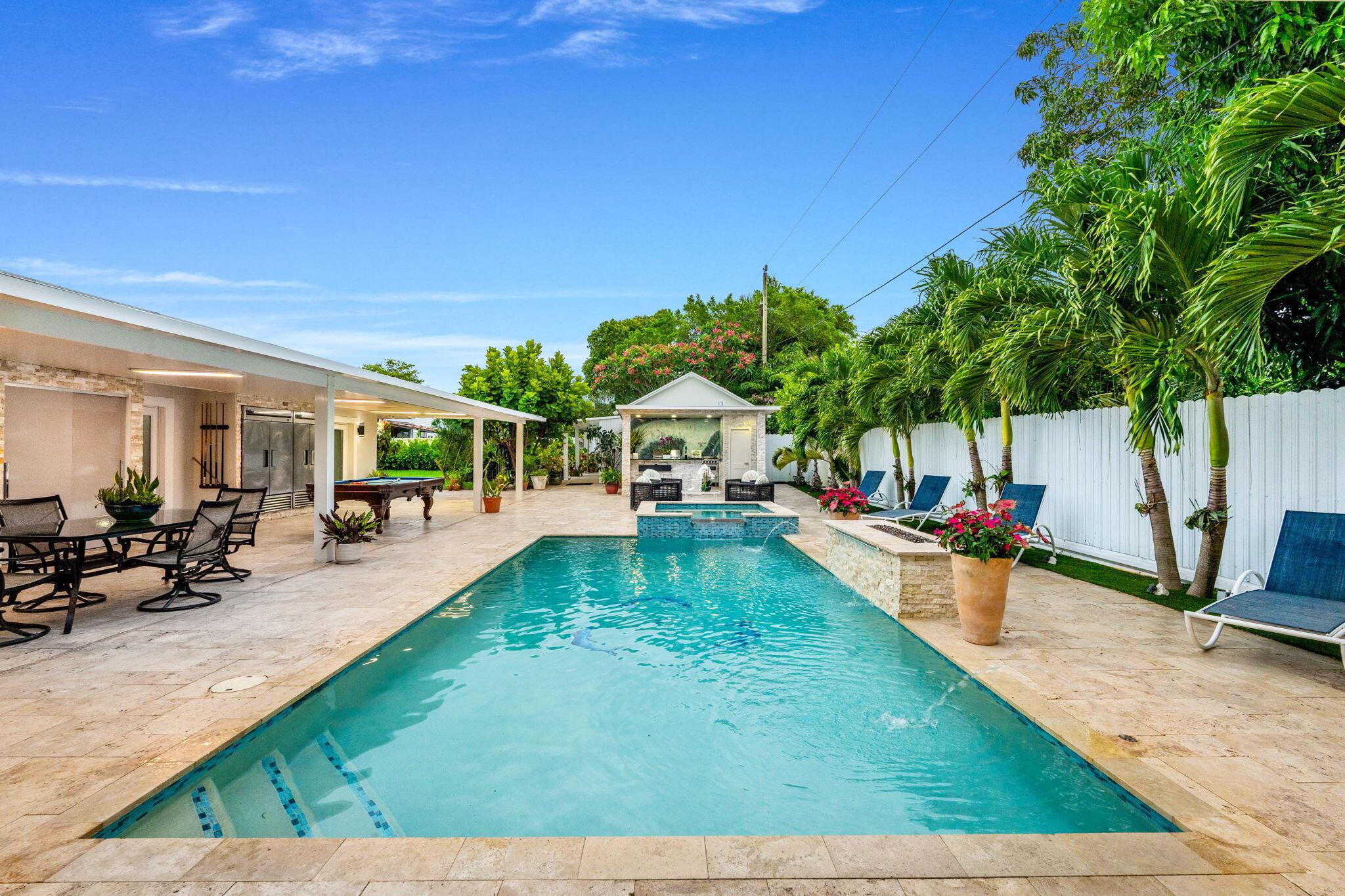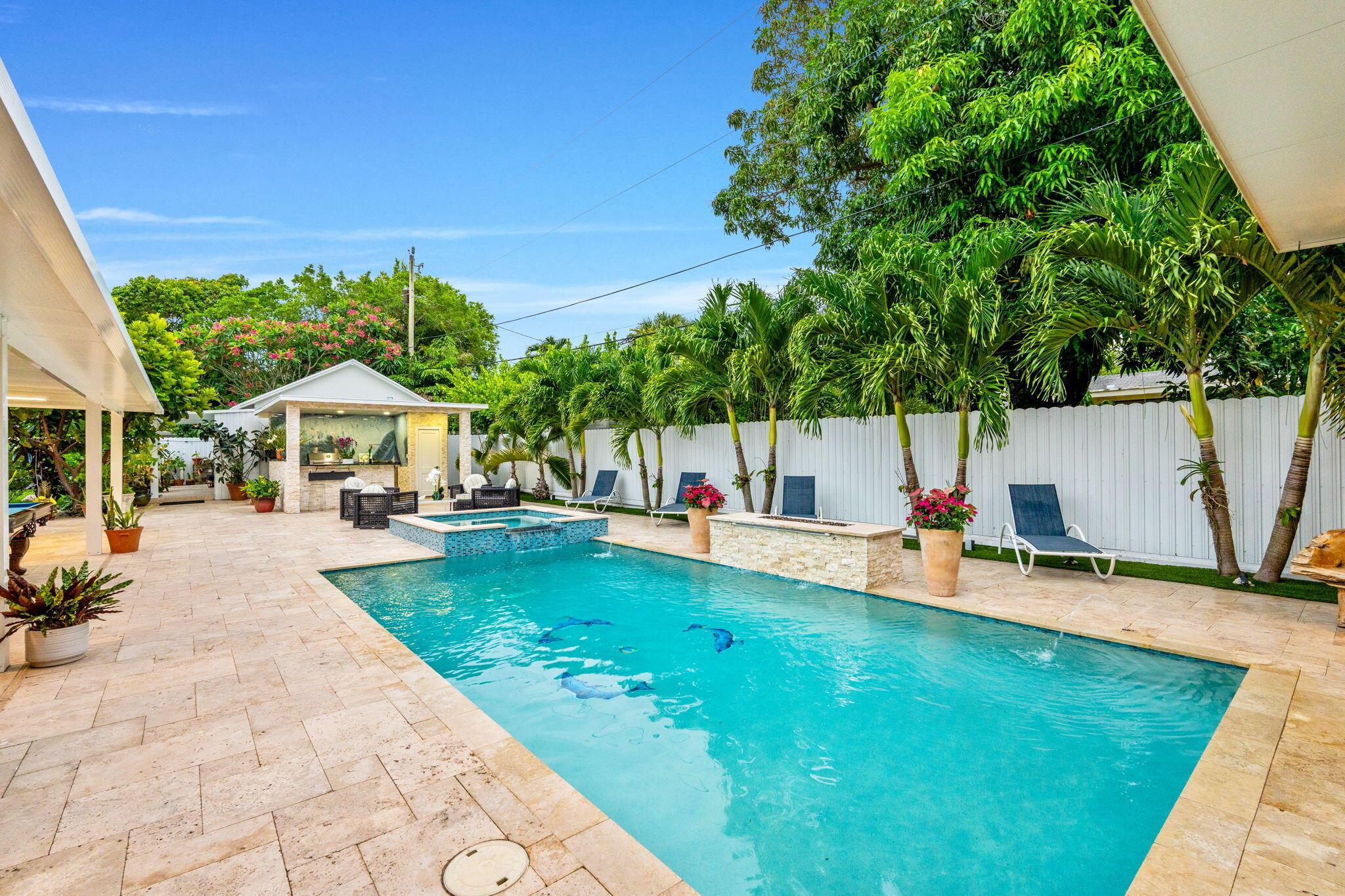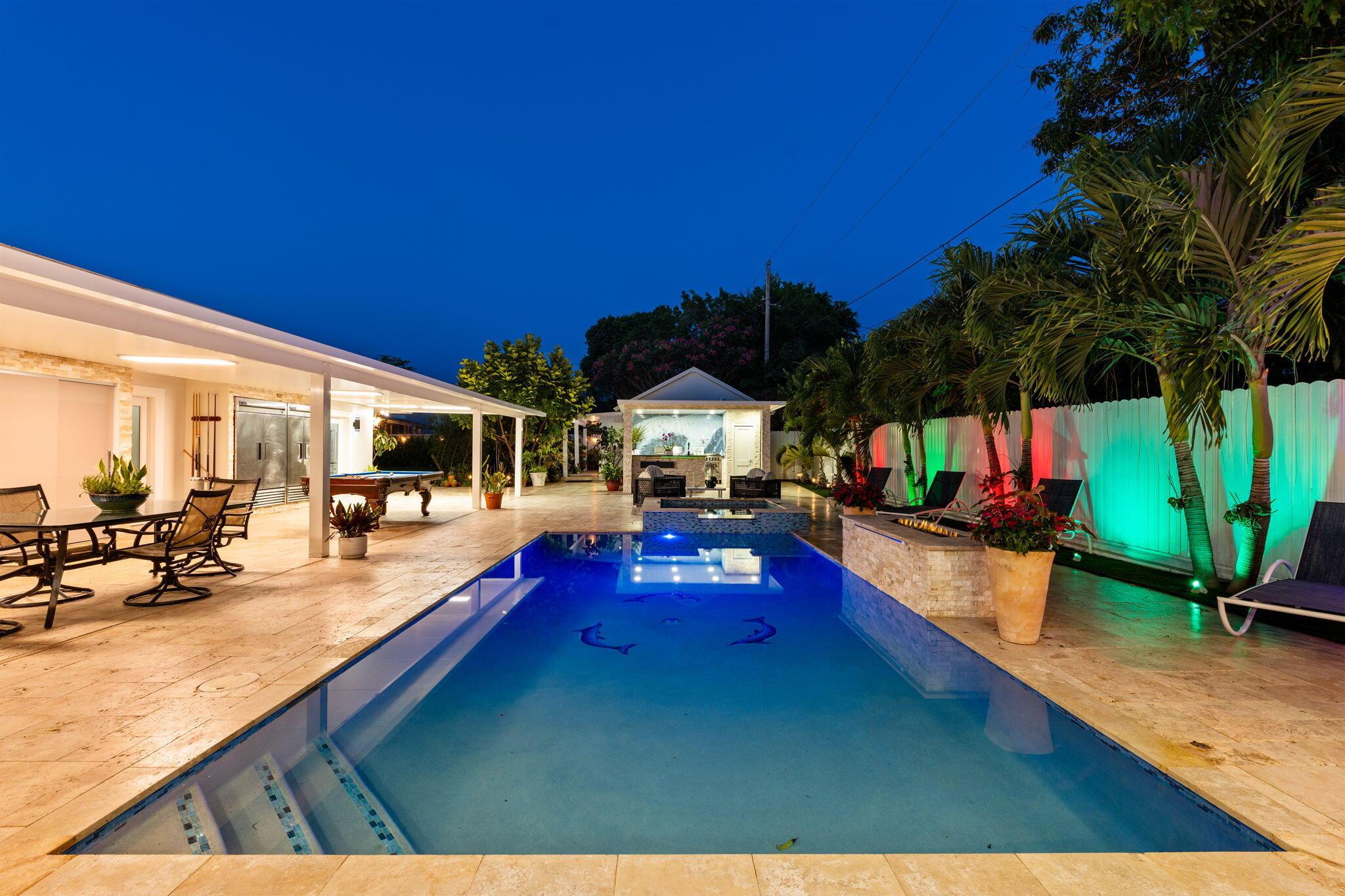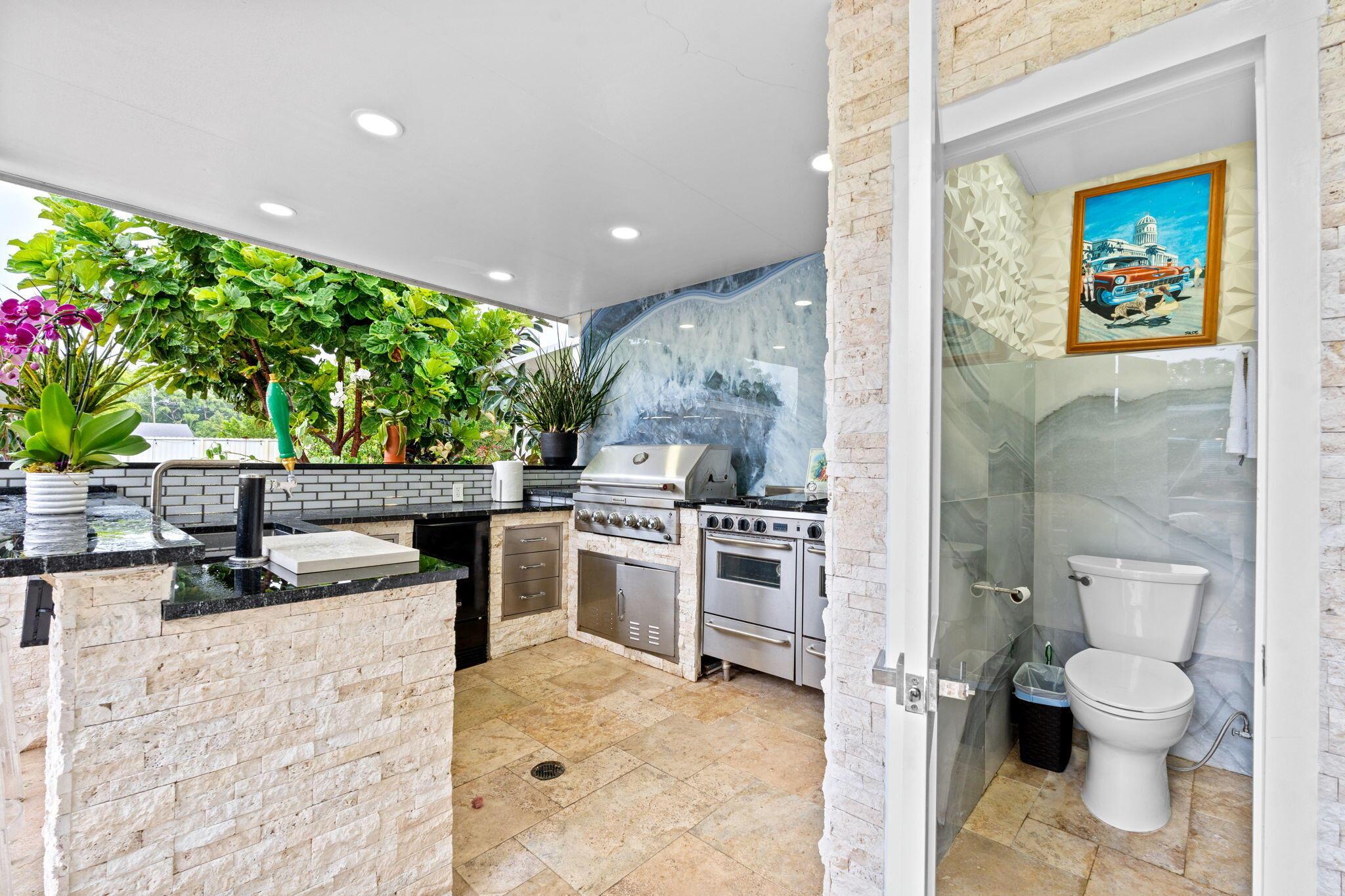 Price Improvement! Step into your own private paradise with this exquisitely renovated 5-bedroom, 4.5-bathroom home including a ”Casita” in the back. This property is perfectly situated on a rare TRIPLE LOT just under HALF an ACRE. Featuring approximately 2,700 sqft of living space, this custom-designed property was completely renovated late 2020 with top-quality finishes, impact windows and doors, and high-end details throughout. The main home offers a bright open layout with porcelain tile floors, a stunning chef’s kitchen with sleek waterfall-edge quartz countertops, custom cabinetry, and premium stainless steel appliances — one of three fully equipped gas kitchens on the property.