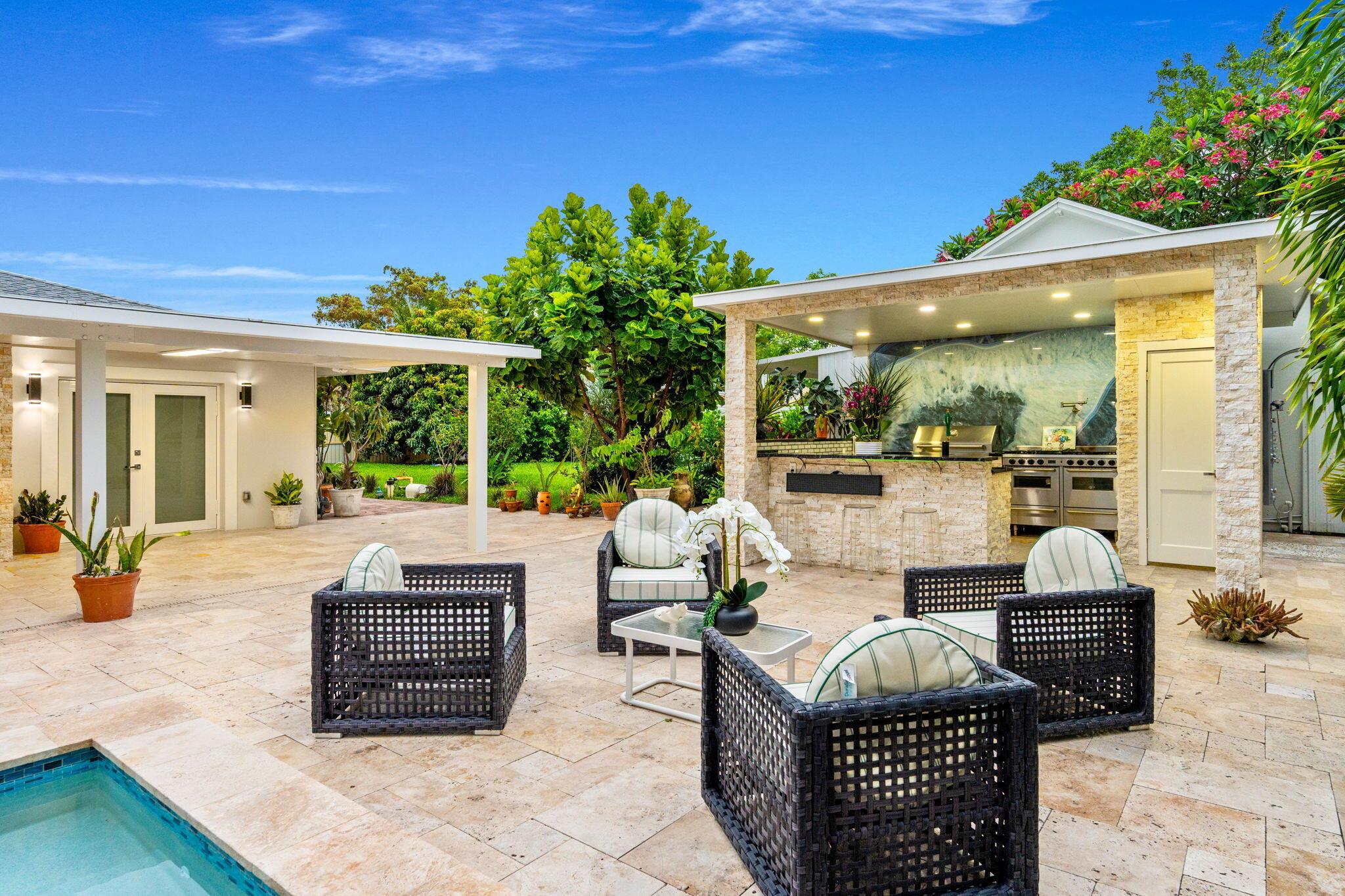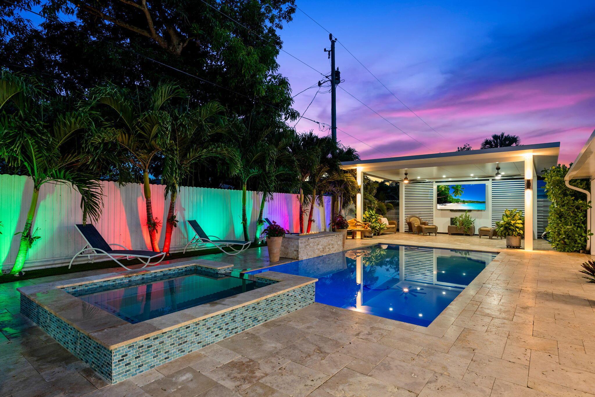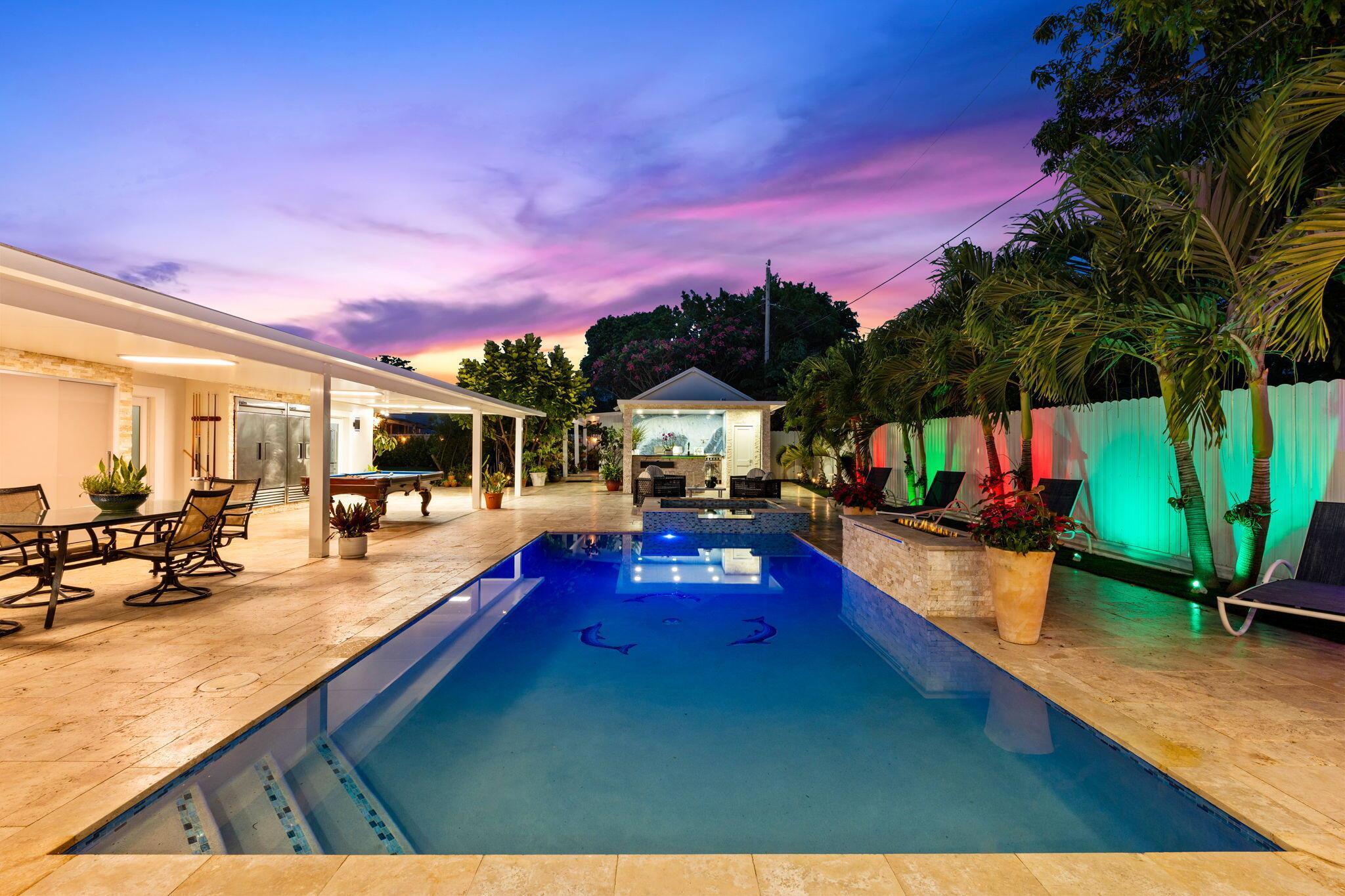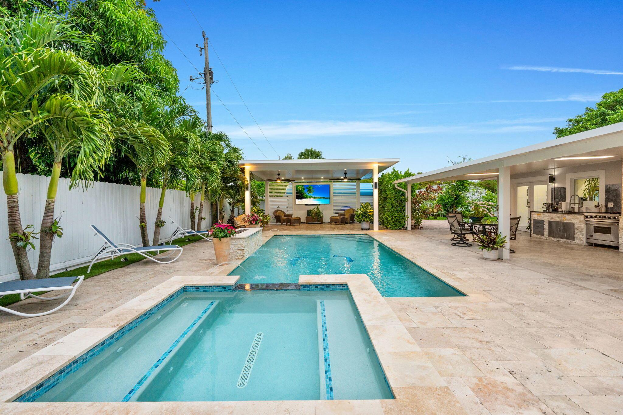Price Improvement! Step into your own private paradise with this exquisitely renovated 5-bedroom, 4.5-bathroom home including a ”Casita” in the back. This property is perfectly situated on a rare TRIPLE LOT just under HALF an ACRE. Featuring approximately 2,700 sqft of living space, this custom-designed property was completely renovated late 2020 with top-quality finishes, impact windows and doors, and high-end details throughout. The main home offers a bright open layout with porcelain tile floors, a stunning chef’s kitchen with sleek waterfall-edge quartz countertops, custom cabinetry, and premium stainless steel appliances — one of three fully equipped gas kitchens on the property.
