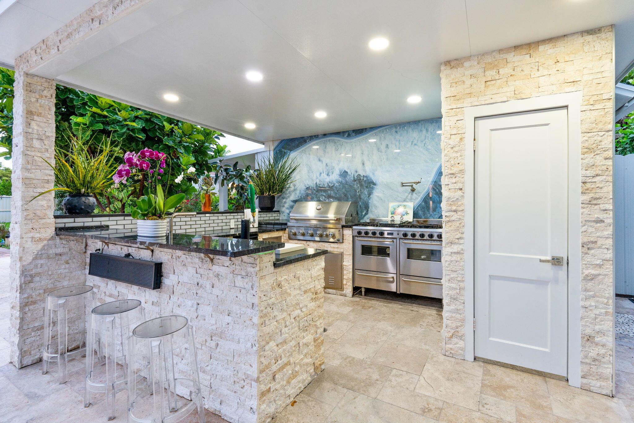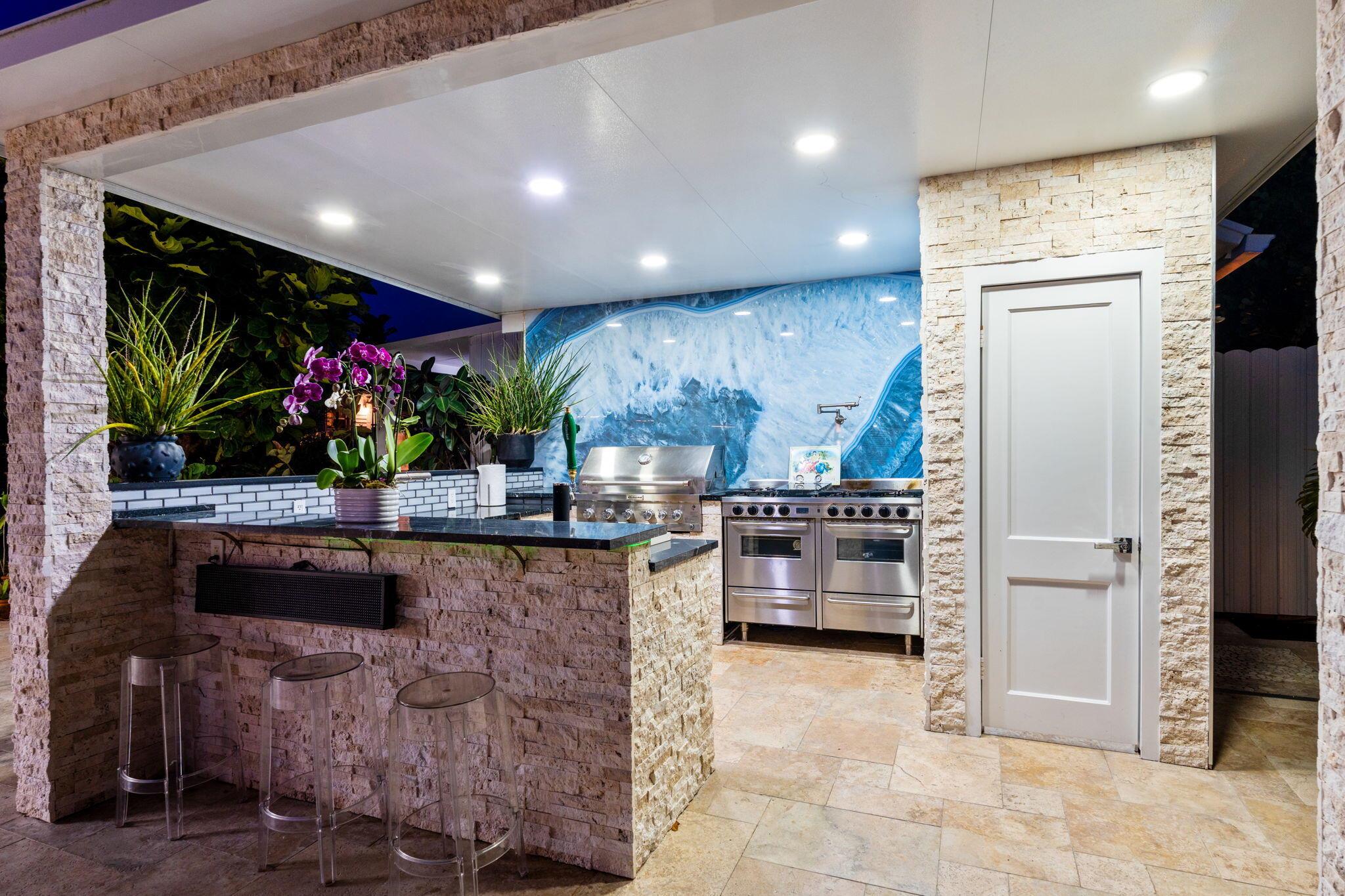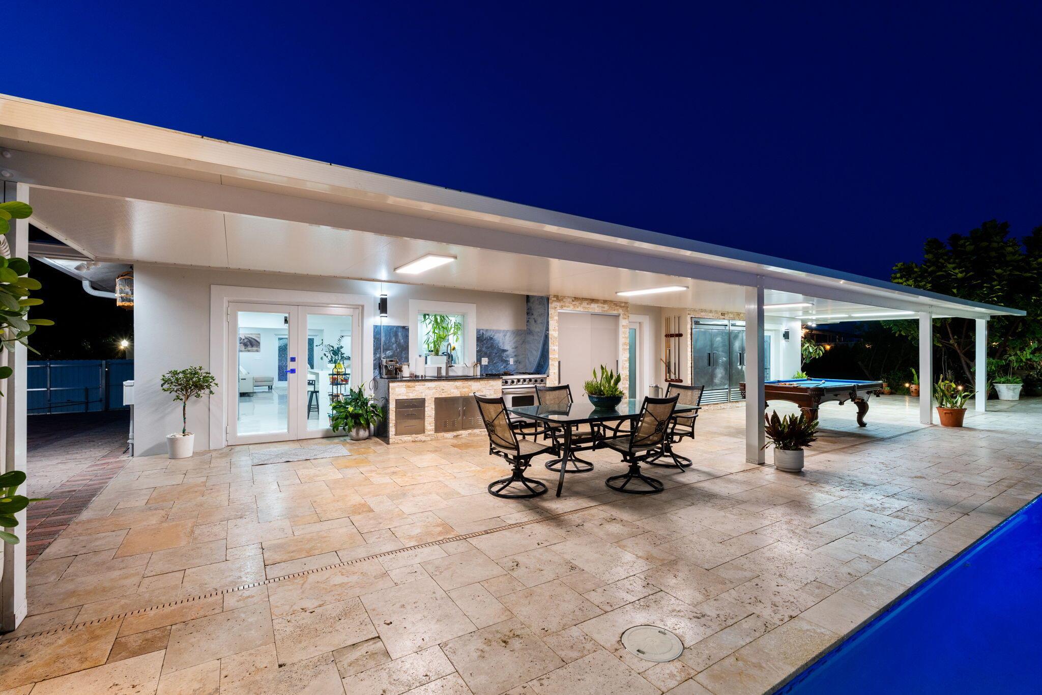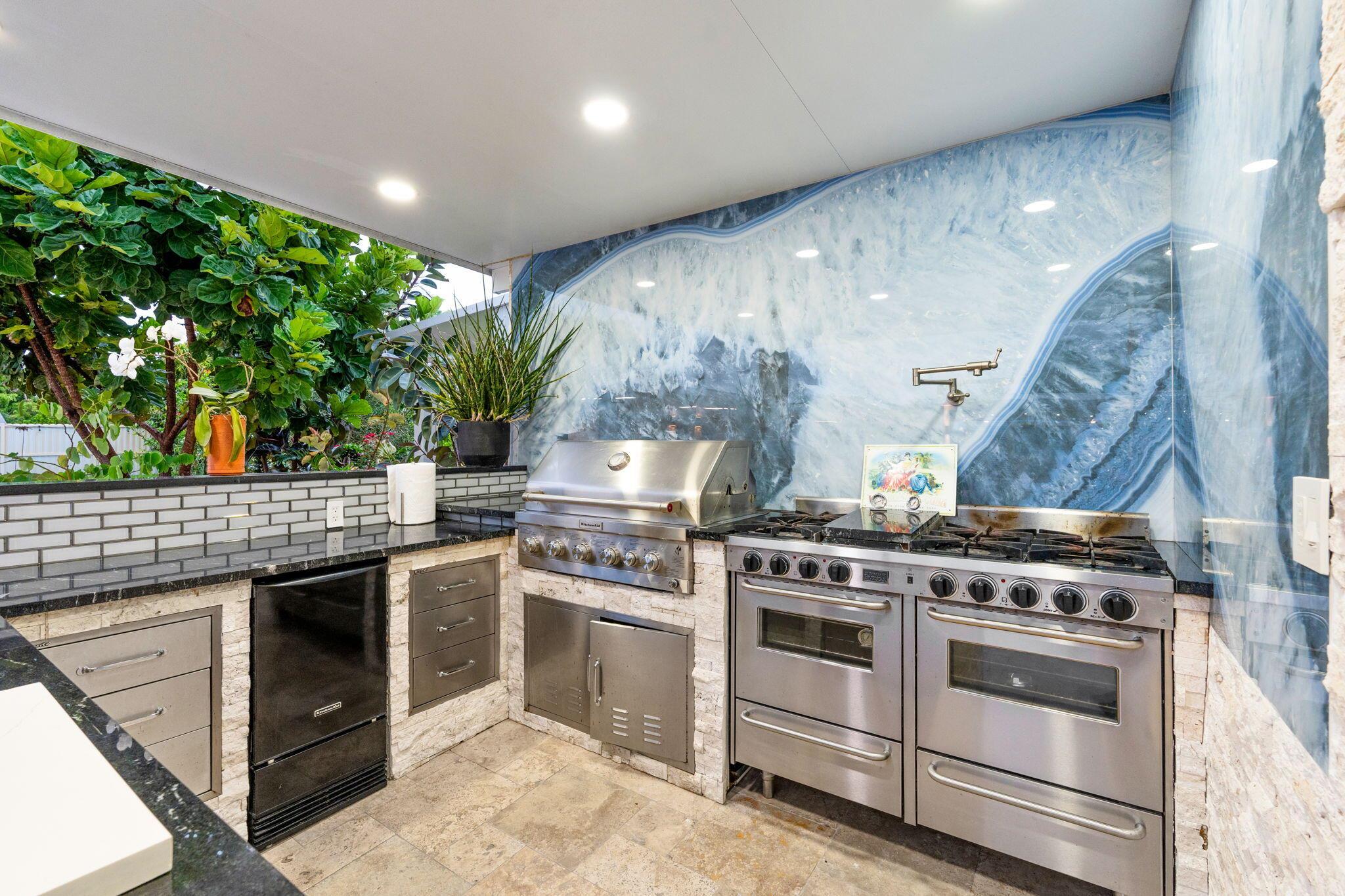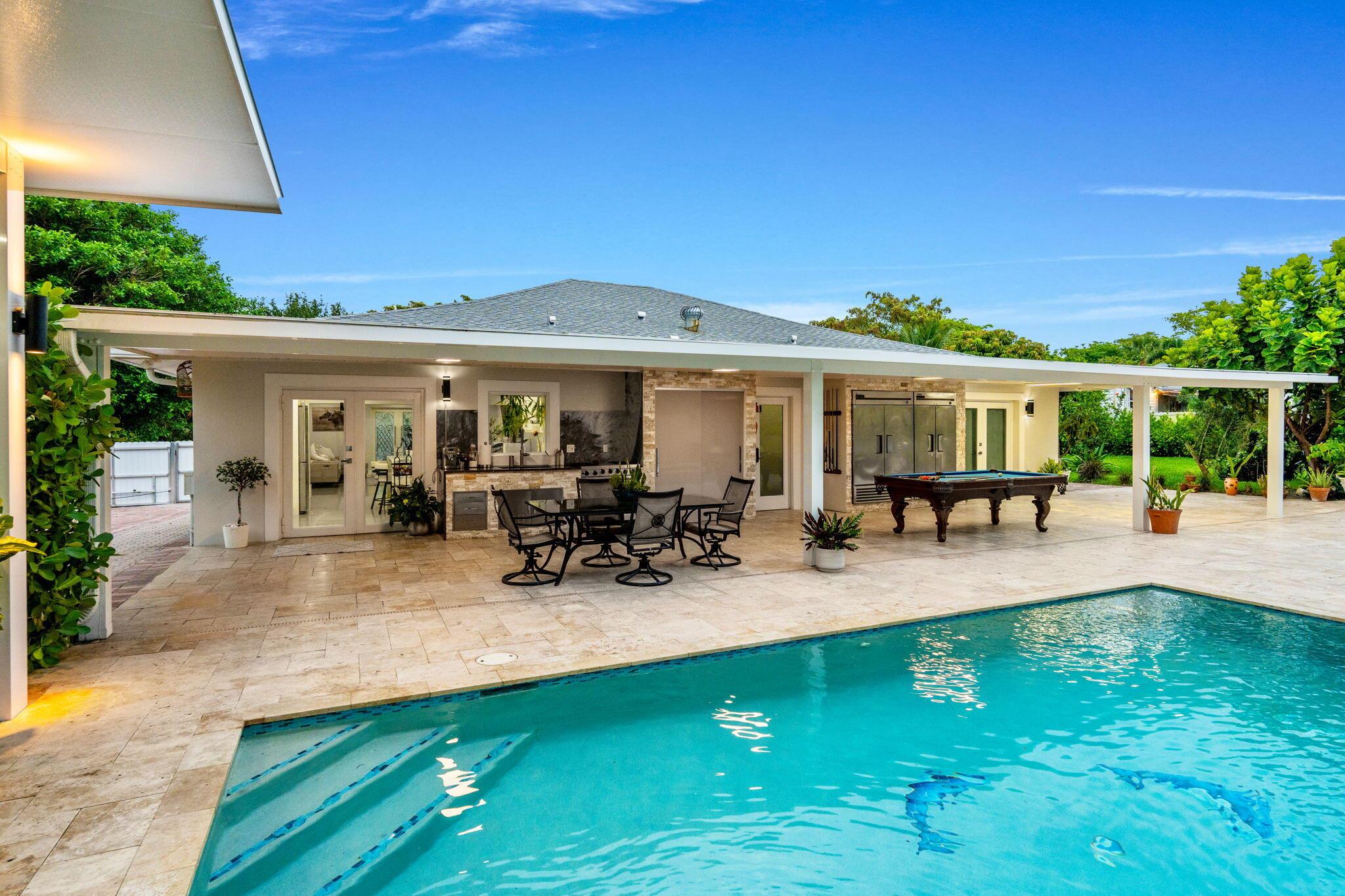Price Improvement! Step into your own private paradise with this exquisitely renovated 5-bedroom, 4.5-bathroom home including a ”Casita” in the back. This property is perfectly situated on a rare TRIPLE LOT just under HALF an ACRE. Featuring approximately 2,700 sqft of living space, this custom-designed property was completely renovated late 2020 with top-quality finishes, impact windows and doors, and high-end details throughout. The main home offers a bright open layout with porcelain tile floors, a stunning chef’s kitchen with sleek waterfall-edge quartz countertops, custom cabinetry, and premium stainless steel appliances — one of three fully equipped gas kitchens on the property.