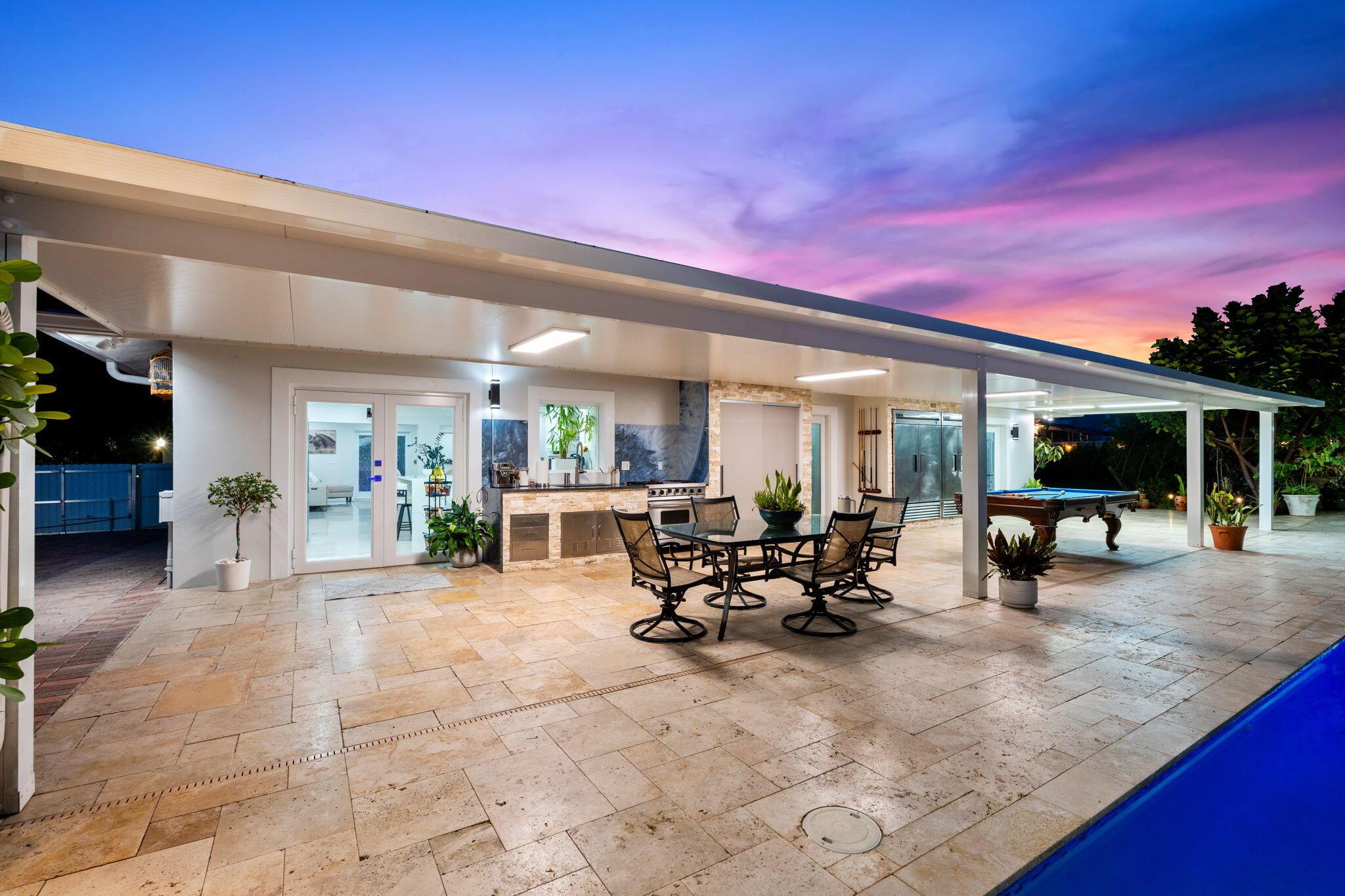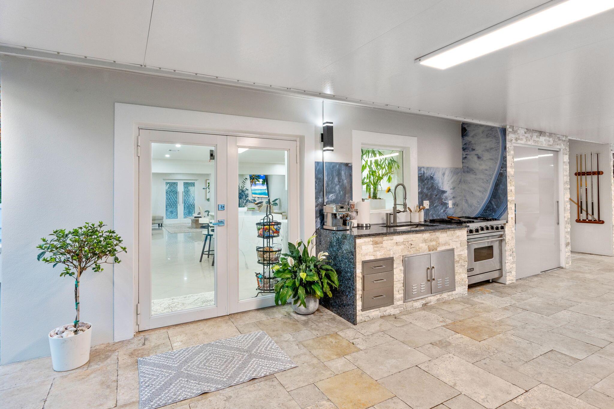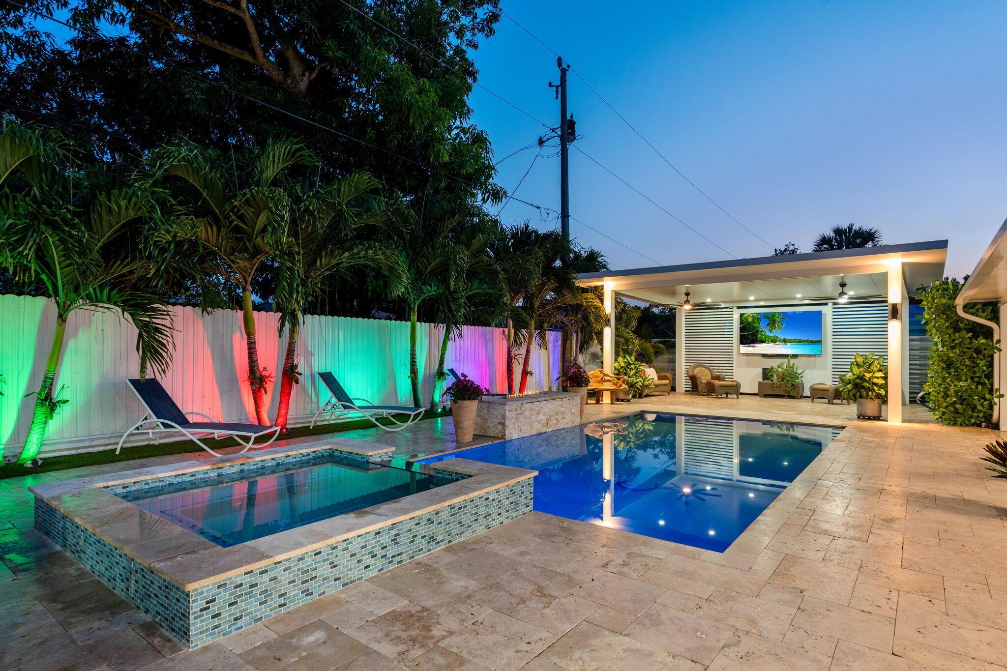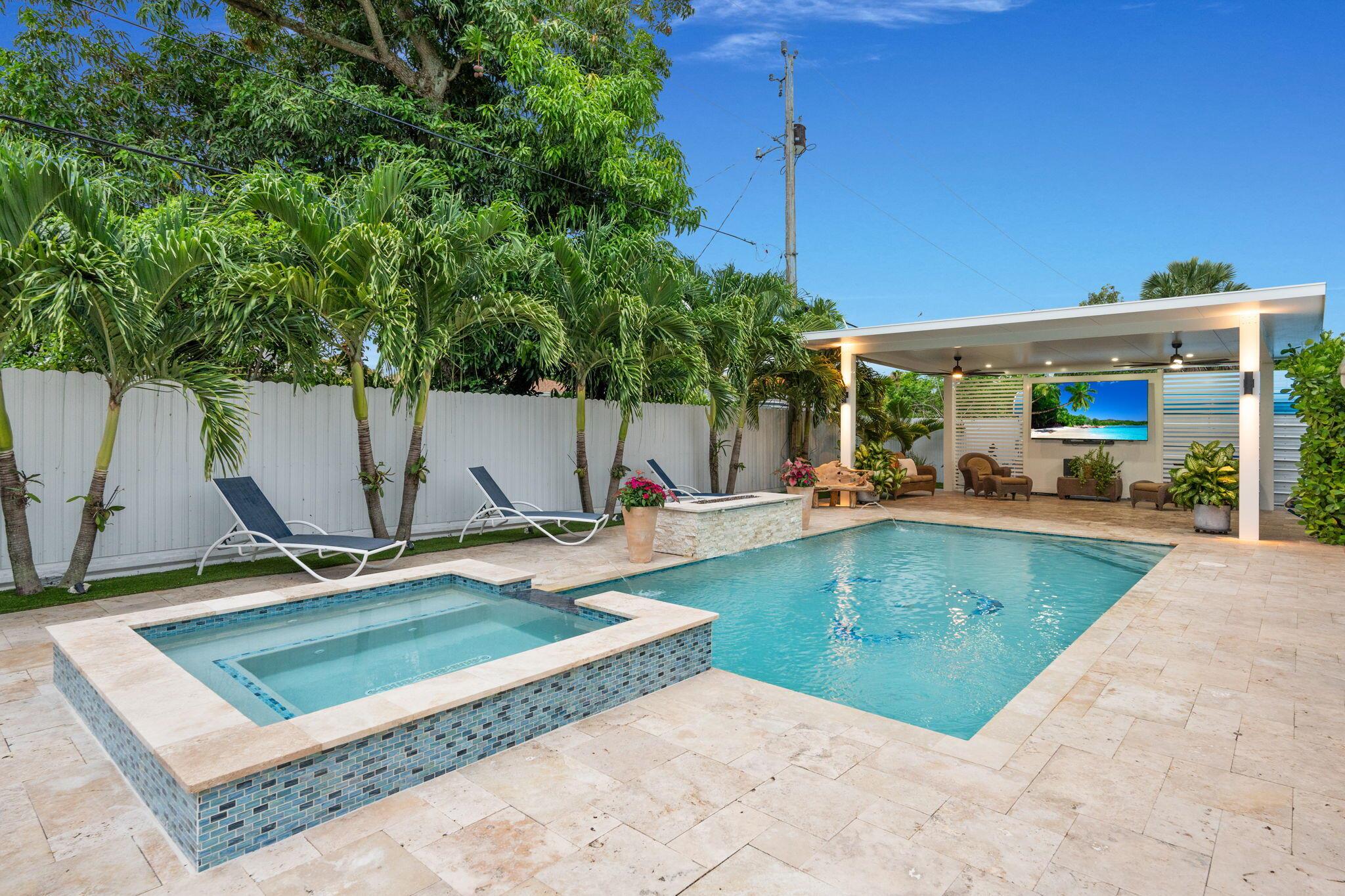 Price Improvement! Step into your own private paradise with this exquisitely renovated 5-bedroom, 4.5-bathroom home including a ”Casita” in the back. This property is perfectly situated on a rare TRIPLE LOT just under HALF an ACRE. Featuring approximately 2,700 sqft of living space, this custom-designed property was completely renovated late 2020 with top-quality finishes, impact windows and doors, and high-end details throughout. The main home offers a bright open layout with porcelain tile floors, a stunning chef’s kitchen with sleek waterfall-edge quartz countertops, custom cabinetry, and premium stainless steel appliances — one of three fully equipped gas kitchens on the property.