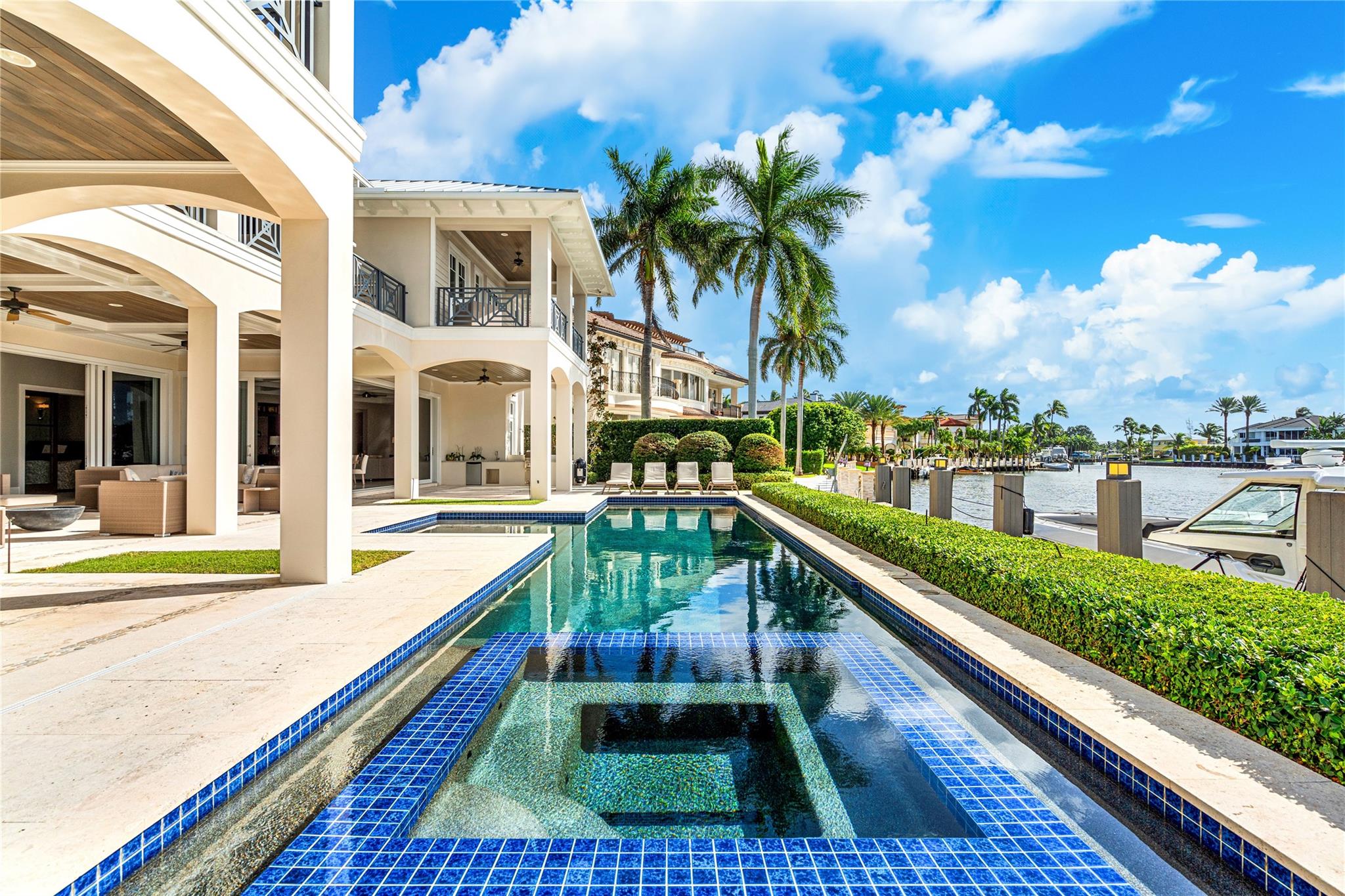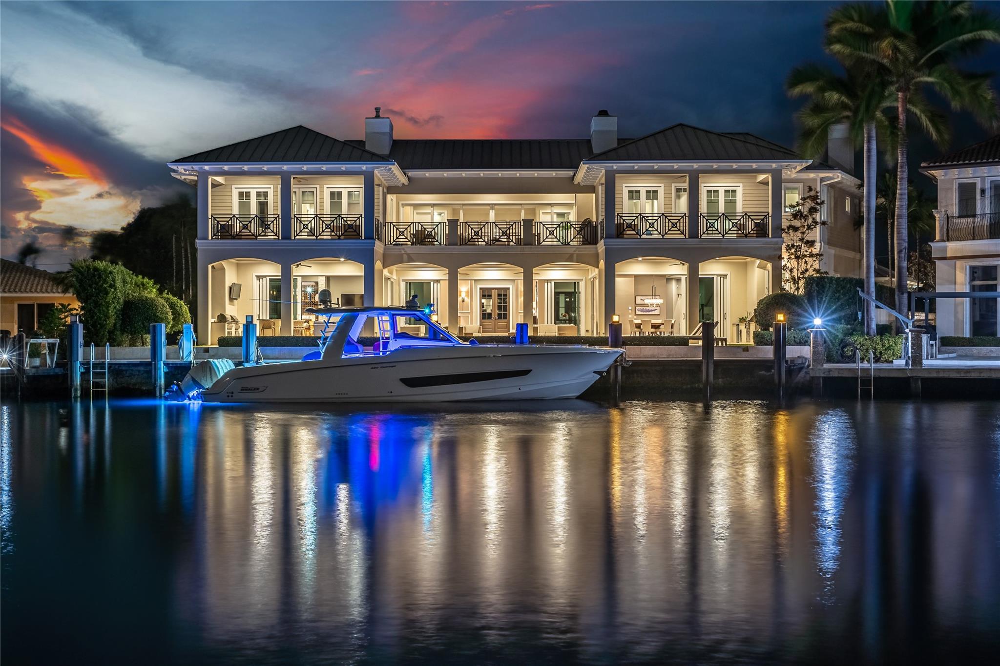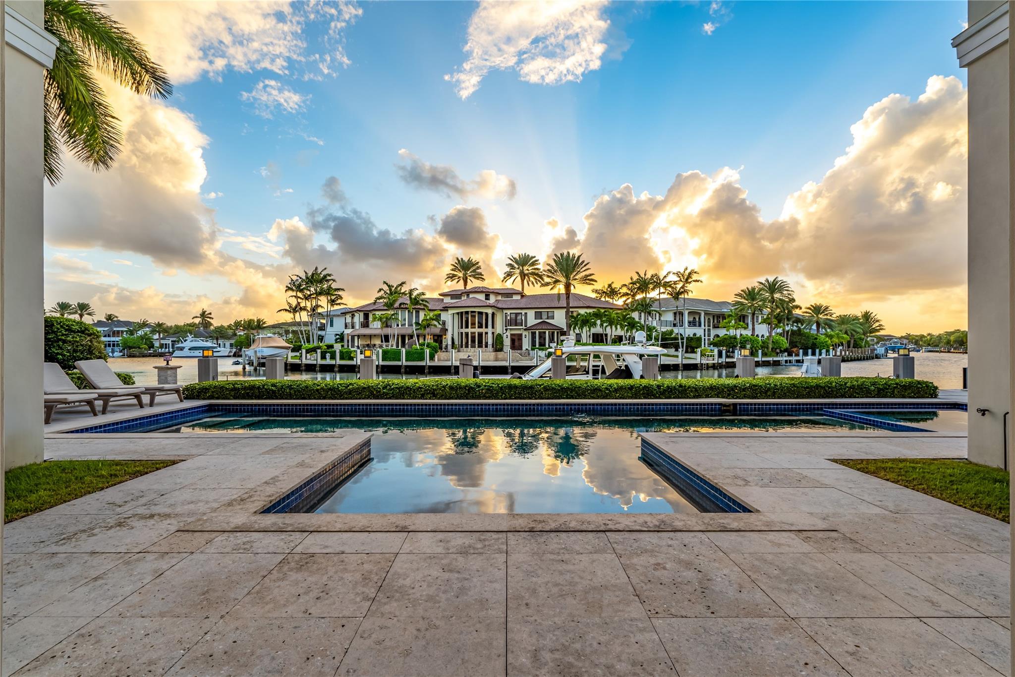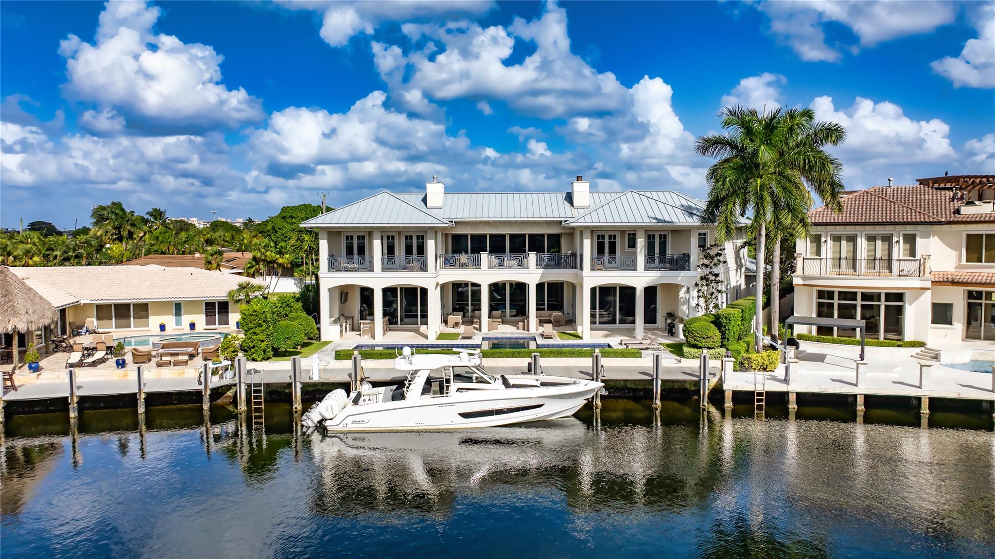 Exceptional coastal-inspired deepwater estate on 87’± of waterfront along wide Cap Knight Bayou, offering spell-binding water views. Crafted by Frankel Estate Homes and designed by Carlos Martin Architect, this residence sets a new standard with superior craftsmanship and materials. The 7-bedroom, 7.5-bath home spans 13,473± total square feet, showcasing wide water views from nearly every major room. The impressive double-island kitchen features custom cabinets and luxe appliances. Features include a 1,350-bottle wine cellar, full bar, elevator, office, 4-bay garage, generator, and more. Outdoor entertainment awaits with an expansive lanai, resort-style pool/patio, and covered summer kitchen. Ideal for avid boater, the full-service composite yacht dock is just minutes to Hillsboro Inlet.