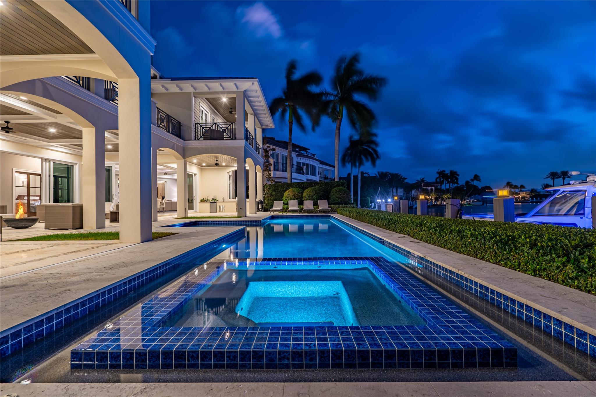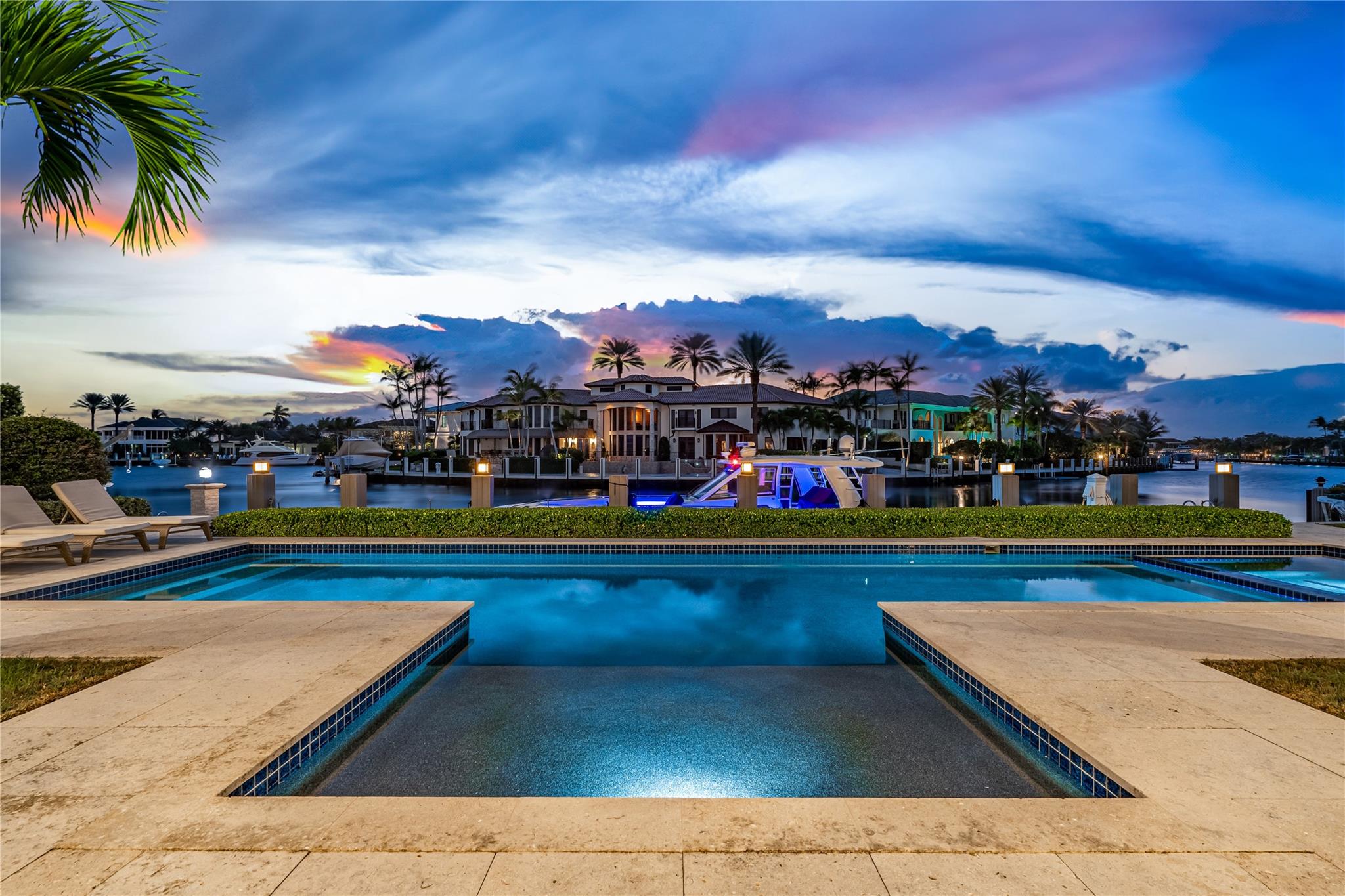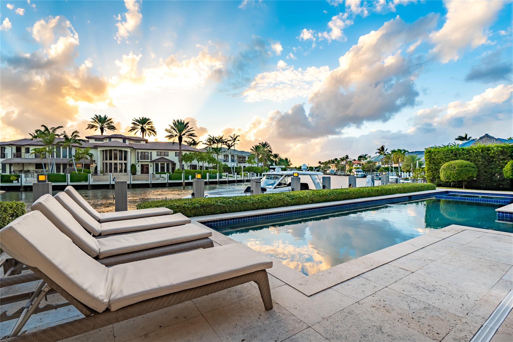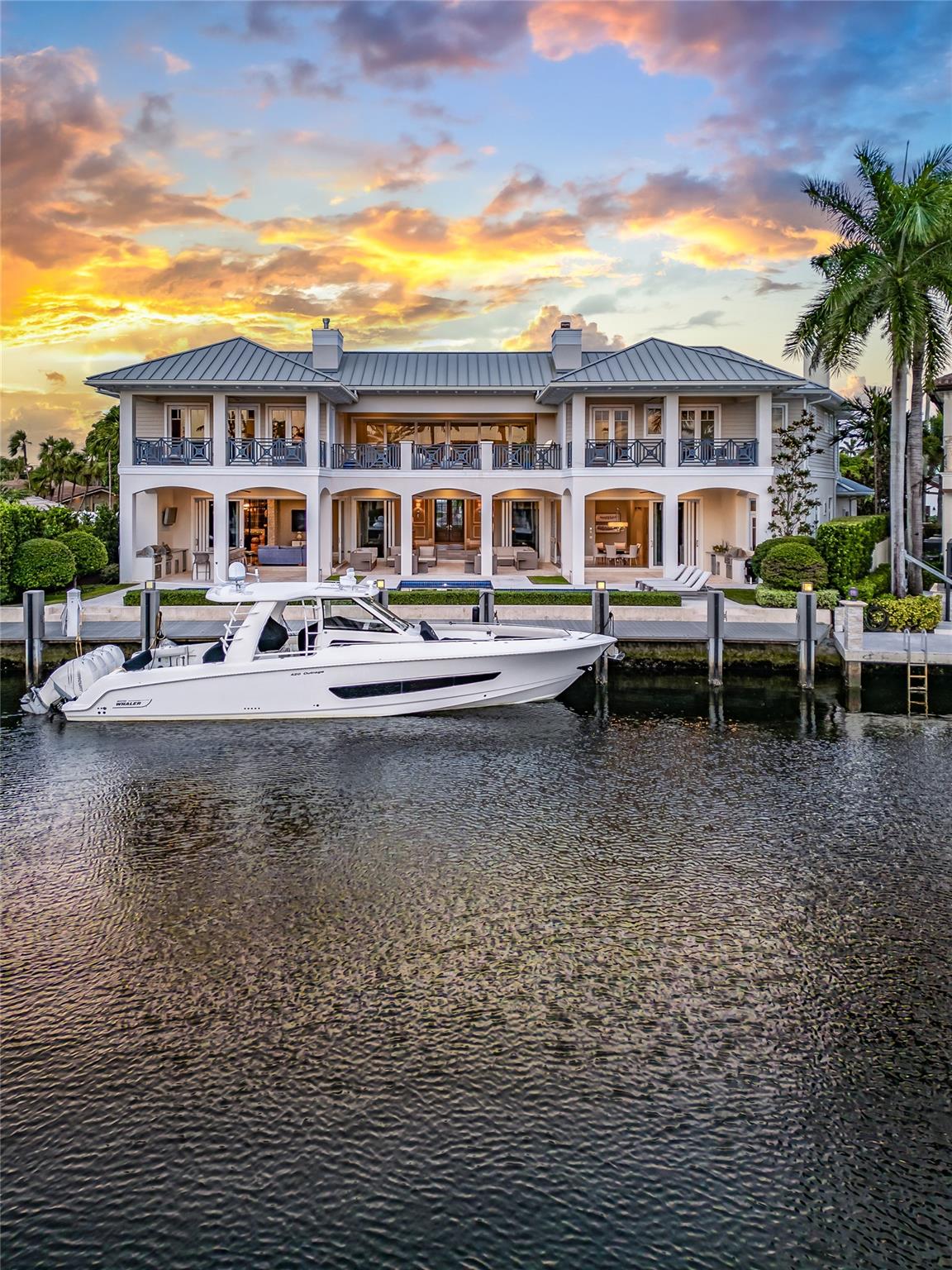 Exceptional coastal-inspired deepwater estate on 87’± of waterfront along wide Cap Knight Bayou, offering spell-binding water views. Crafted by Frankel Estate Homes and designed by Carlos Martin Architect, this residence sets a new standard with superior craftsmanship and materials. The 7-bedroom, 7.5-bath home spans 13,473± total square feet, showcasing wide water views from nearly every major room. The impressive double-island kitchen features custom cabinets and luxe appliances. Features include a 1,350-bottle wine cellar, full bar, elevator, office, 4-bay garage, generator, and more. Outdoor entertainment awaits with an expansive lanai, resort-style pool/patio, and covered summer kitchen. Ideal for avid boater, the full-service composite yacht dock is just minutes to Hillsboro Inlet.